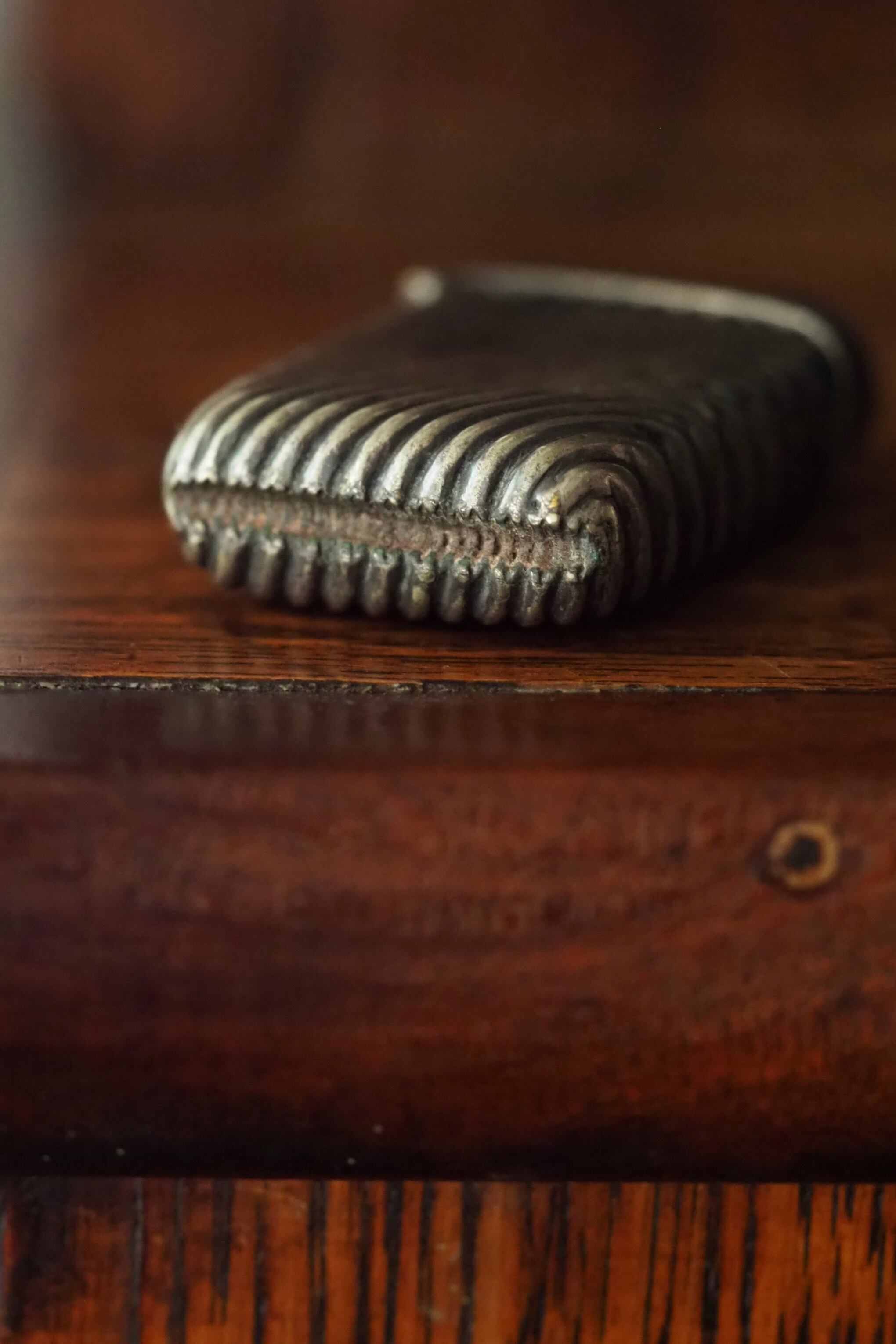19世紀後半のイギリス、摩擦で容易に自然発火してしまう黄燐マッチが普及していた為この金属ケースに入れてお尻のギザギザでマッチを擦っていた。