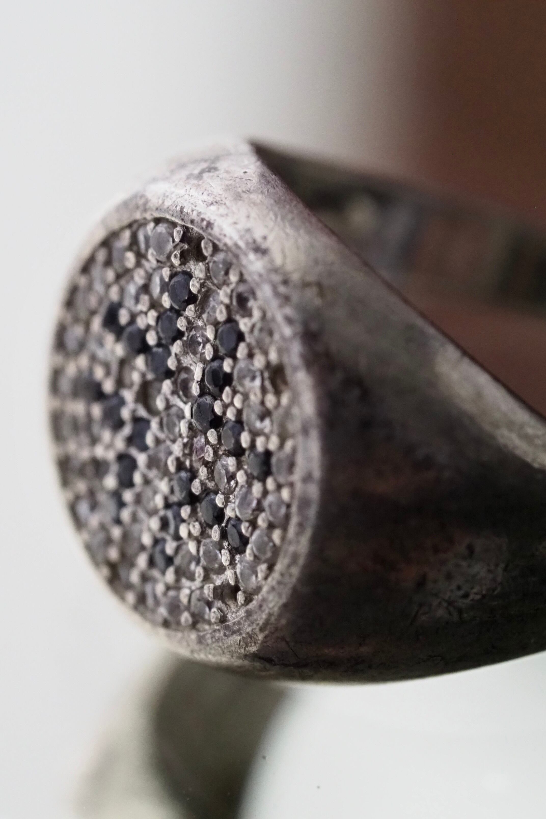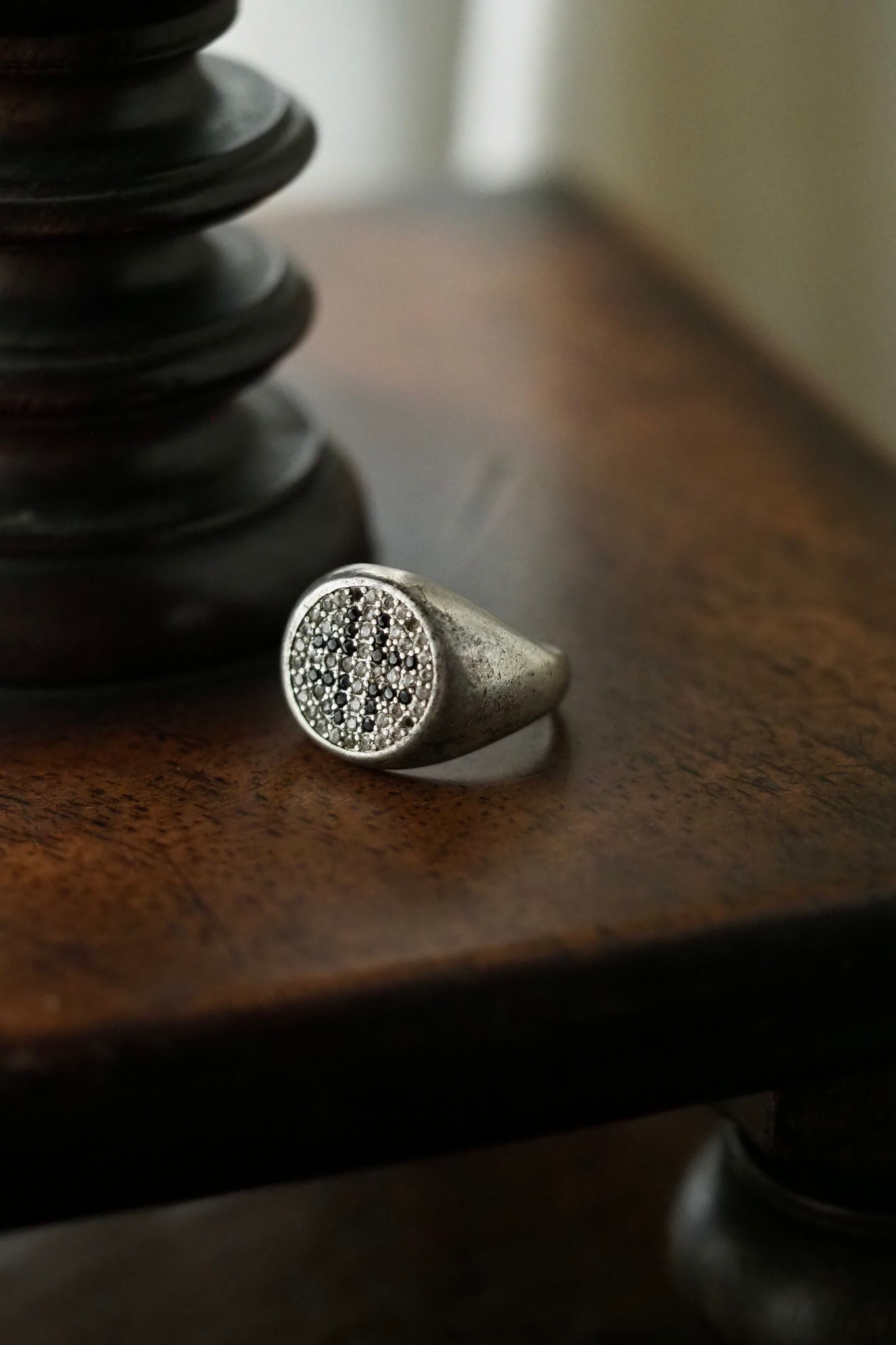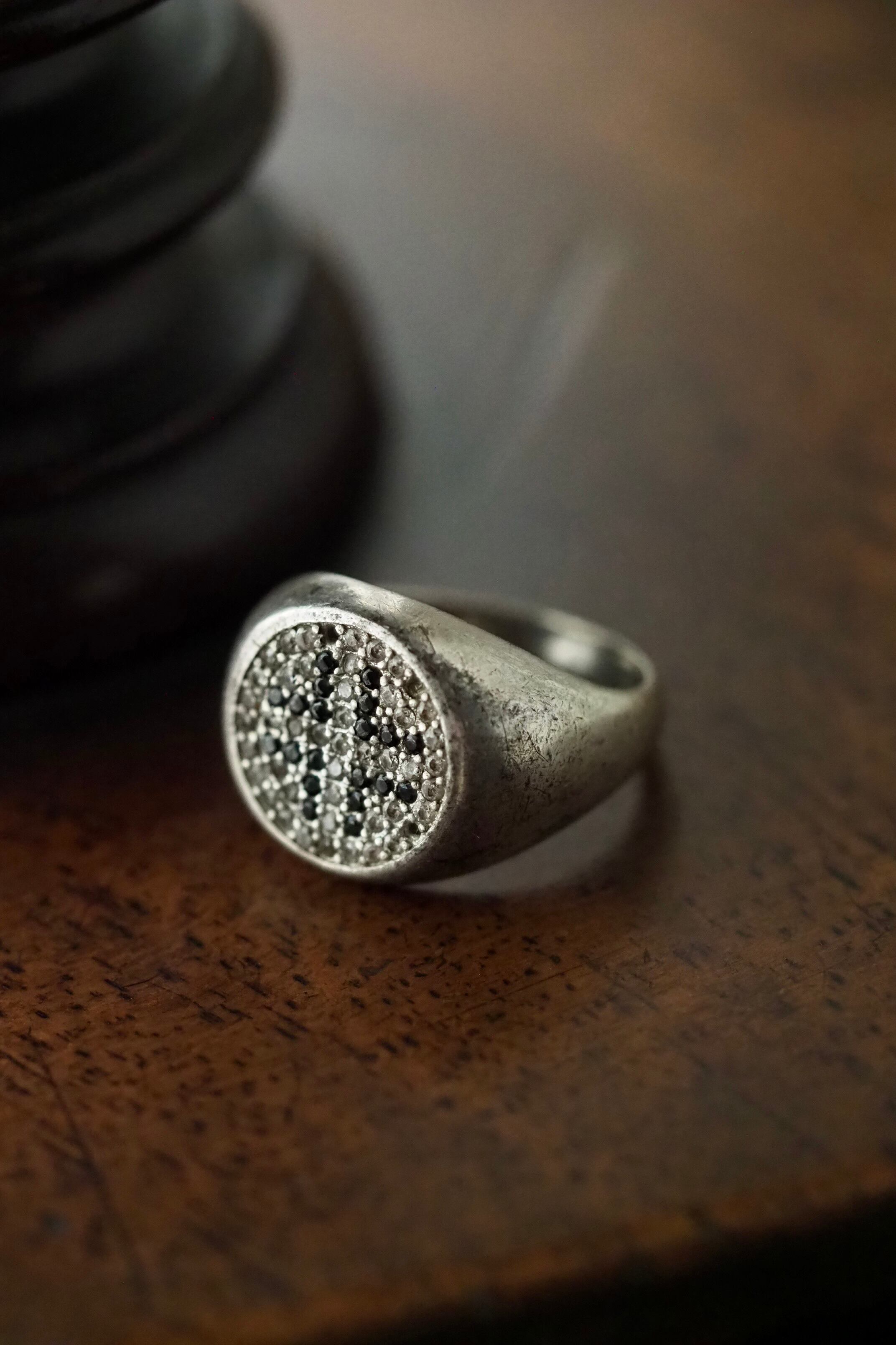 小さなダイヤモンドとオニキスの集合体が十字の紋章を形作っている、ドイツ 1960年頃のシグネットリング。