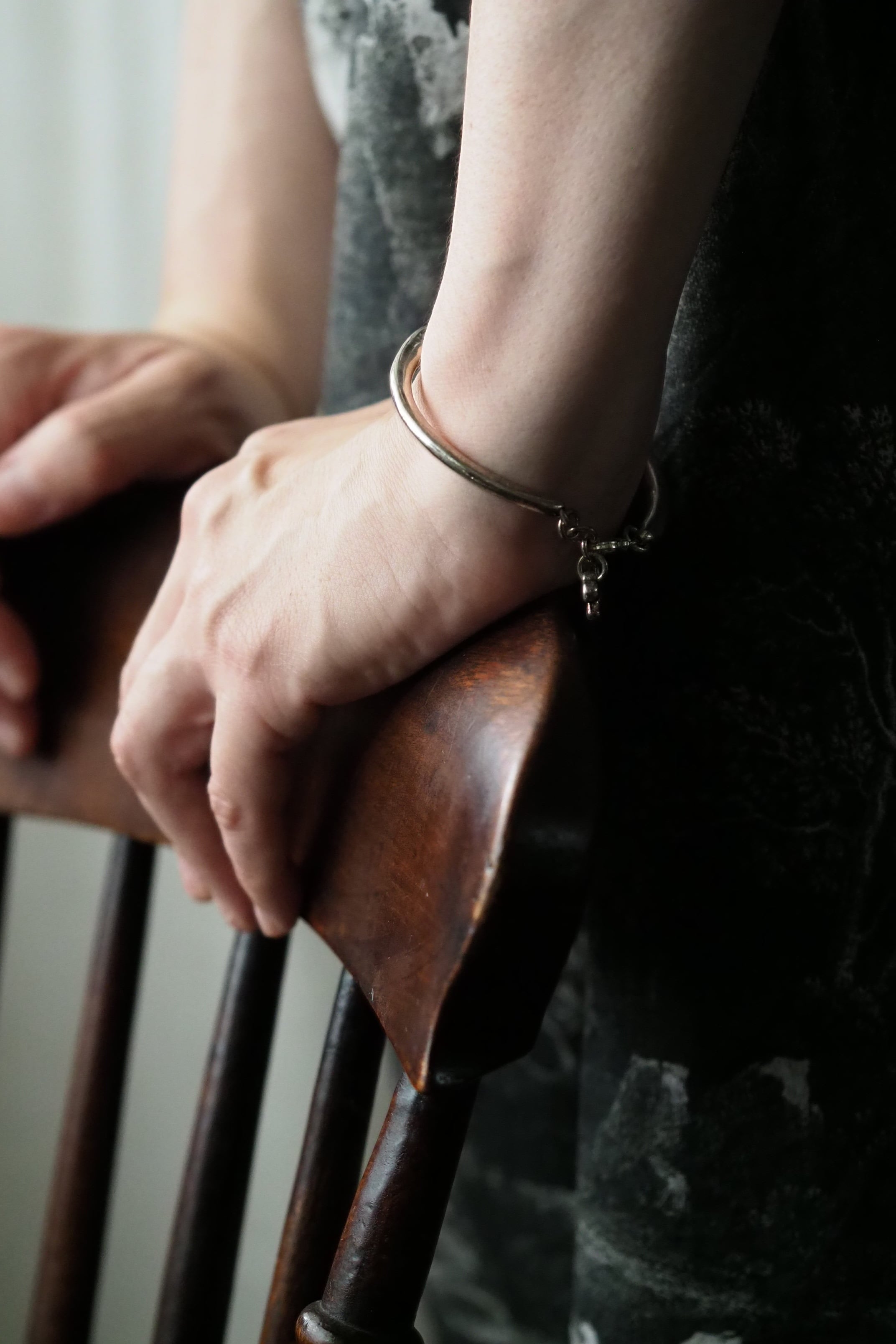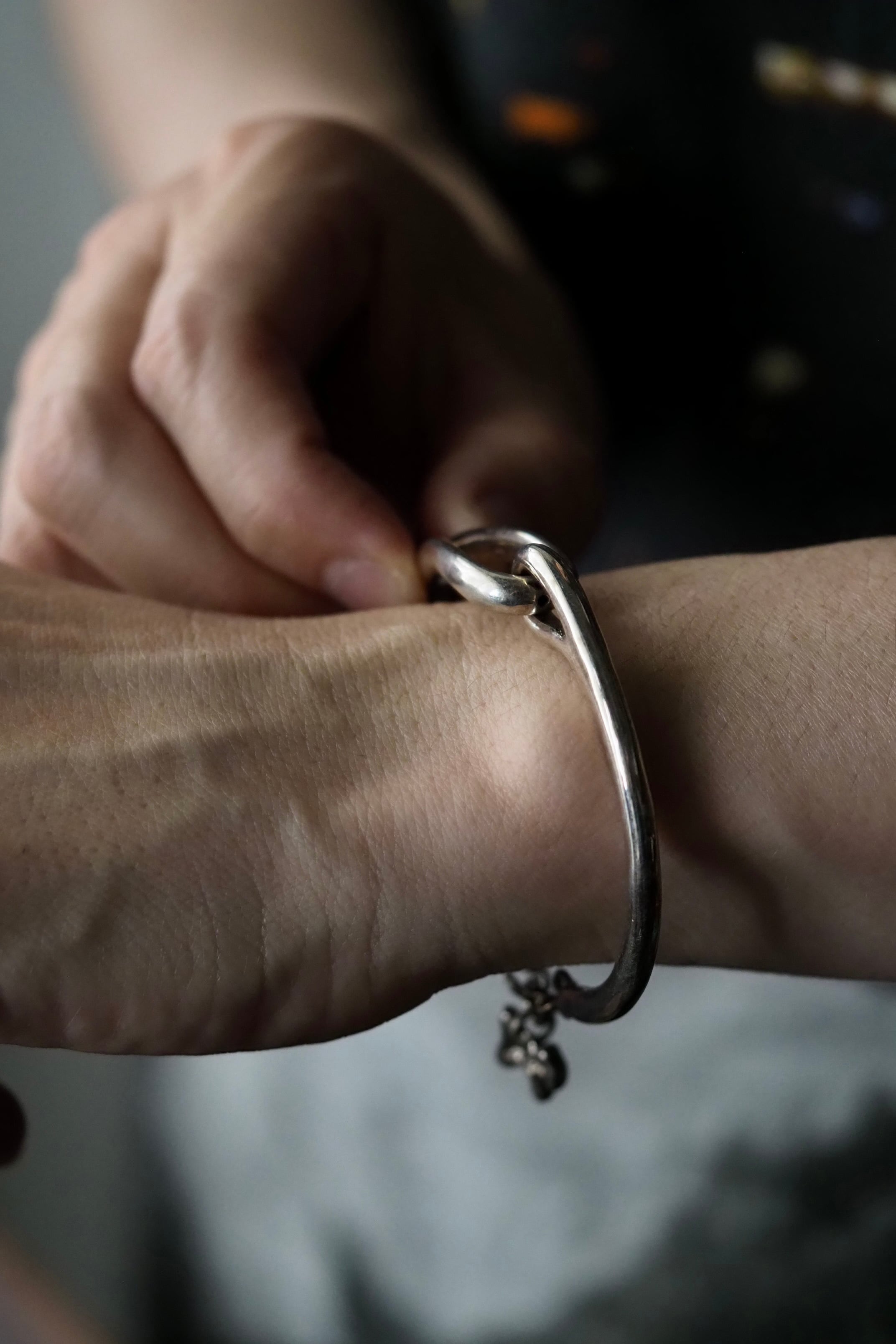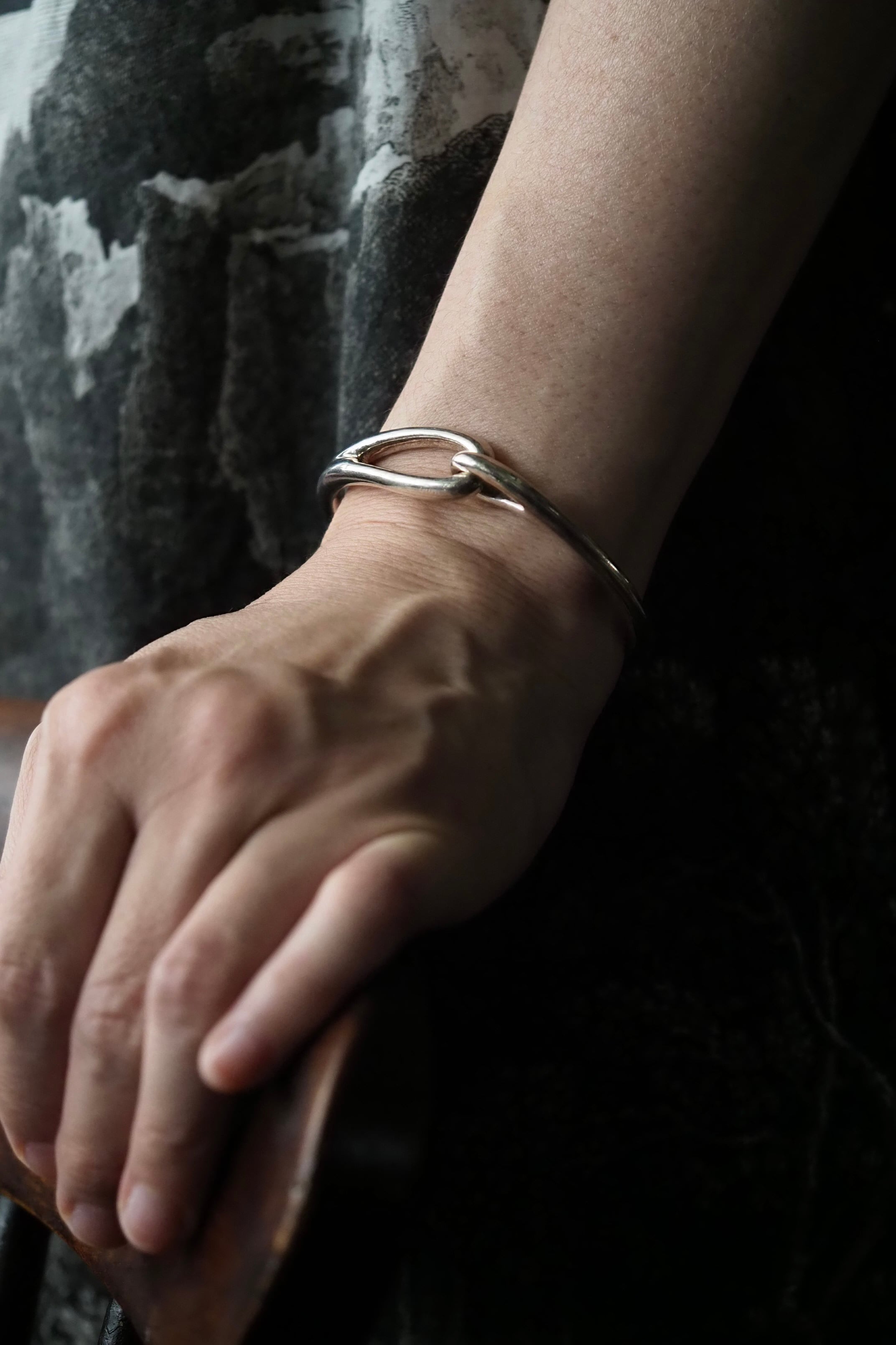 さっぱりと垢抜けたコーディネートに映えるスターリングシルバーのカフブレスレット。