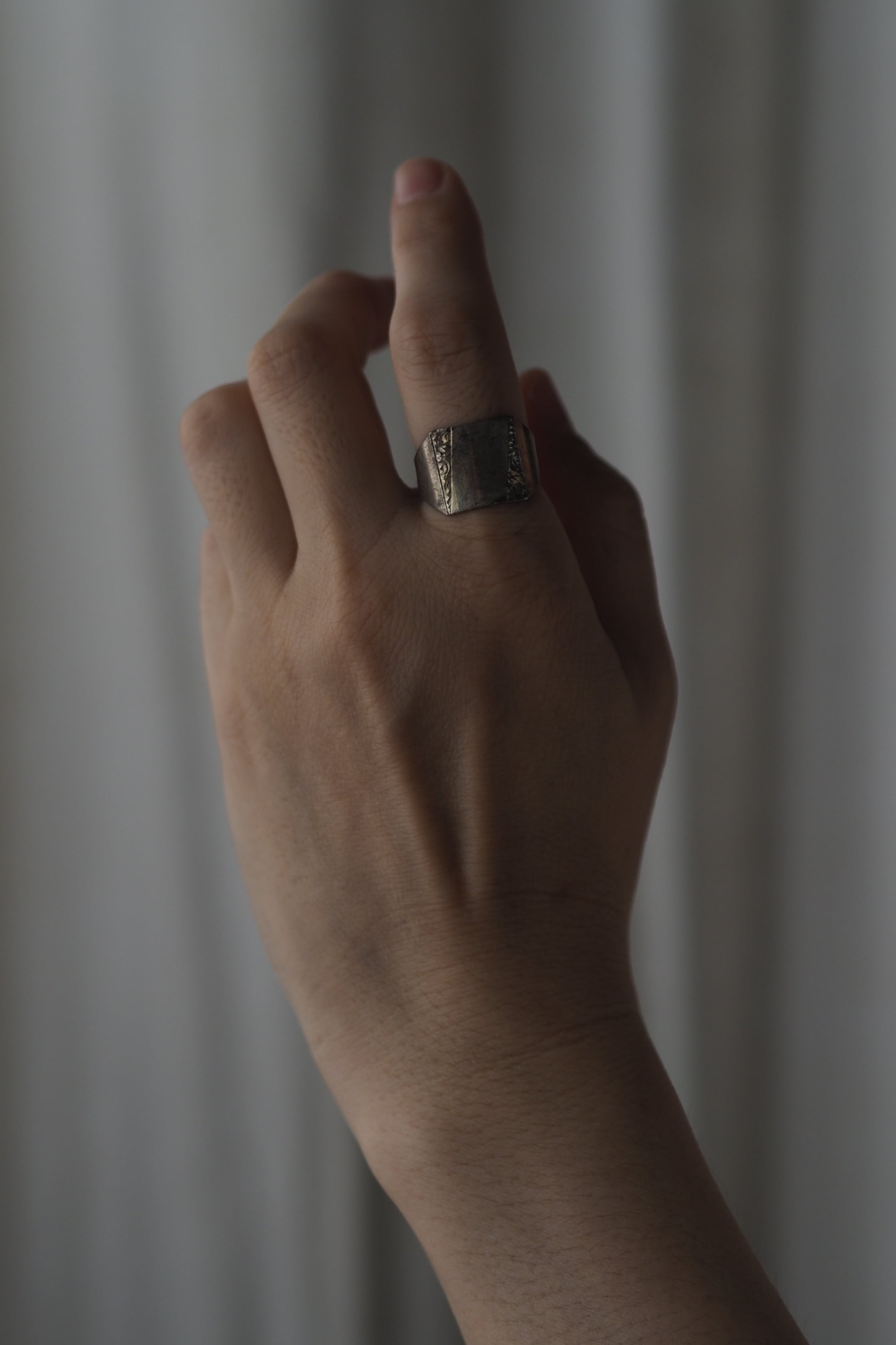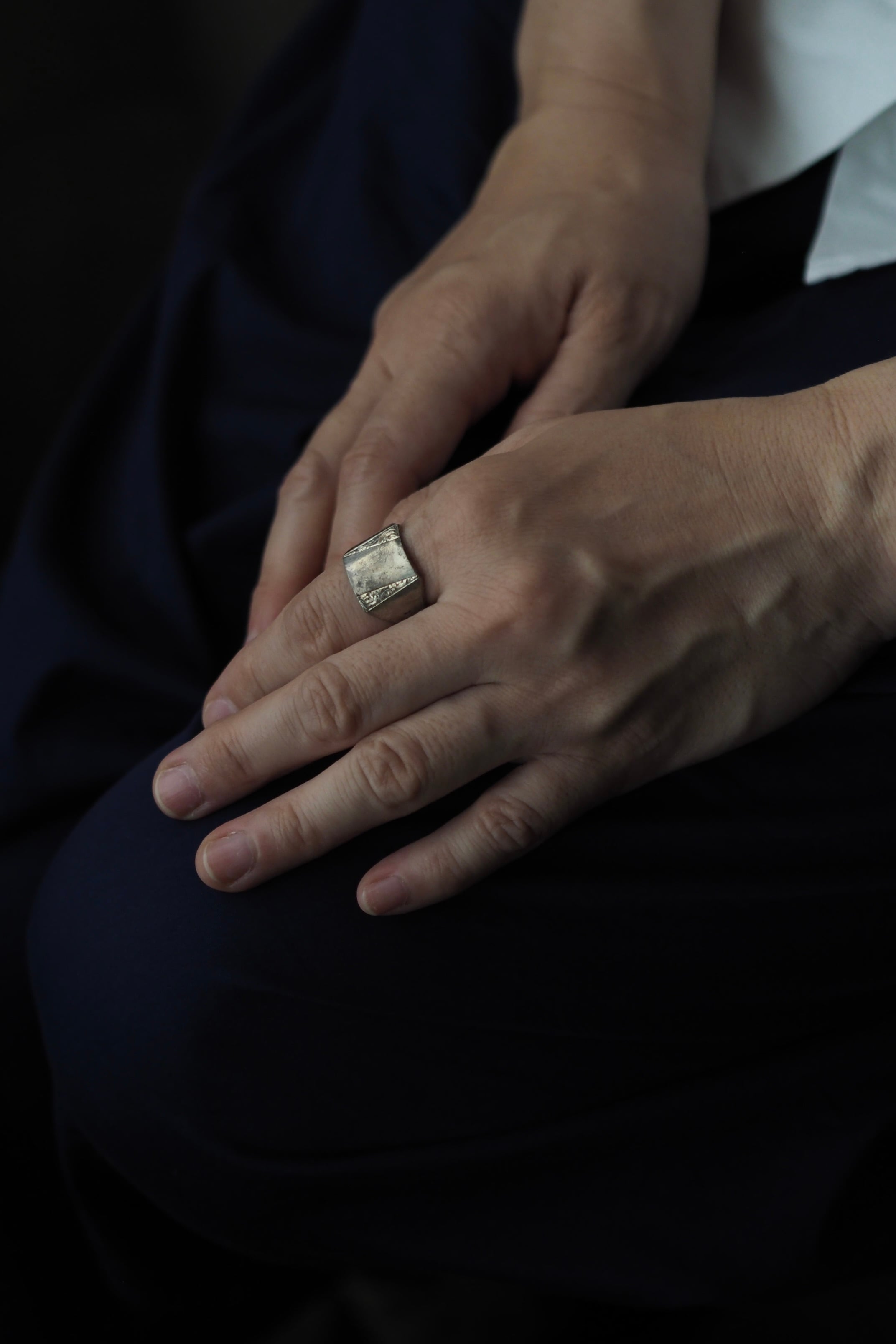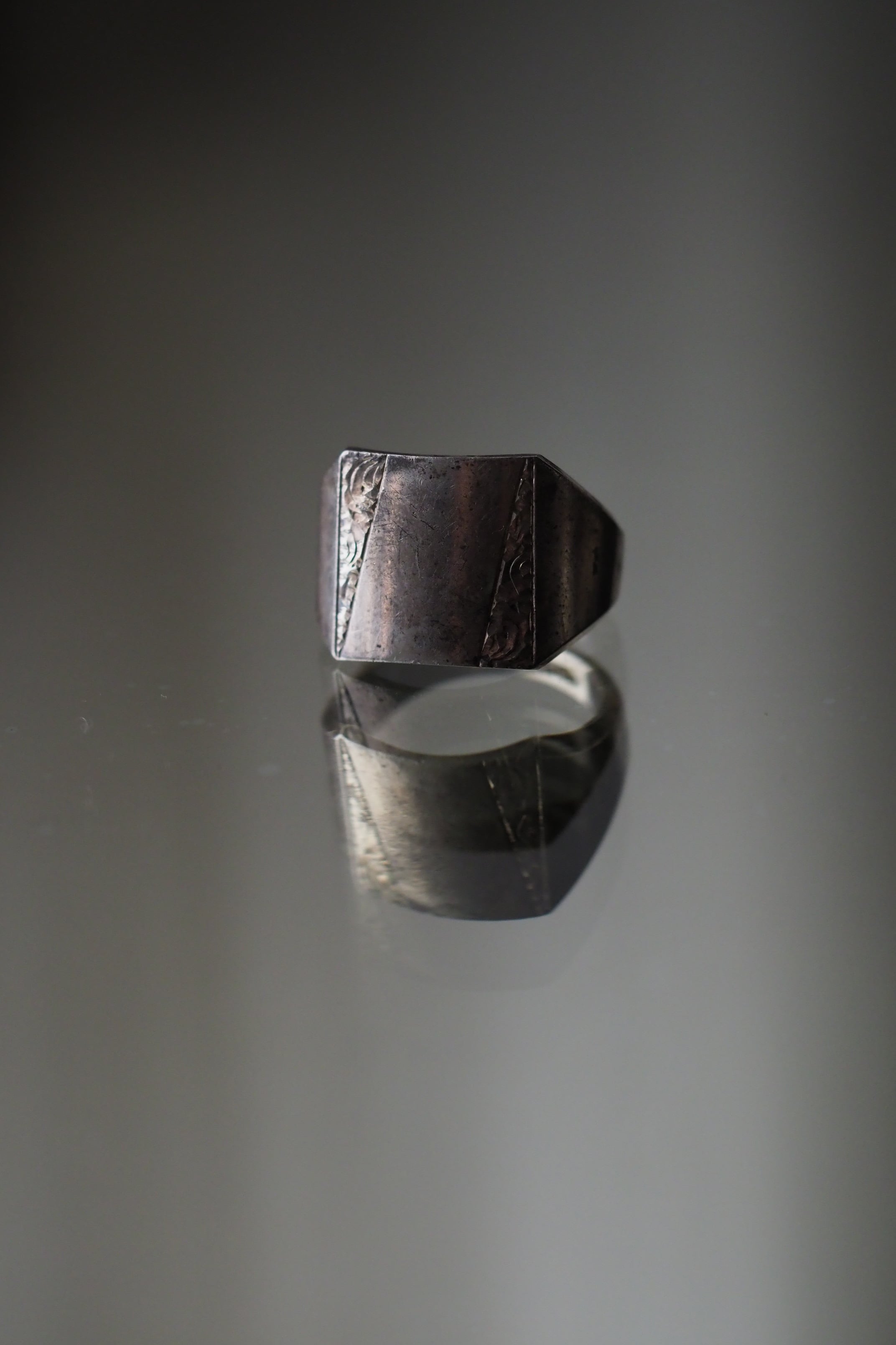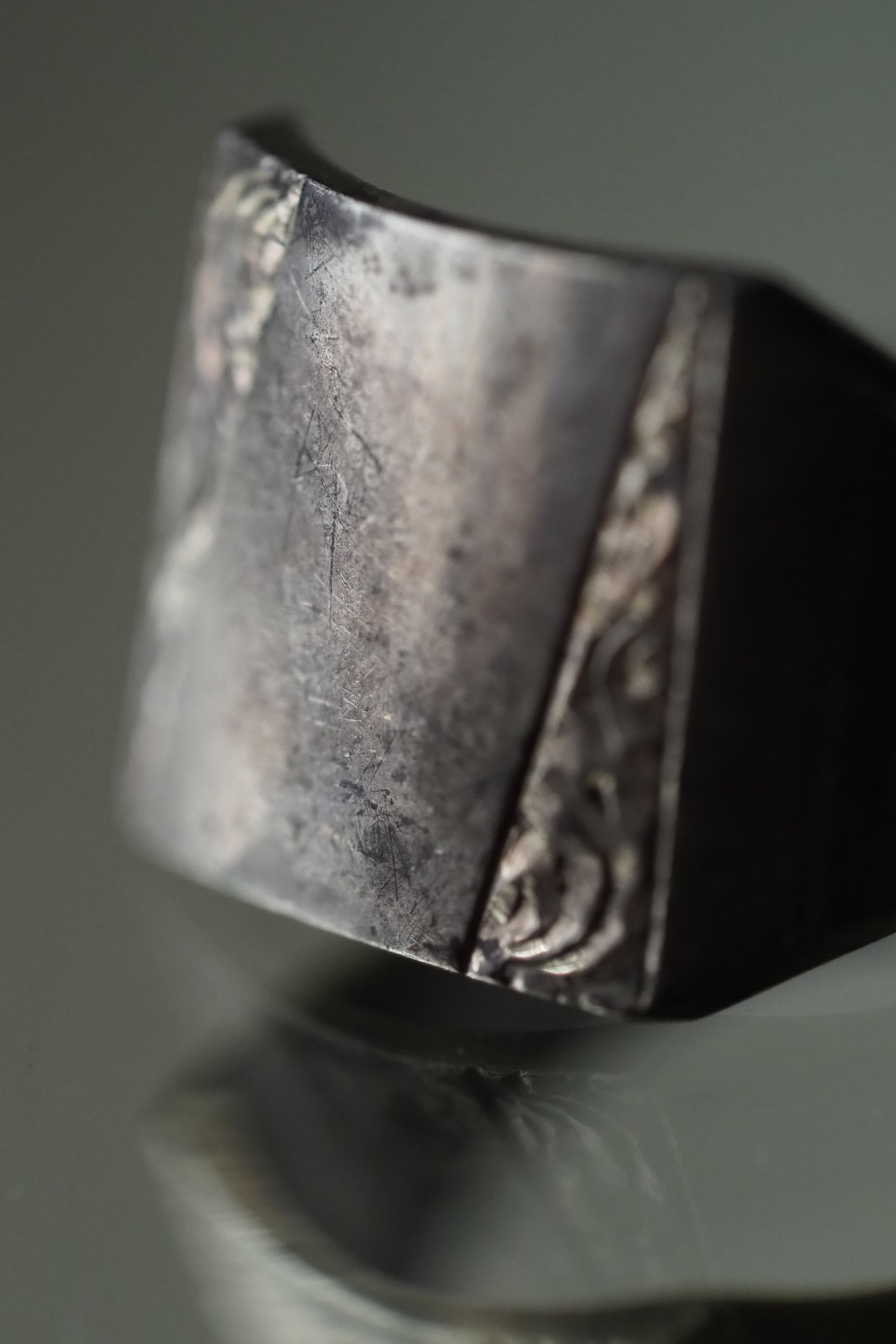 シャープなスクエアの印台の脇に陰影ある鍛金模様、何も刻印されていないシグネットリング。