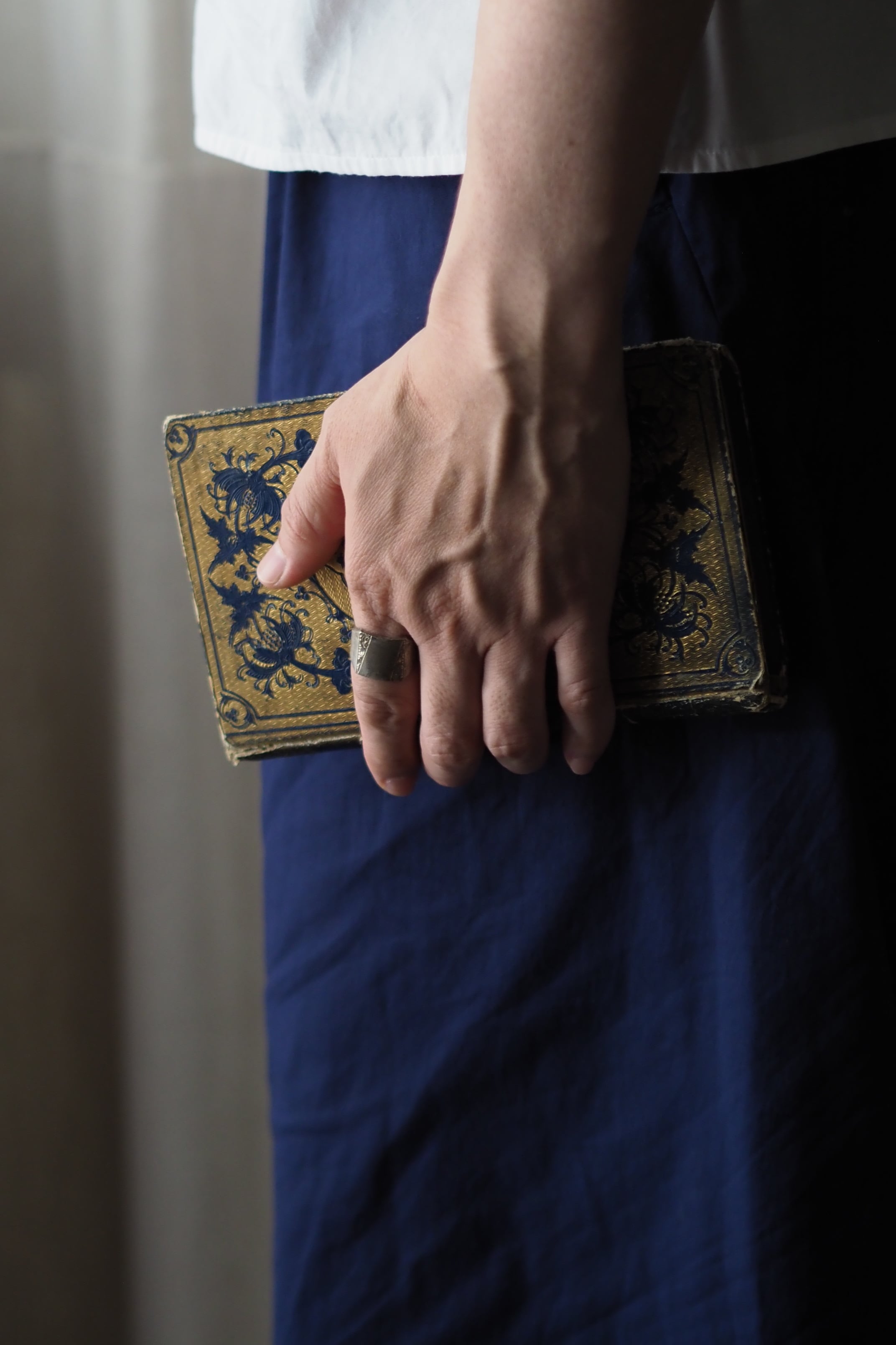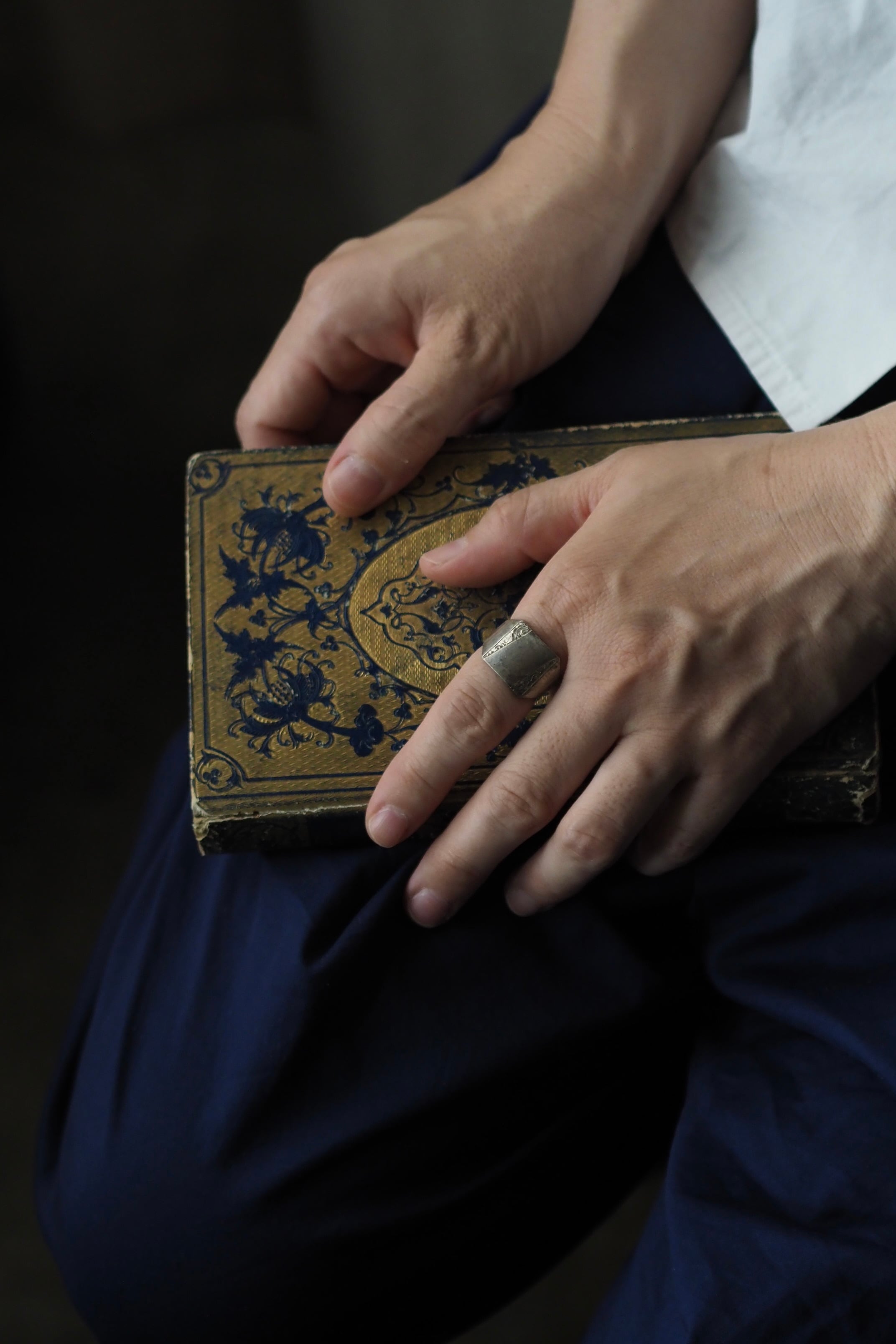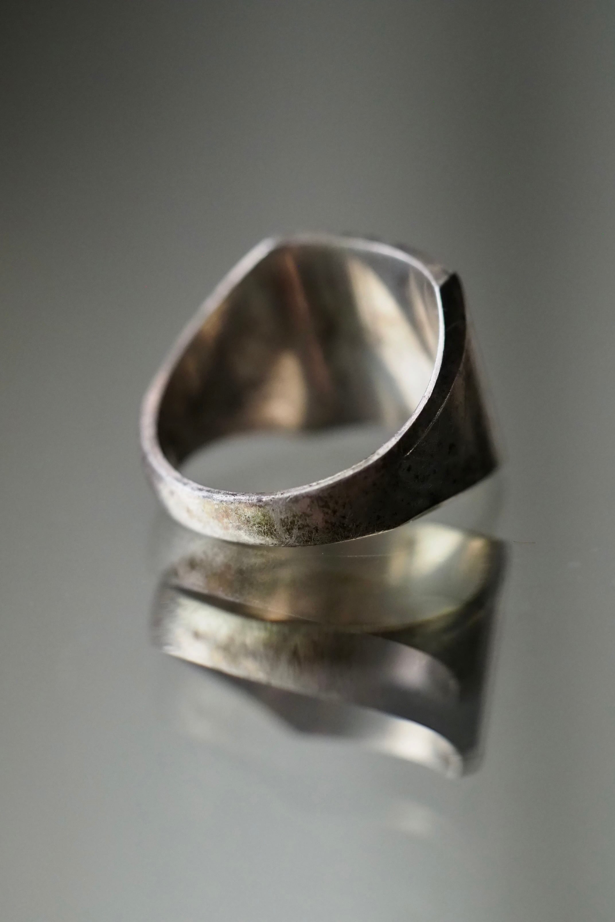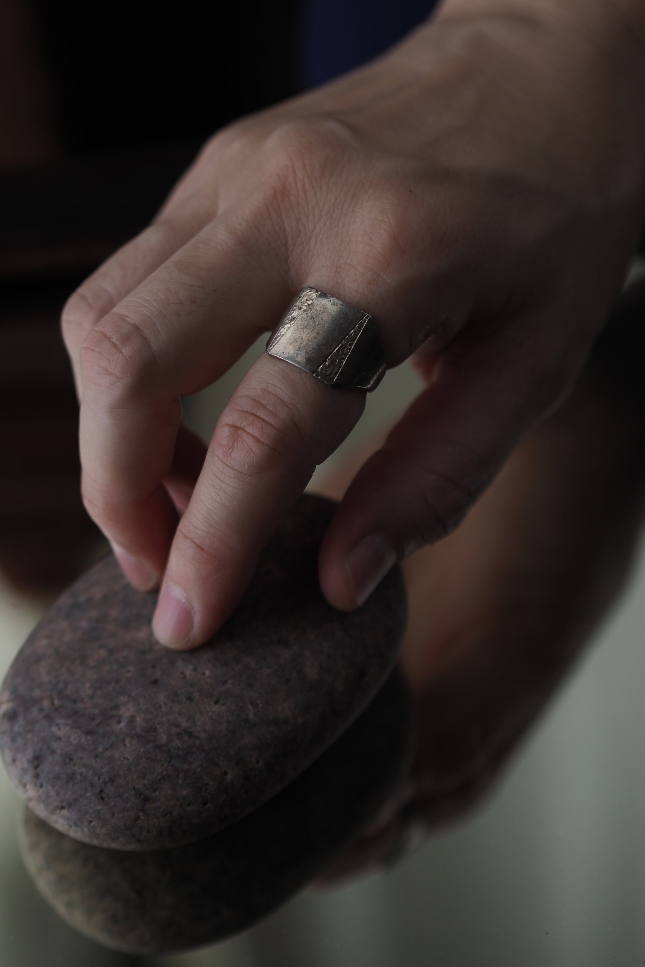 シャープなスクエアの印台の脇に陰影ある鍛金模様、何も刻印されていないシグネットリング。