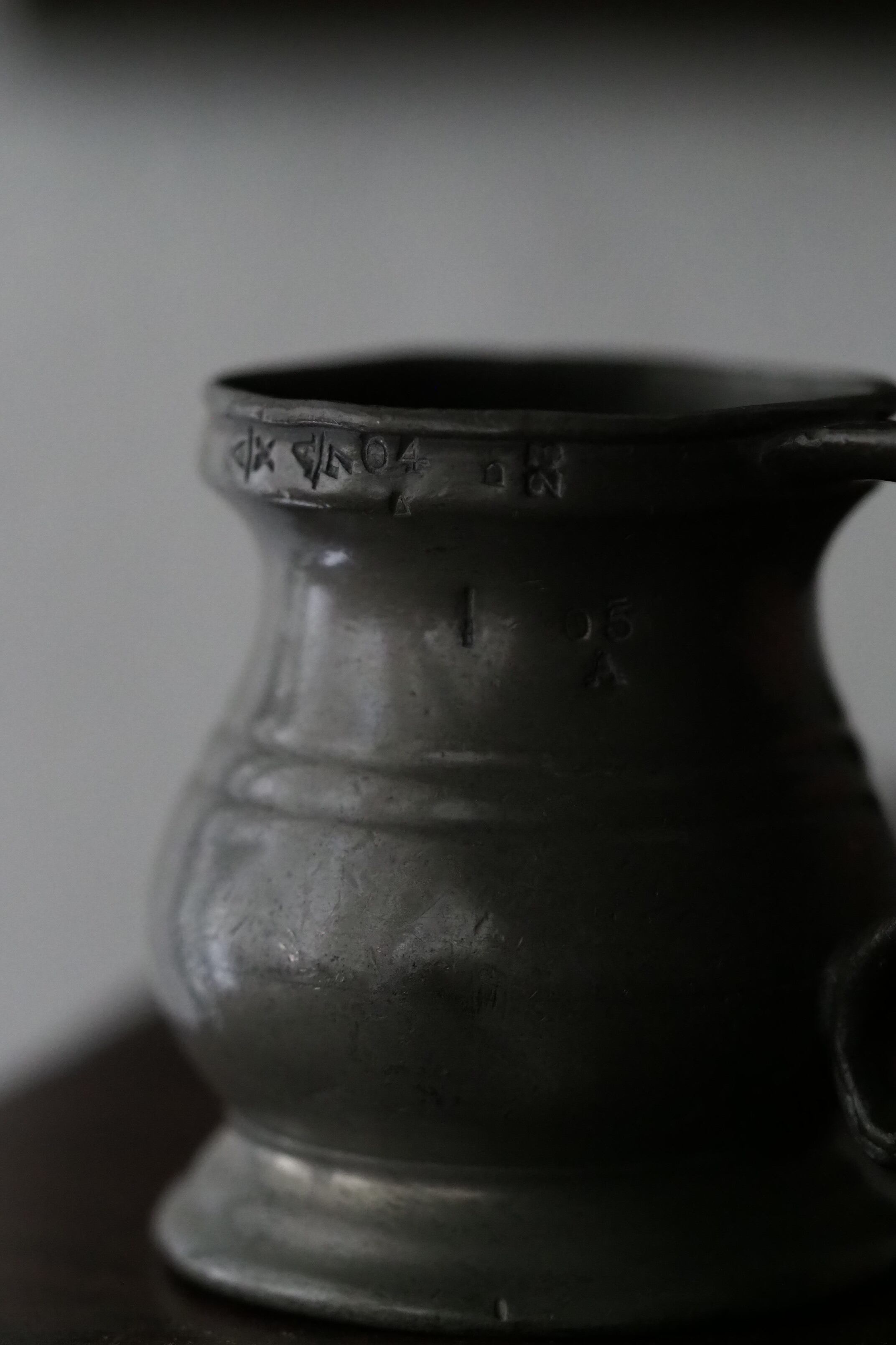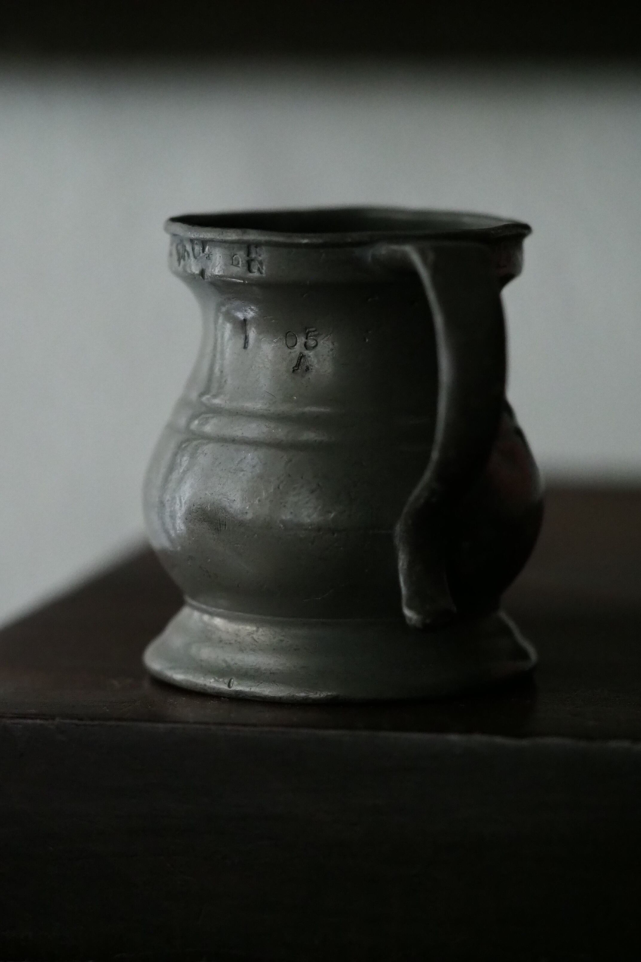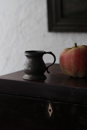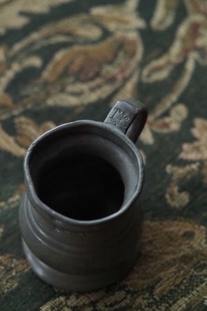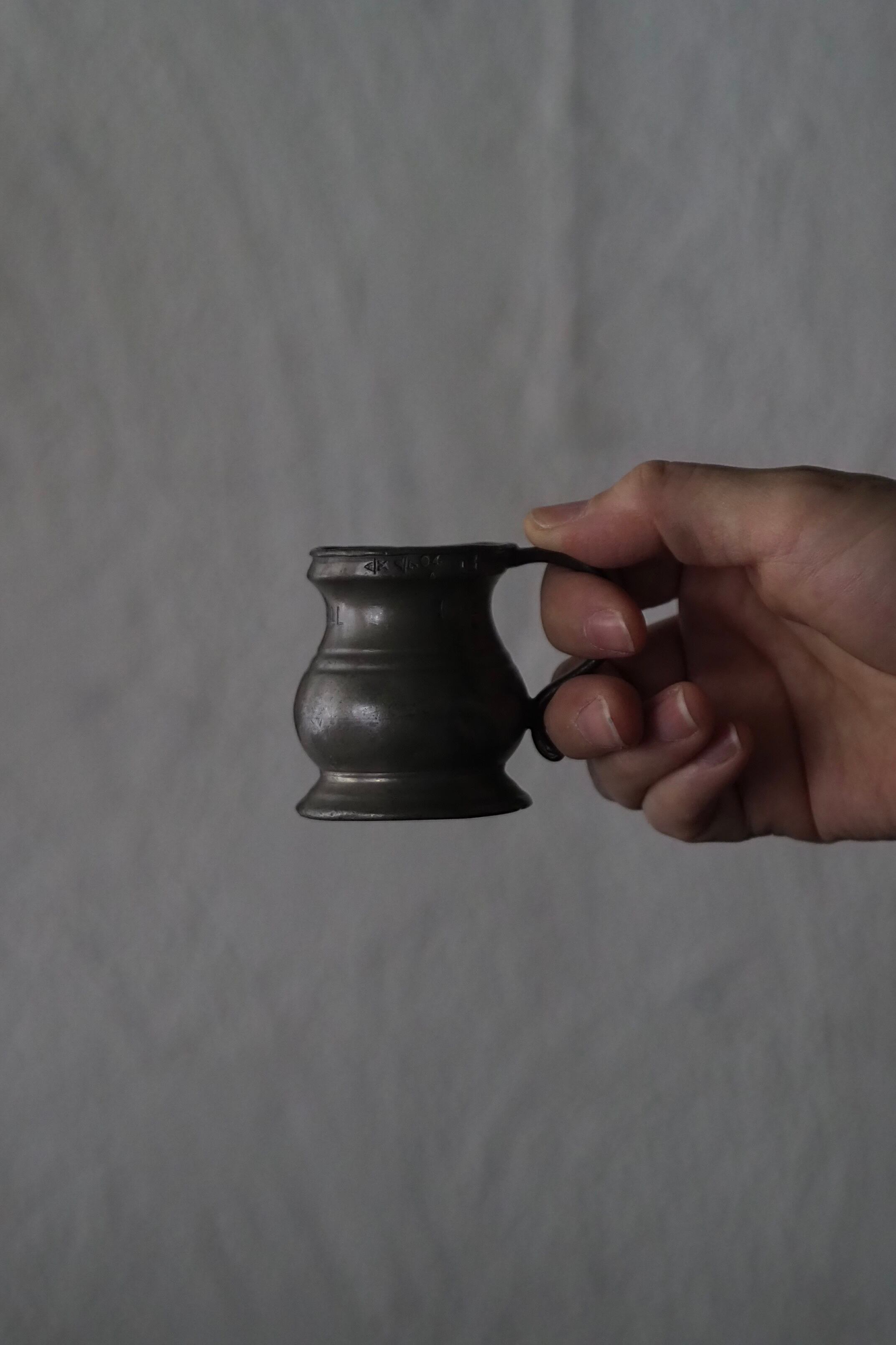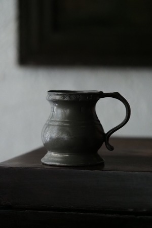 燻した低いトーンのピューター、アンティークなりの重さがある計量カップ。