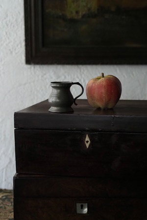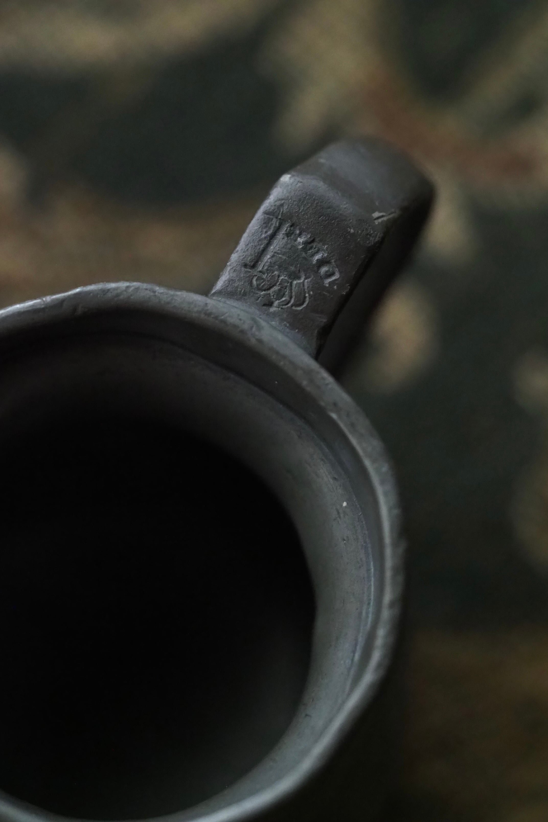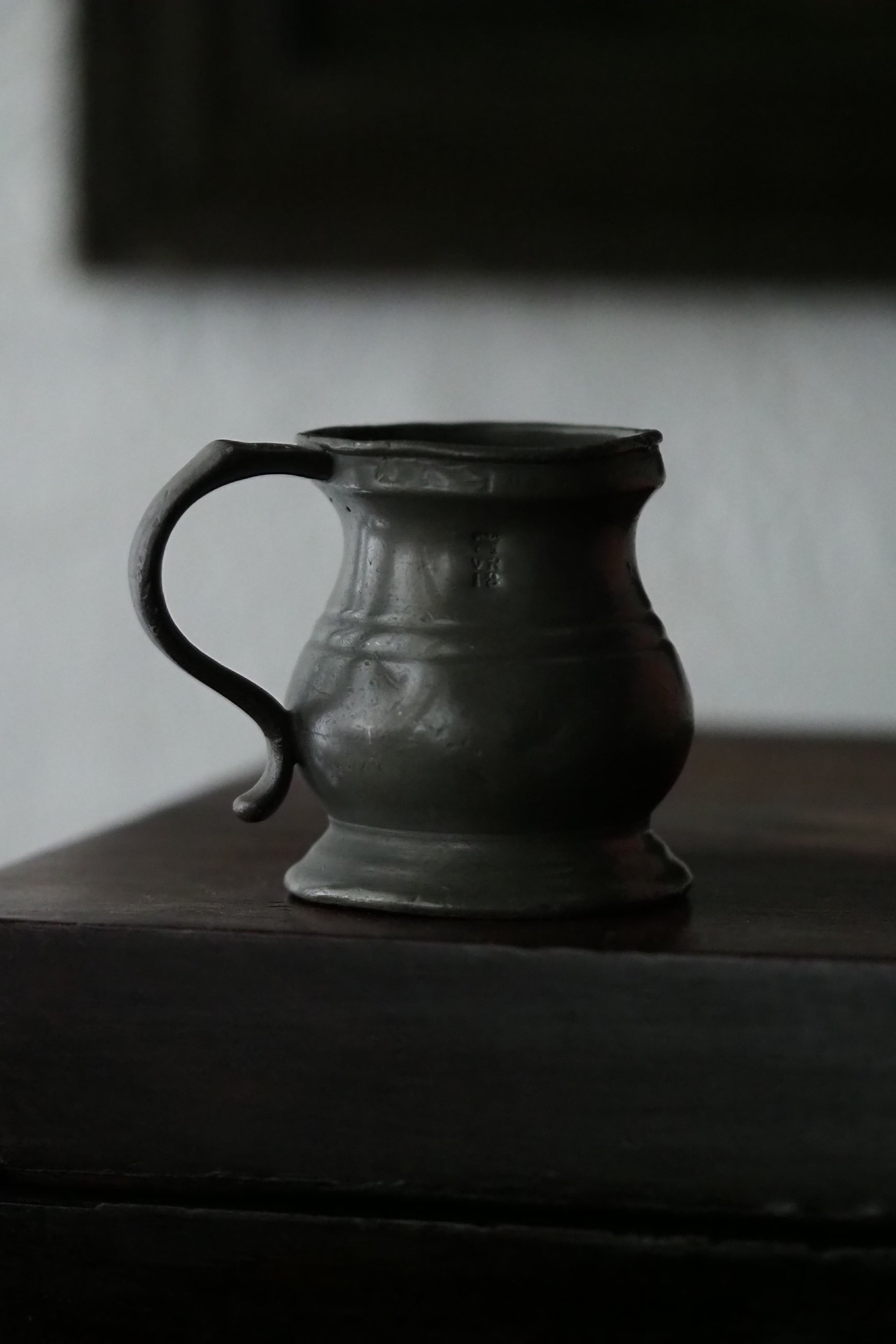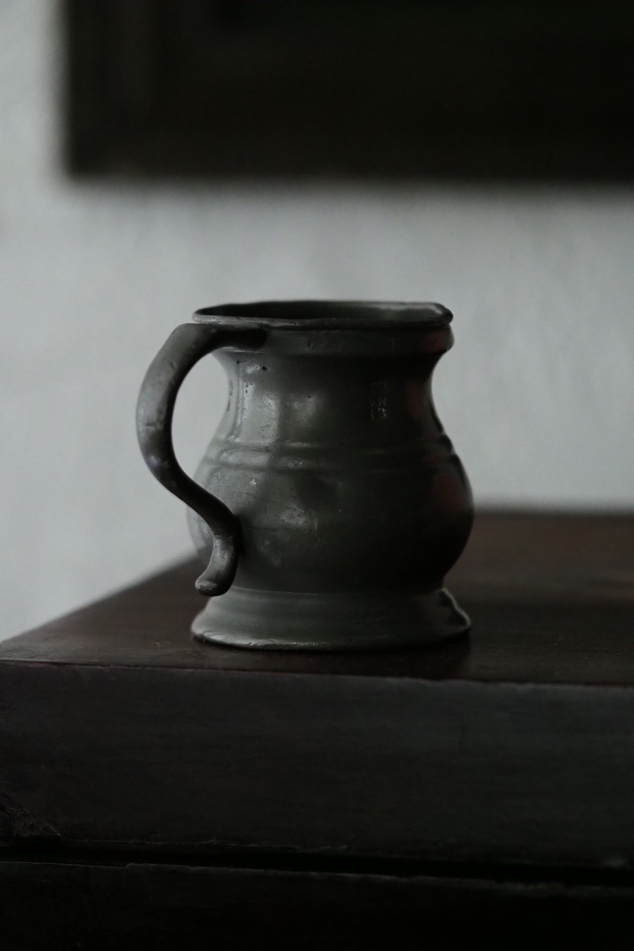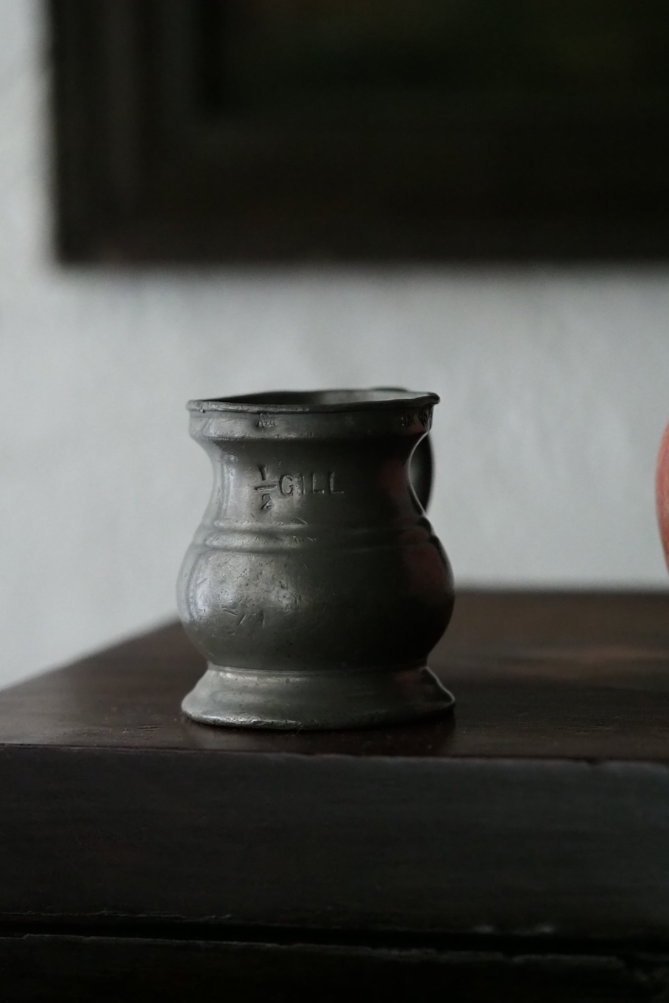 燻した低いトーンのピューター、アンティークなりの重さがある計量カップ。