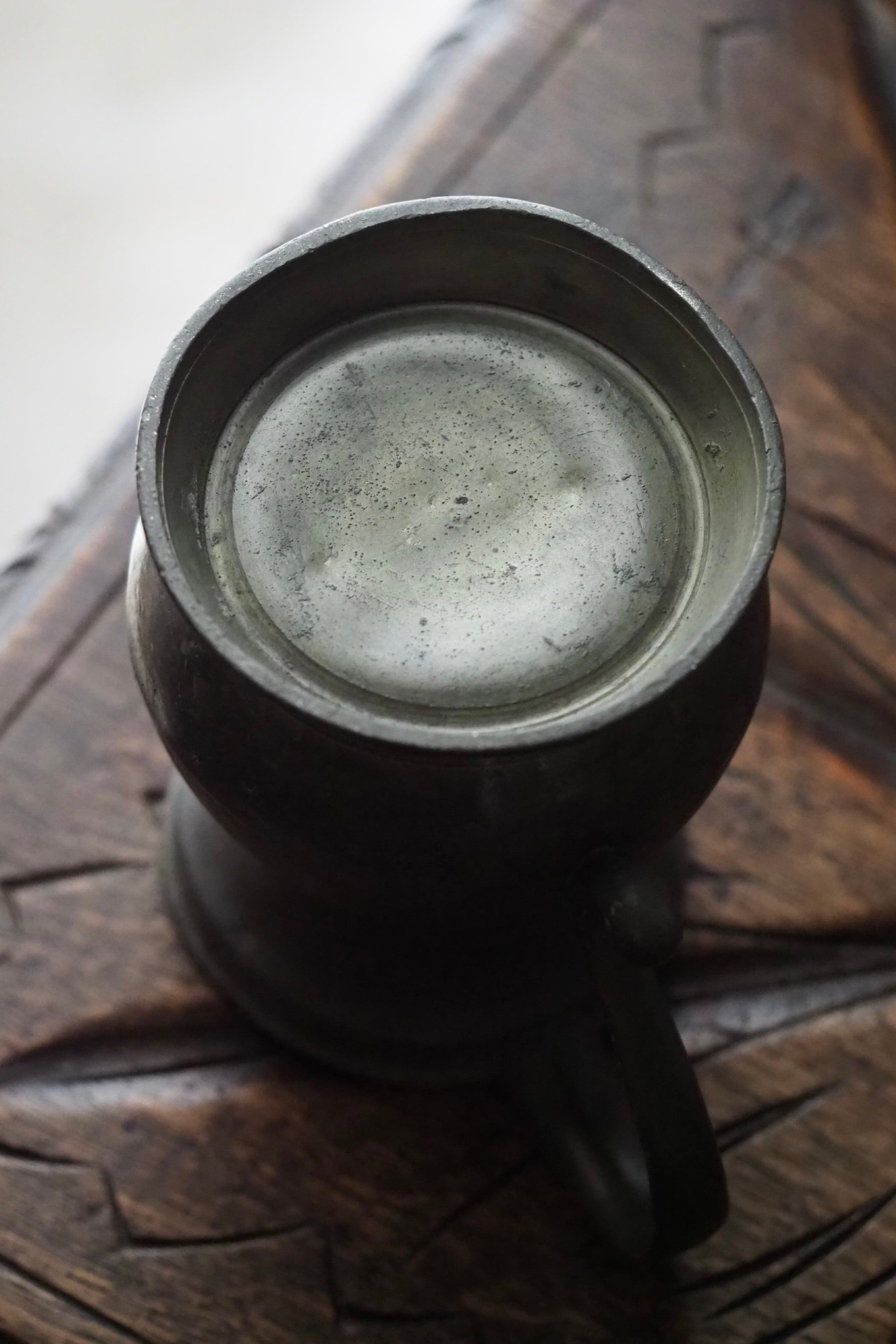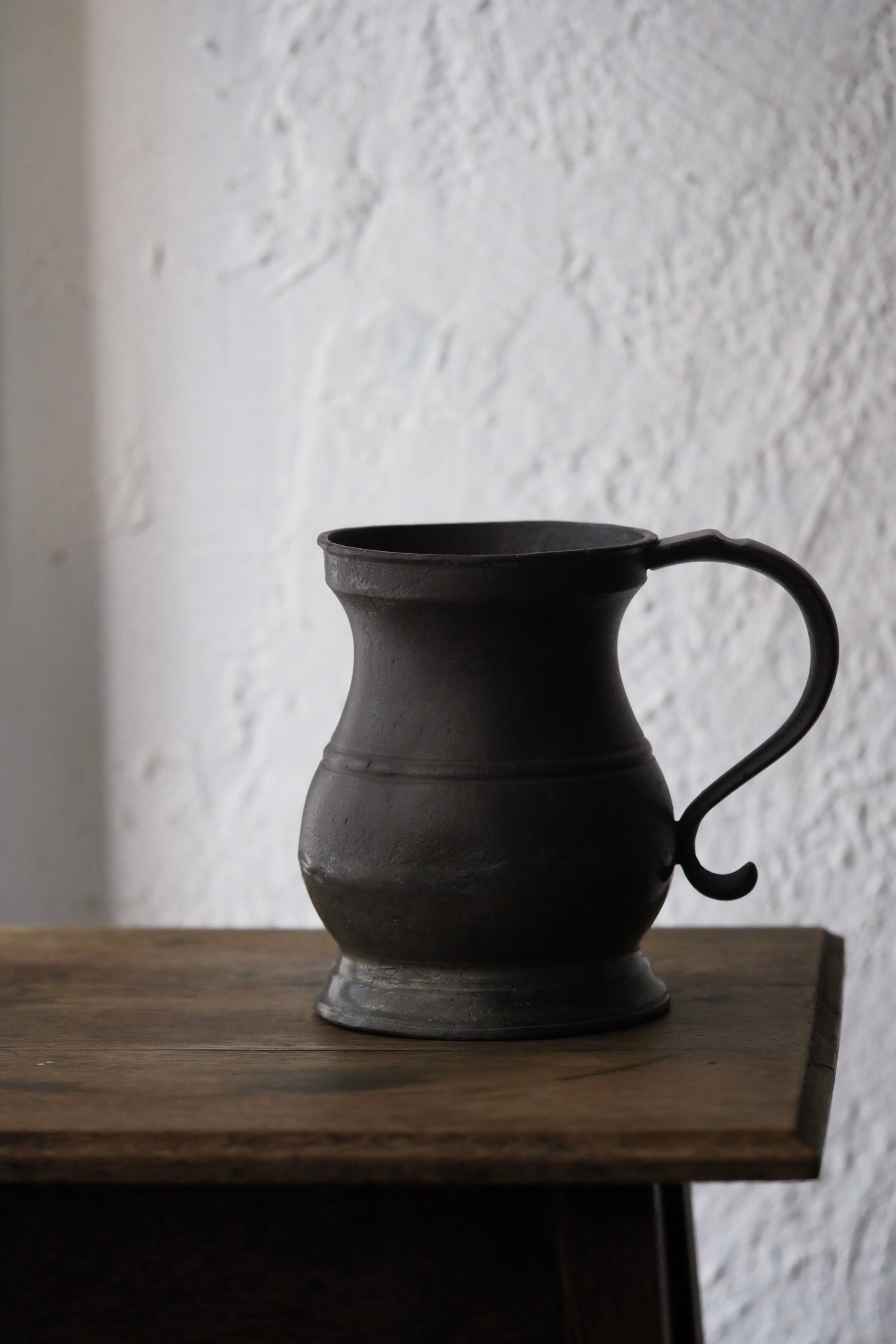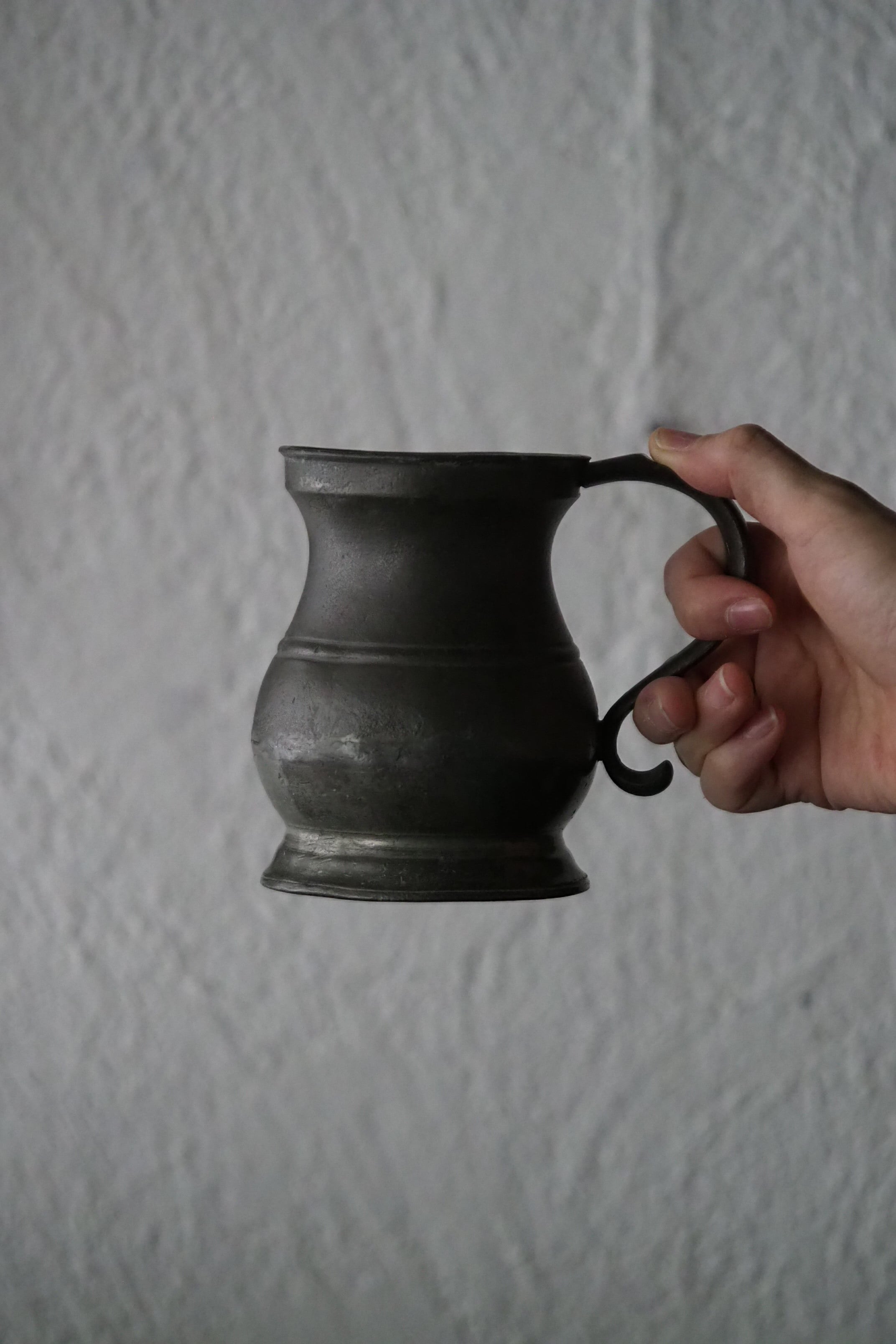 燻した低いトーンのピューター、アンティークなりの重さがある計量カップ。