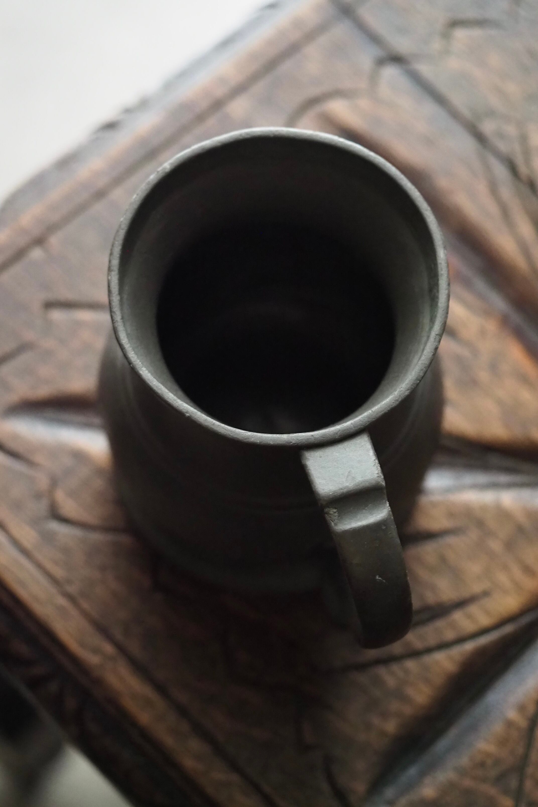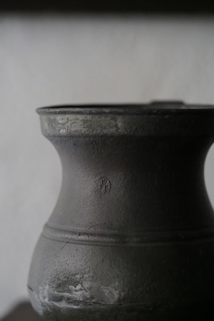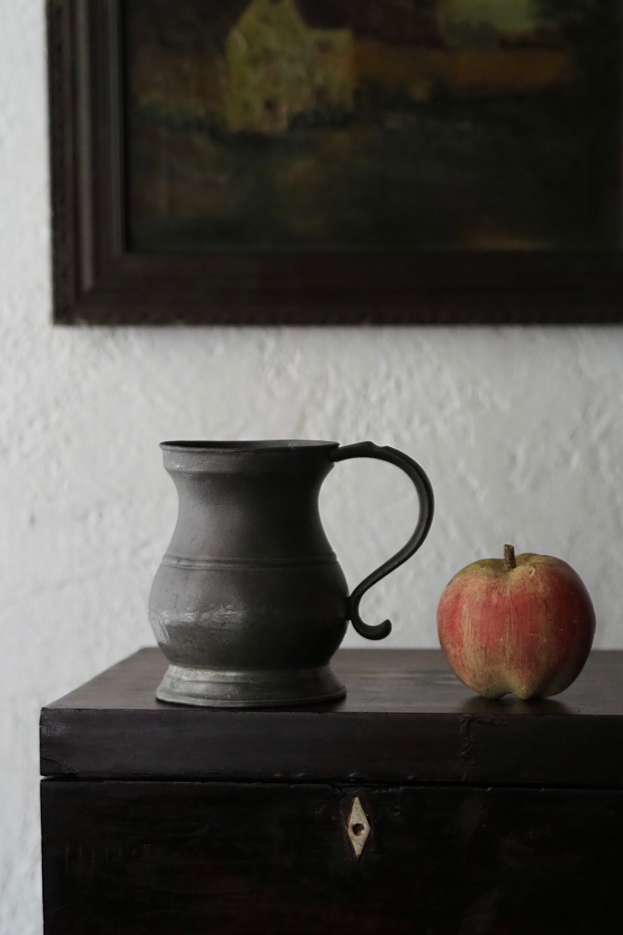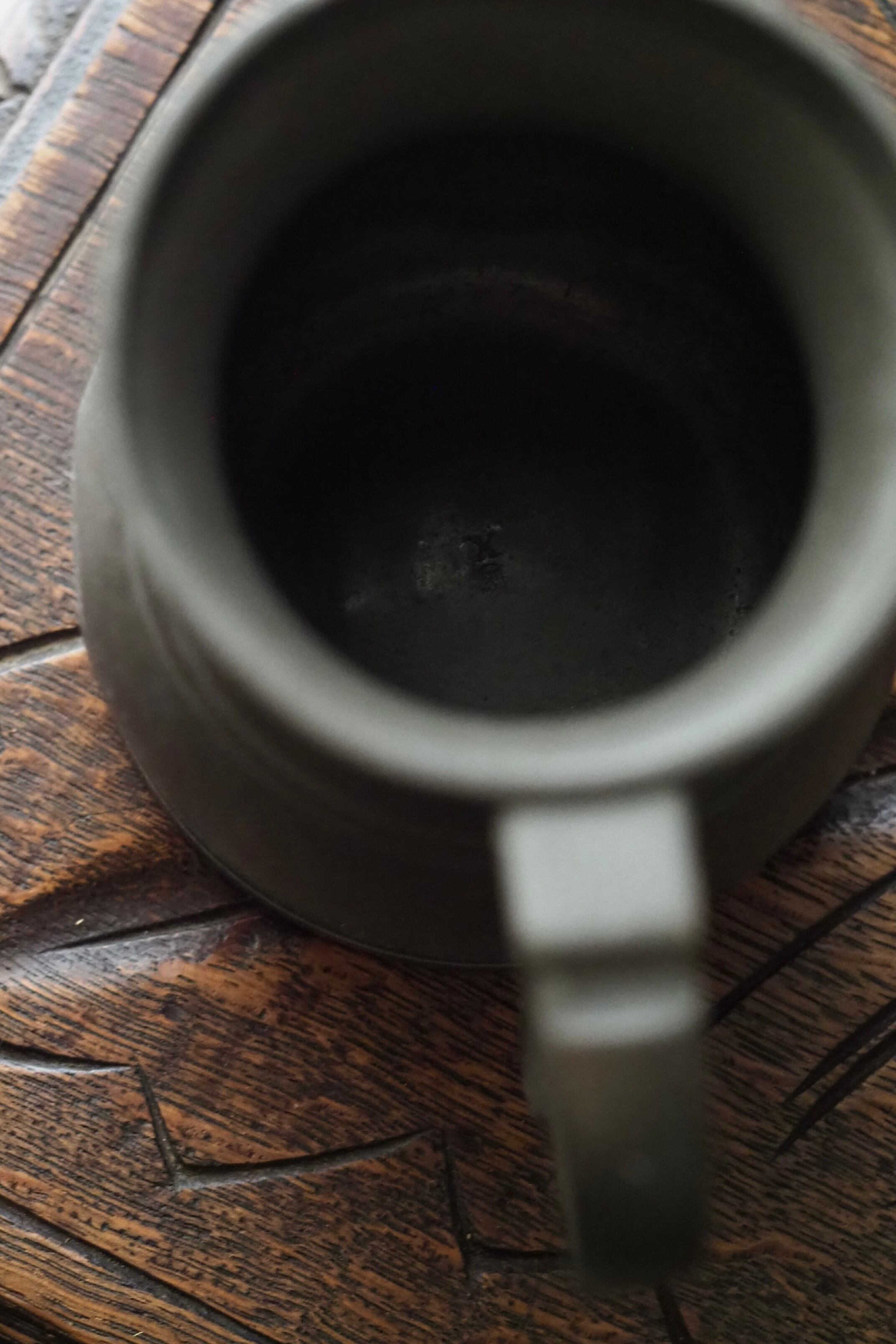 燻した低いトーンのピューター、アンティークなりの重さがある計量カップ。