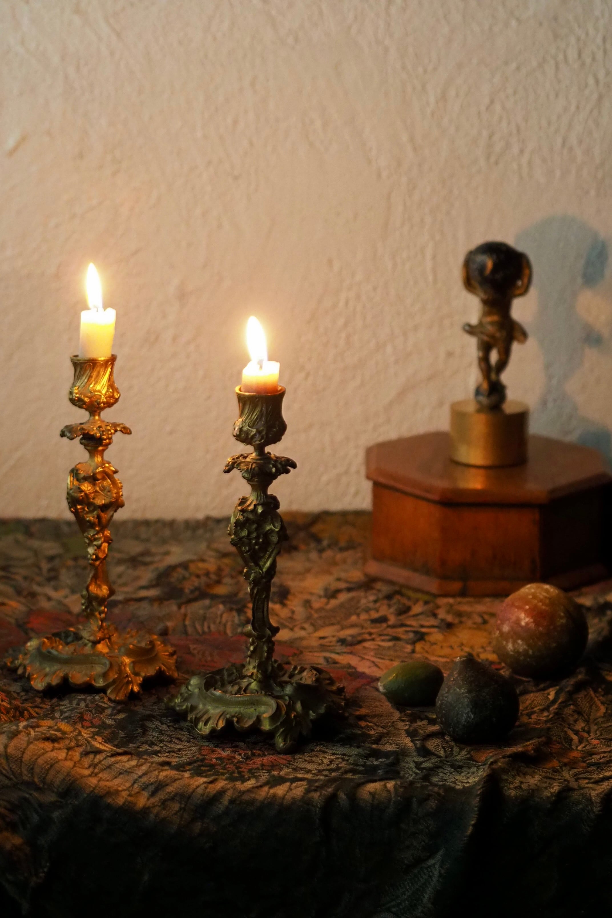 葡萄からまる流美なデザイン、真鍮製ペアの燭台。