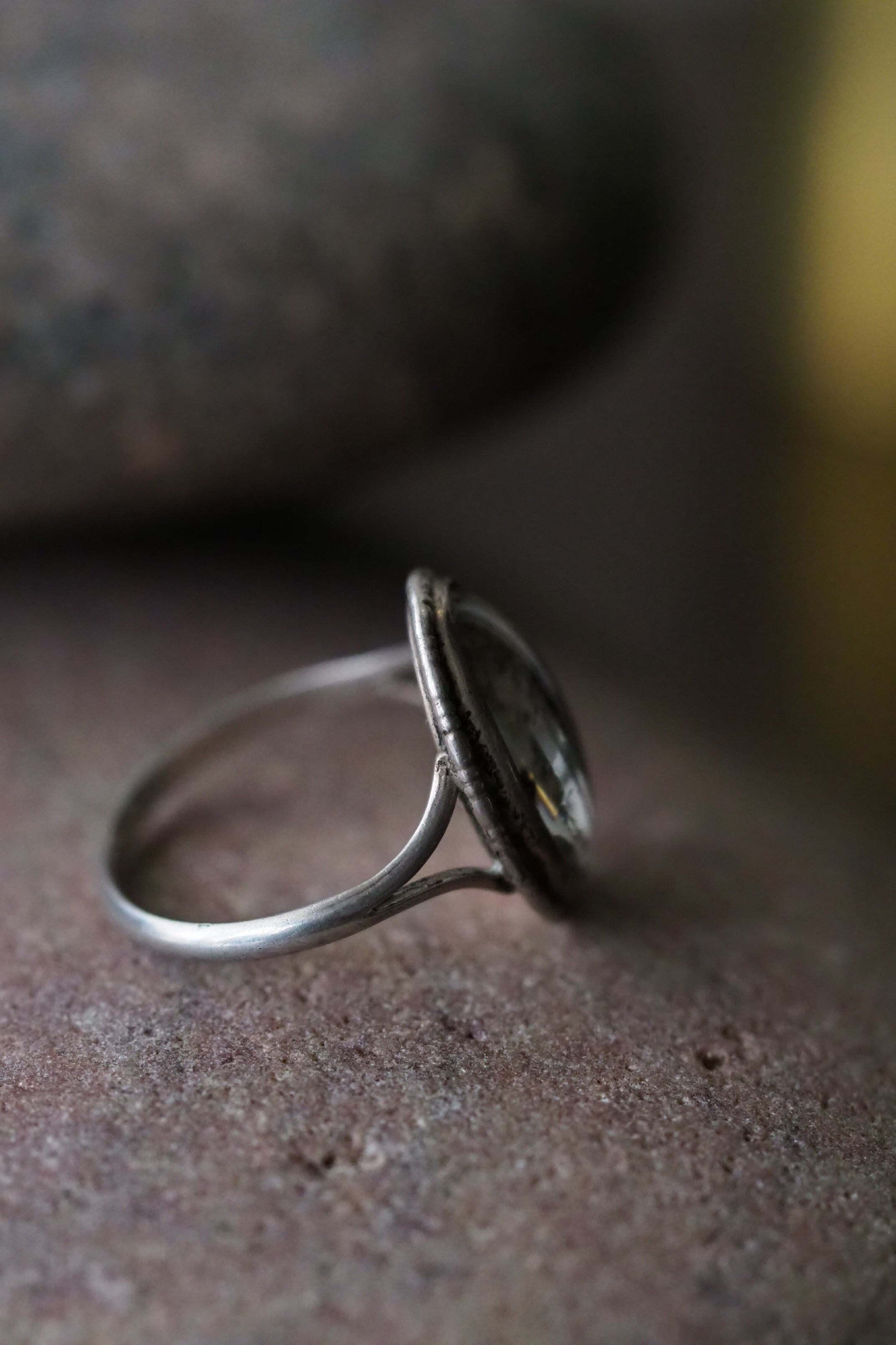 オーバルの石の中、闇が雪月を二分しているような印象のリング。