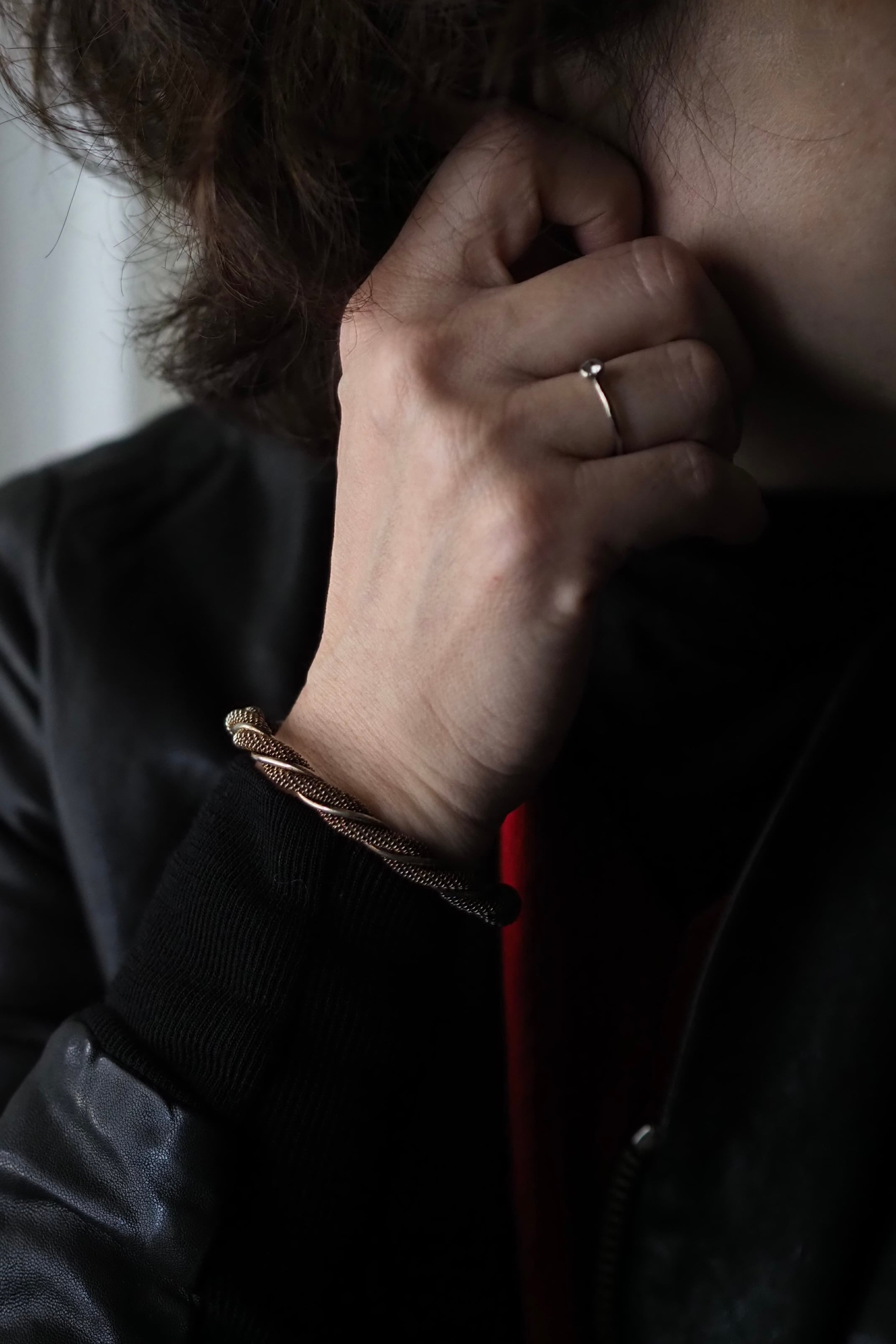 程良いボリュームでワイドバングルと重ね付けしてもすっきりと馴染む。