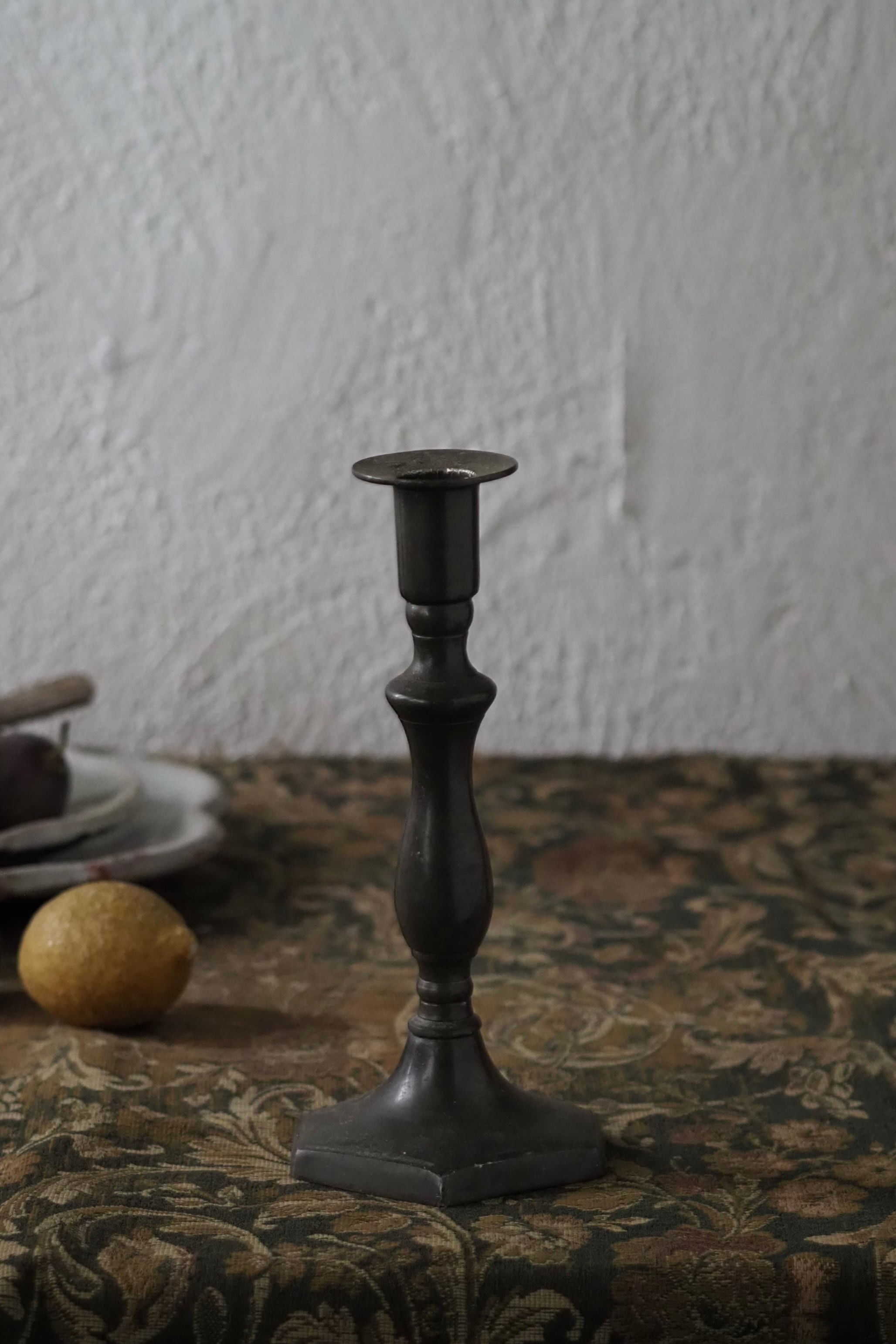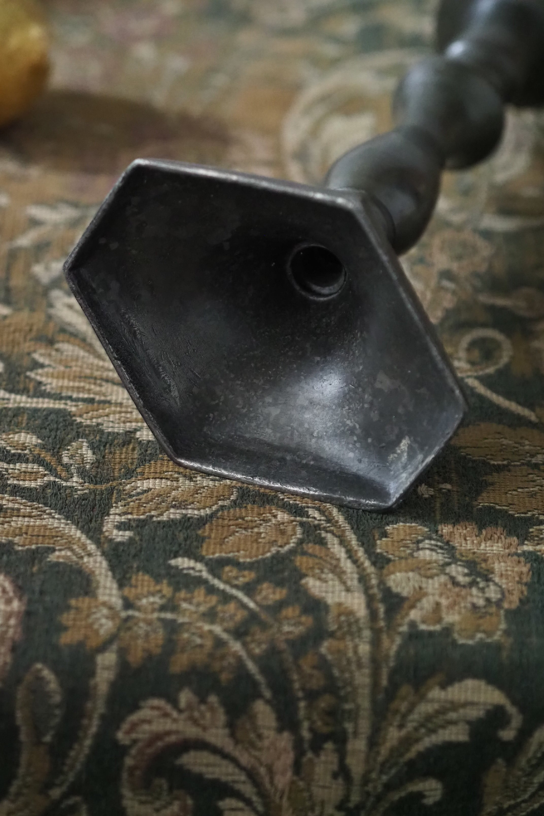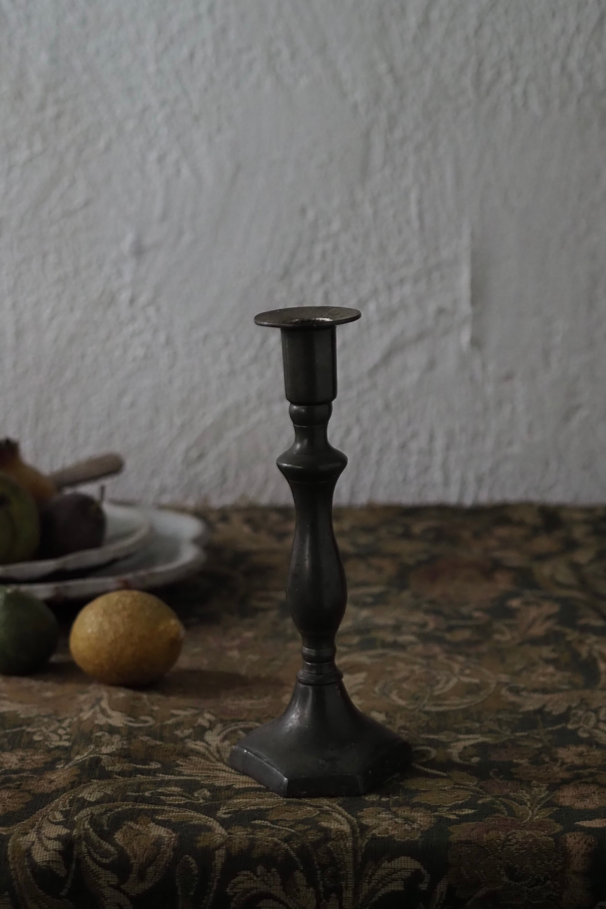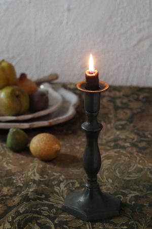 台座の六角形のシャープさと支柱の緩やかなラインの連なりを合わせ持ったシングルの燭台。