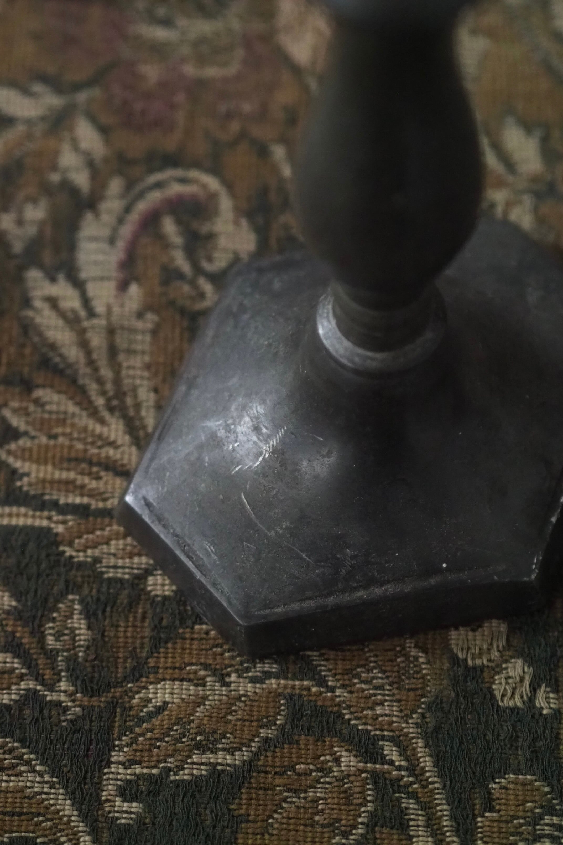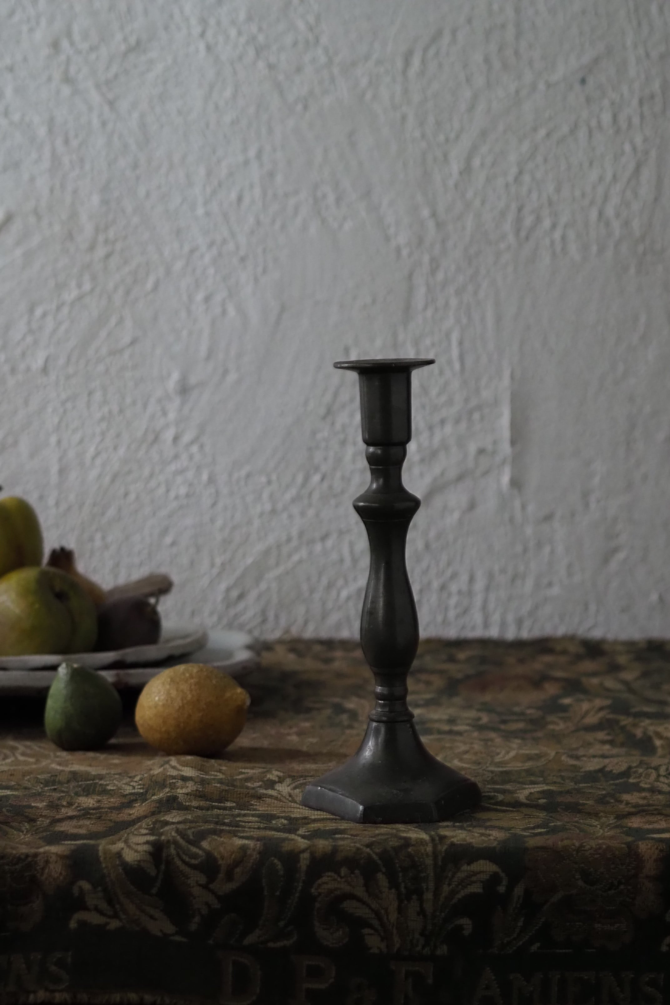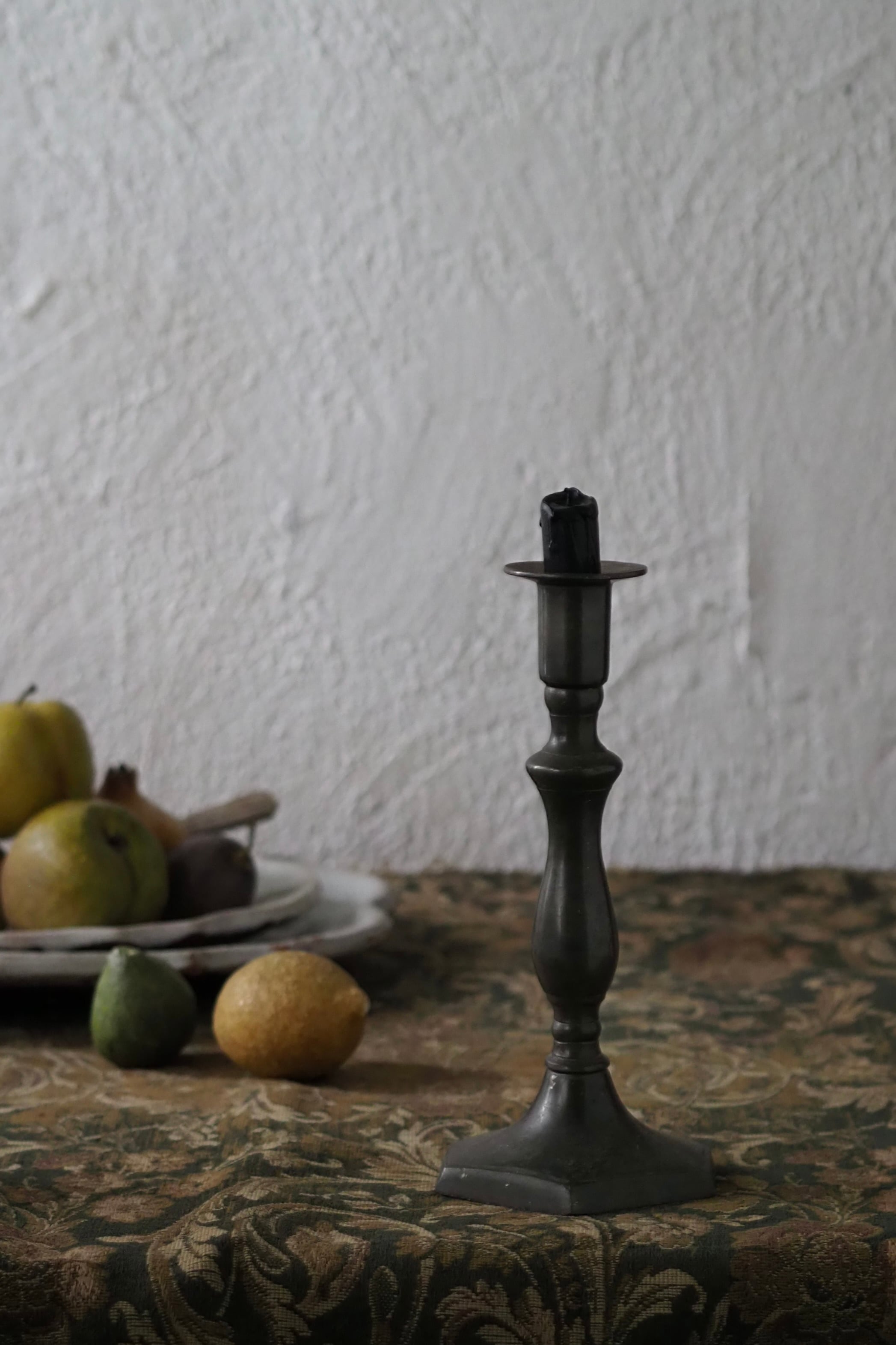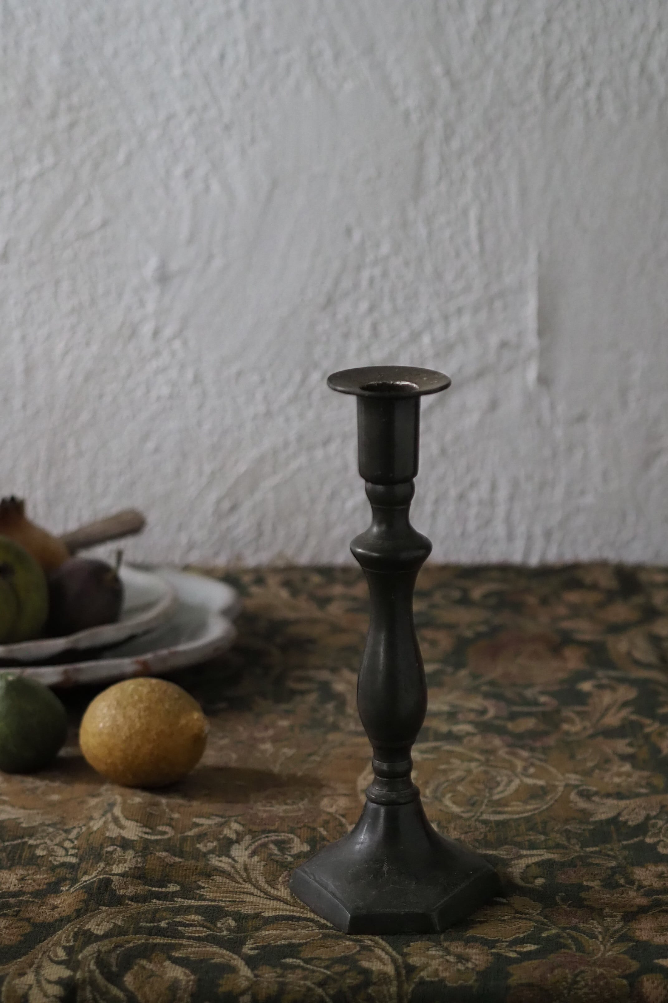 台座の六角形のシャープさと支柱の緩やかなラインの連なりを合わせ持ったシングルの燭台。
