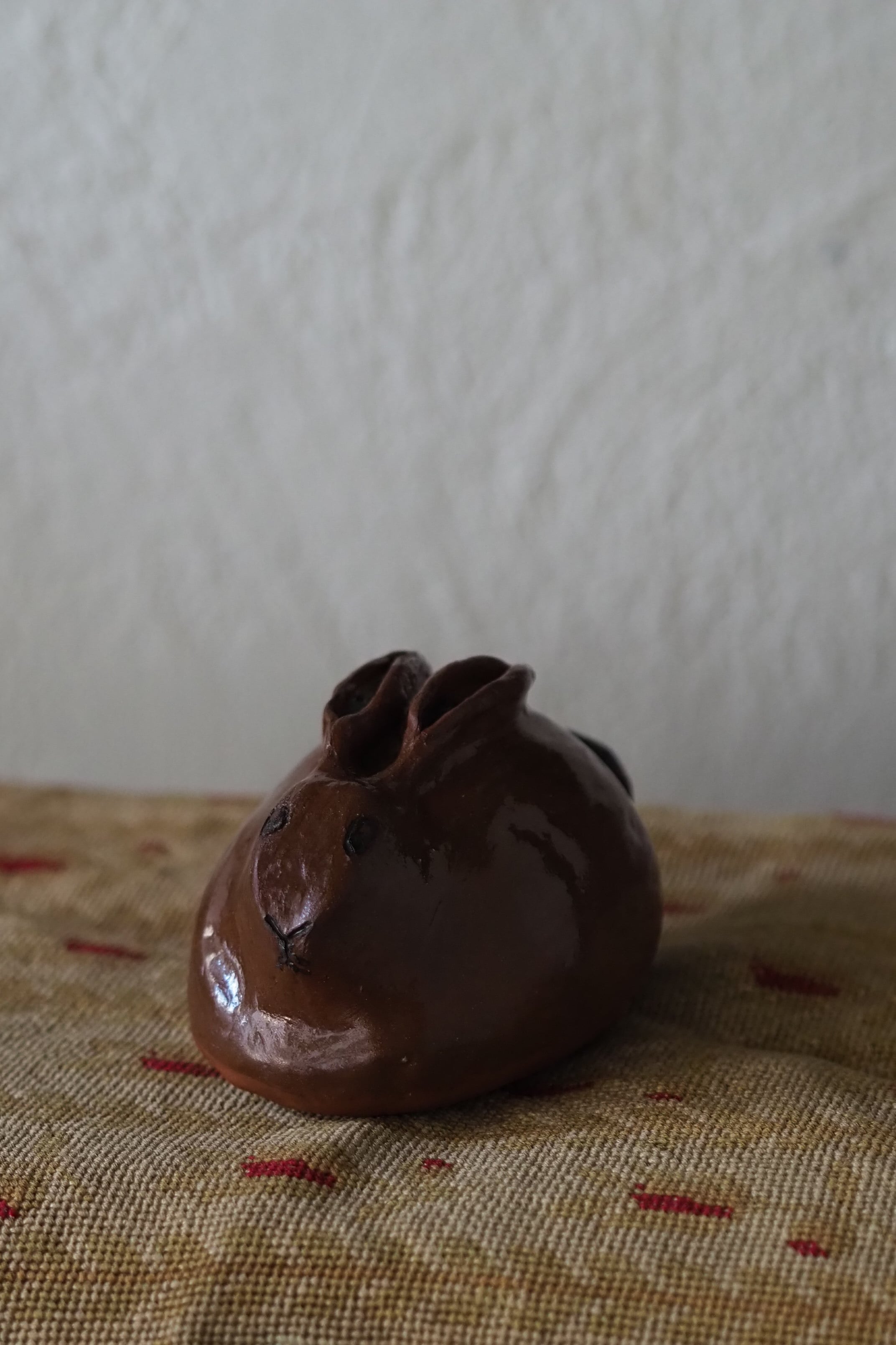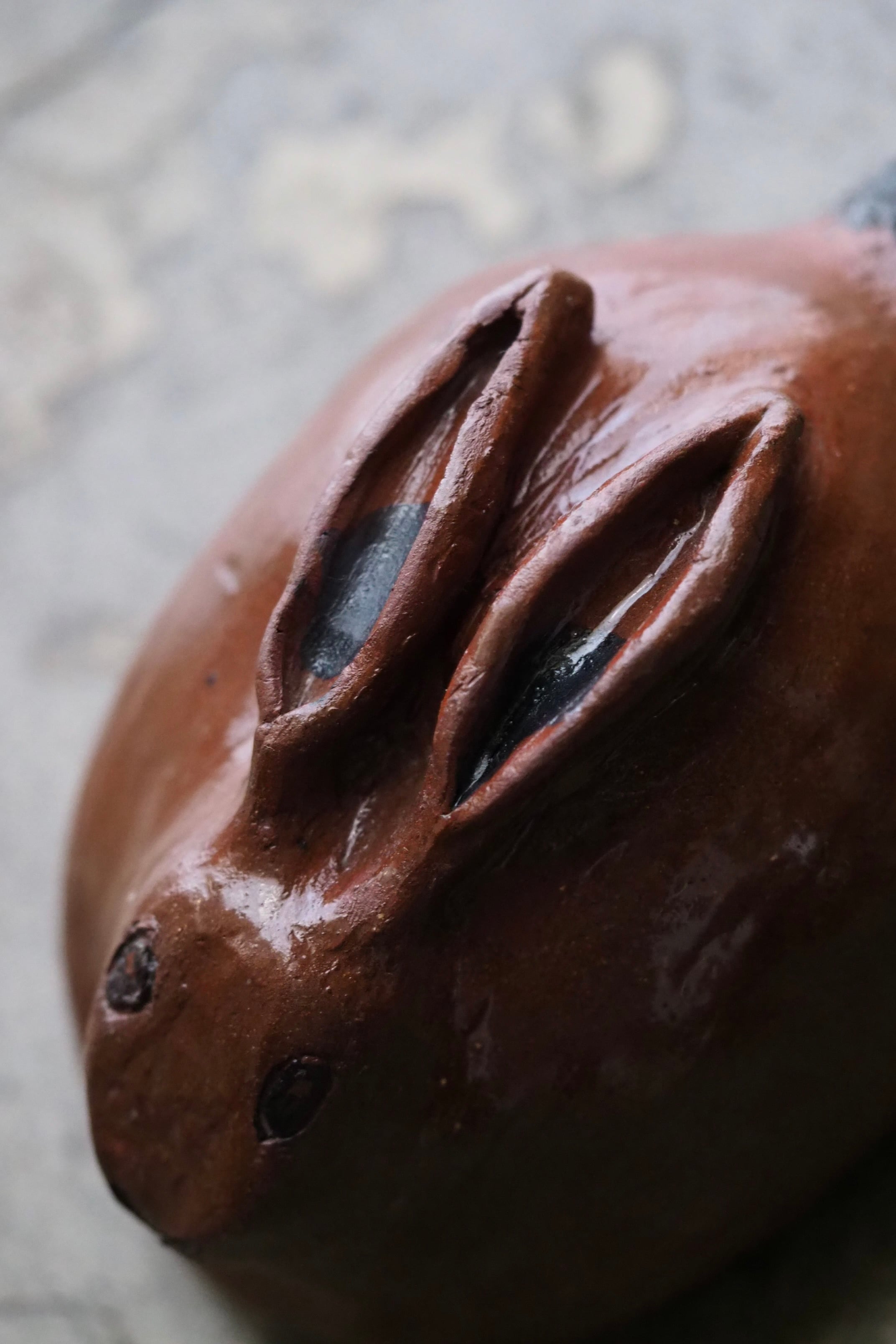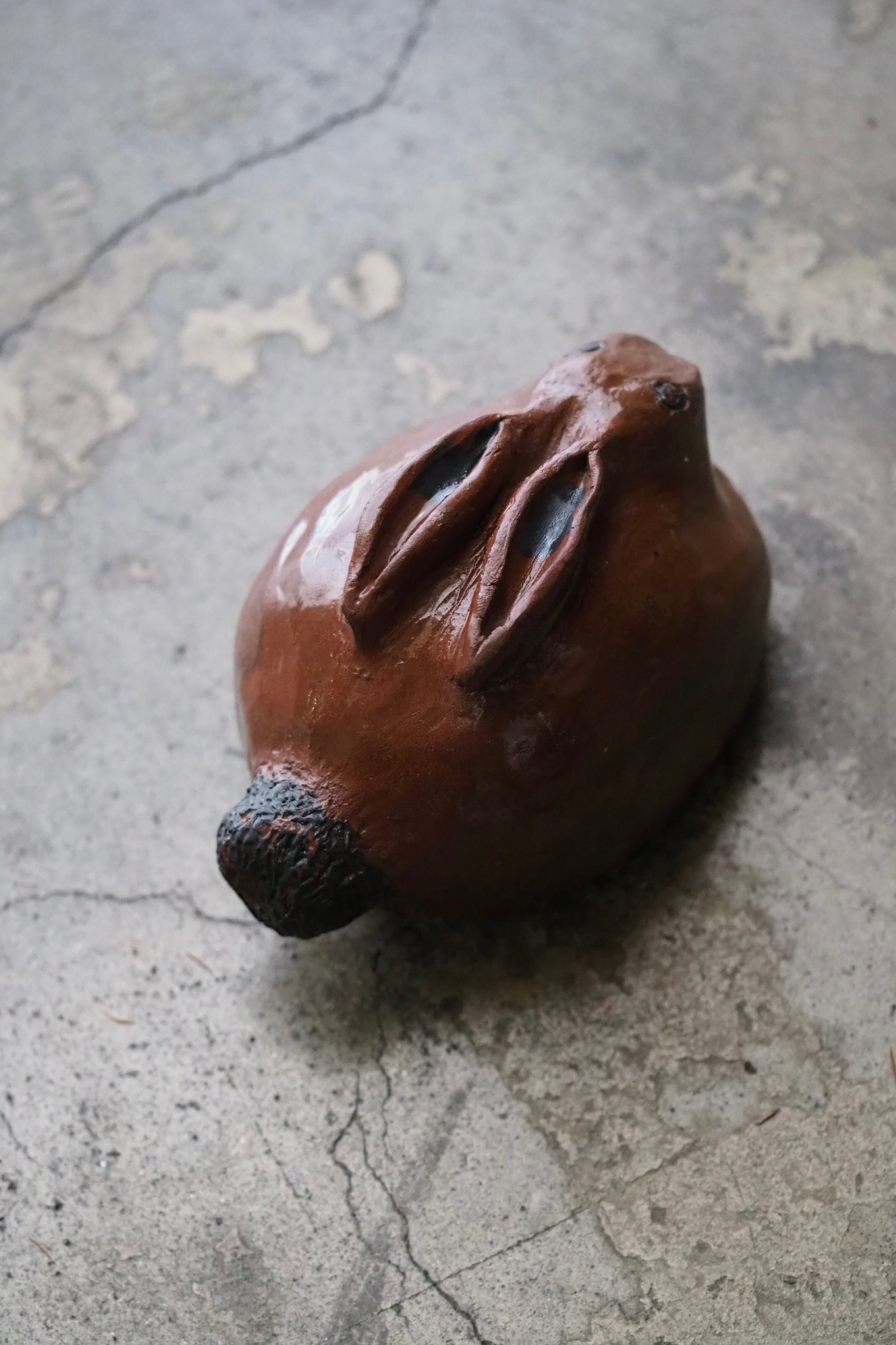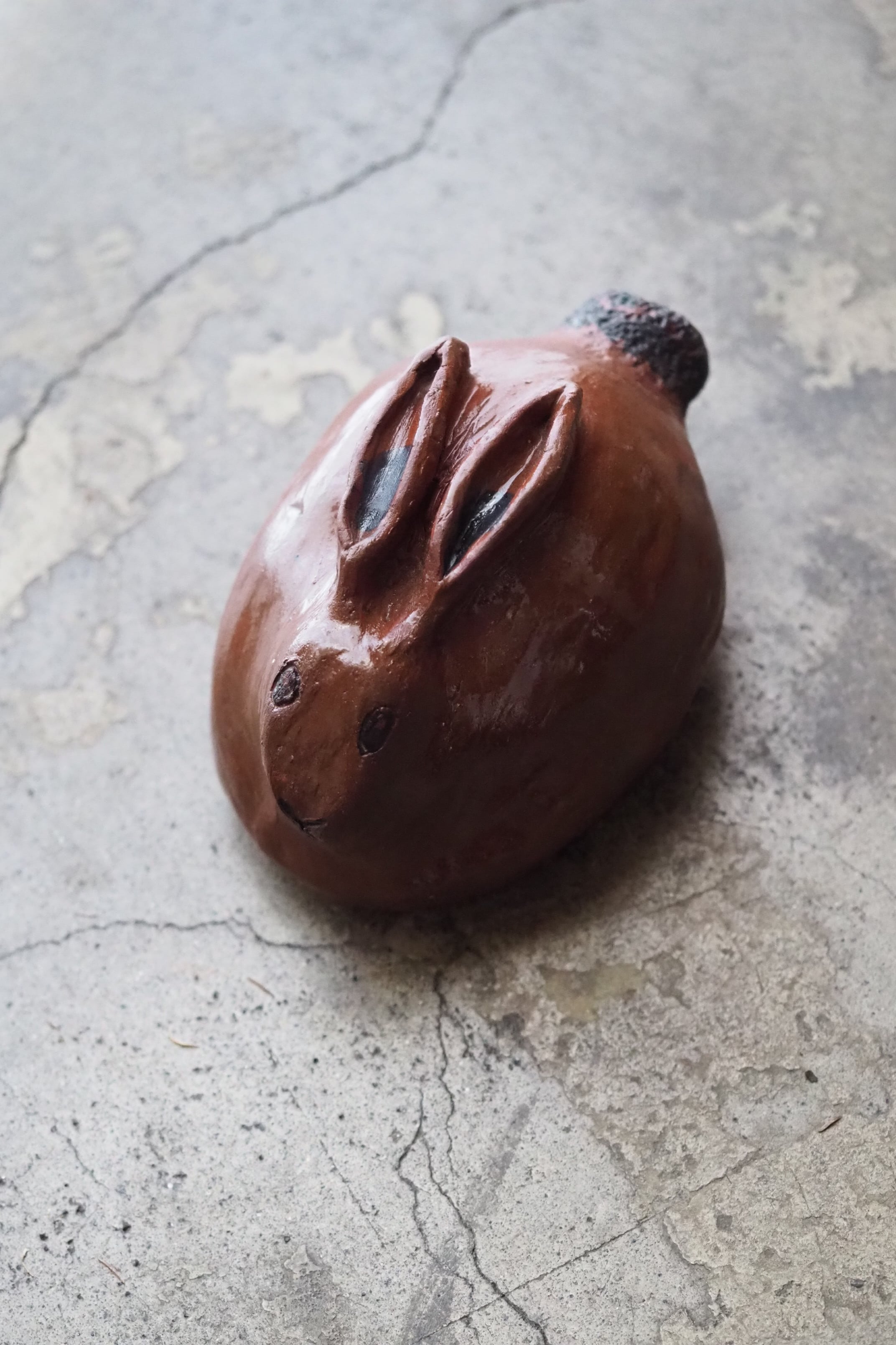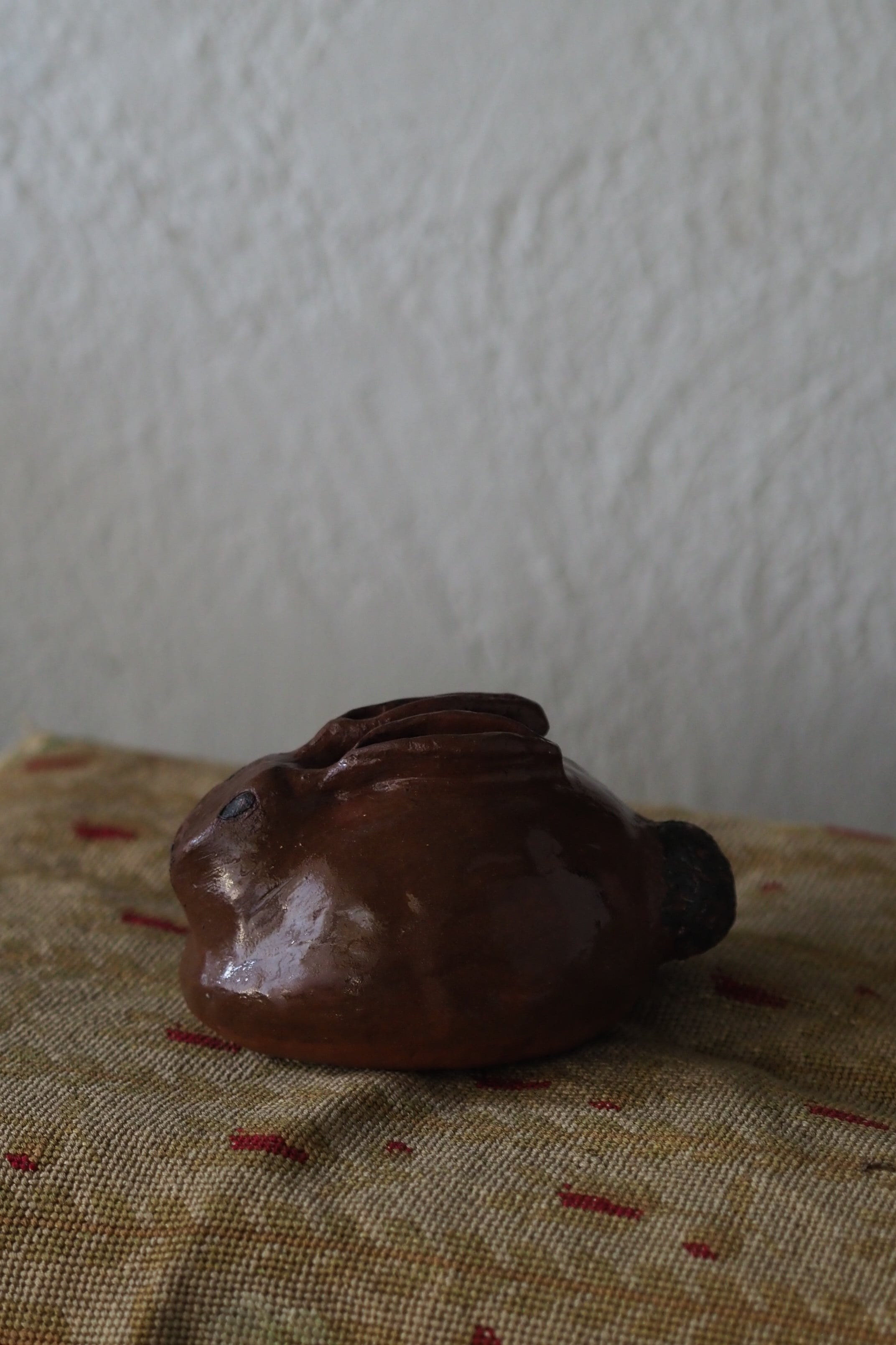 野うさぎが丸くなってうずくまる姿を良く捉えているテラコッタのオブジェ。