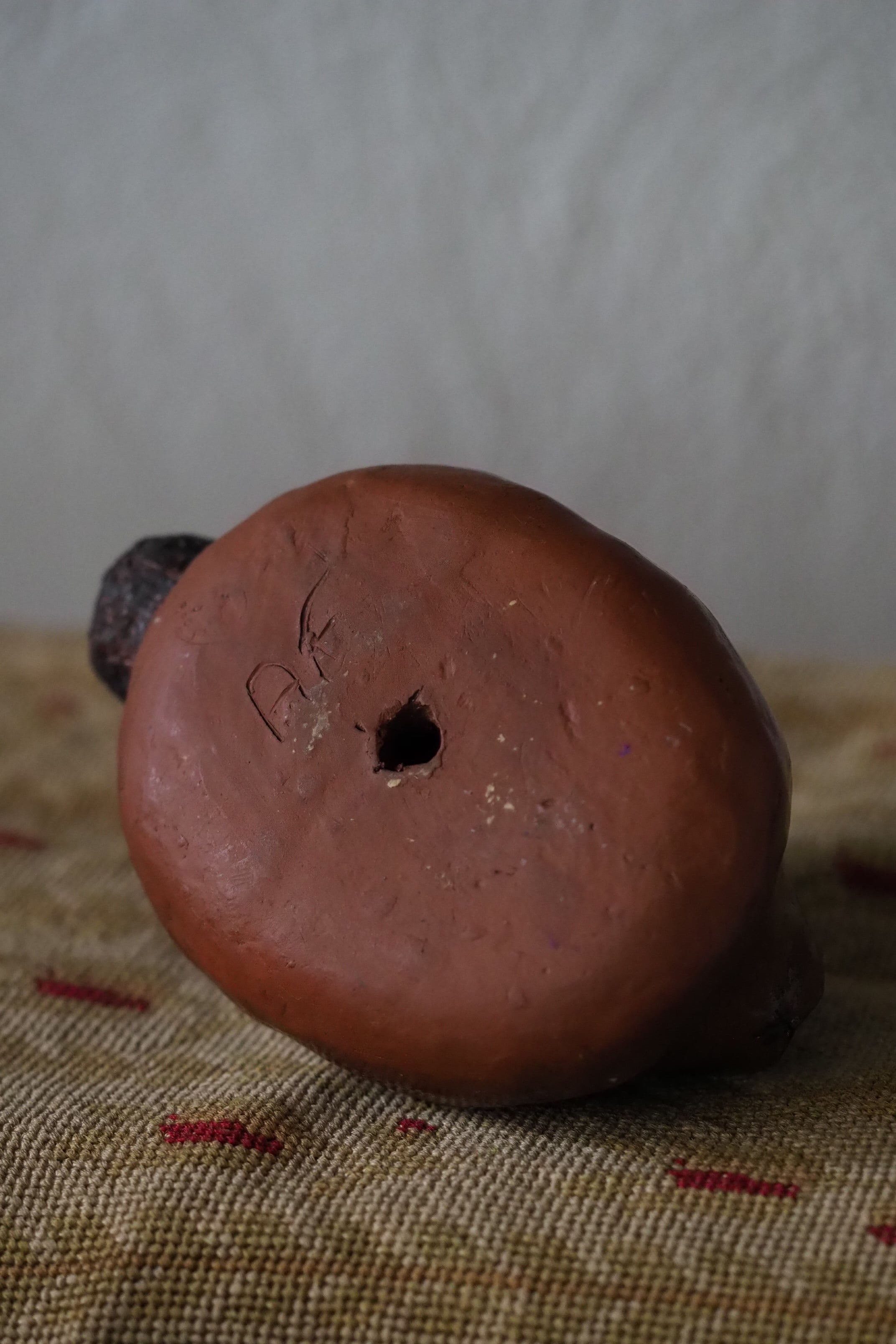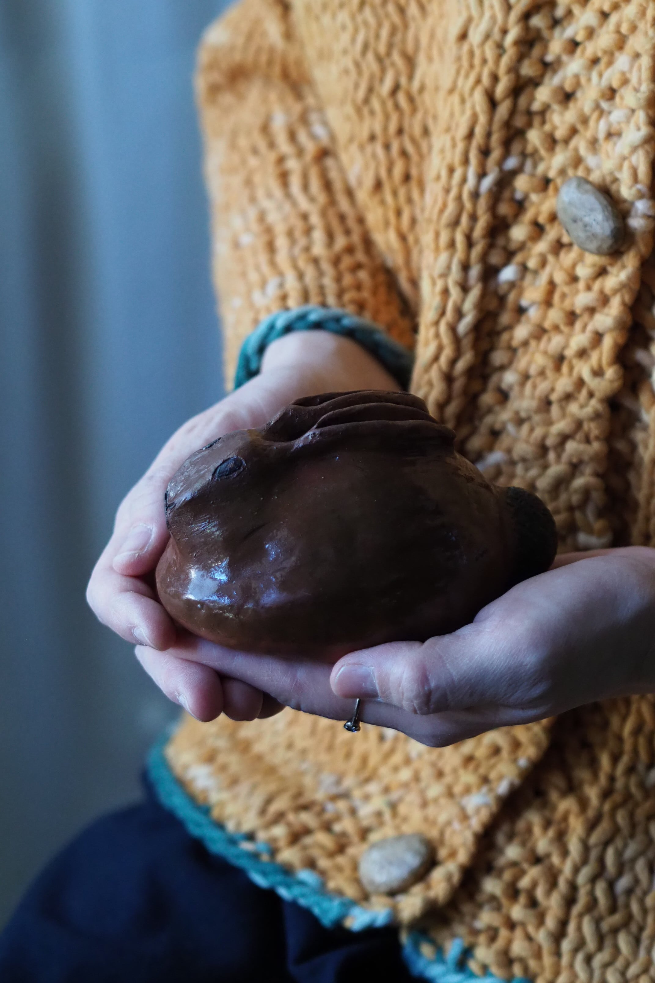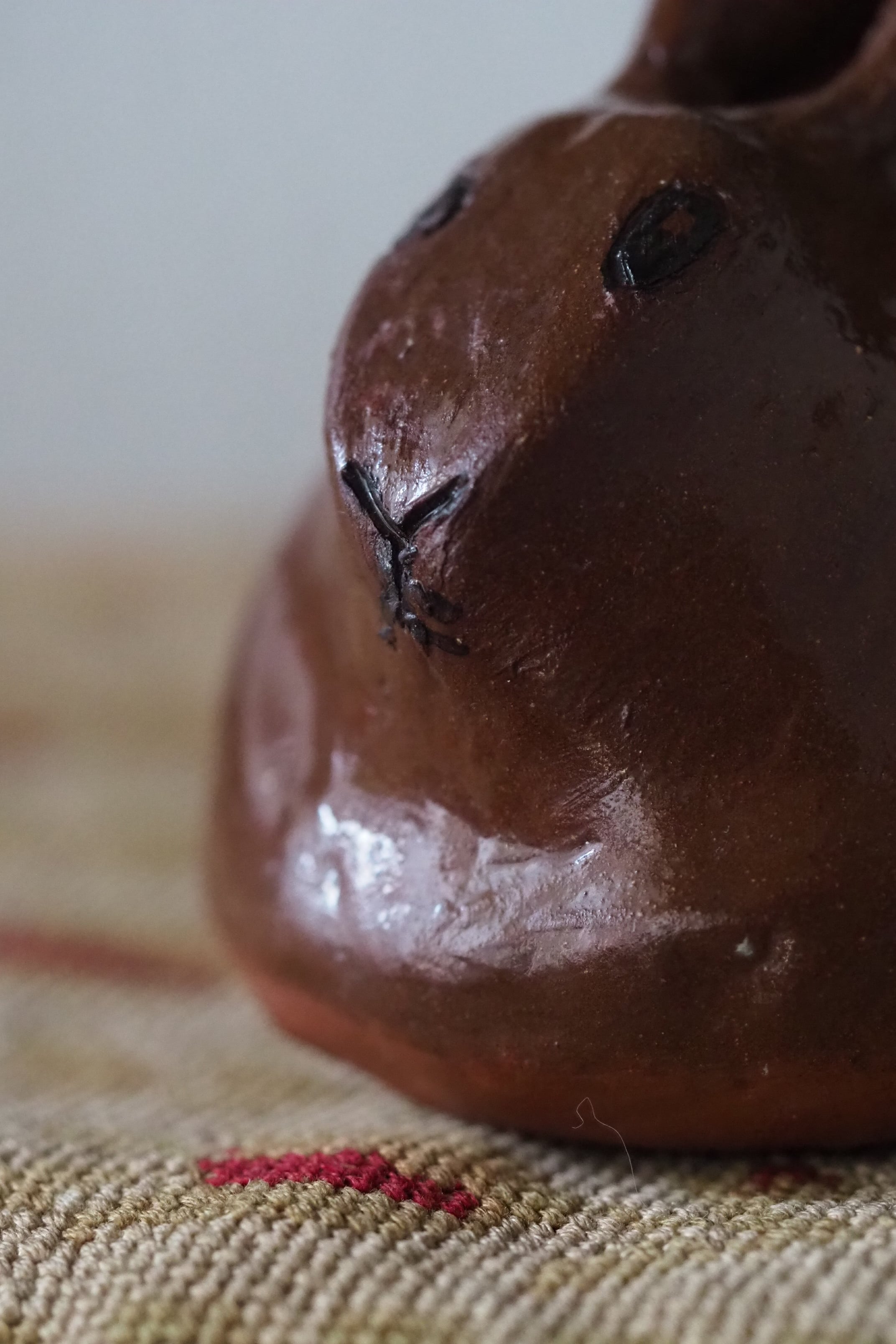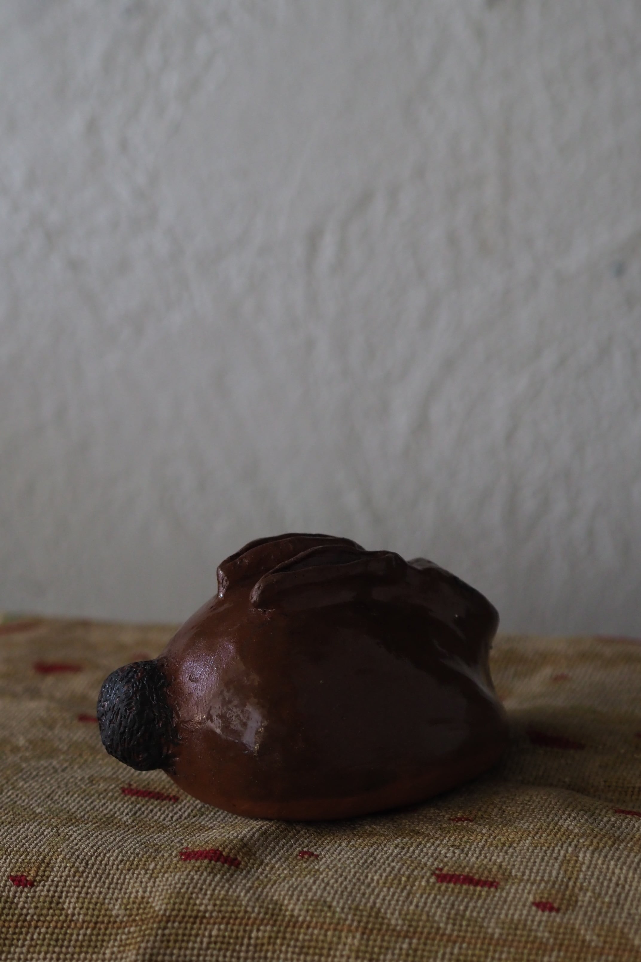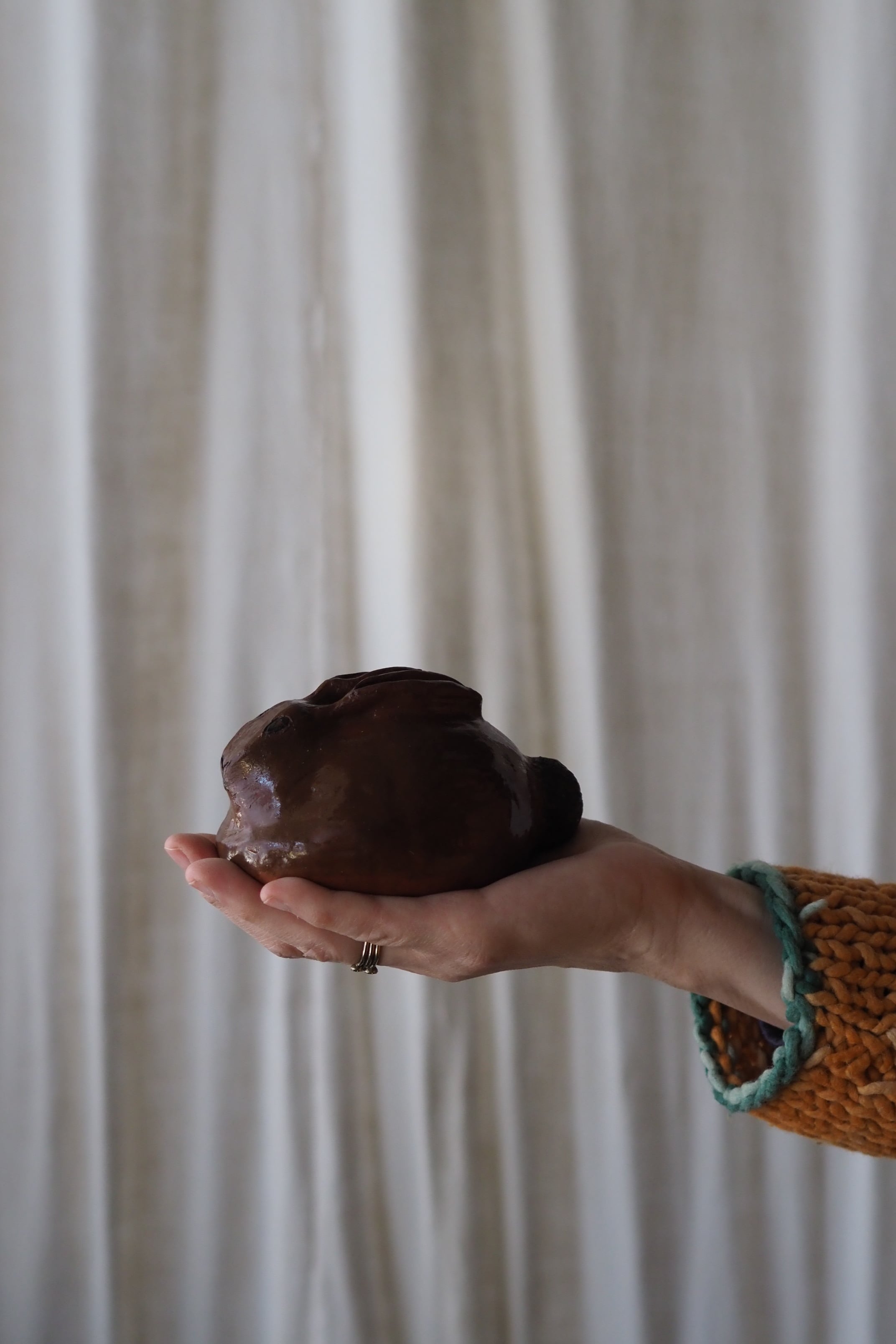 野うさぎが丸くなってうずくまる姿を良く捉えているテラコッタのオブジェ。