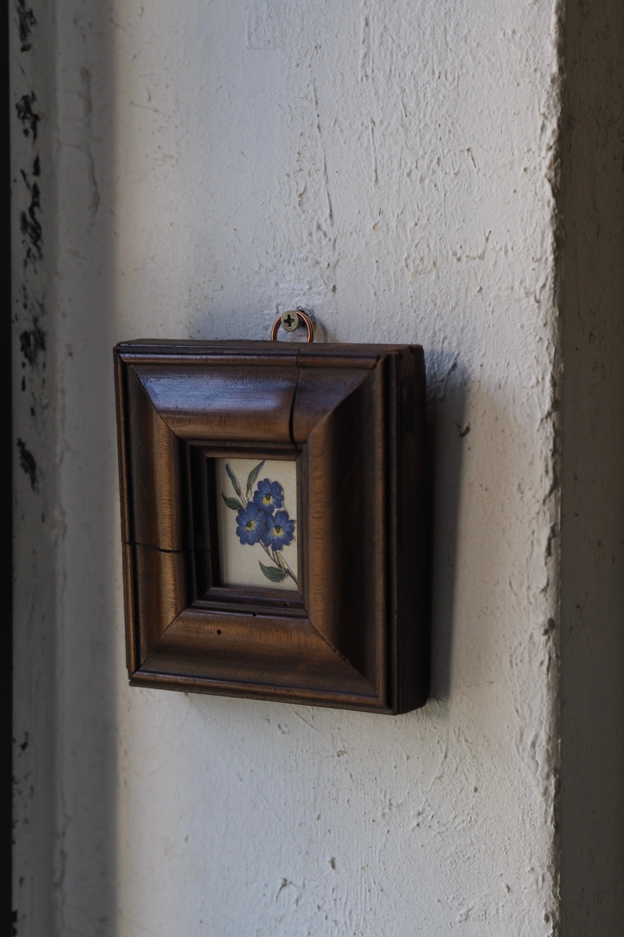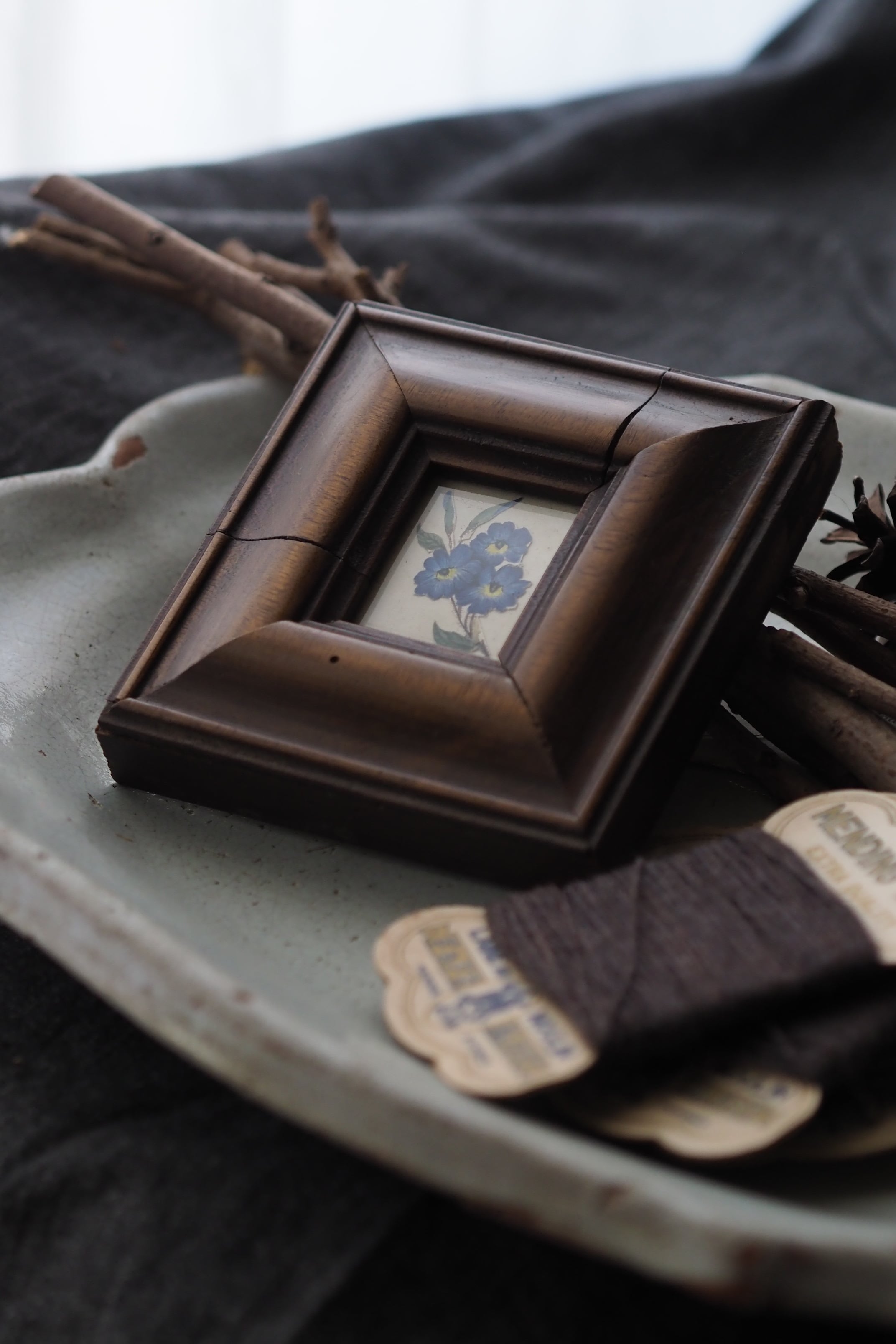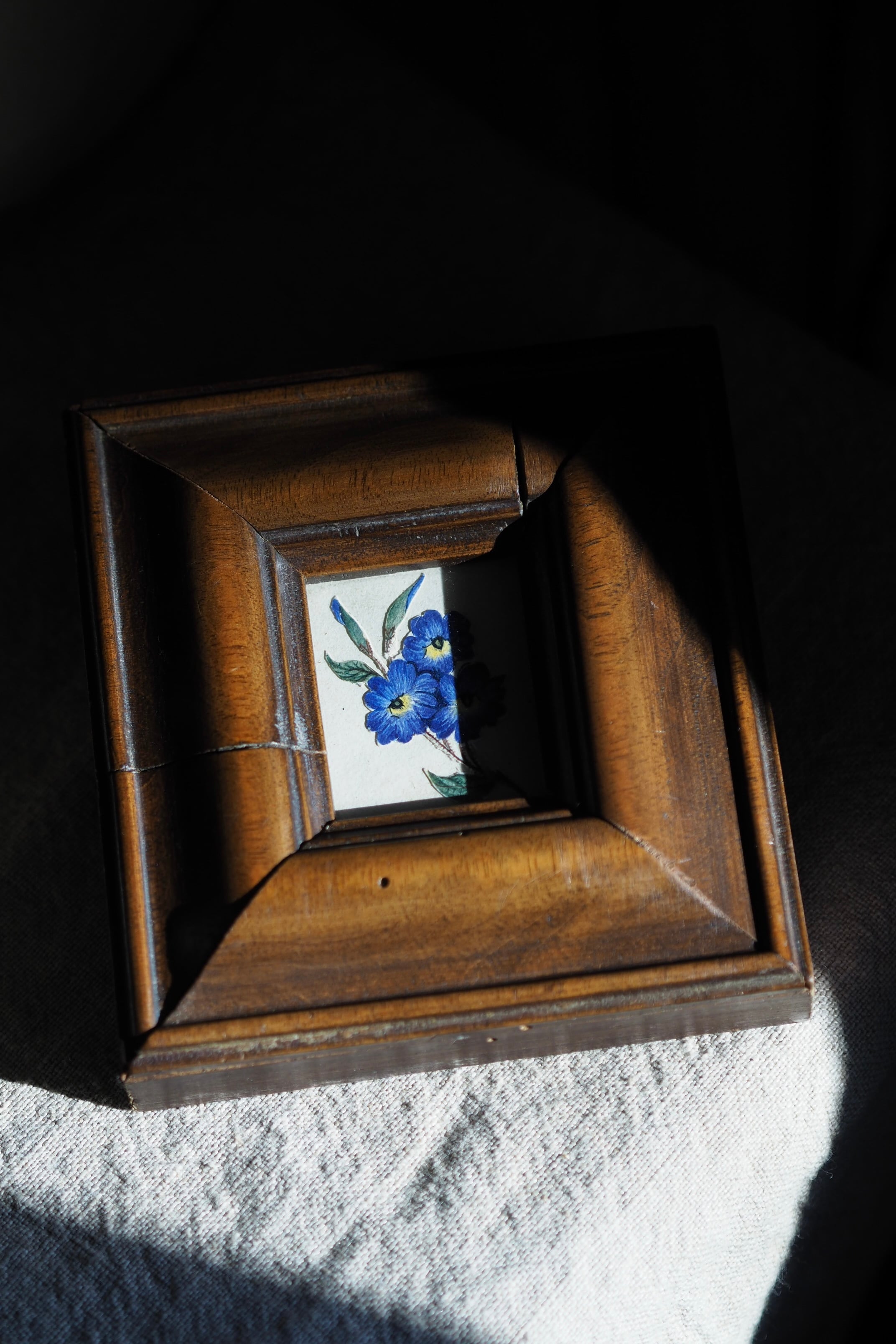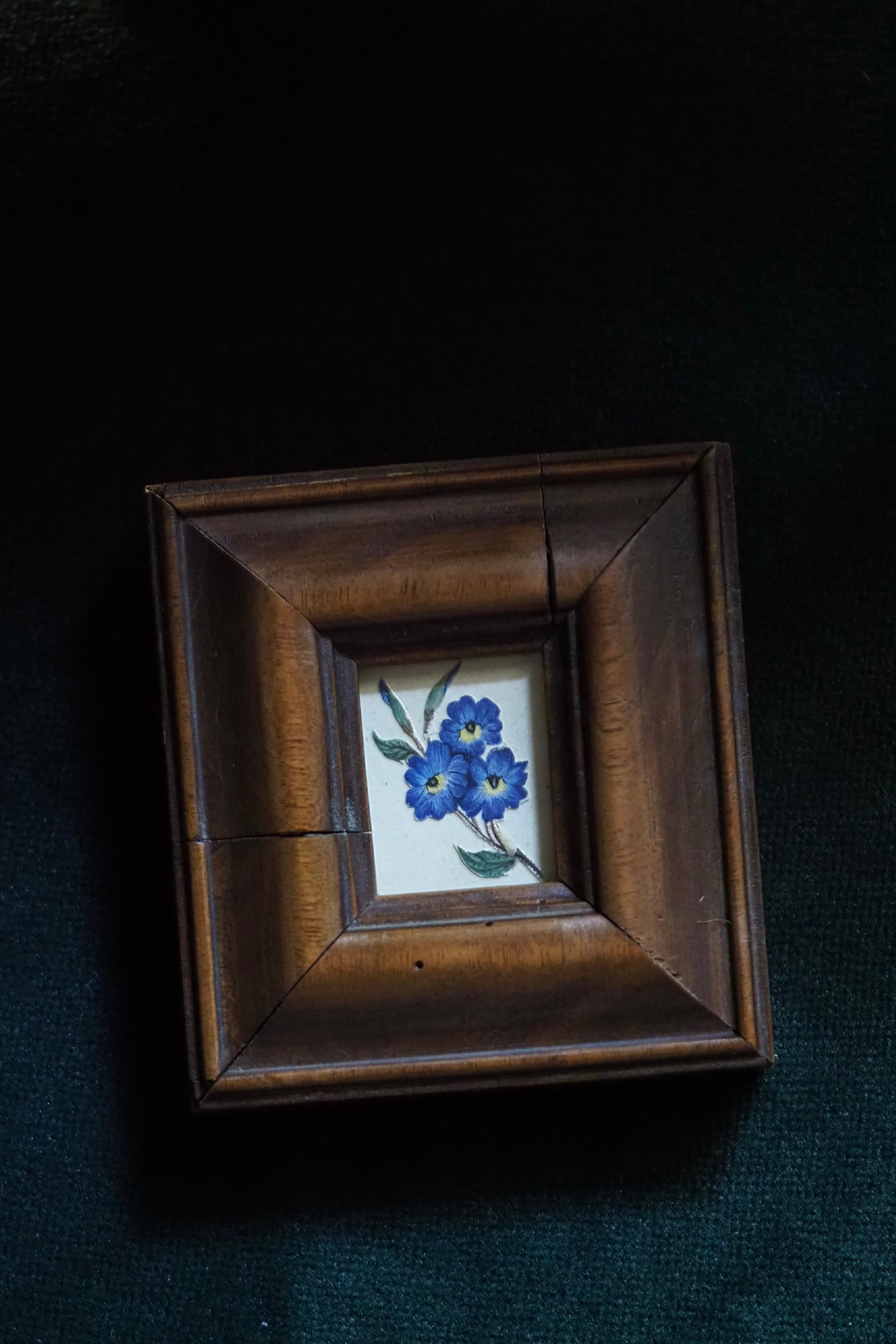 ラピスラズリに冴えた青の小花がこちらを向いて小窓に収まっている、雰囲気たっぷりな小さな額縁。