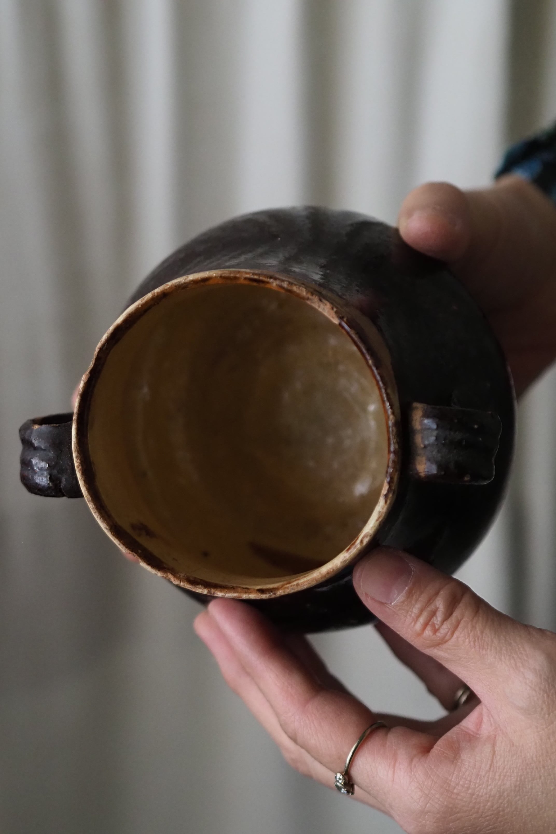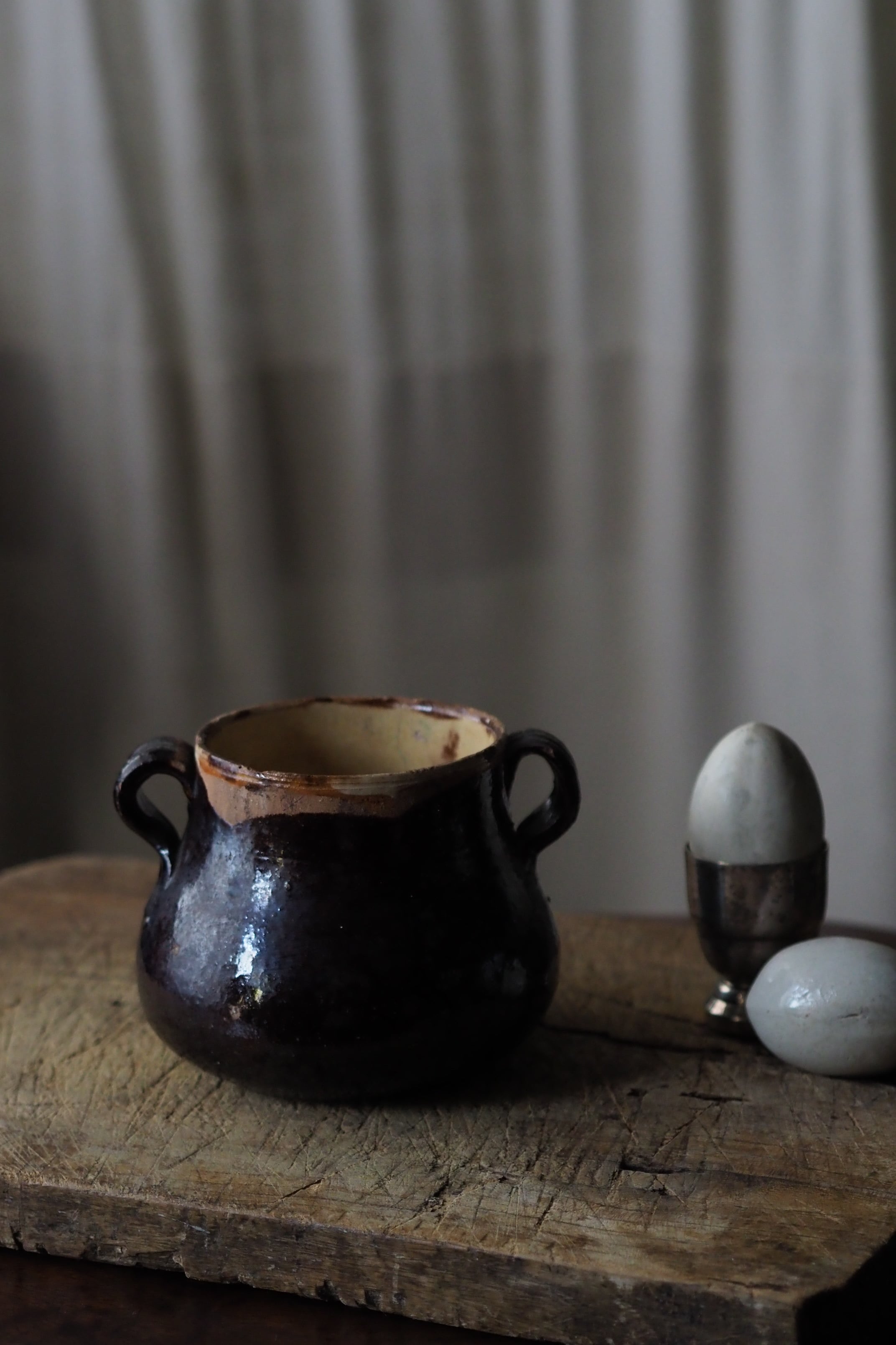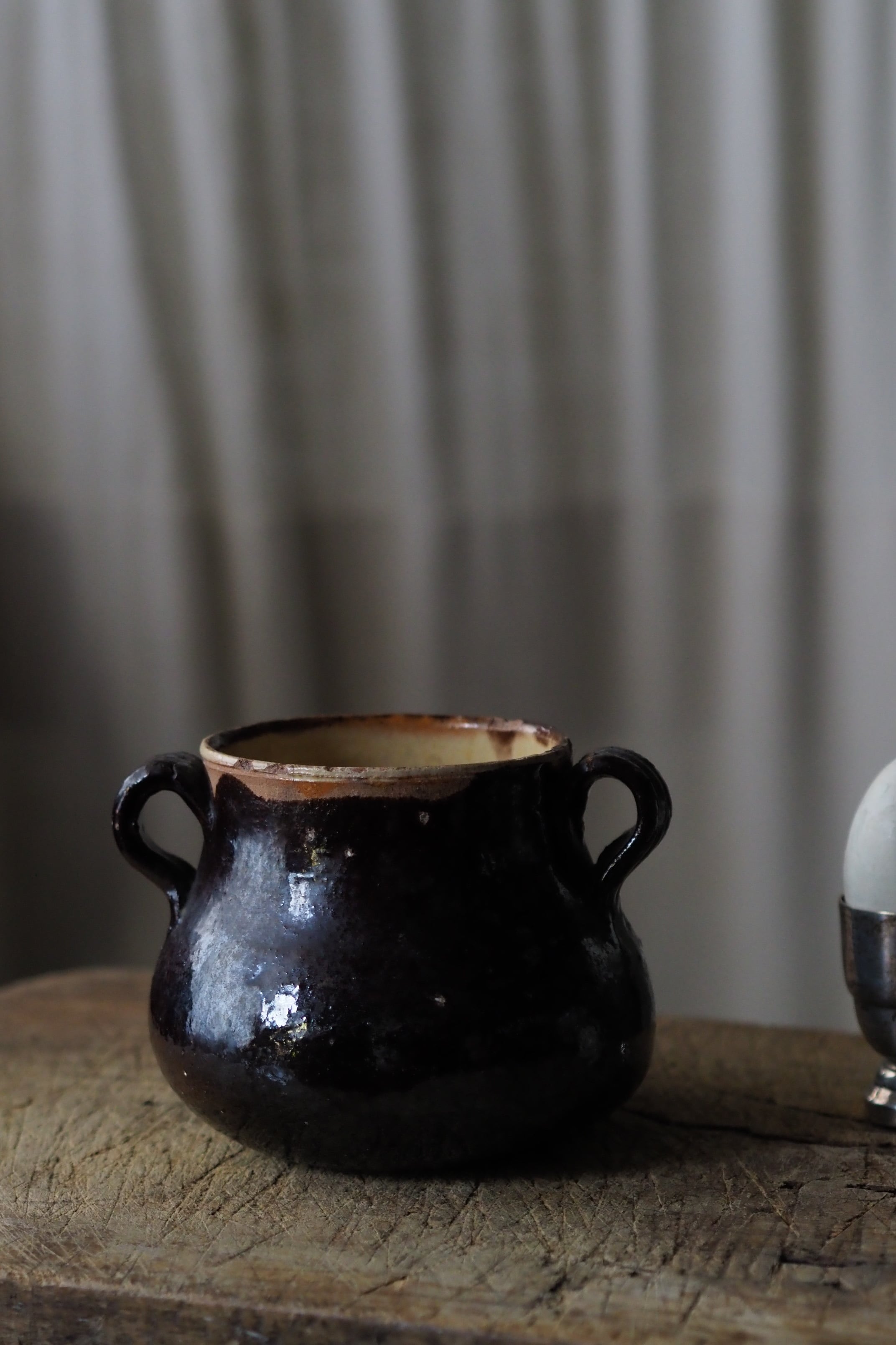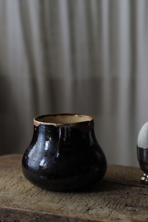 光線の加減で黒にも見える焦茶色の釉薬、底面も覆って内側は黄土色というキュノワールの特徴を捉えた手の平に収まるサイズのポット。