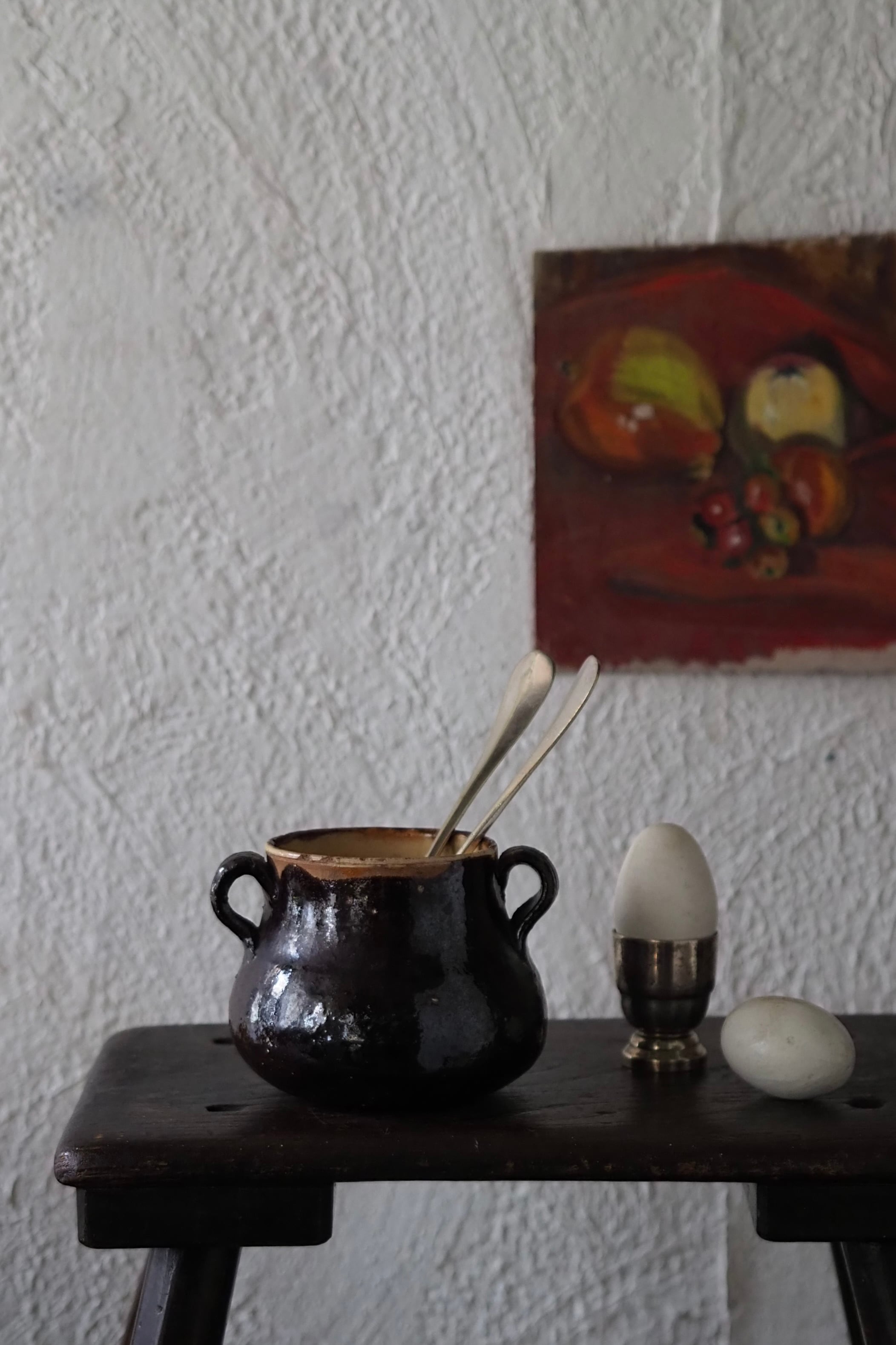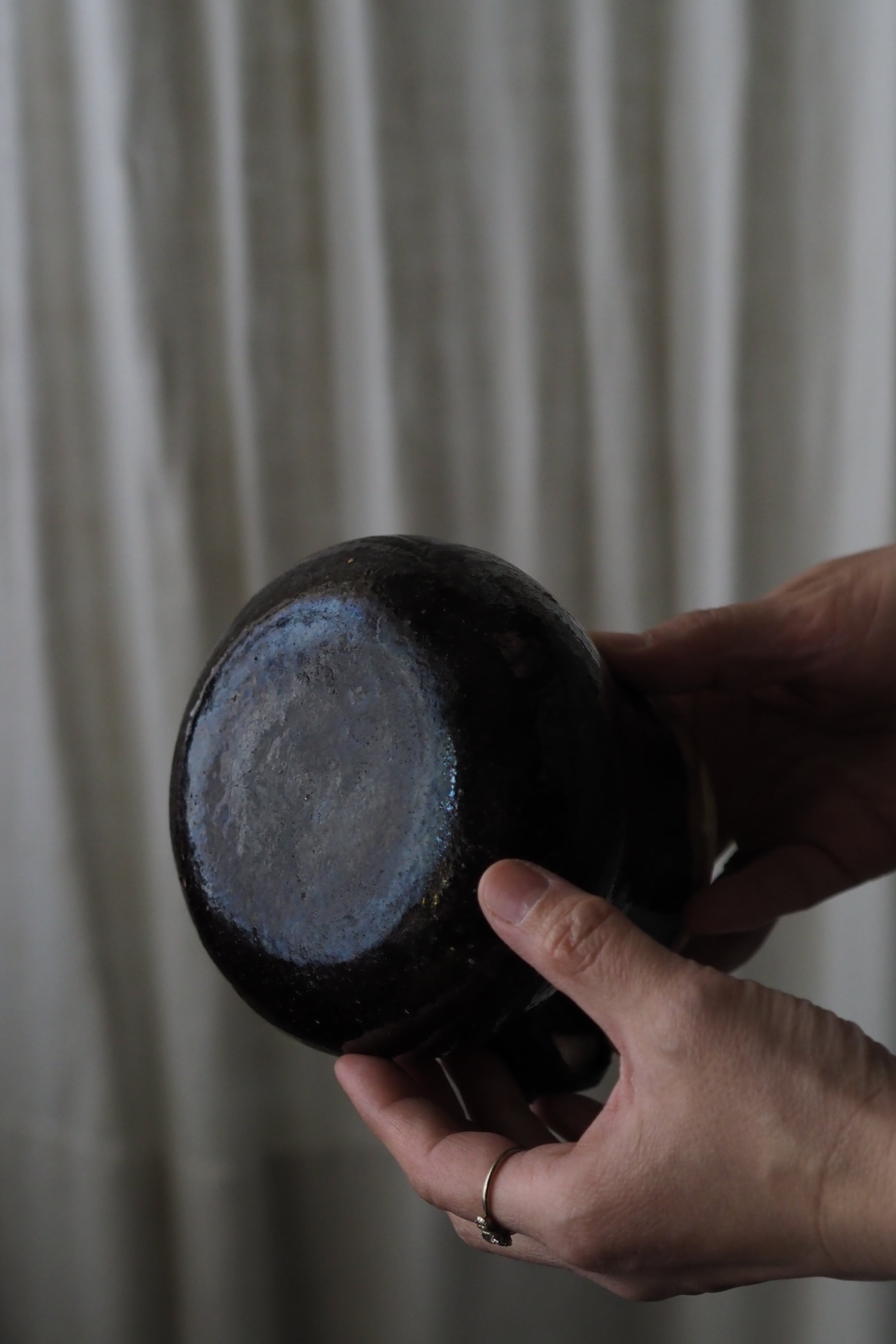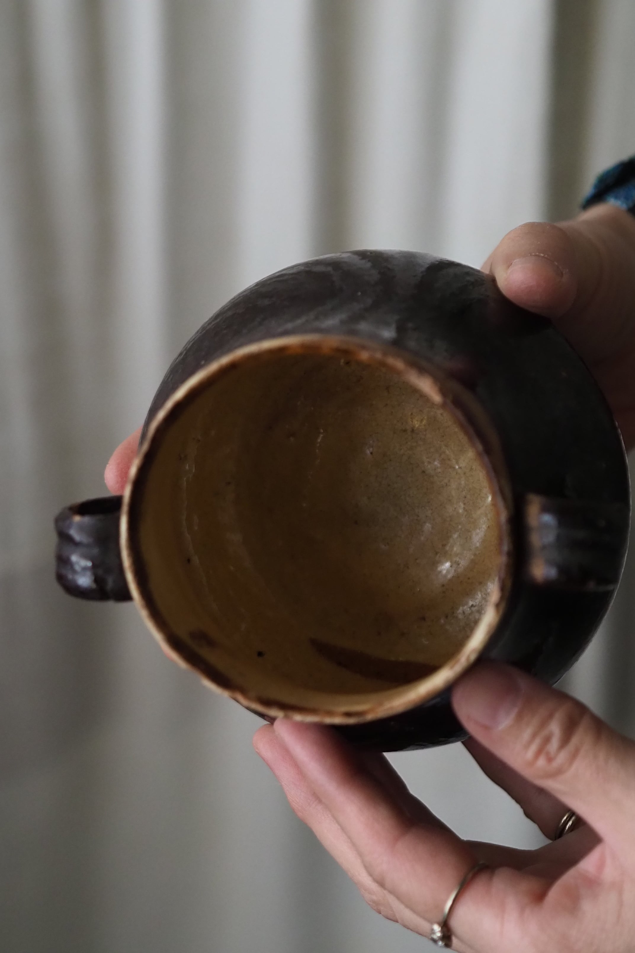 光線の加減で黒にも見える焦茶色の釉薬、底面も覆って内側は黄土色というキュノワールの特徴を捉えた手の平に収まるサイズのポット。