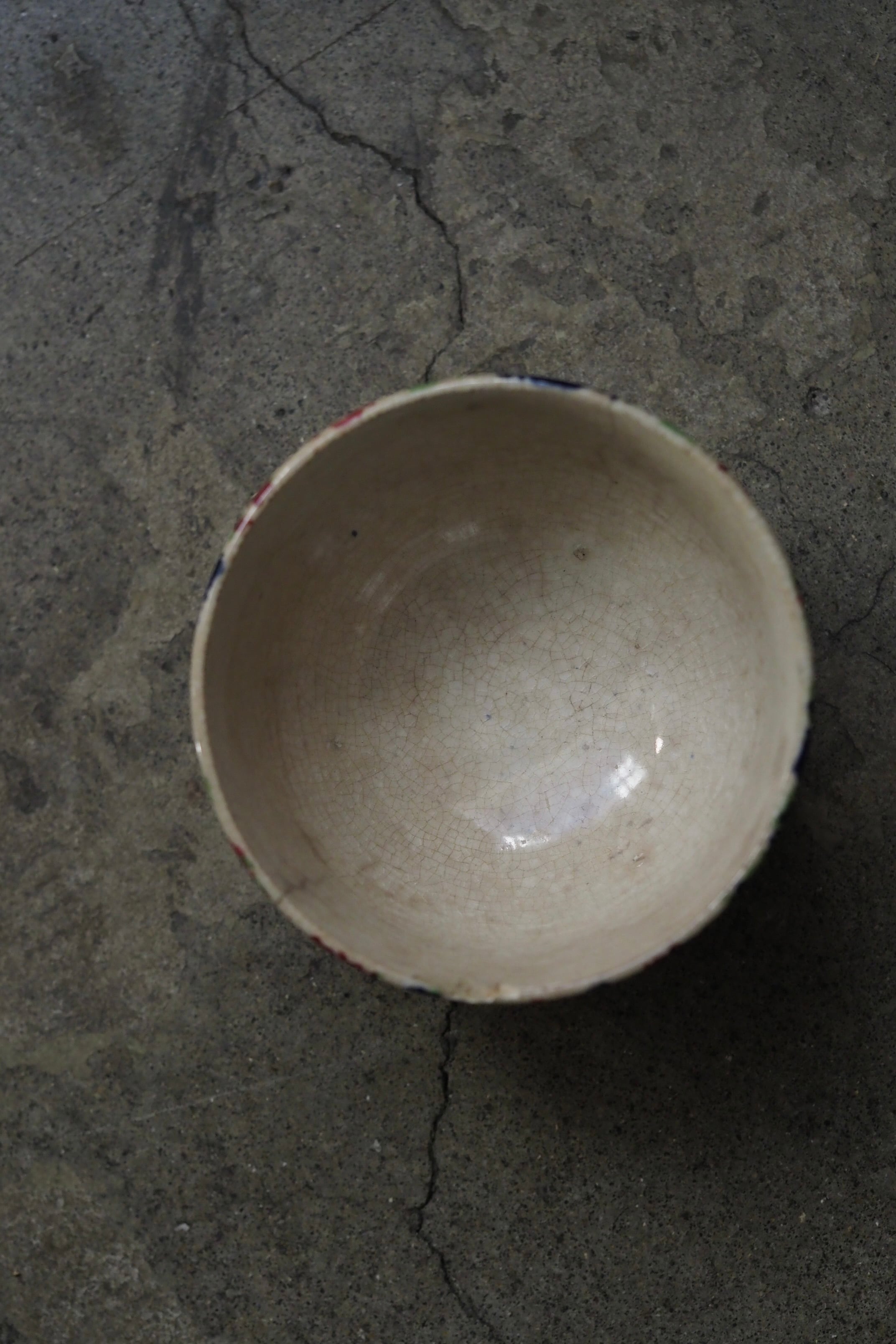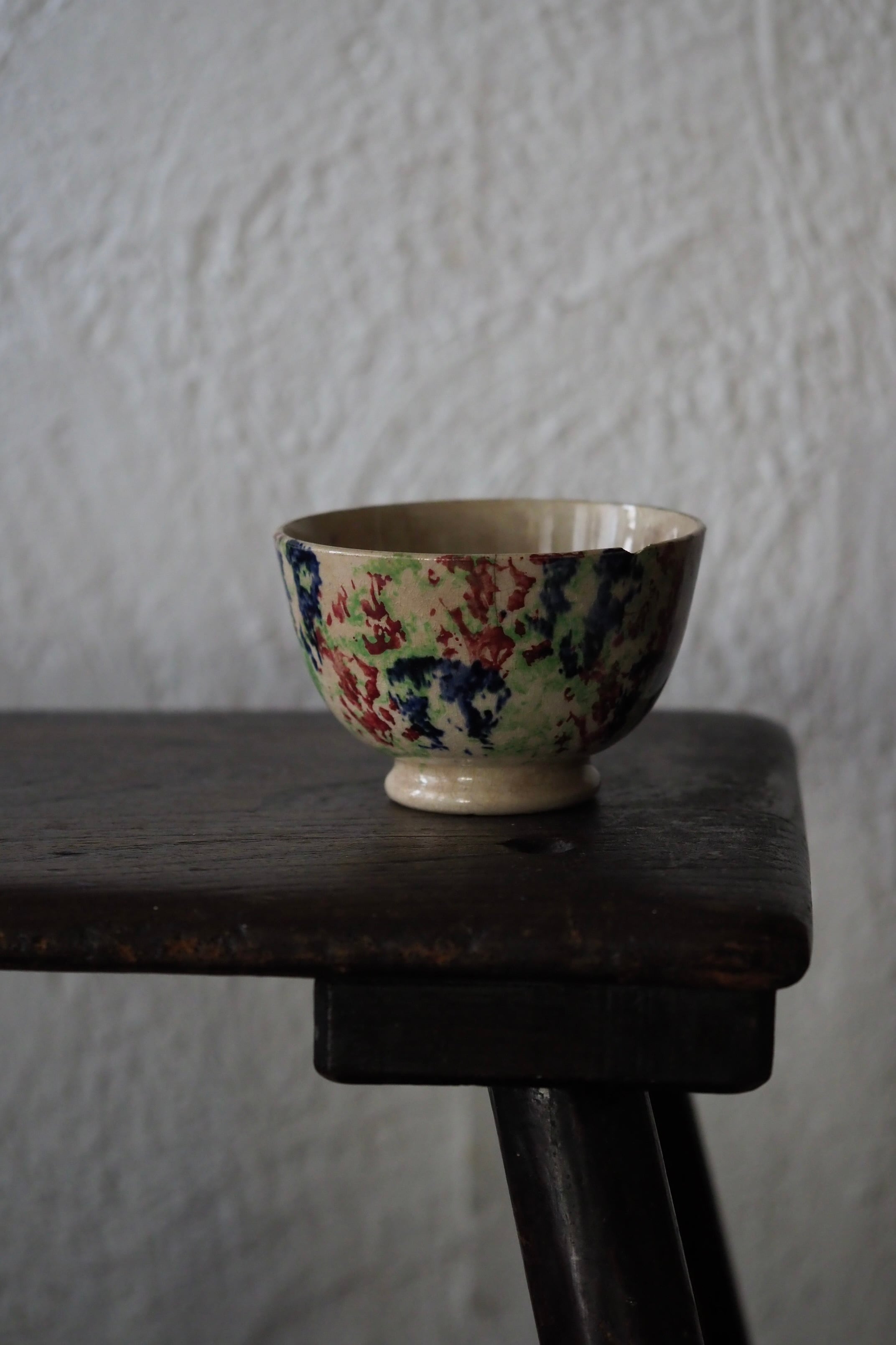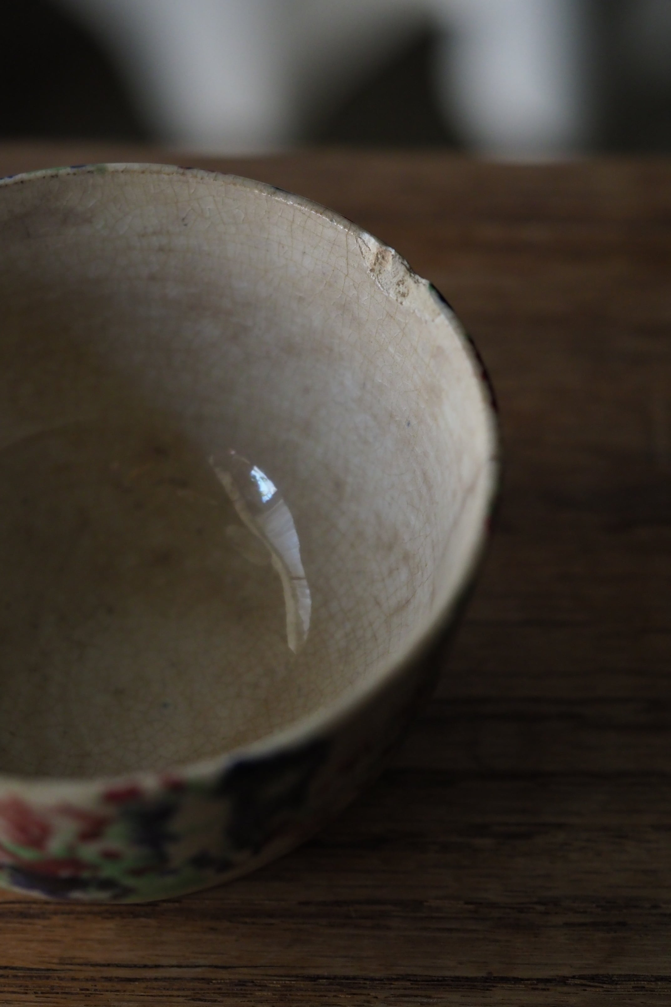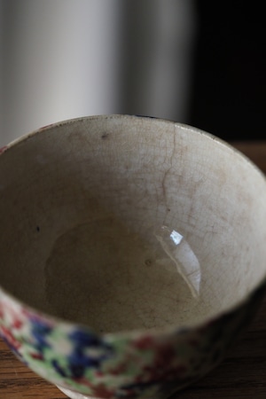 縁からうっすらヒビ、リムに欠けや貫入にじんわり滲み、、、実に堪らない雰囲気。