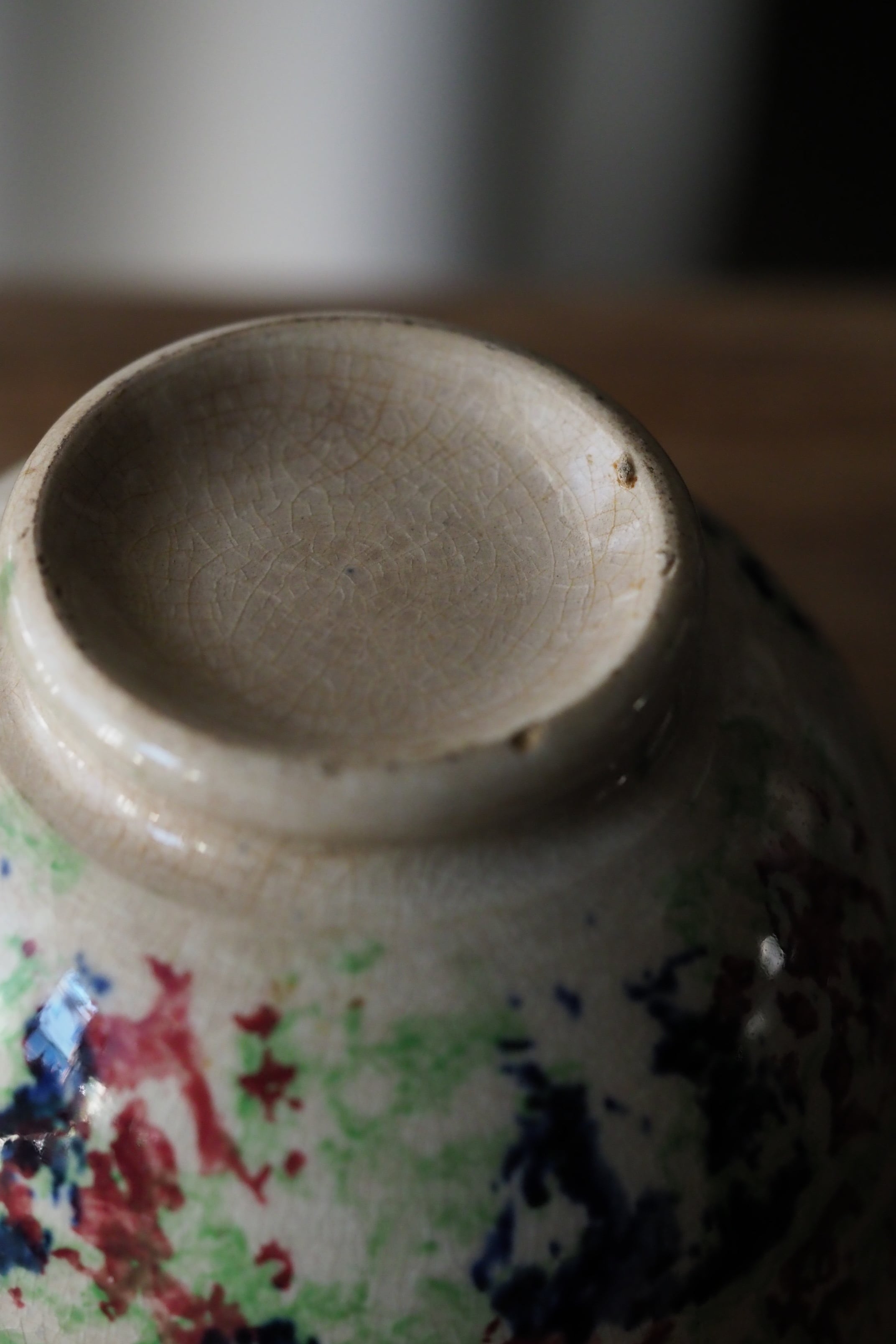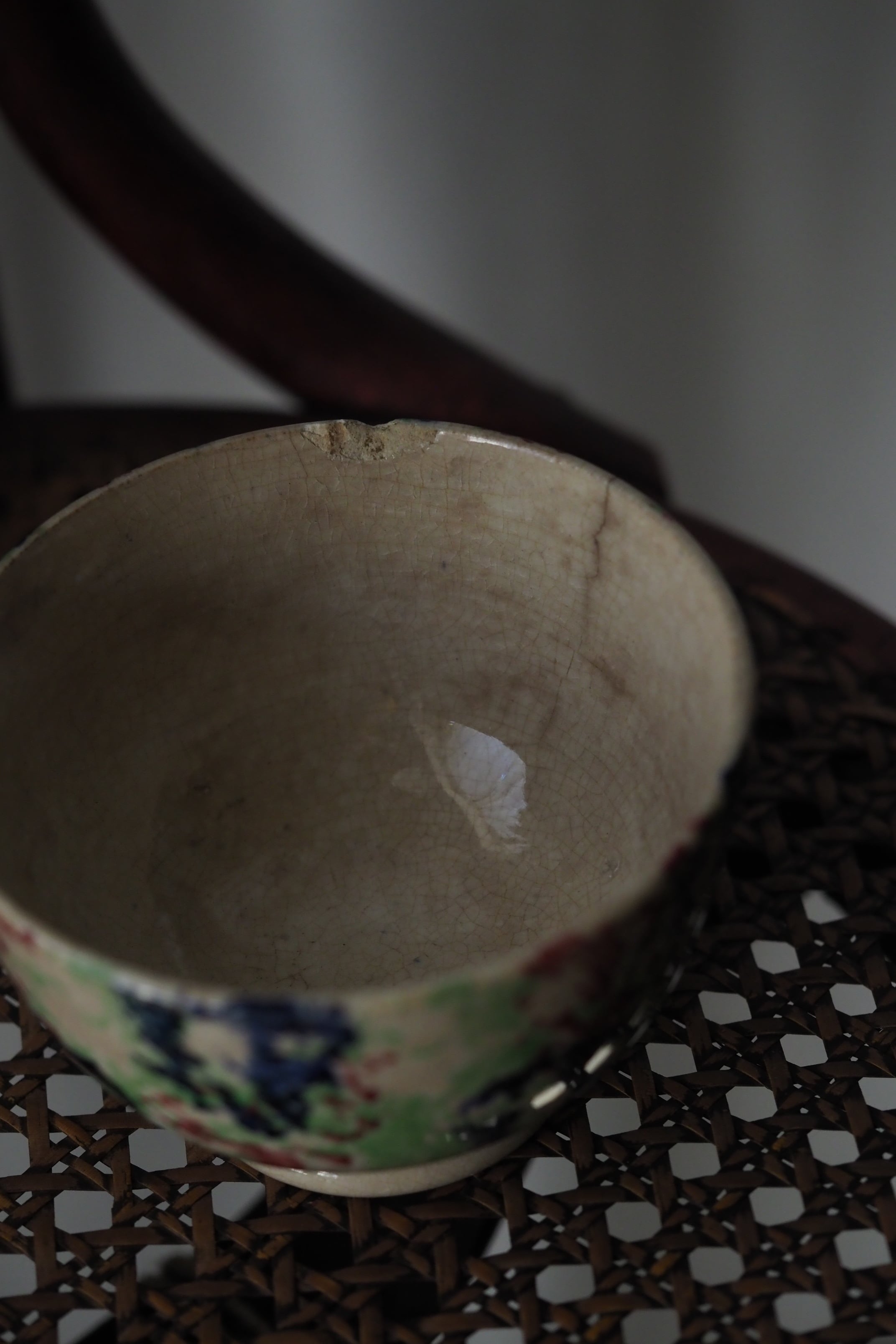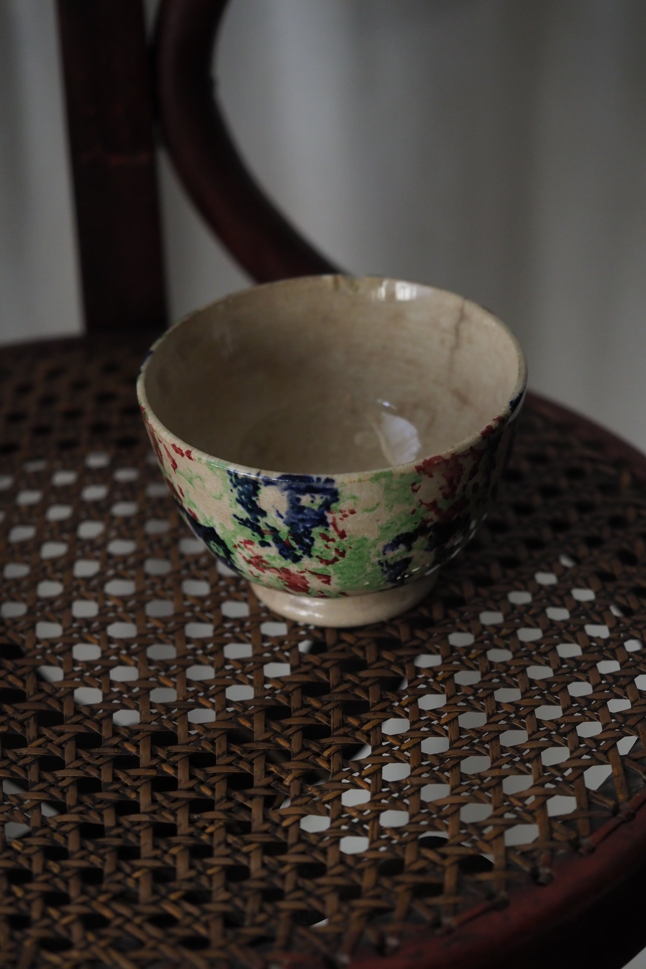 縁からうっすらヒビ、リムに欠けや貫入にじんわり滲み、、、実に堪らない雰囲気。