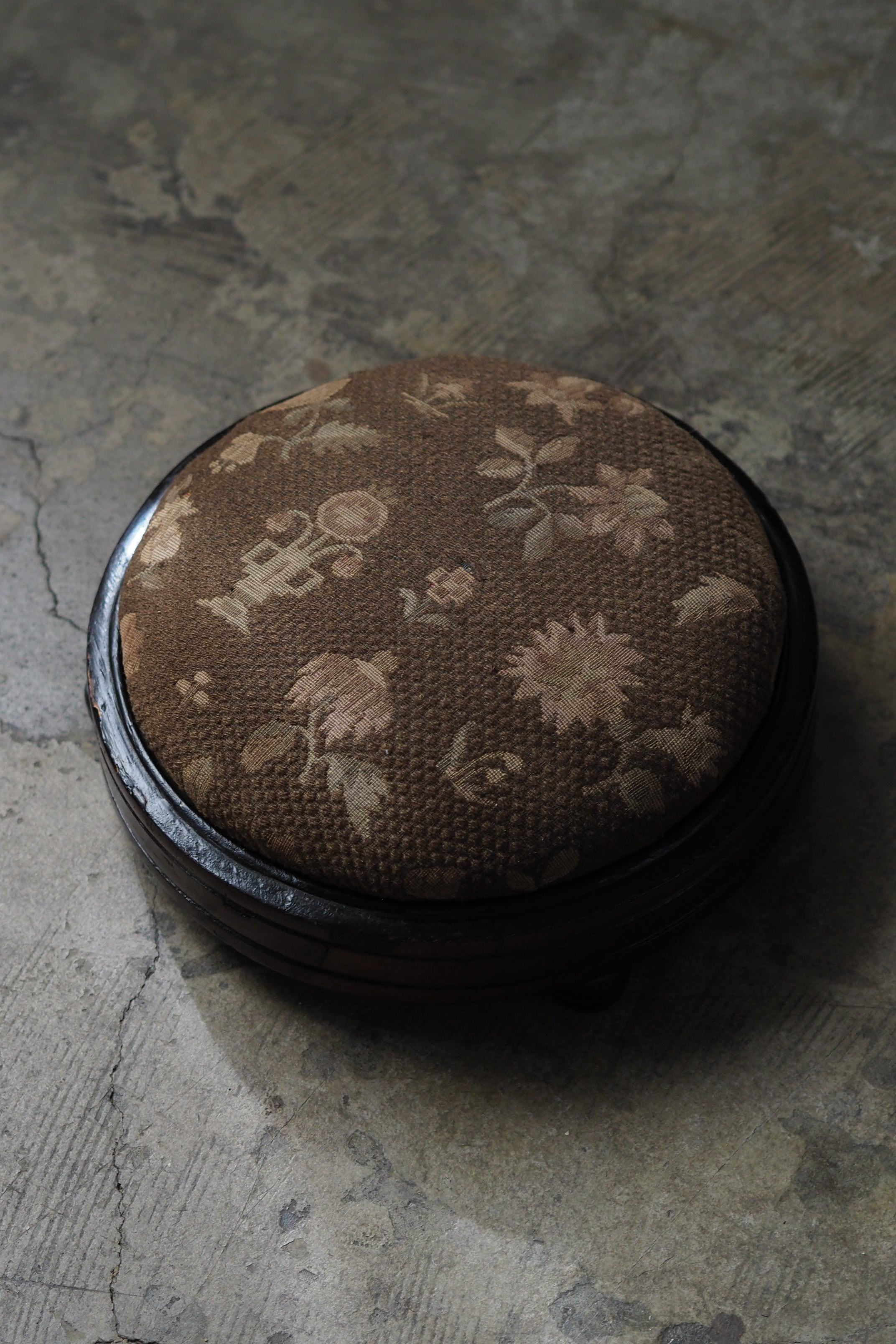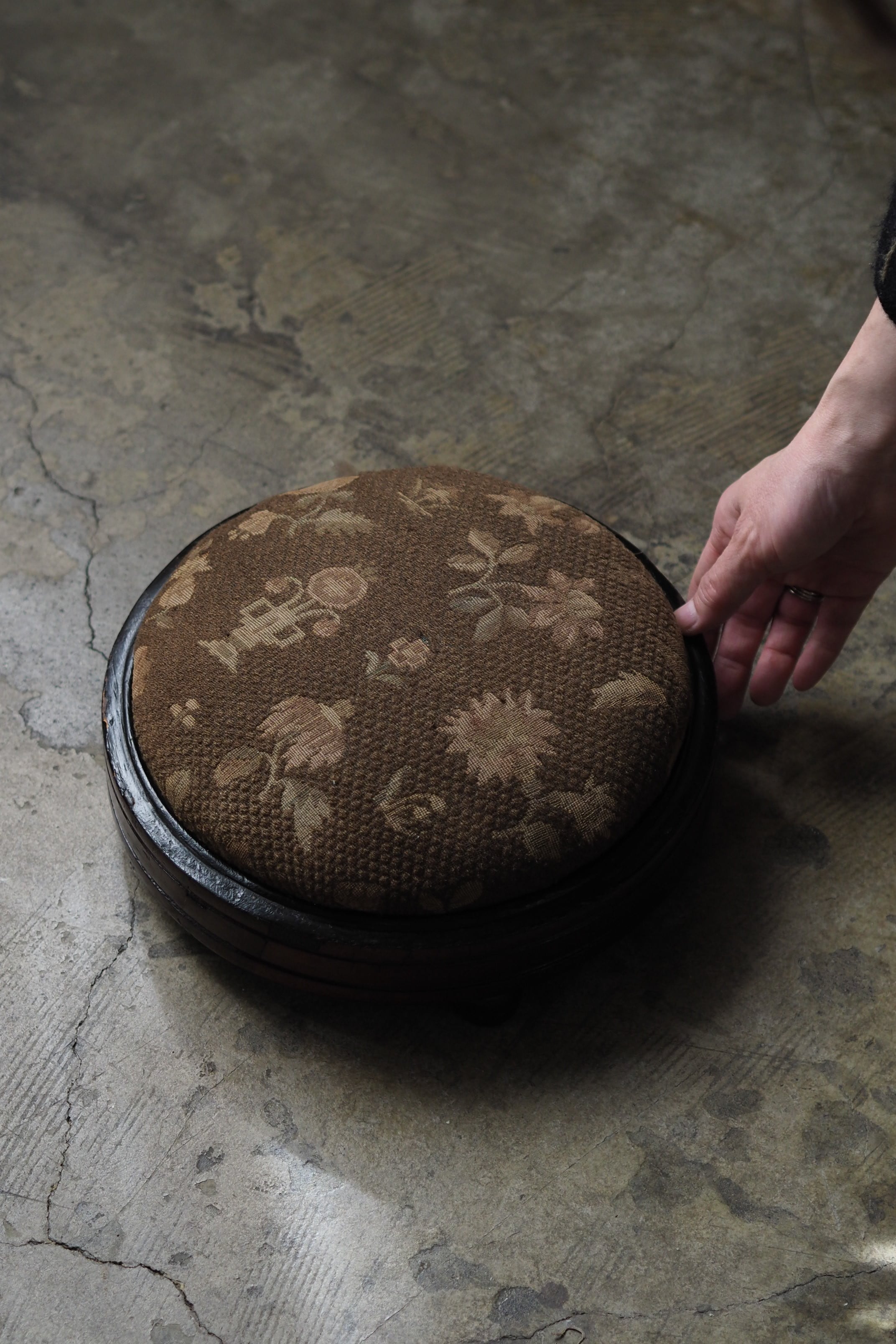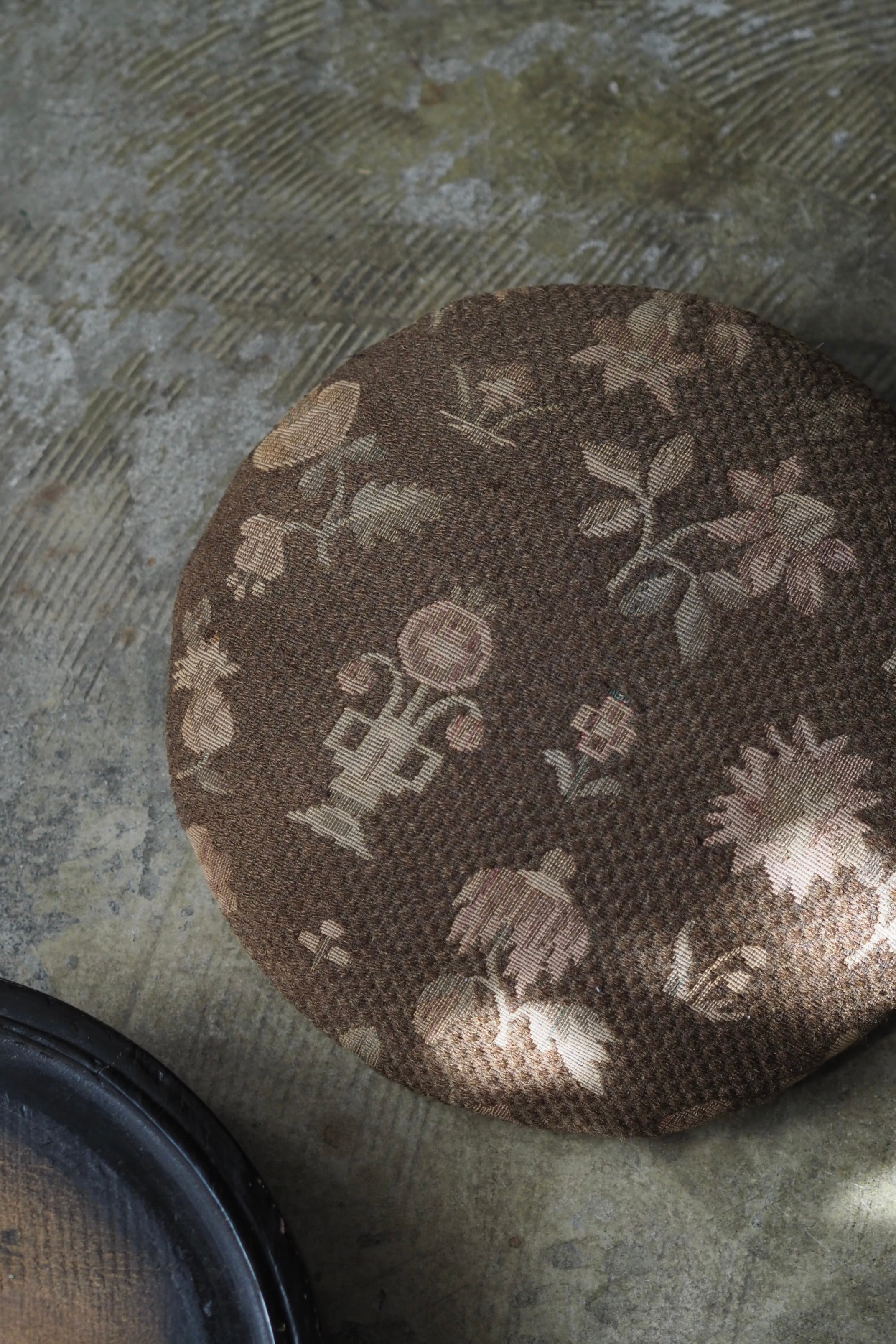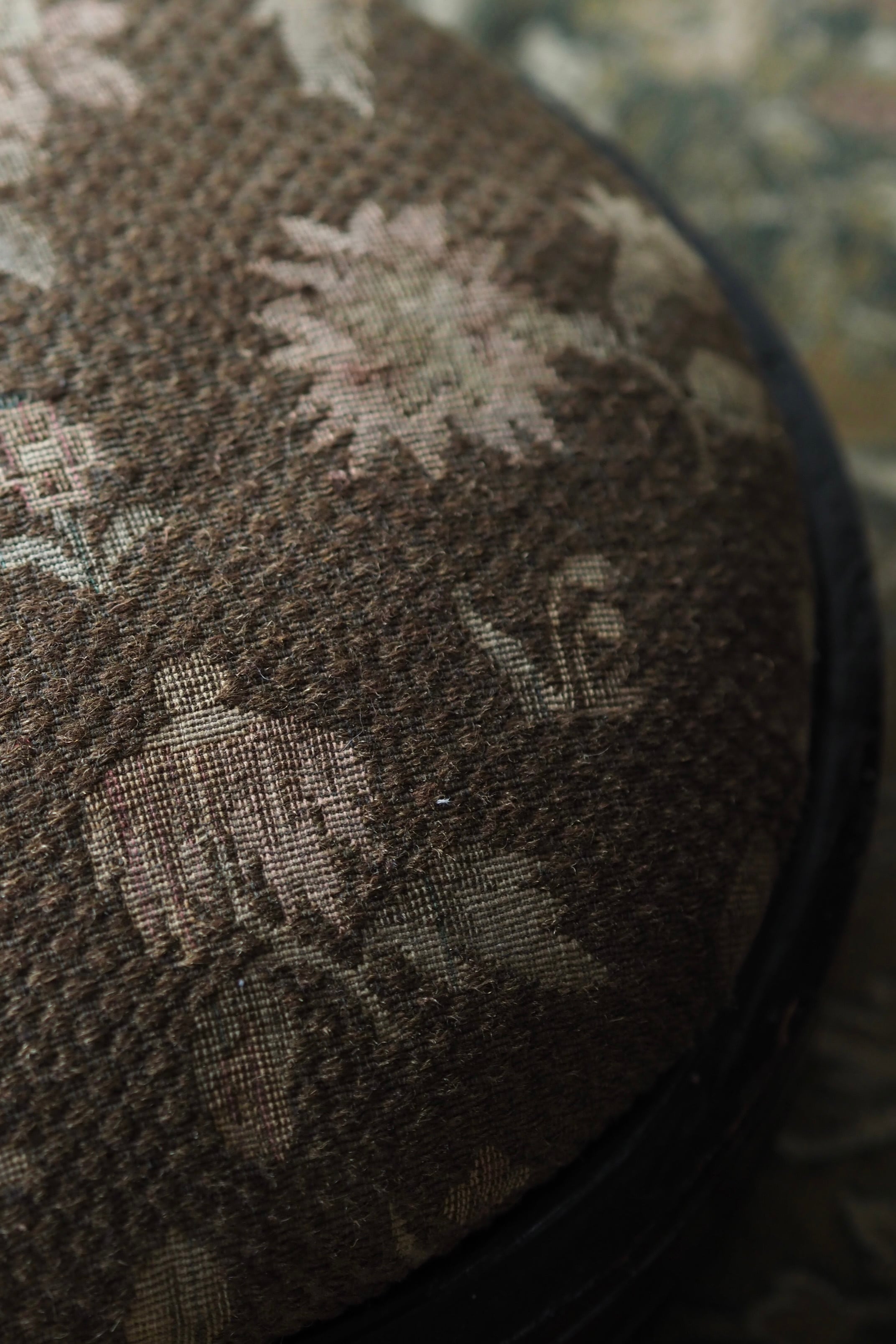フットスツール座面生地にはポエジーなパターン、深緑がかったブラウンの渋いトーンで落ち着いて久しい。