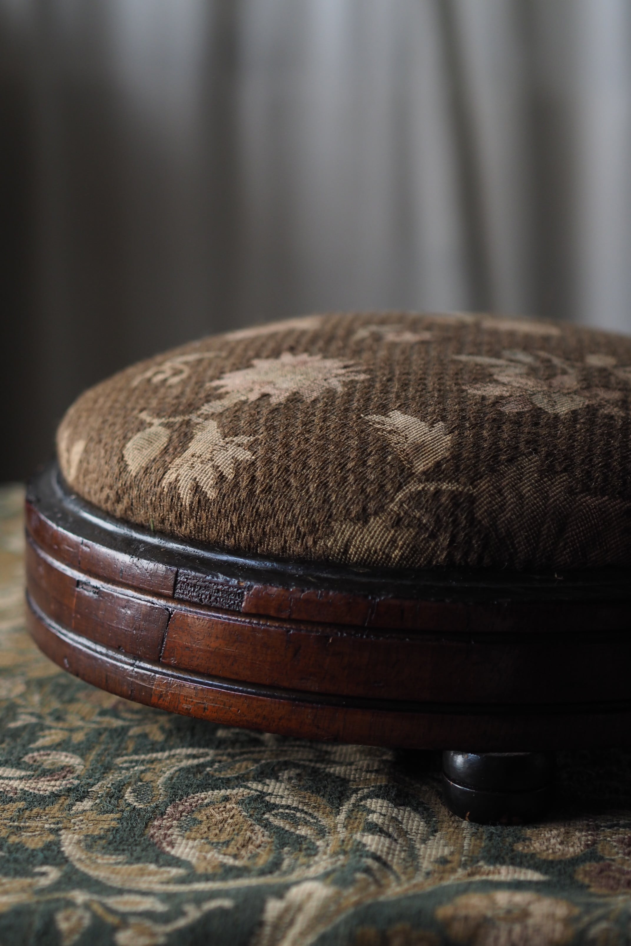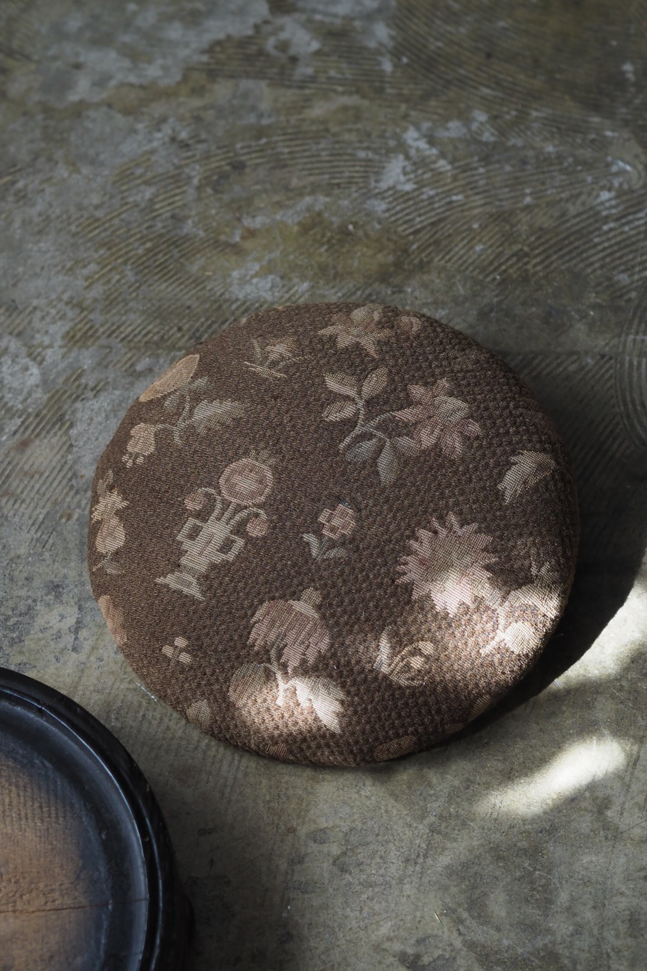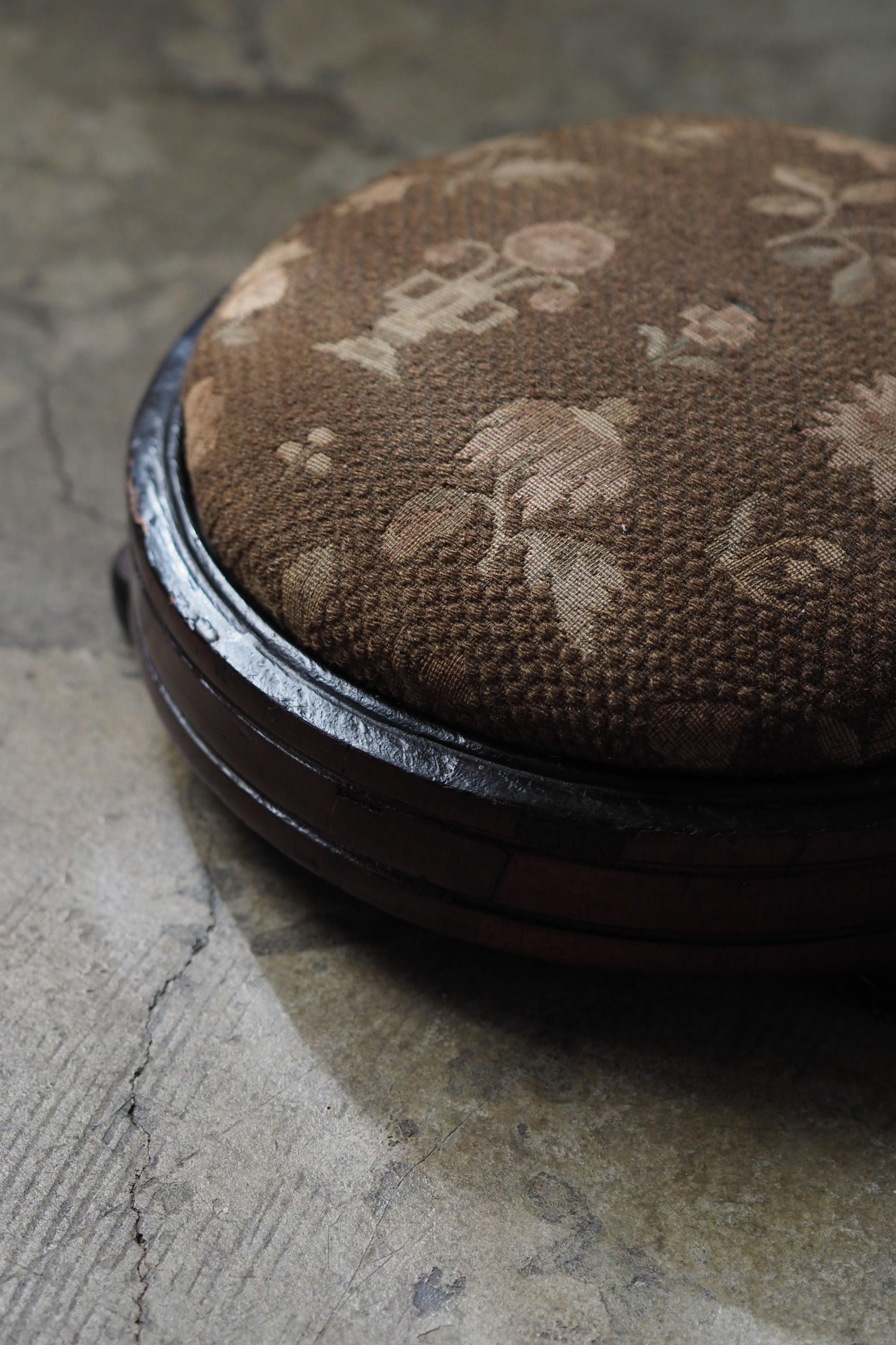 フットスツール座面生地にはポエジーなパターン、深緑がかったブラウンの渋いトーンで落ち着いて久しい。