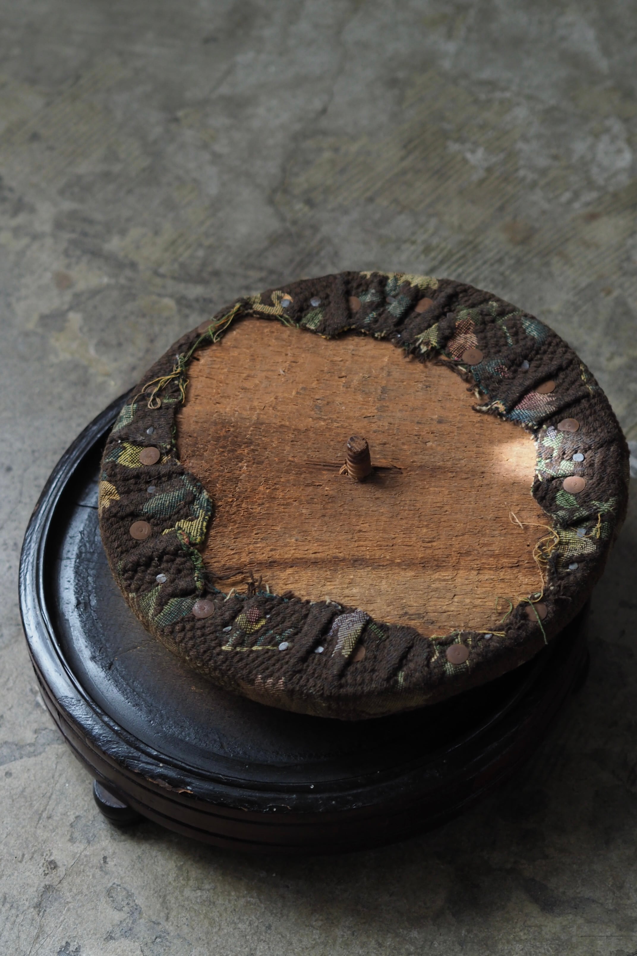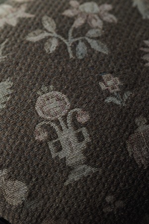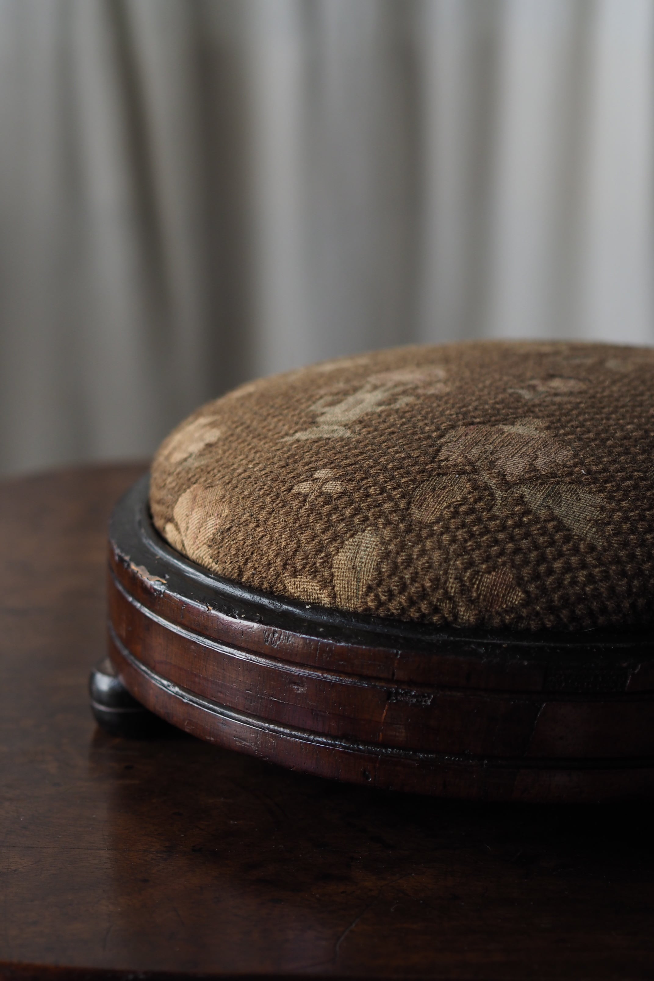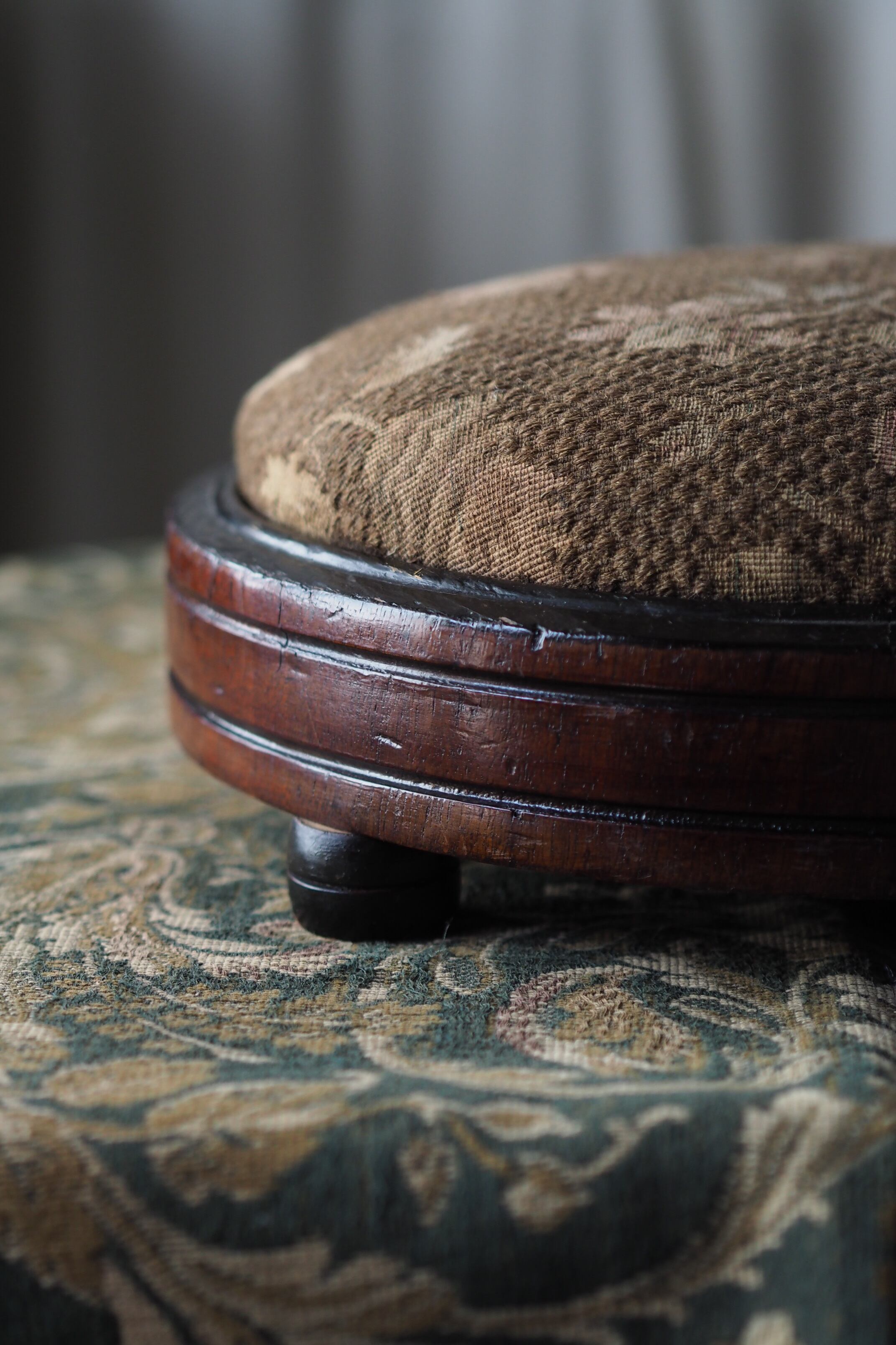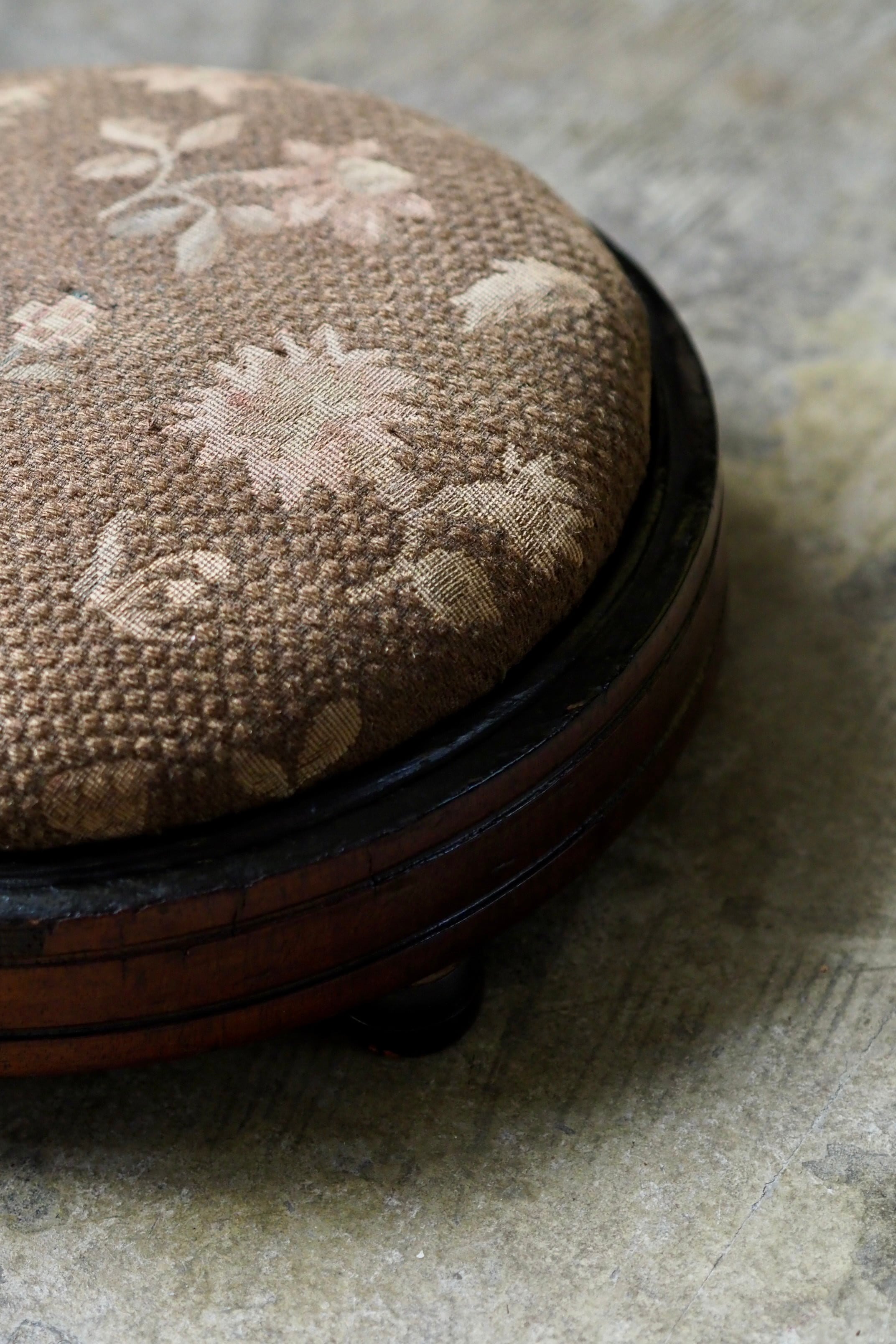 フットスツール座面生地にはポエジーなパターン、深緑がかったブラウンの渋いトーンで落ち着いて久しい。