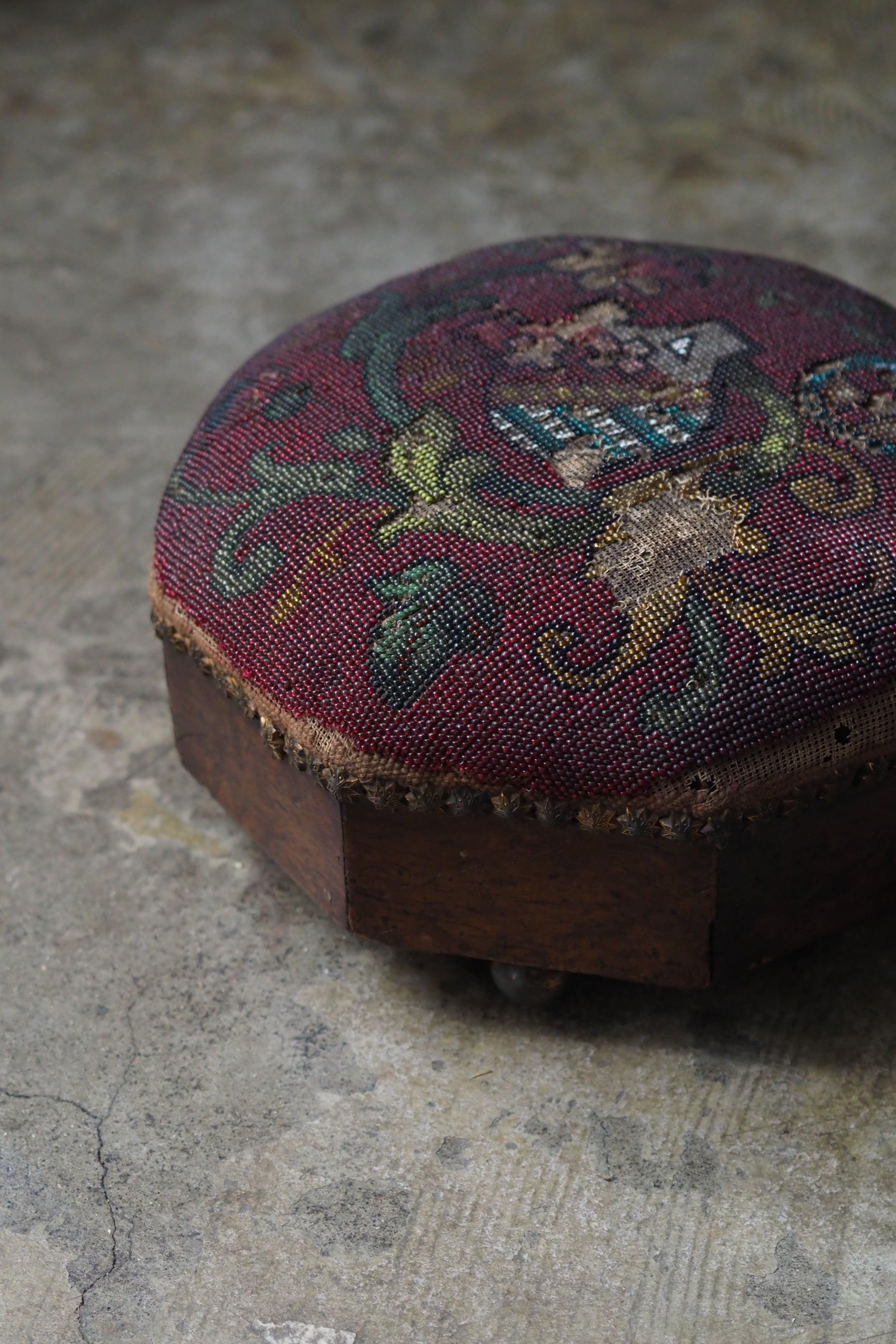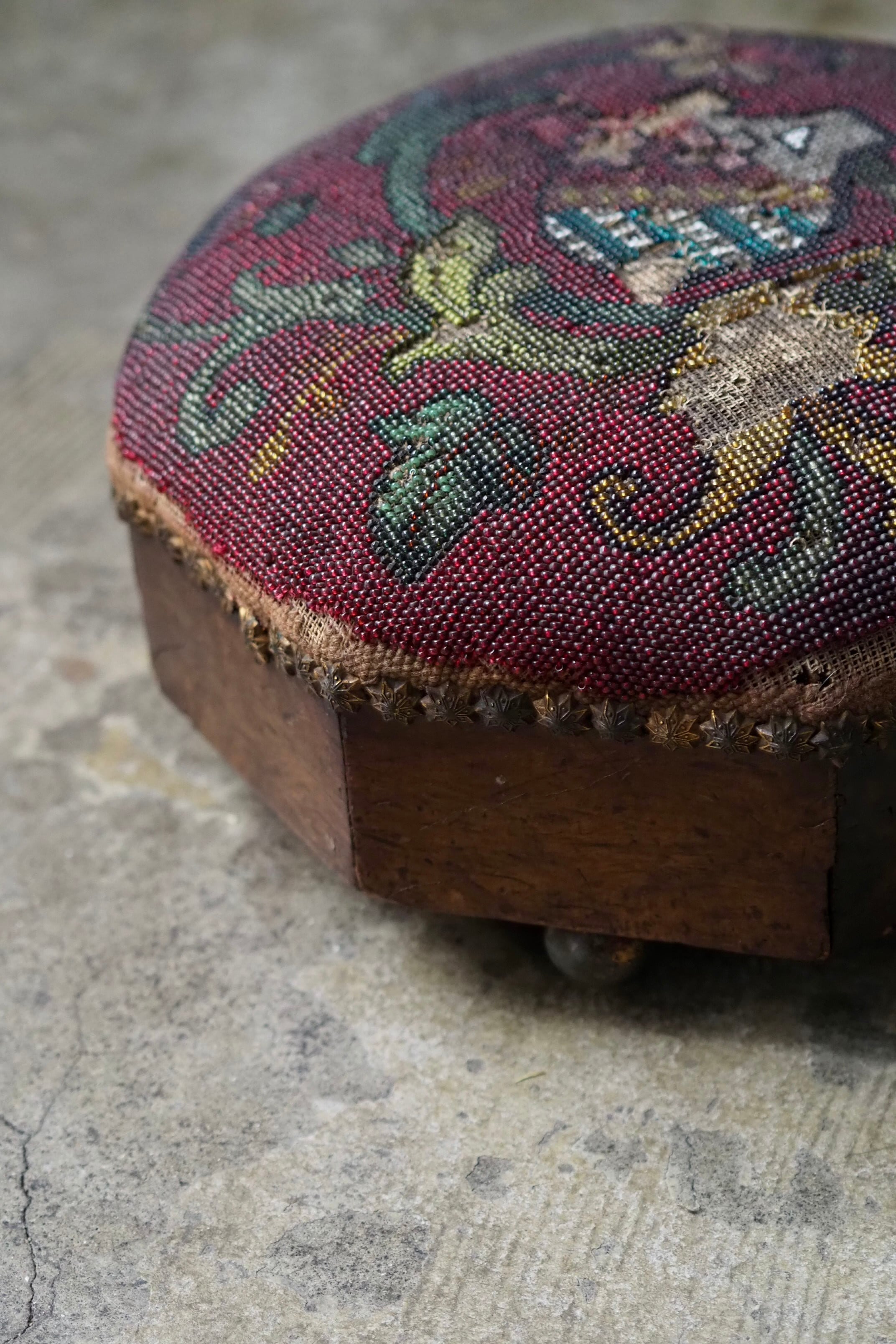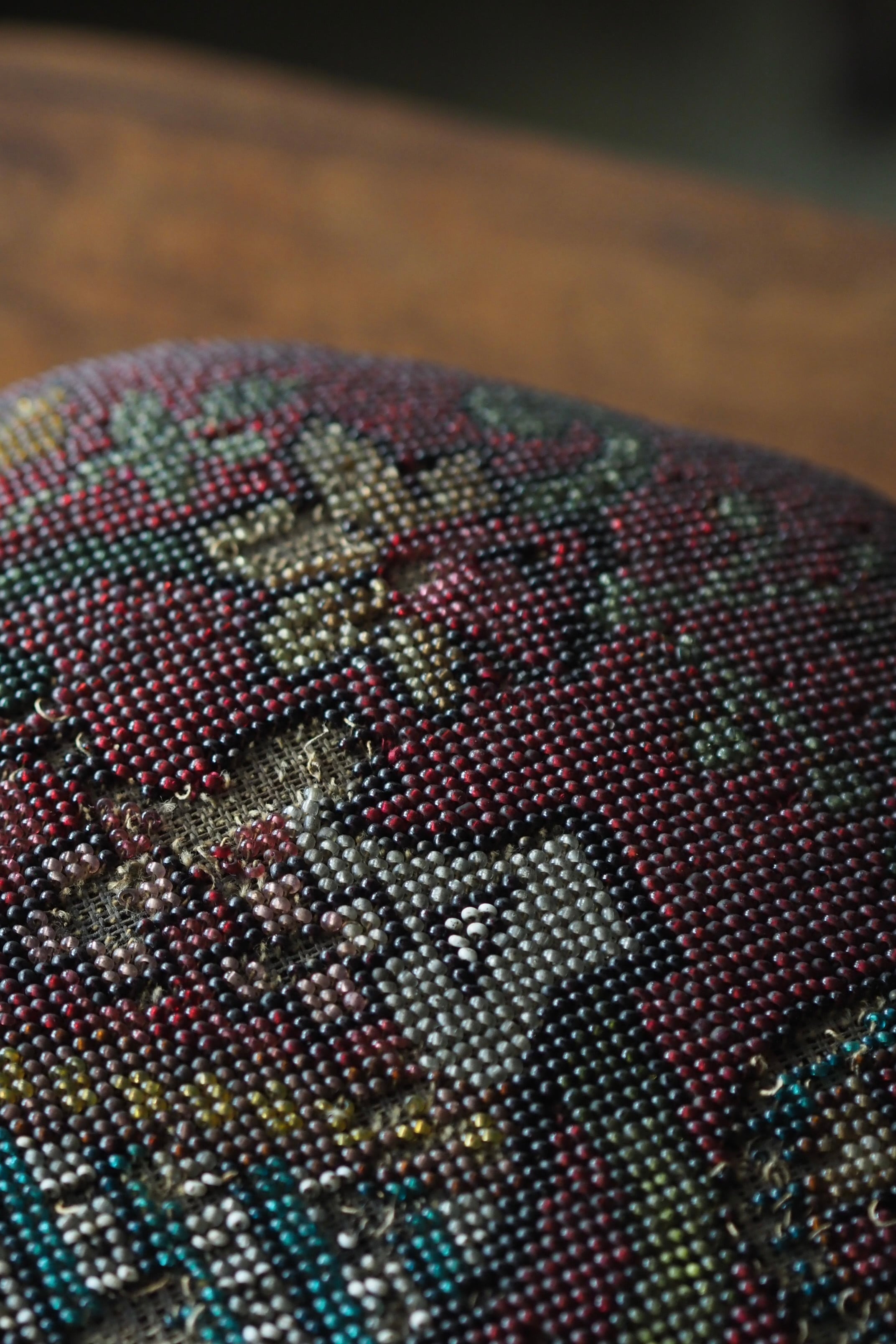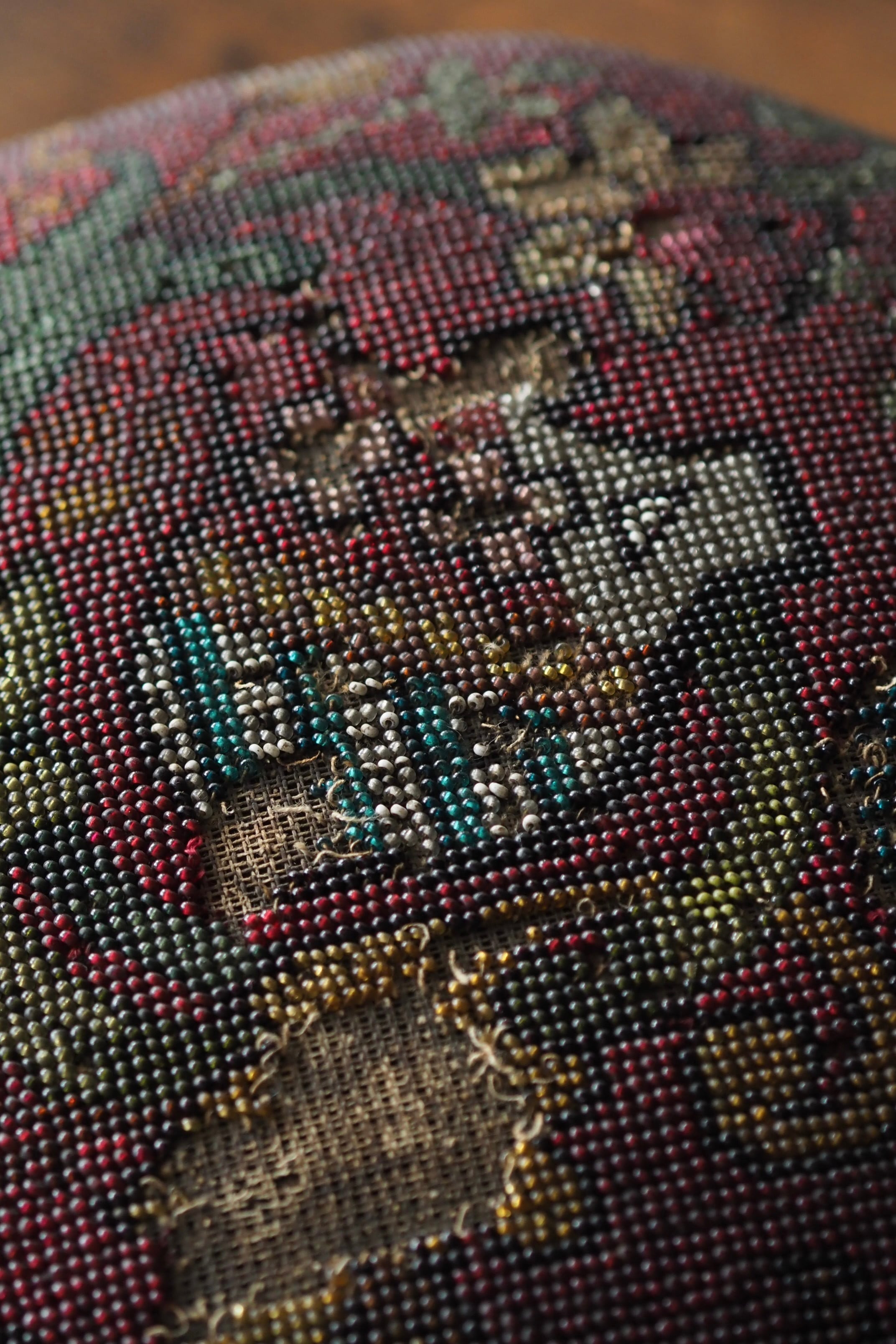 ビーズ刺繍の部分、取れる可能性があります。本来の、脚を置いて使う用途は避けた方が良いです。