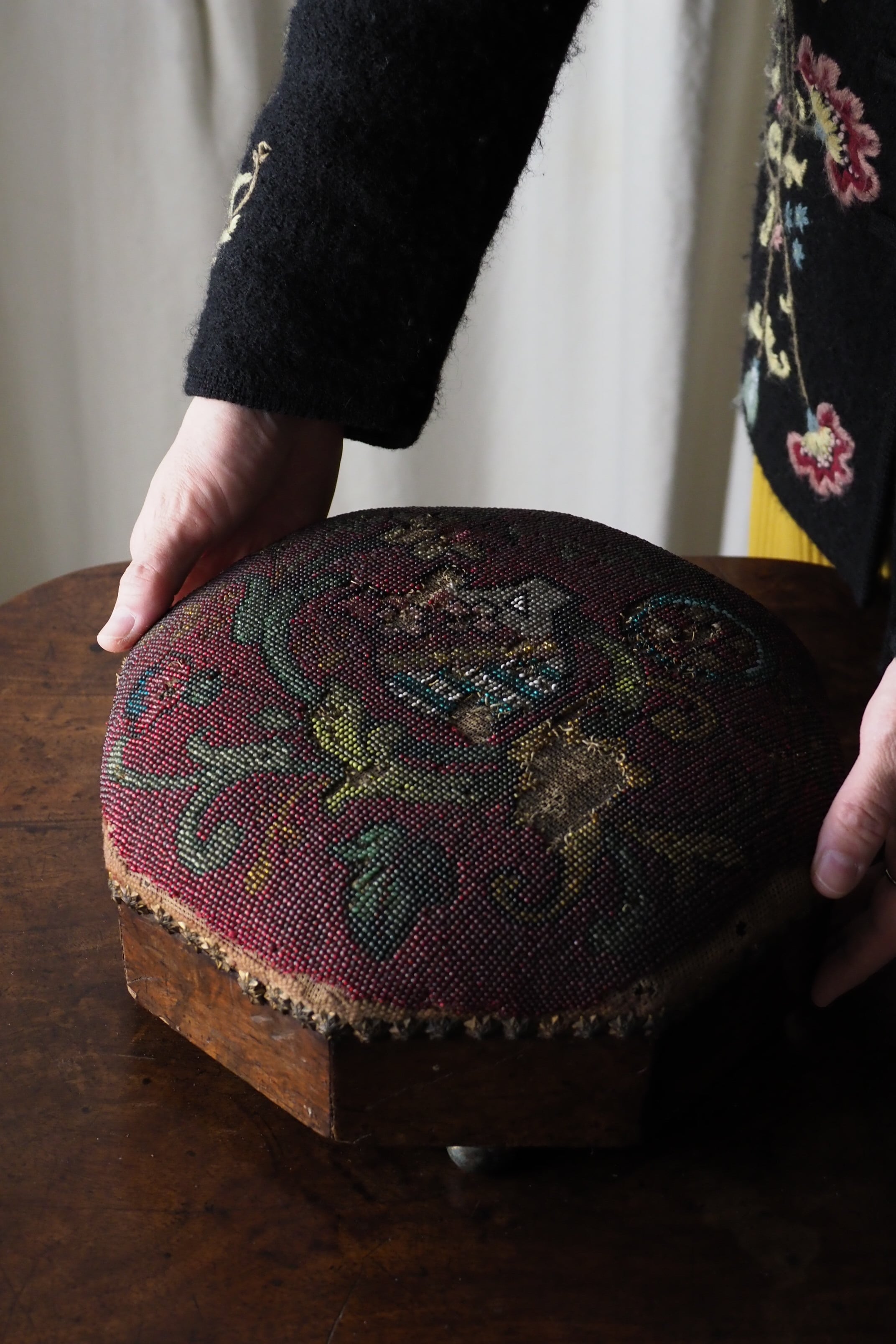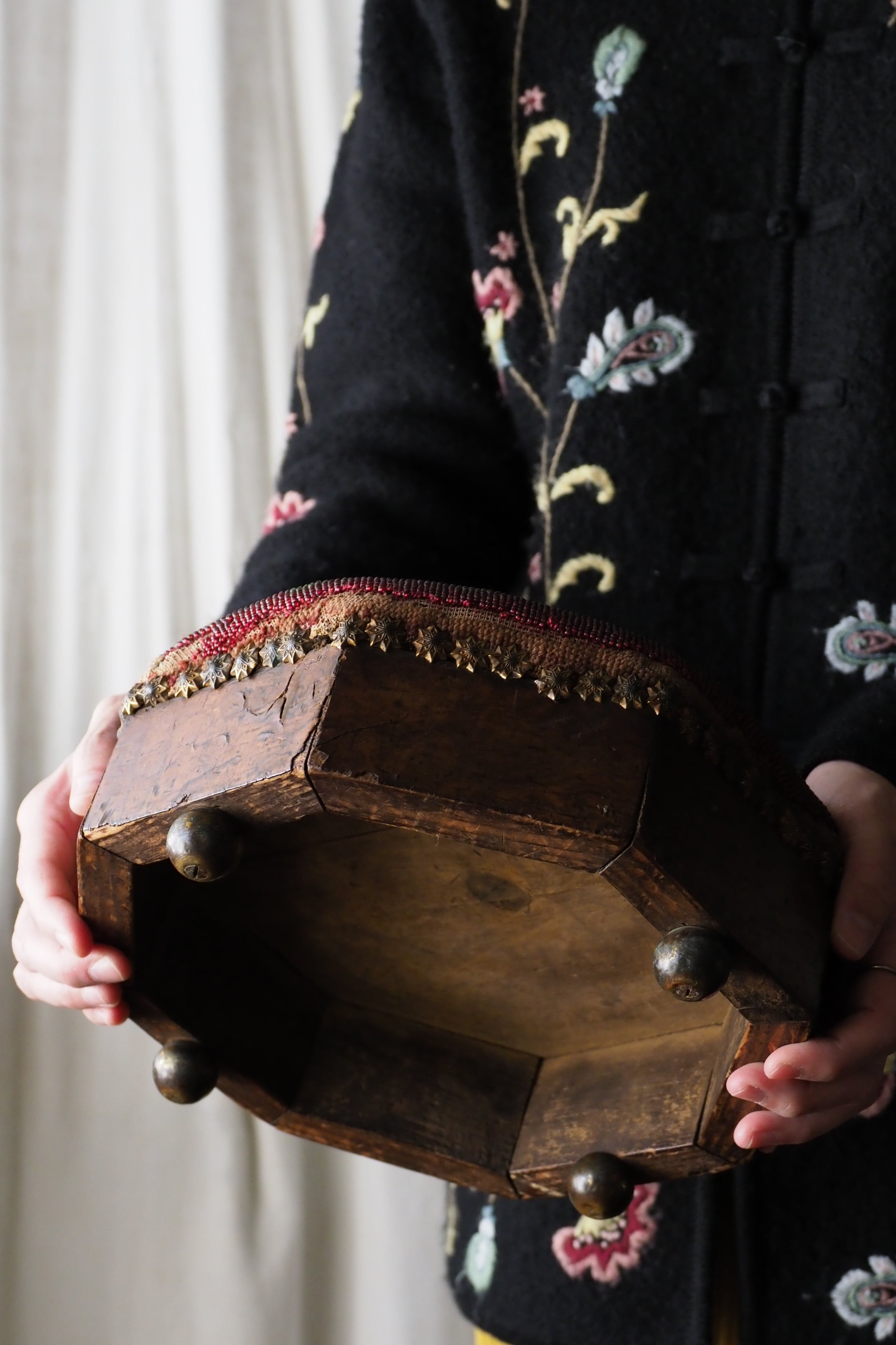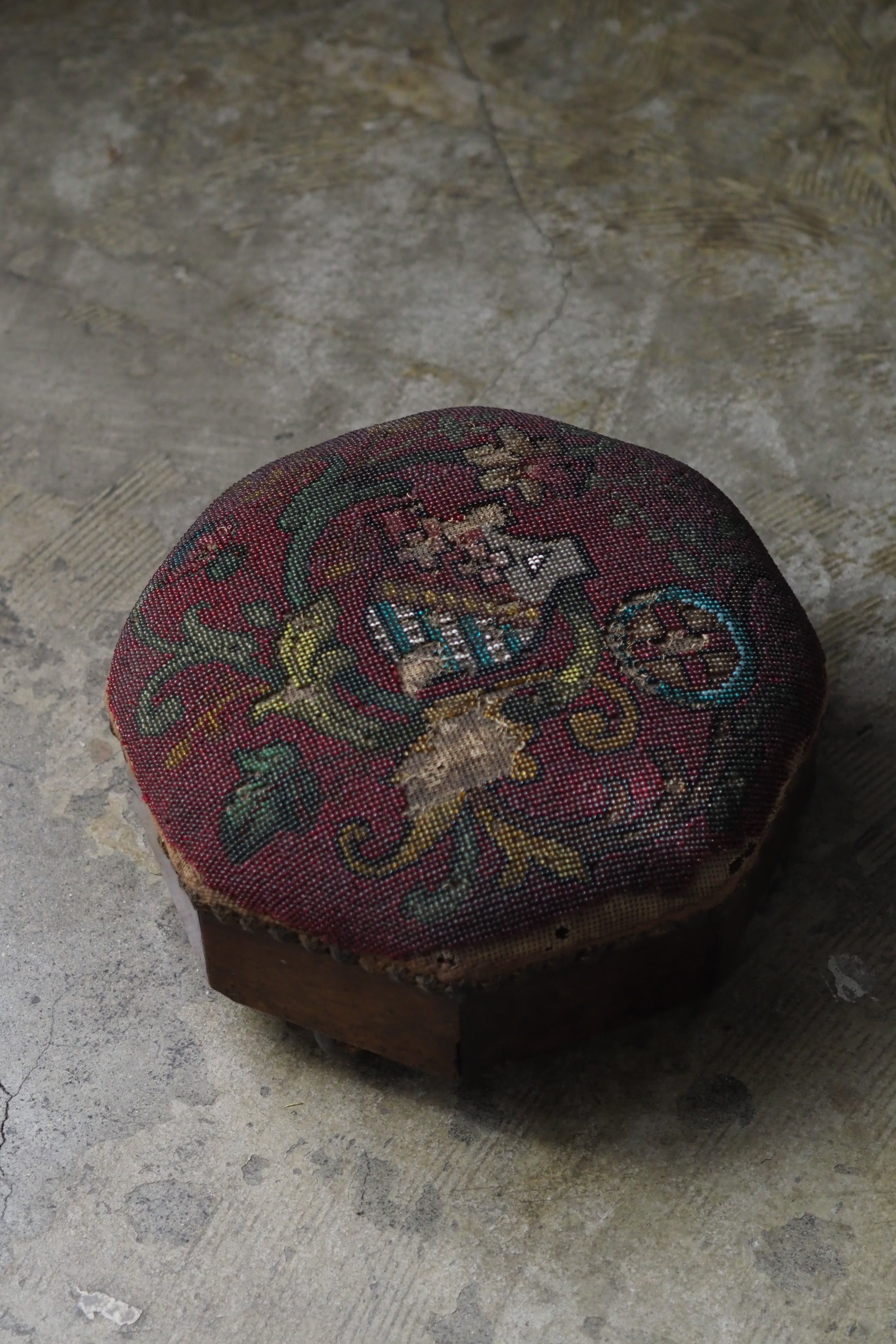 ビーズ刺繍の部分、取れる可能性があります。本来の、脚を置いて使う用途は避けた方が良いです。