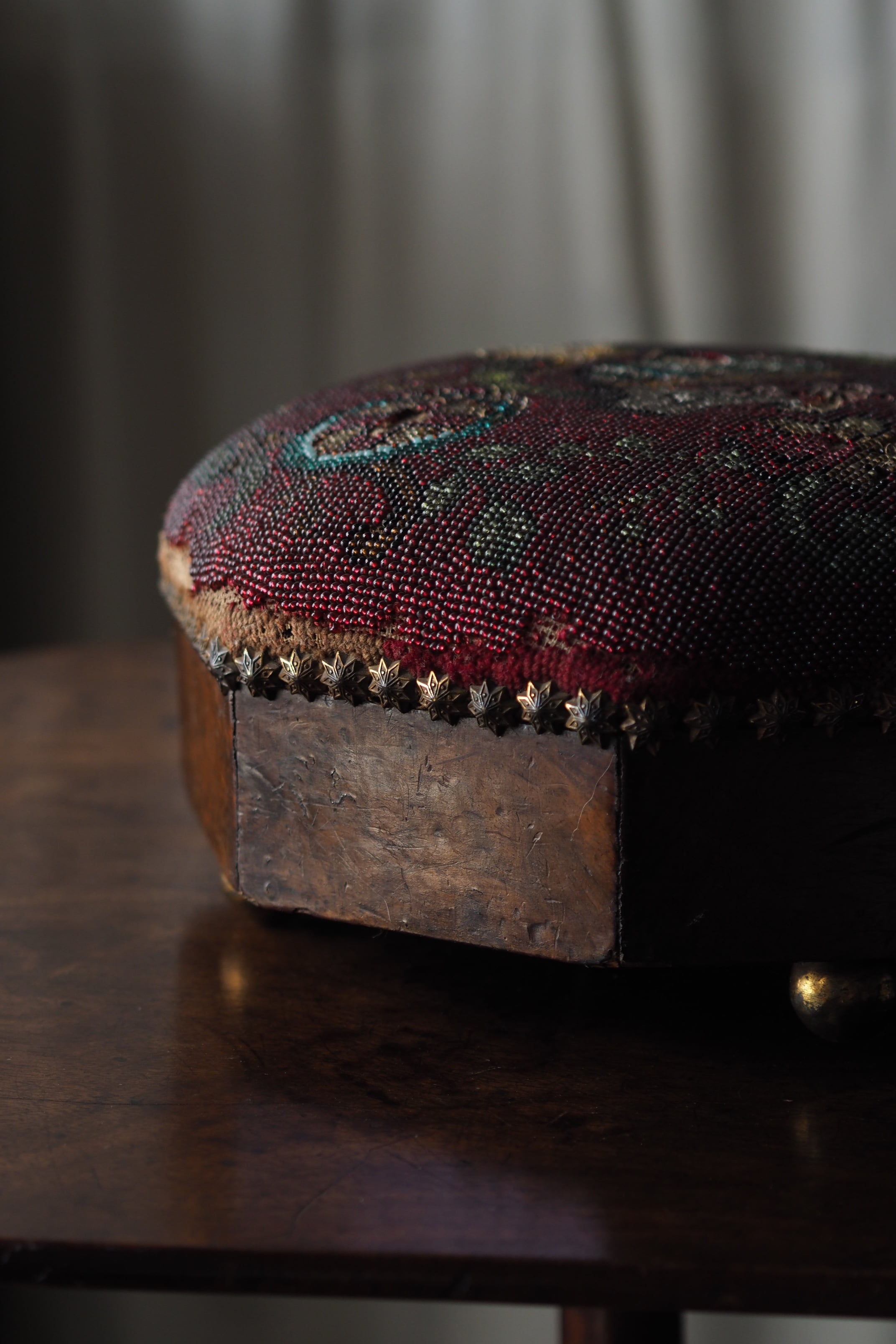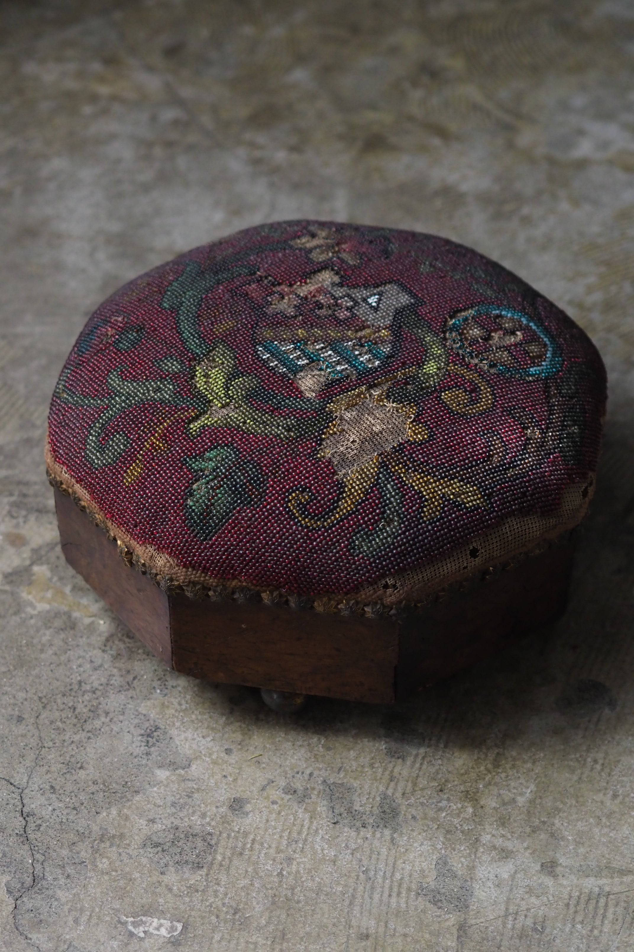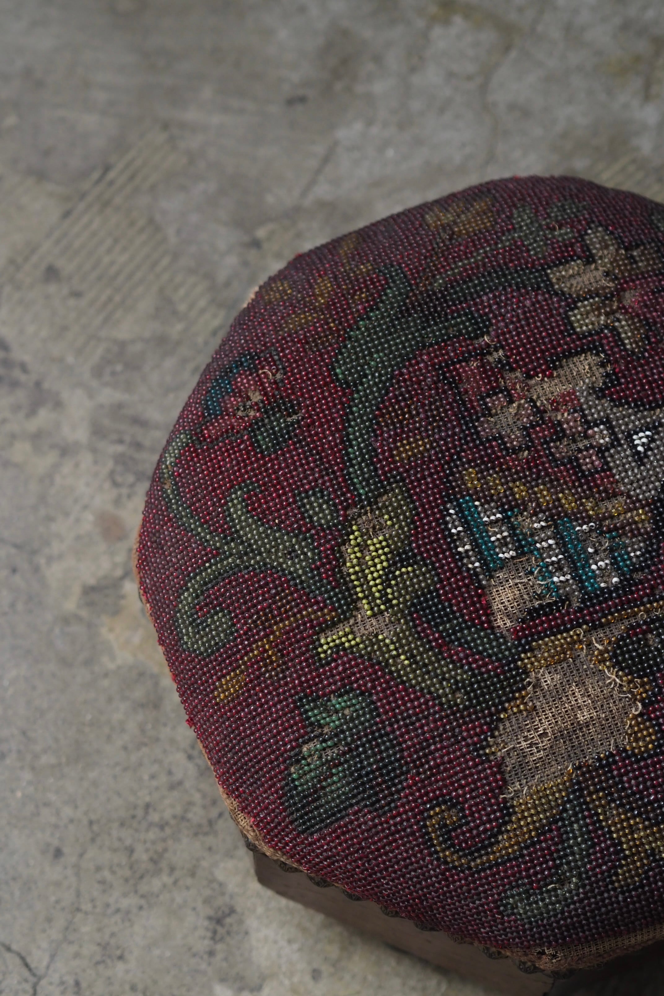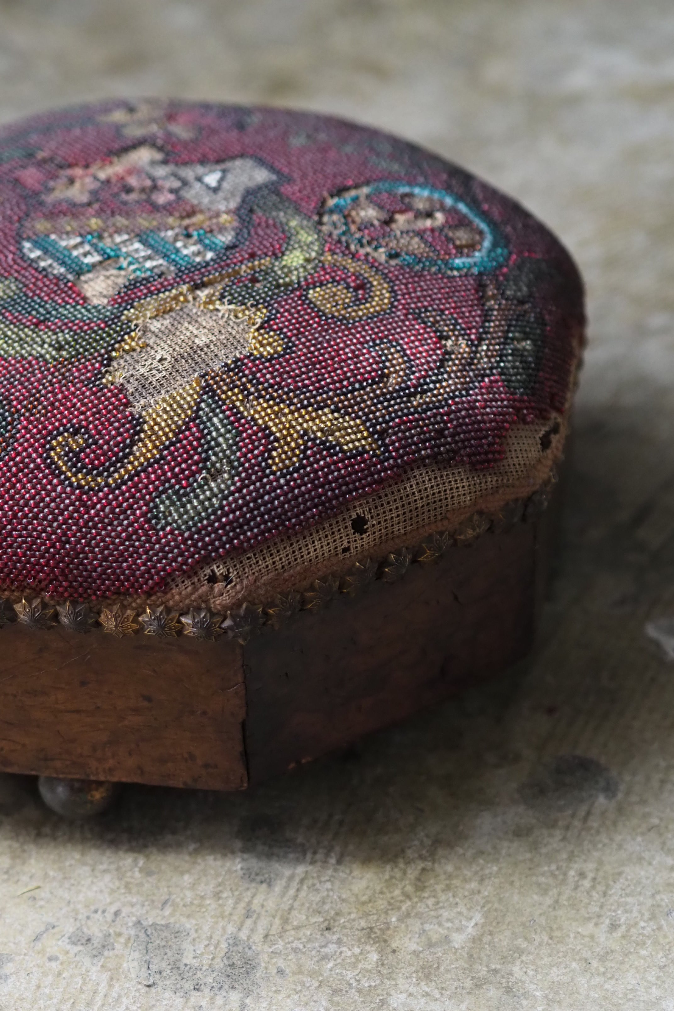ビーズ刺繍の部分、取れる可能性があります。本来の、脚を置いて使う用途は避けた方が良いです。