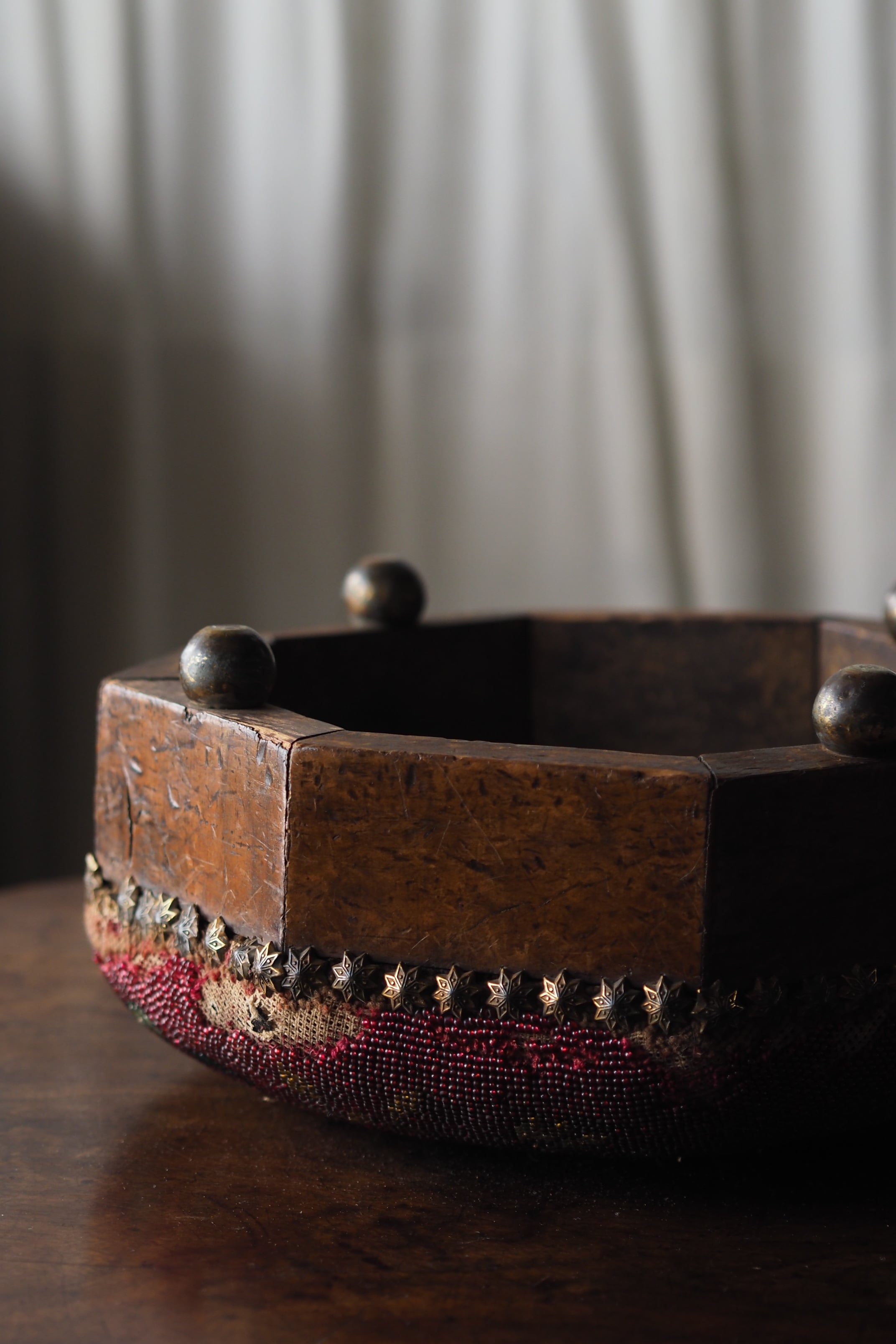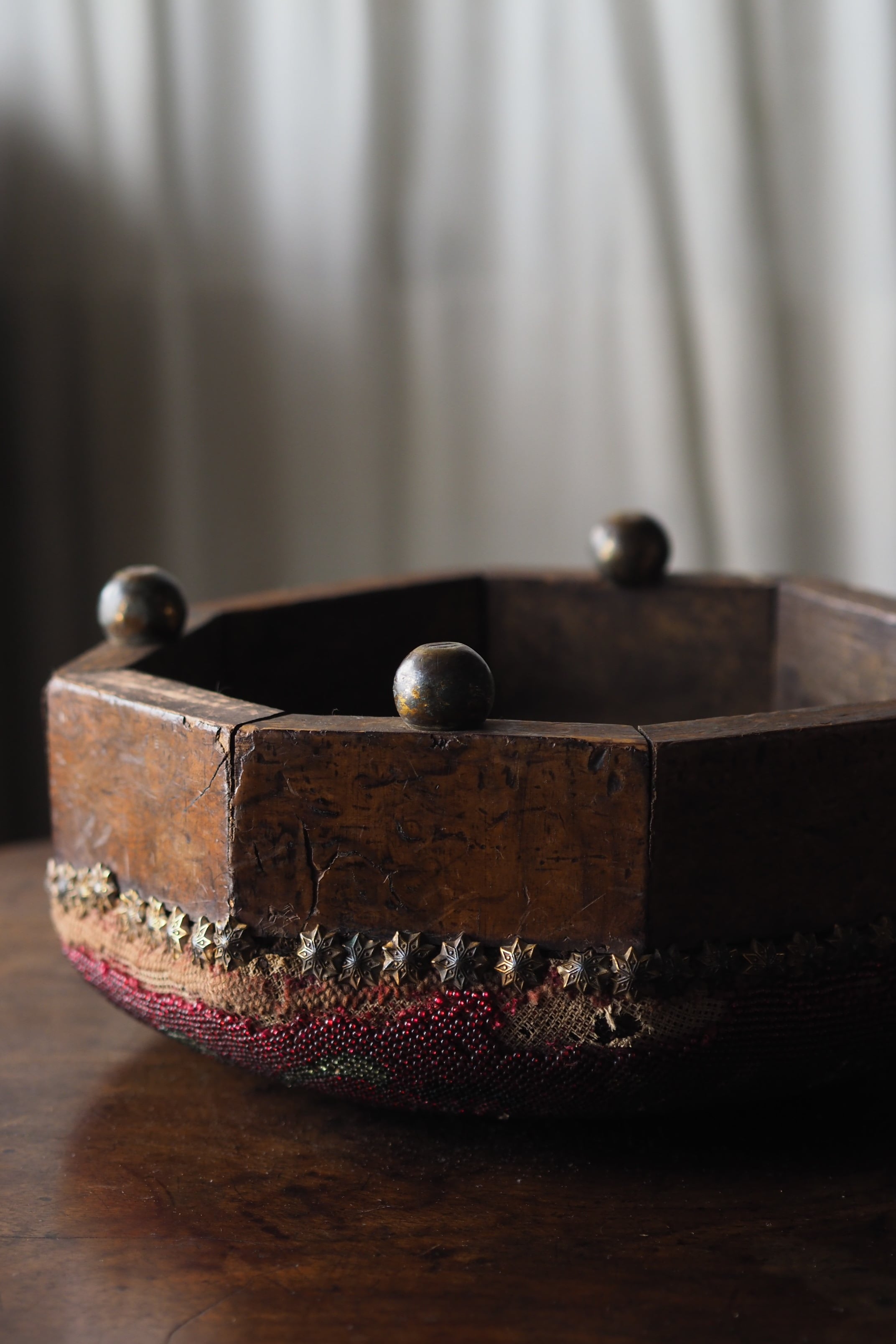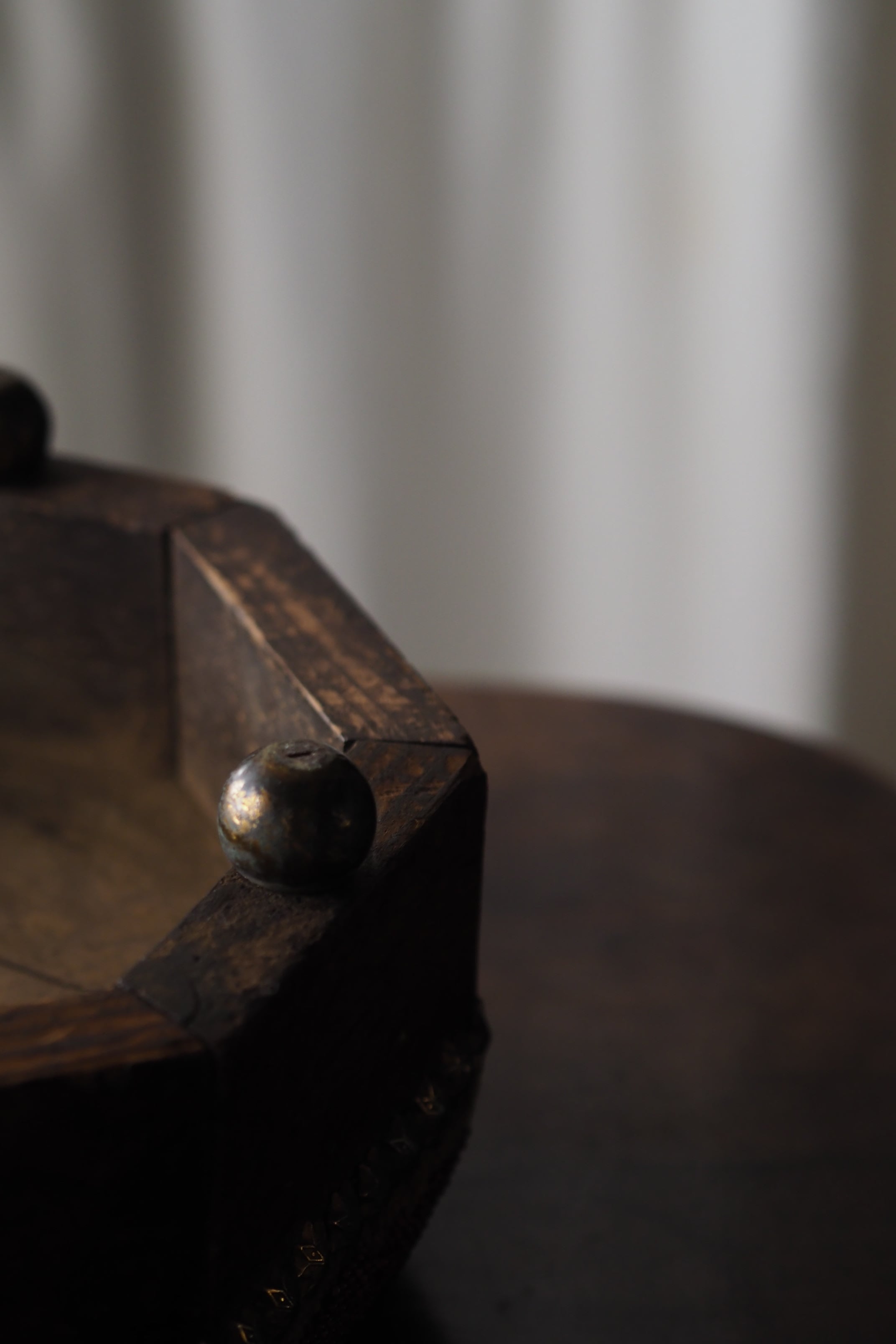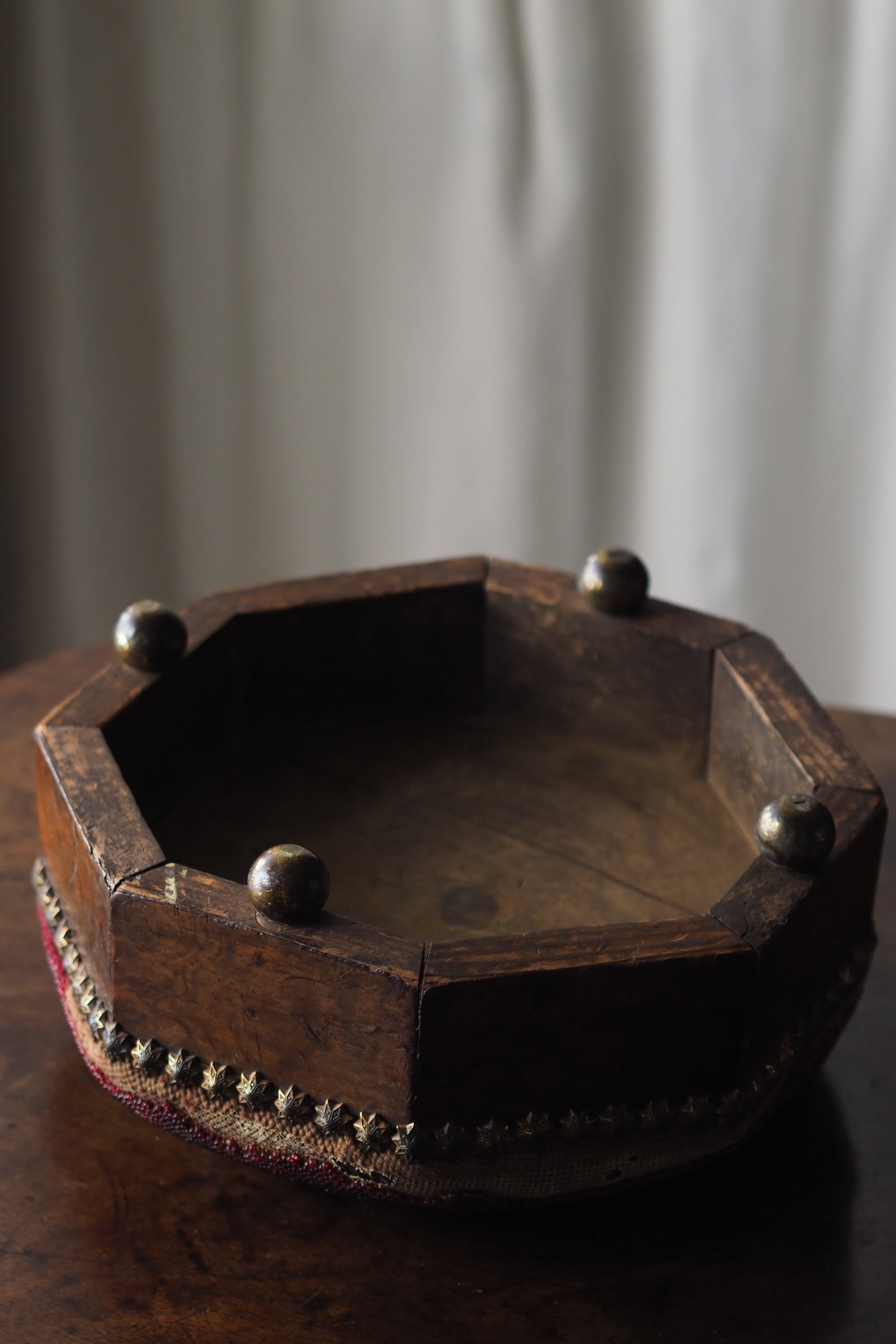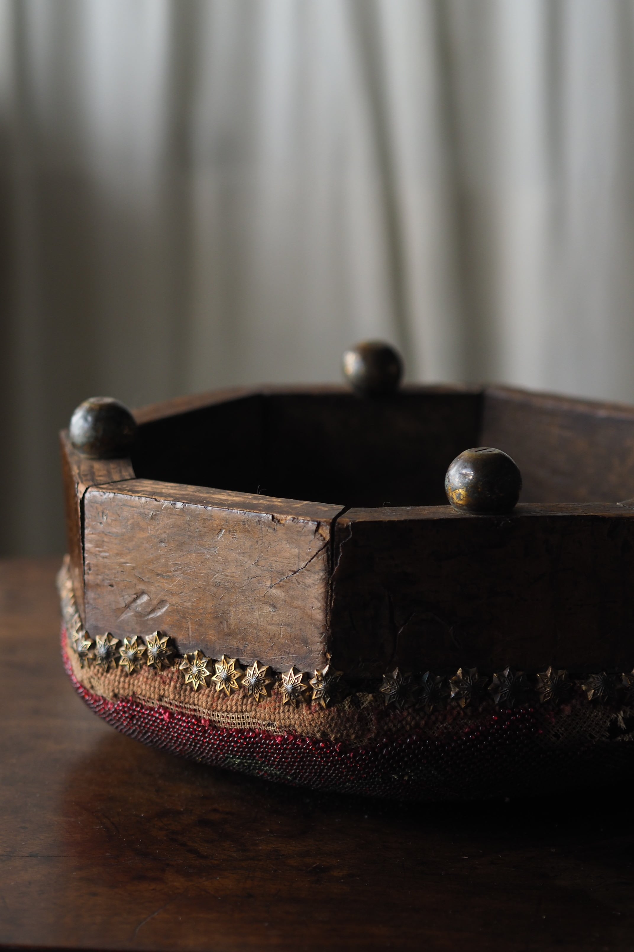 真鍮の丸い足に八角形の側板は胡桃材、時を経たこっくりと深い木目。