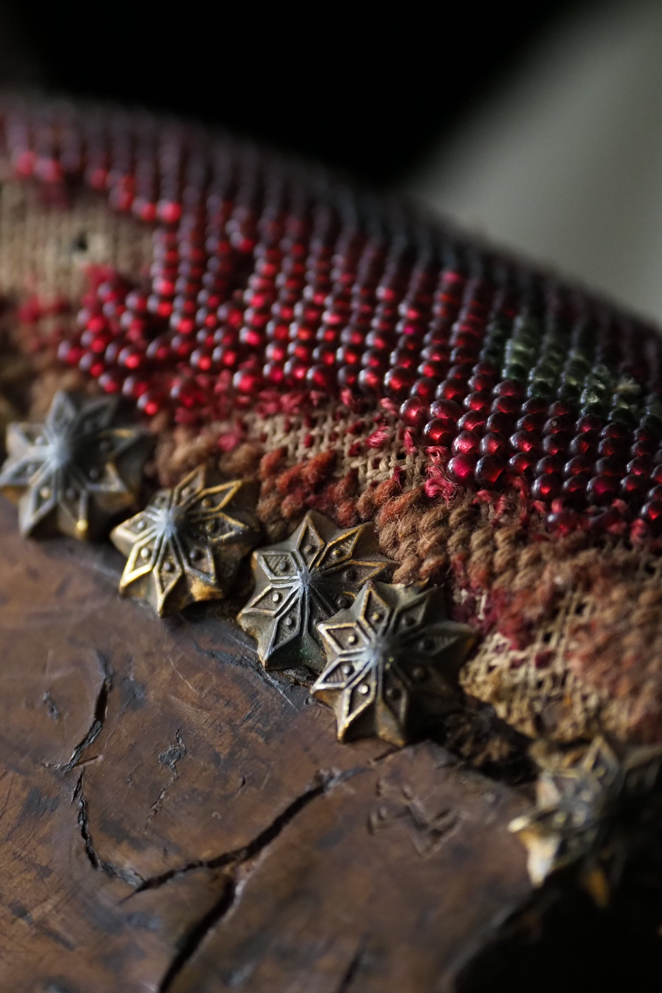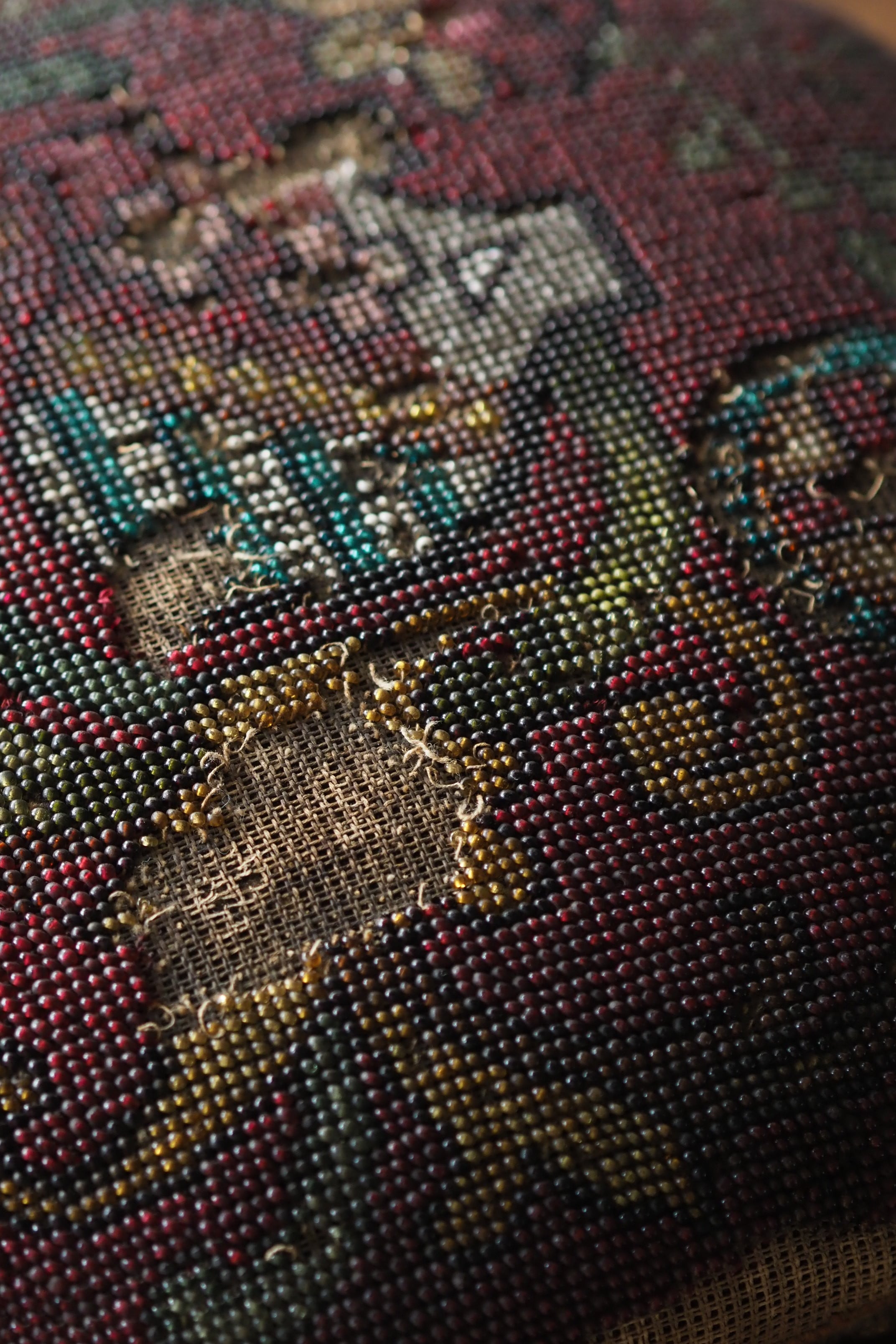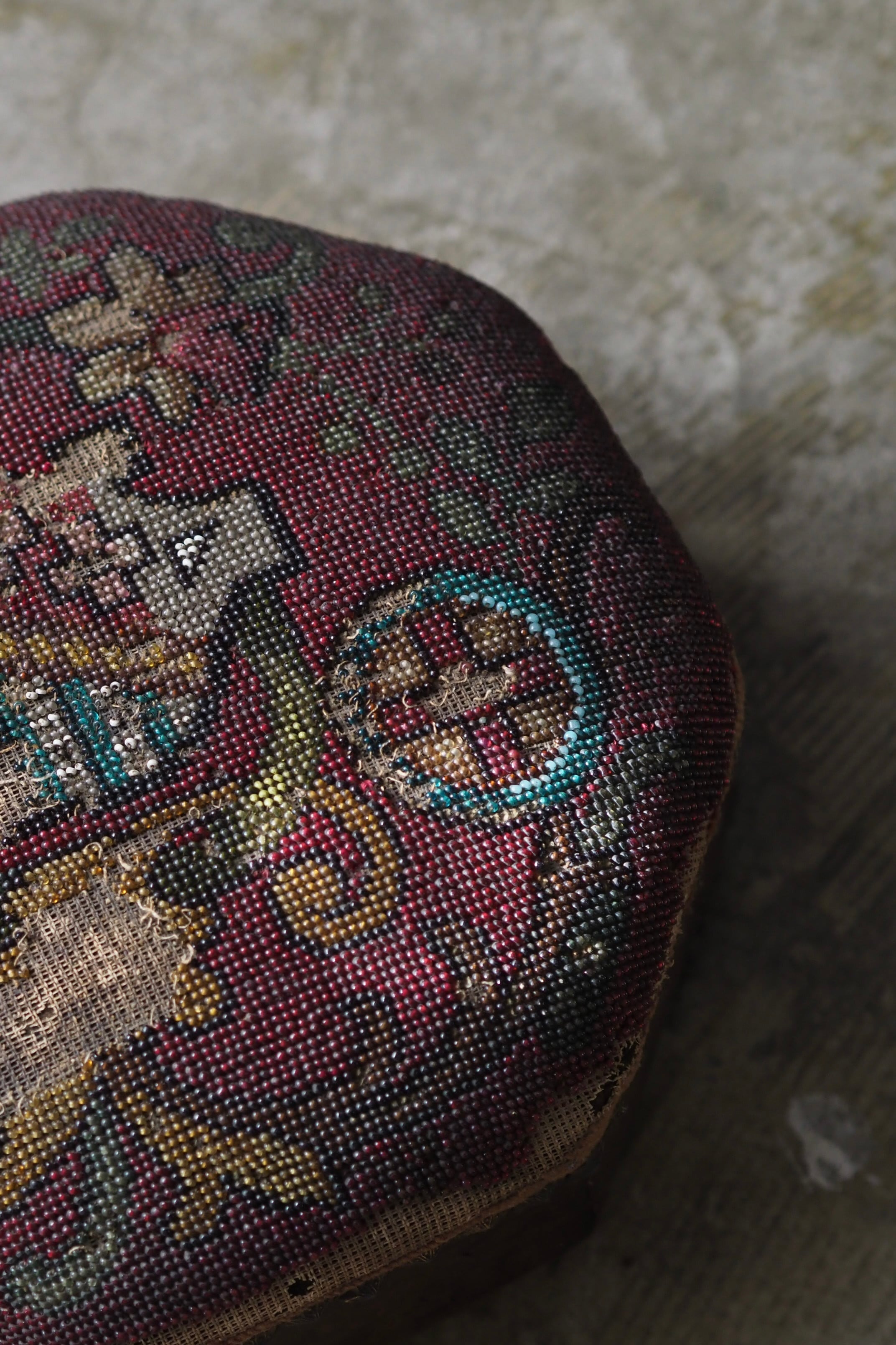 ドラマティックなワインレッド色をベースに、紋章とボタニカル文様混ざった総ビーズ刺繍の座面。