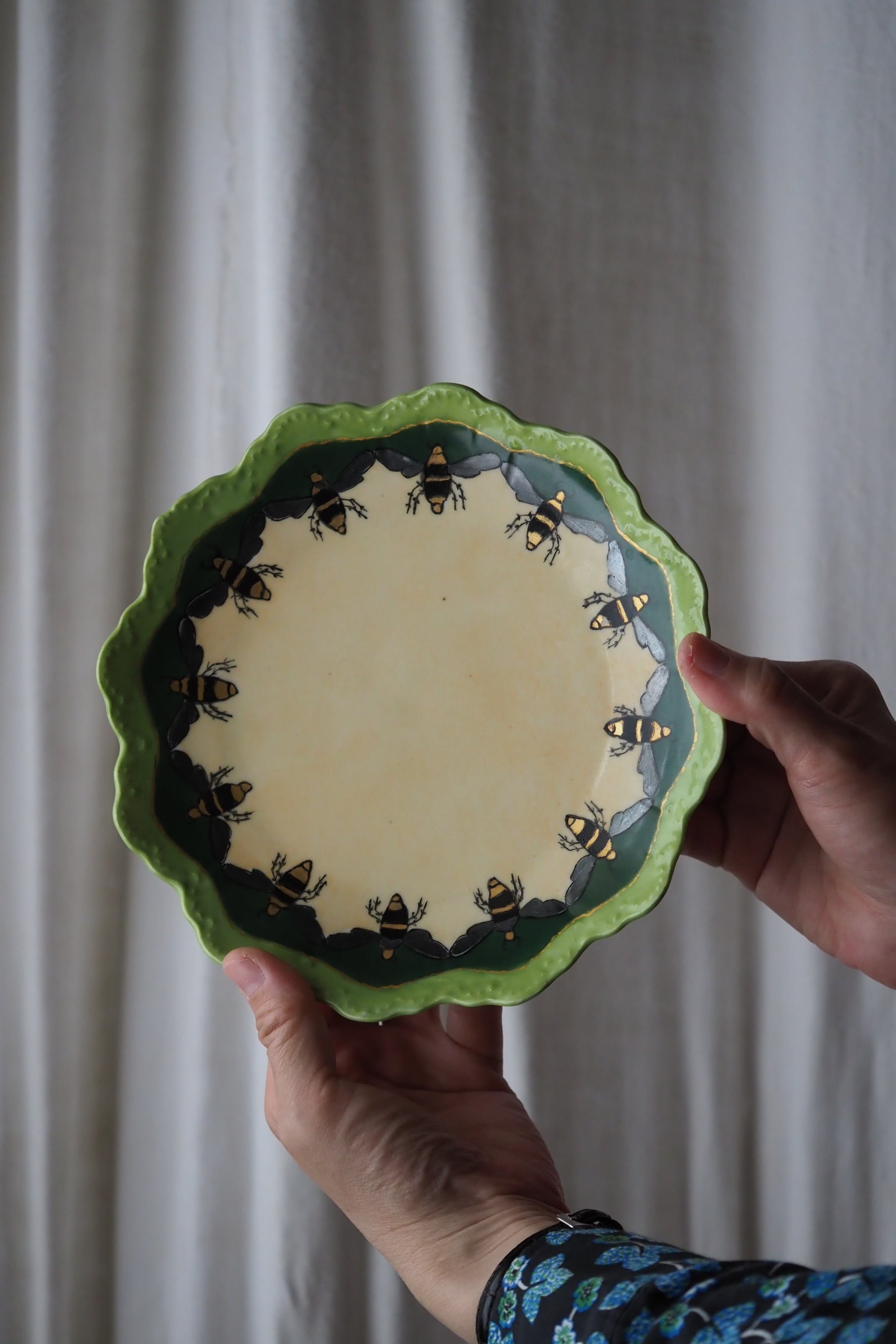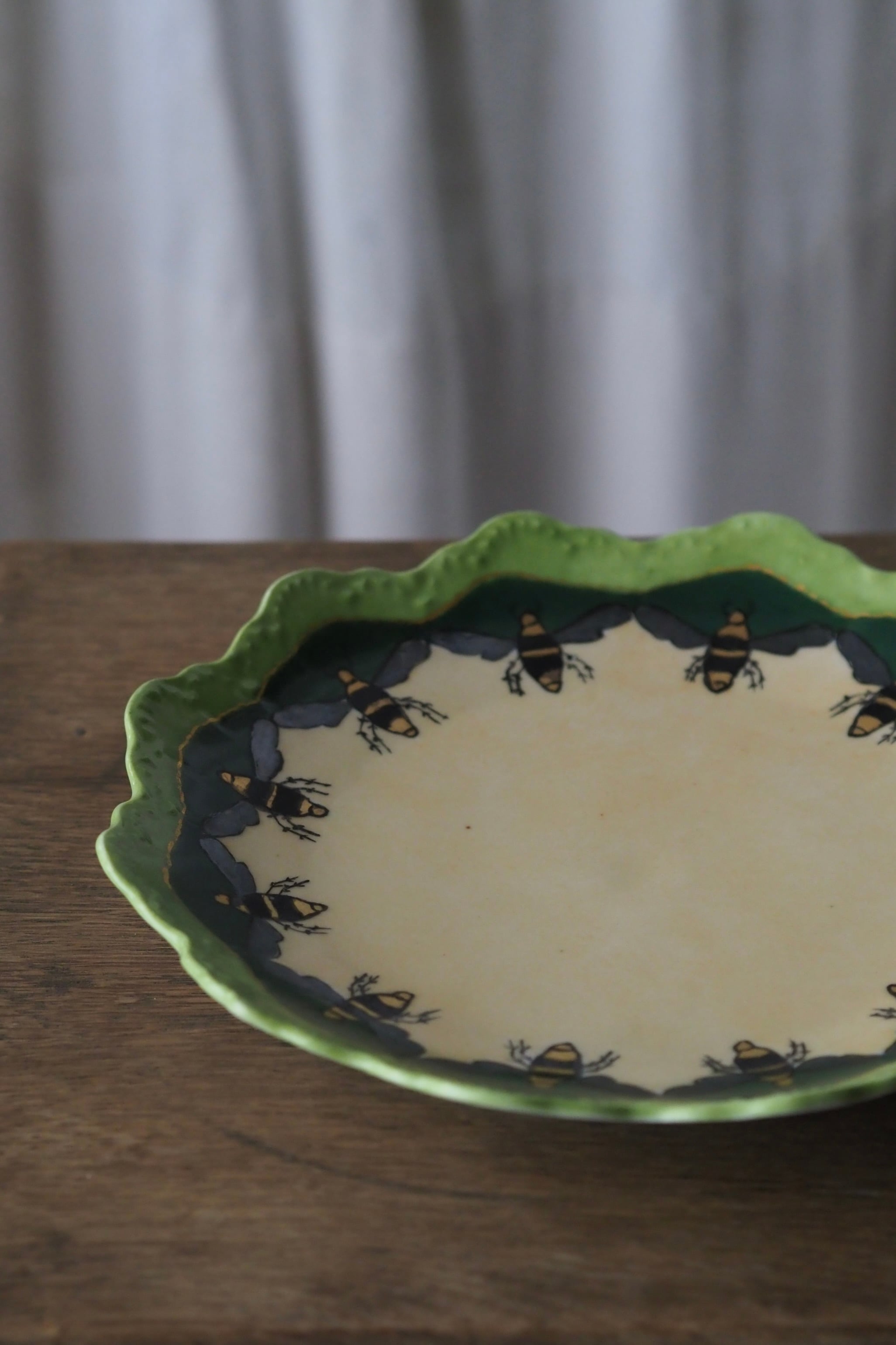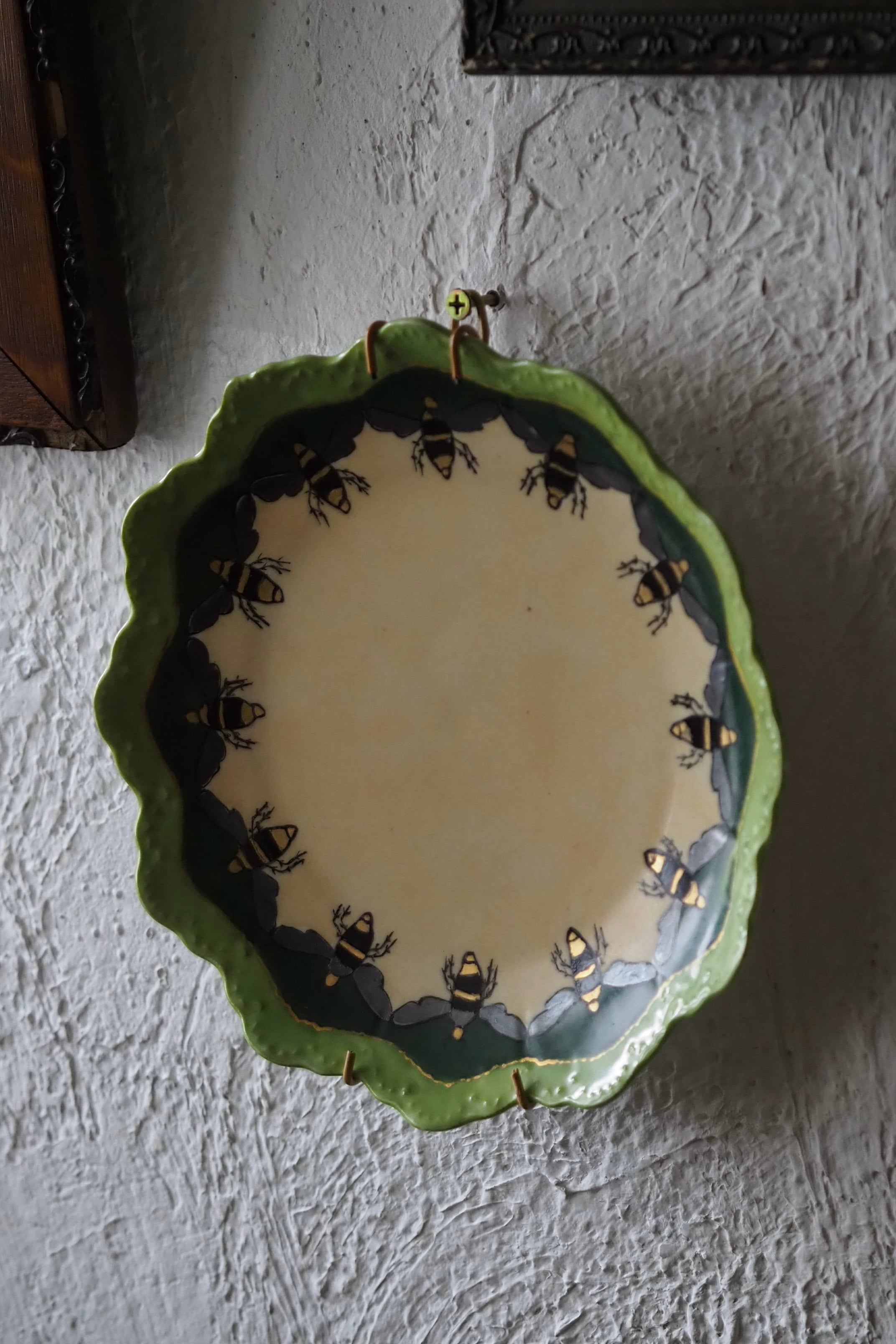 スカラップ縁はドイツ バイエルン州ローゼンタール社特有の形で、華麗なお花模様が主。こちらは蜂が周囲ぐるりと巡った珍しい図柄。