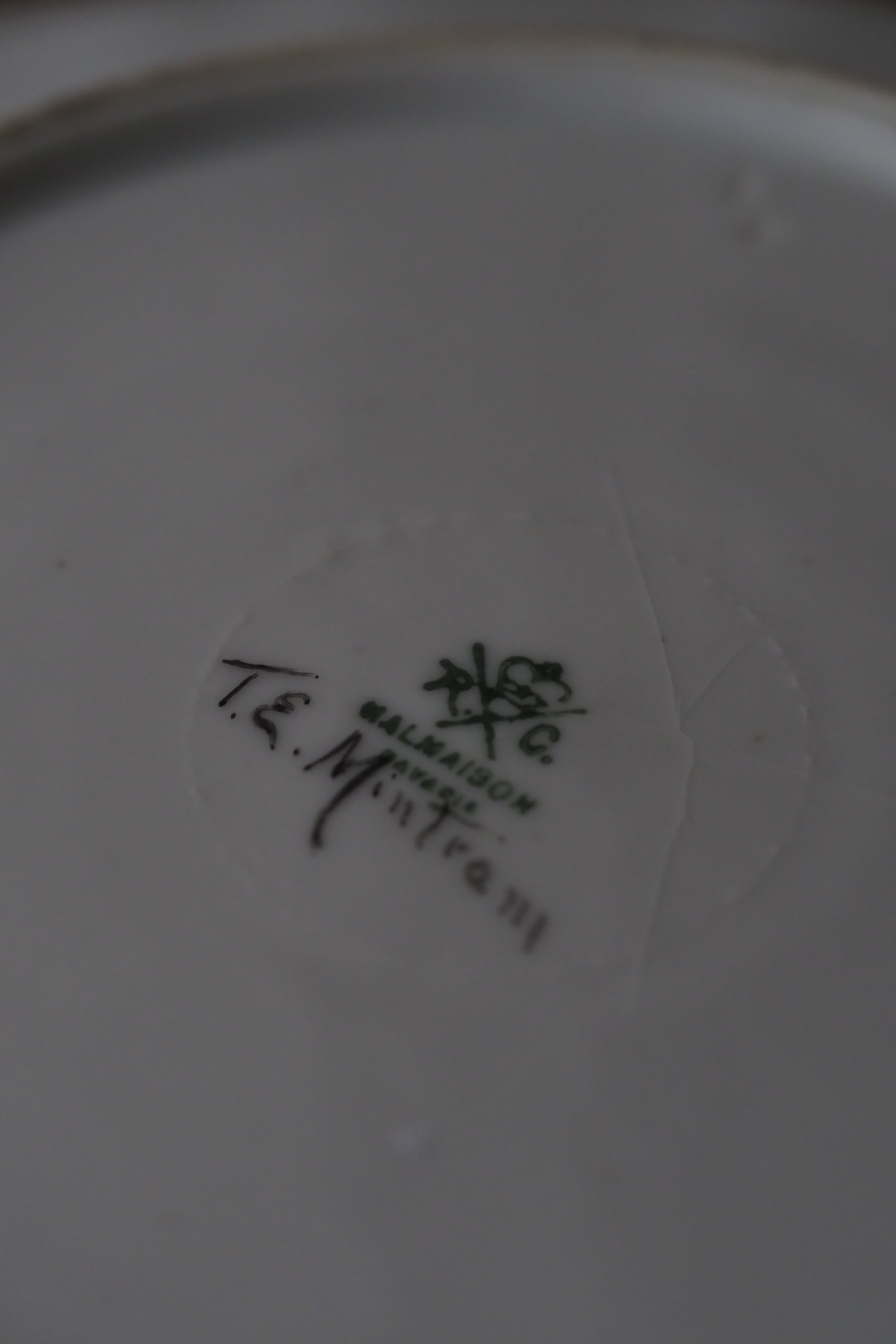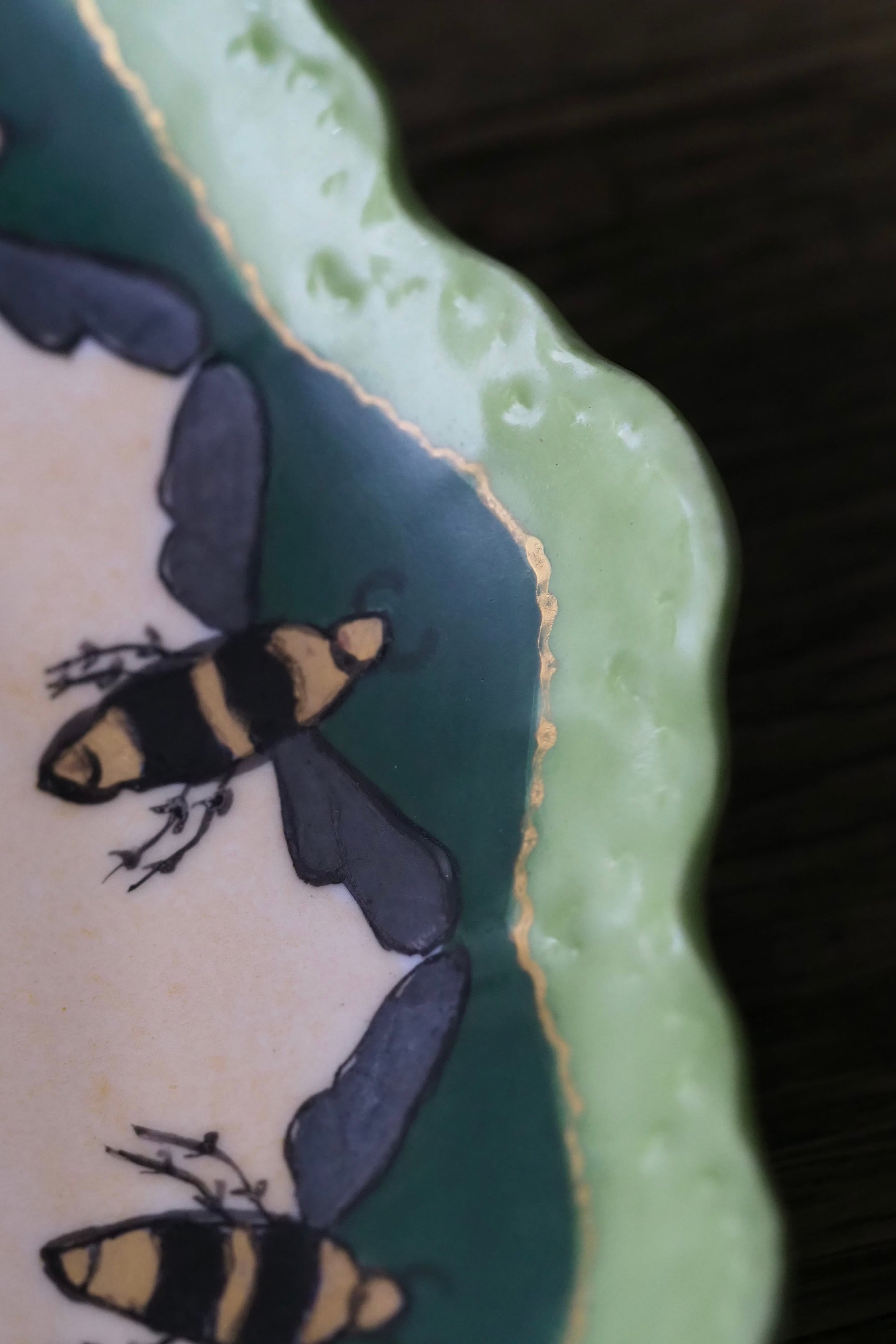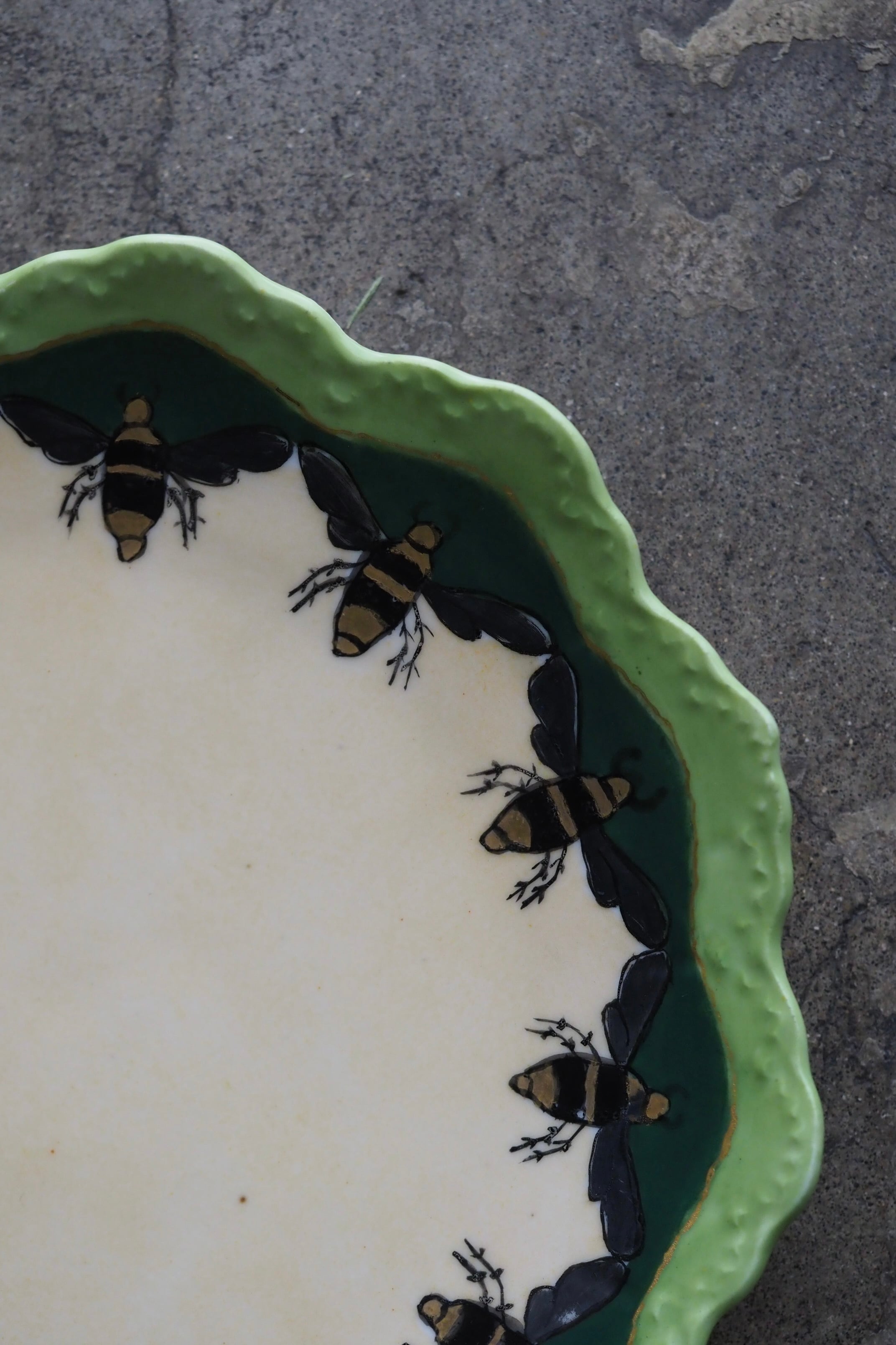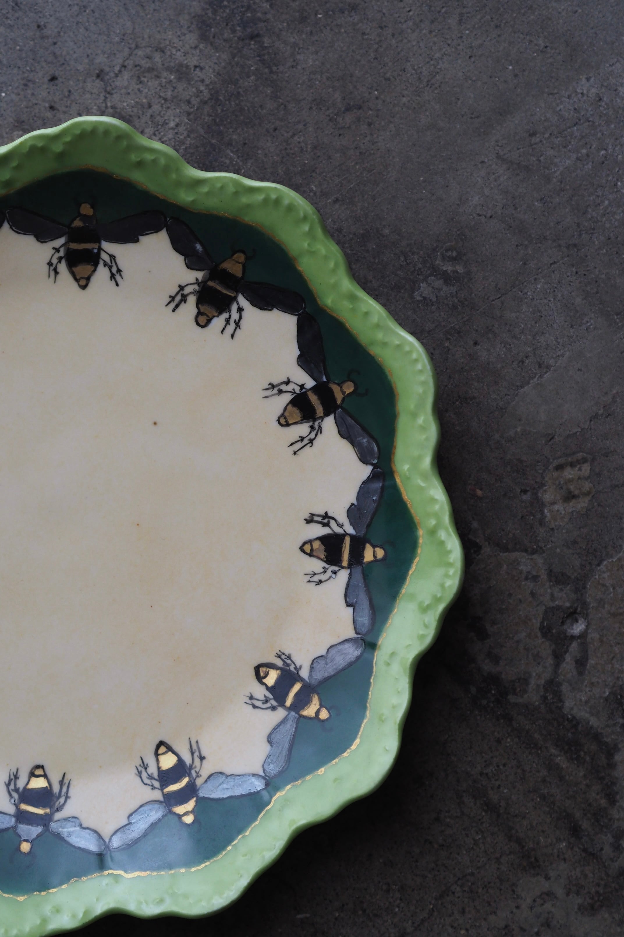 スカラップ縁はドイツ バイエルン州ローゼンタール社特有の形で、華麗なお花模様が主。こちらは蜂が周囲ぐるりと巡った珍しい図柄。
