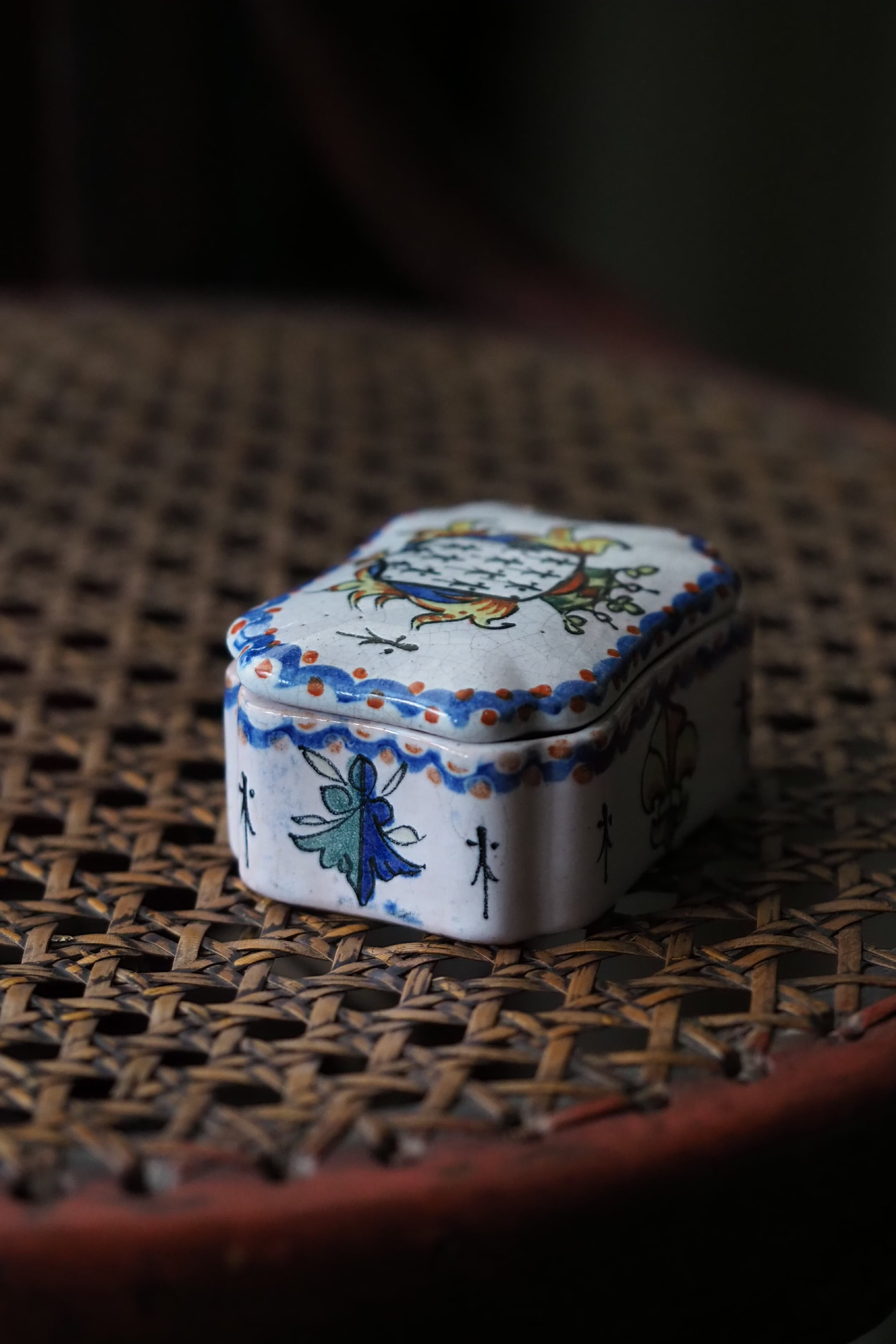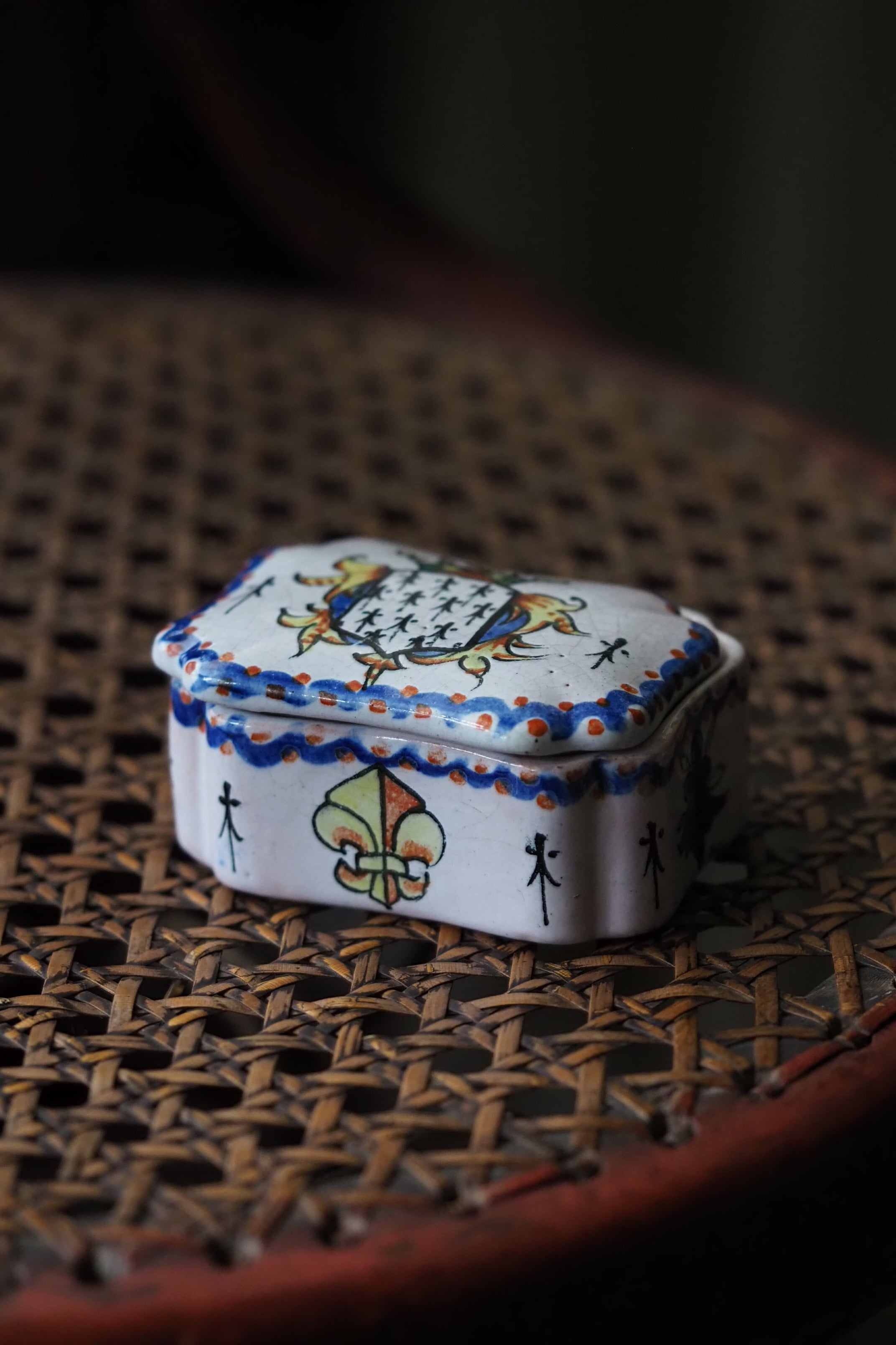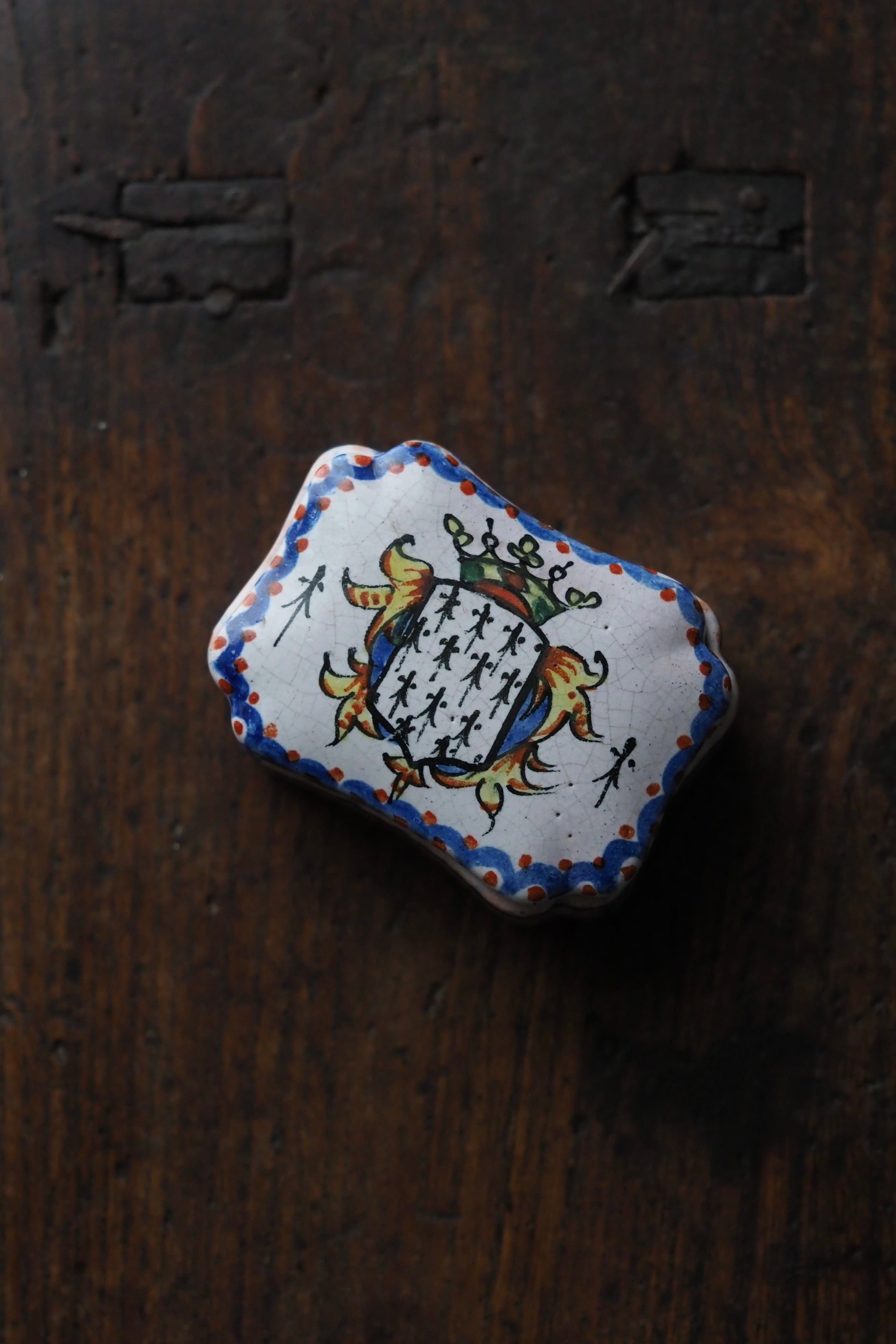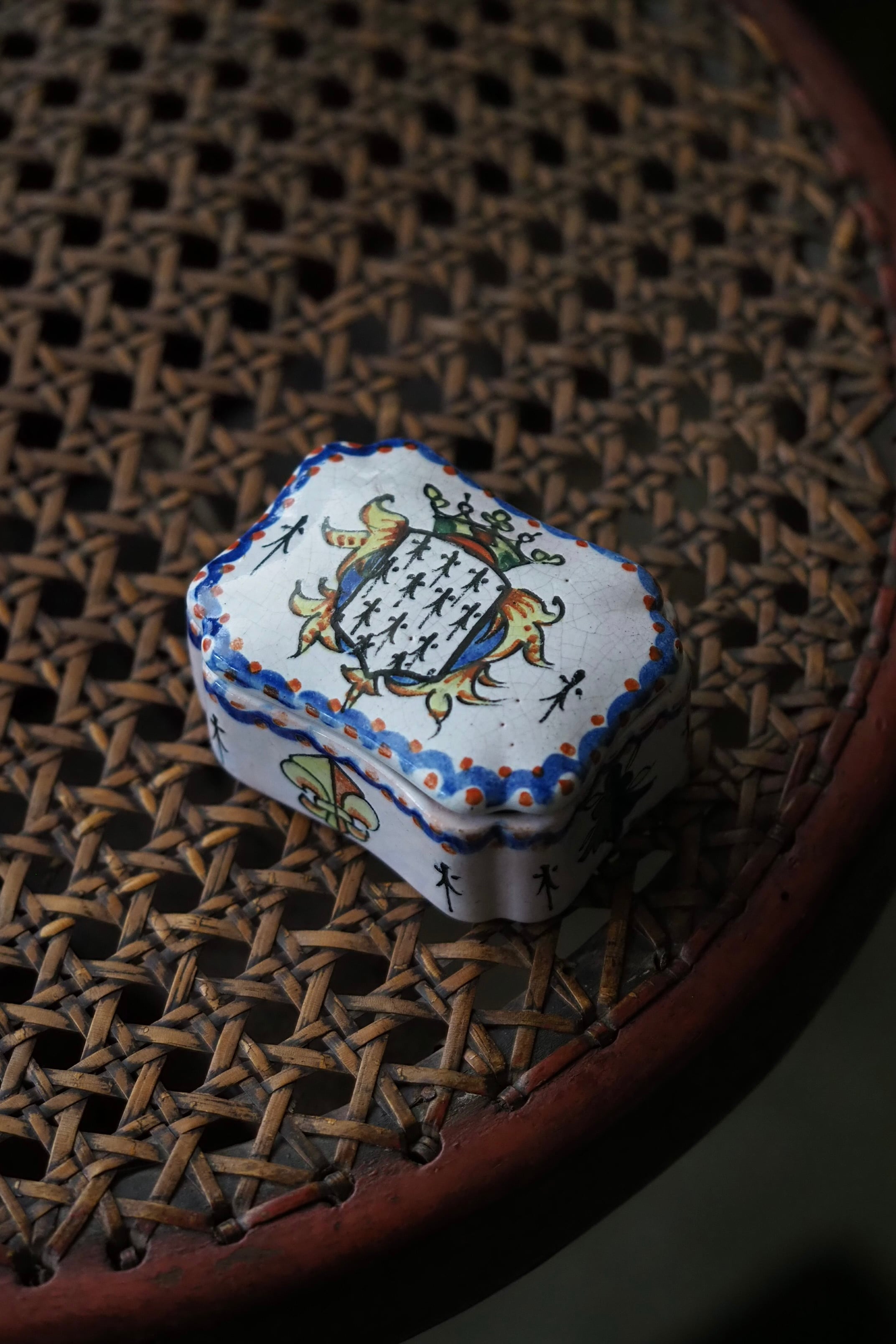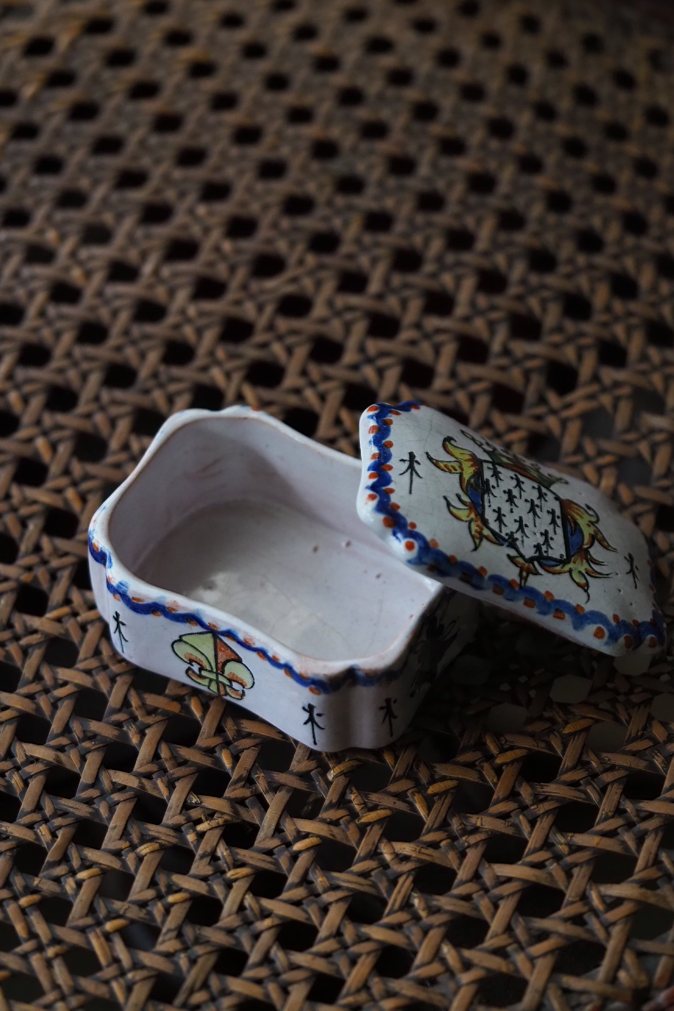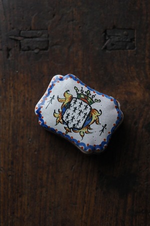 ブルターニュの紋章が手描きでのびのびと描かれている、フランス ルーアン焼きのトリンケットケース。