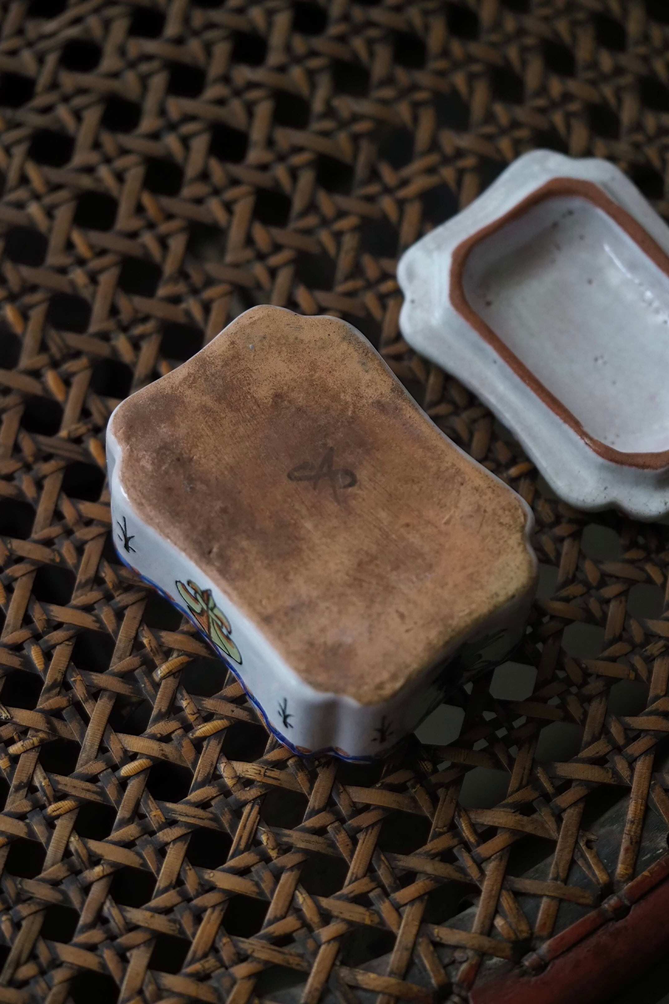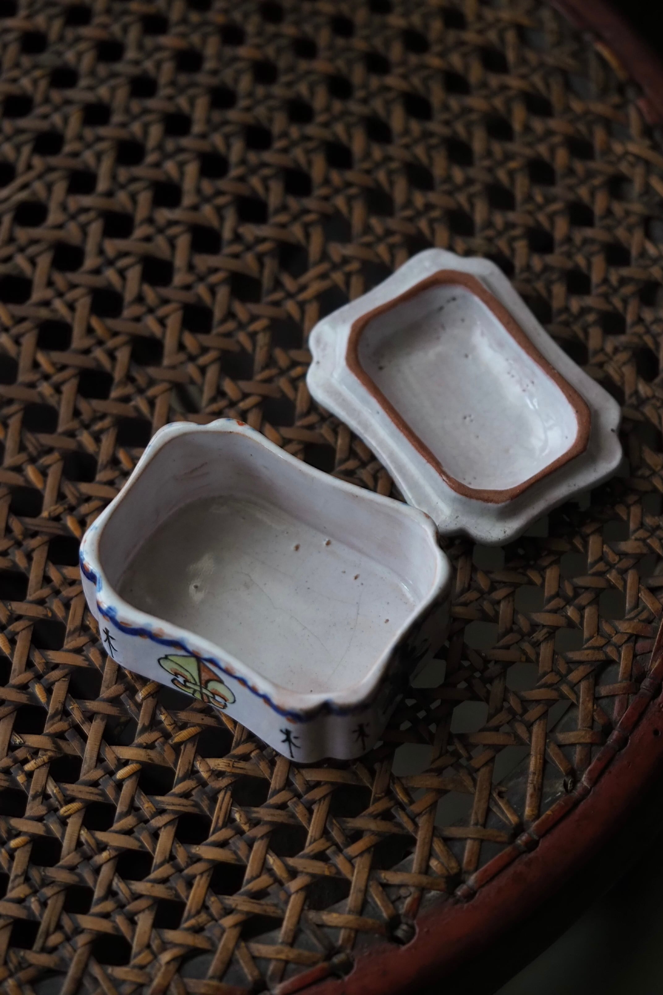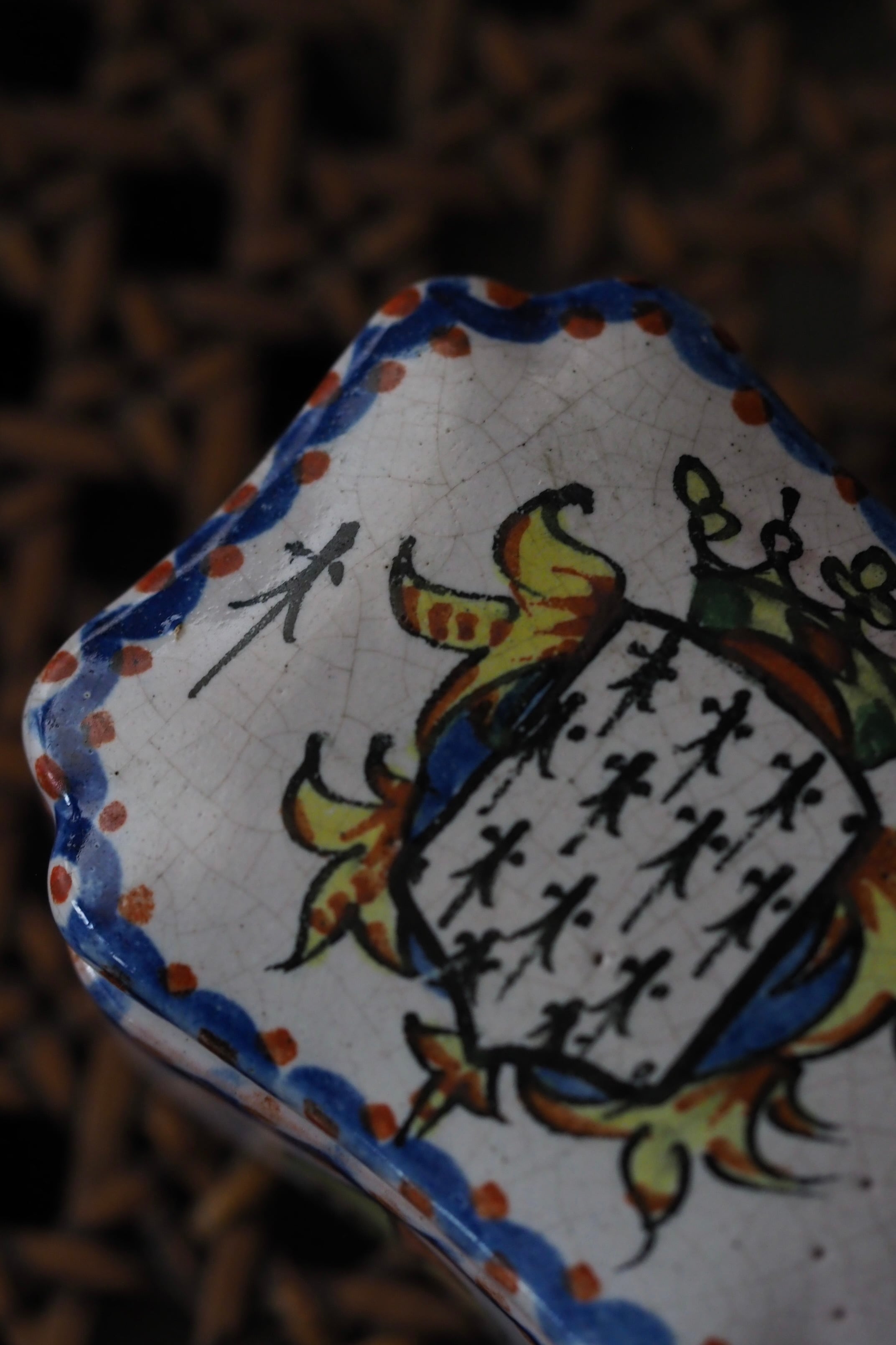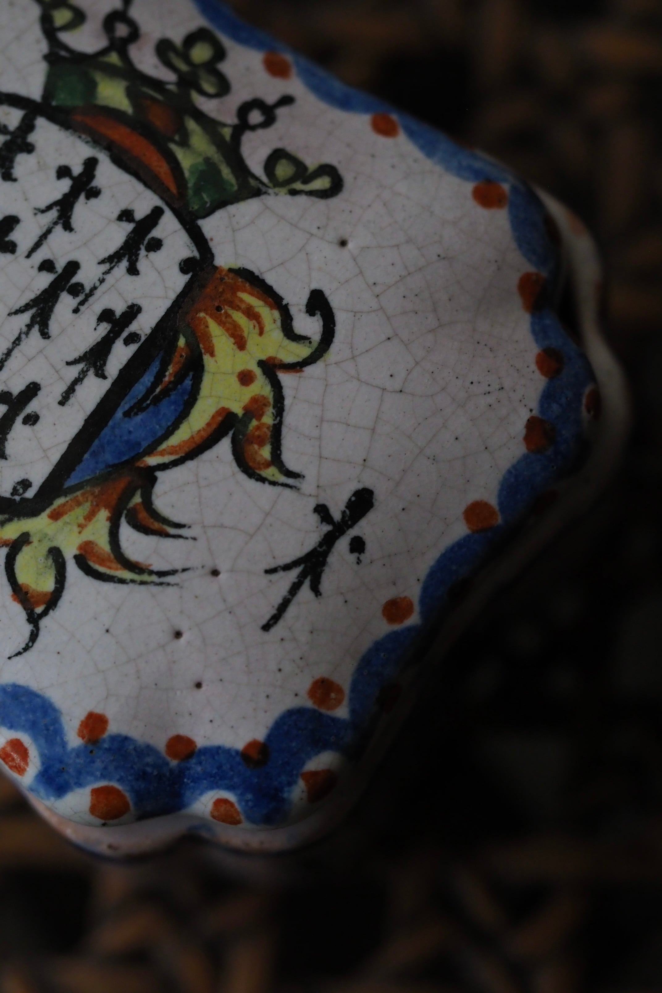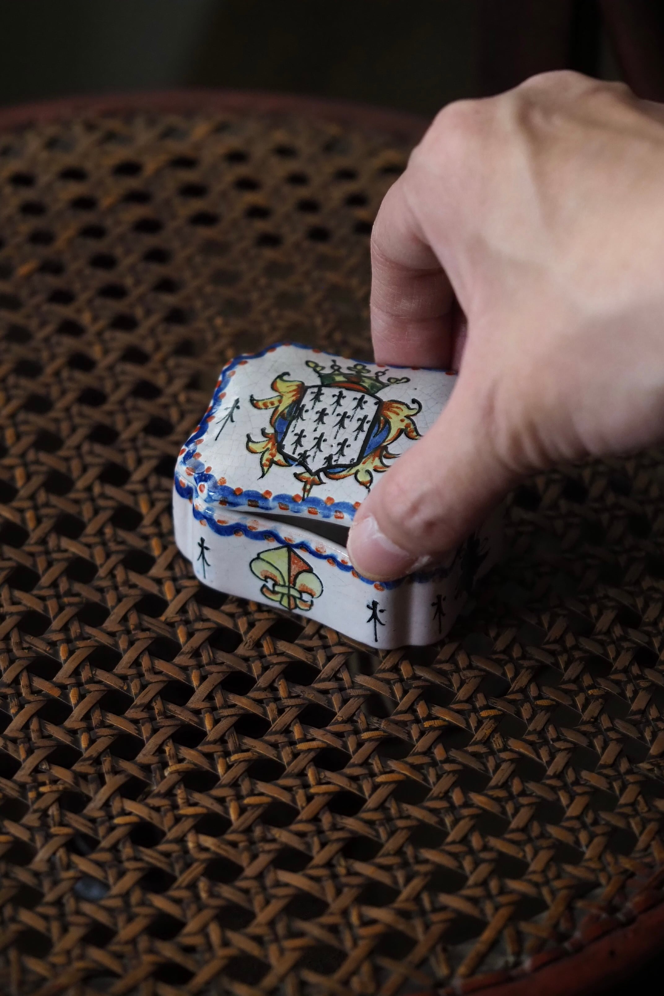 ブルターニュの紋章が手描きでのびのびと描かれている、フランス ルーアン焼きのトリンケットケース。
