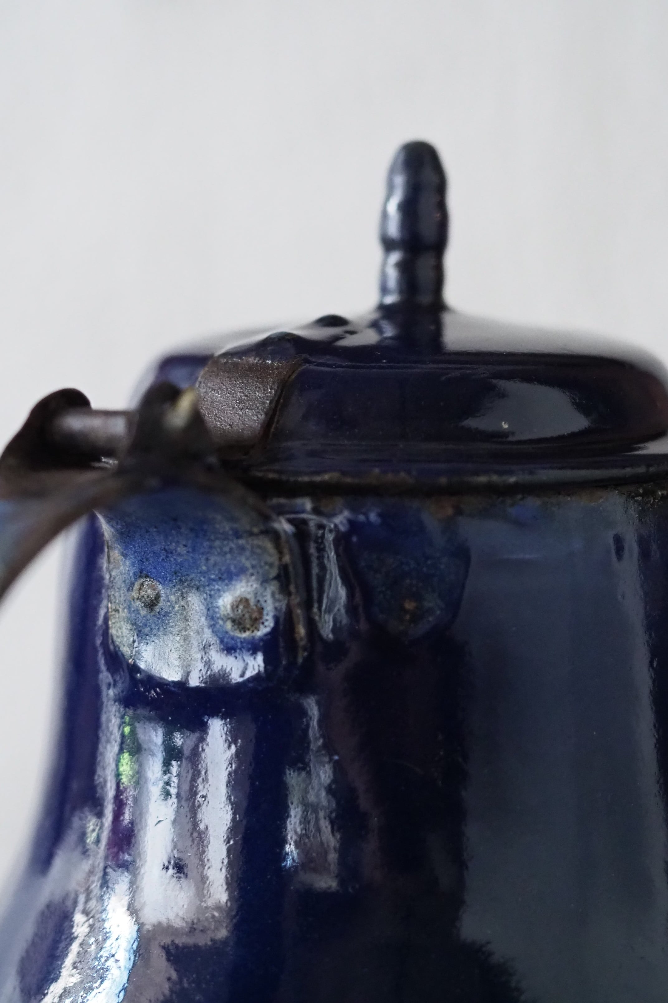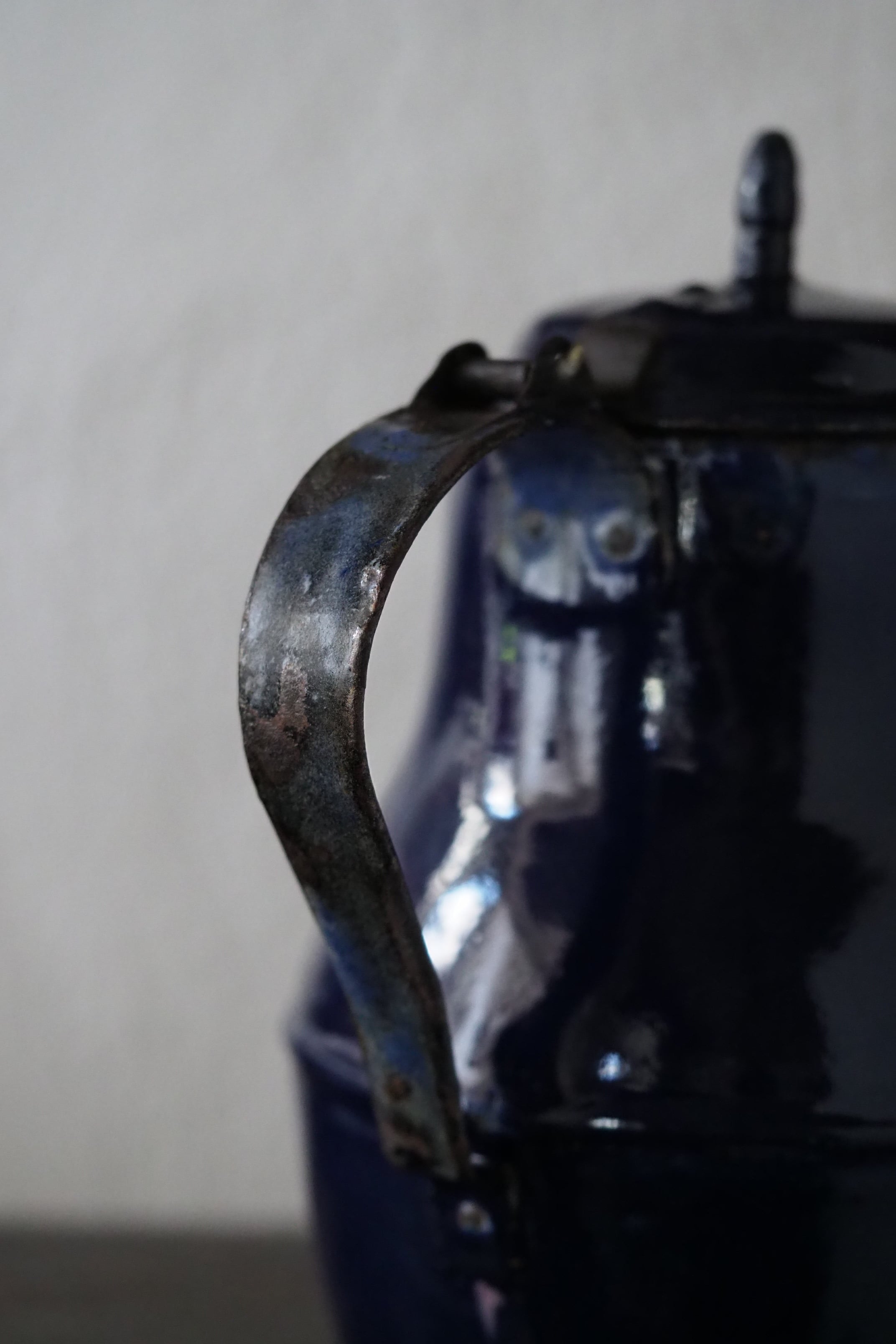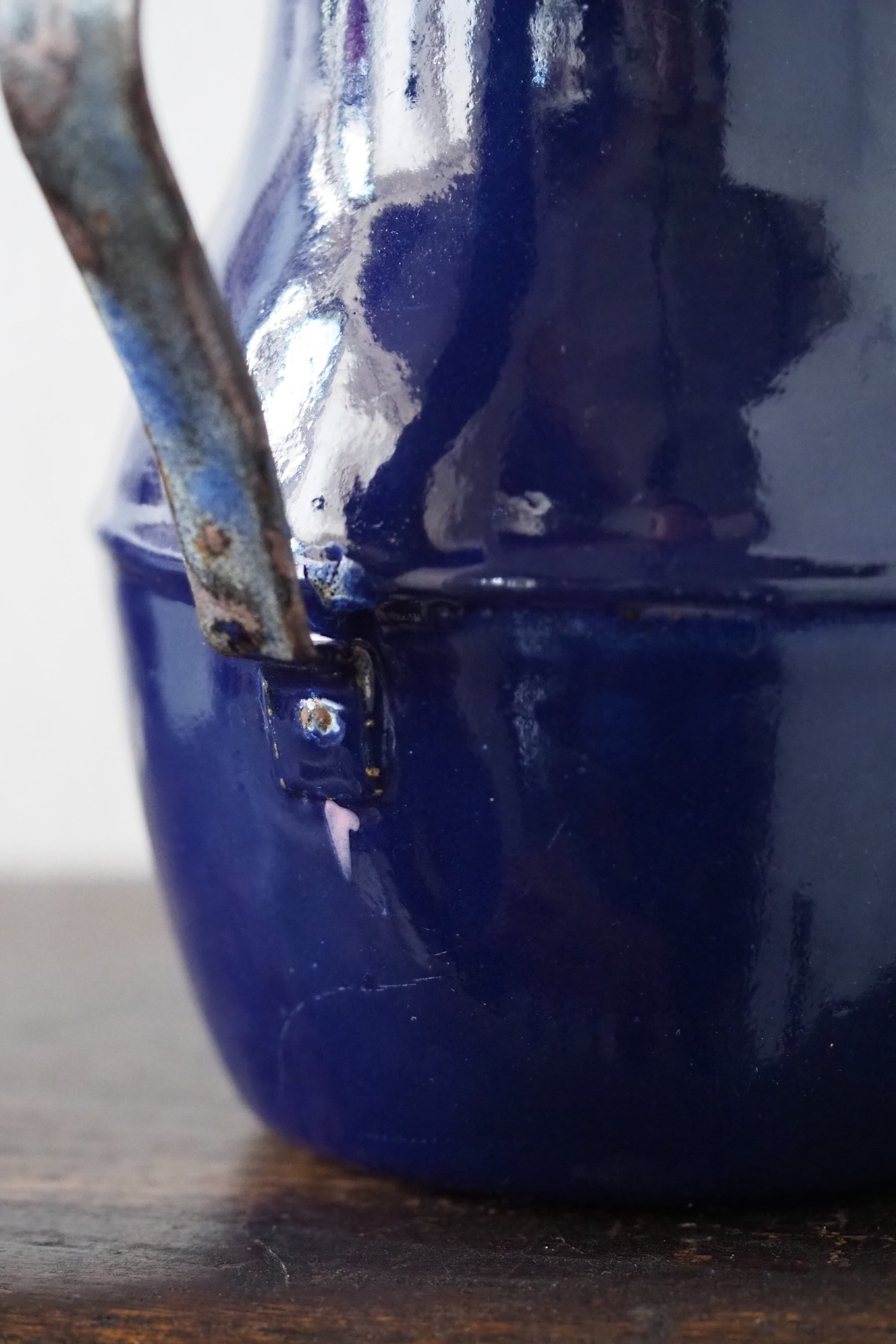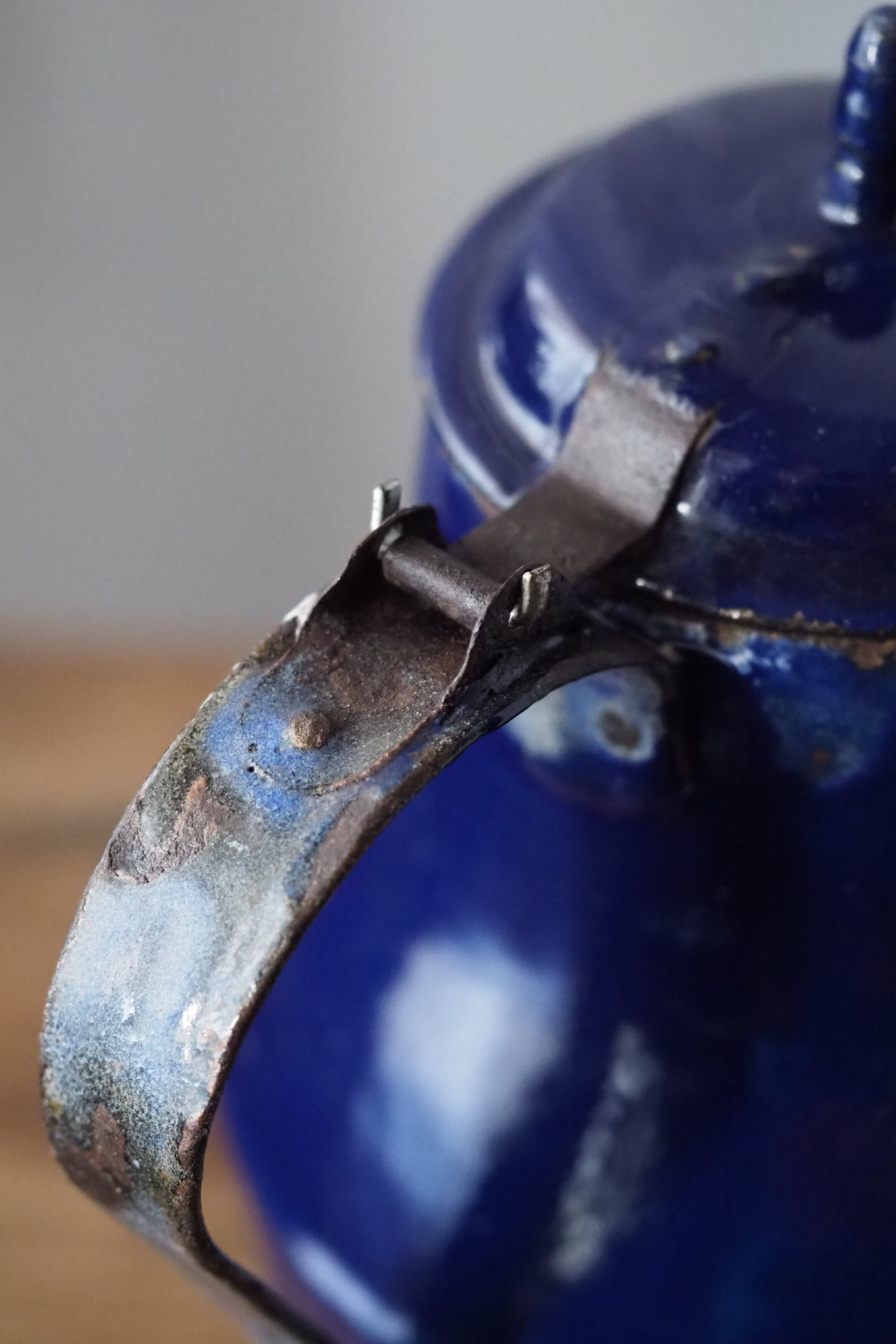 所々にエナメルの剥がれ、ハンドルに一部錆び。されど味わい深い質感、綺麗なブルー琺瑯のコーヒーポット。