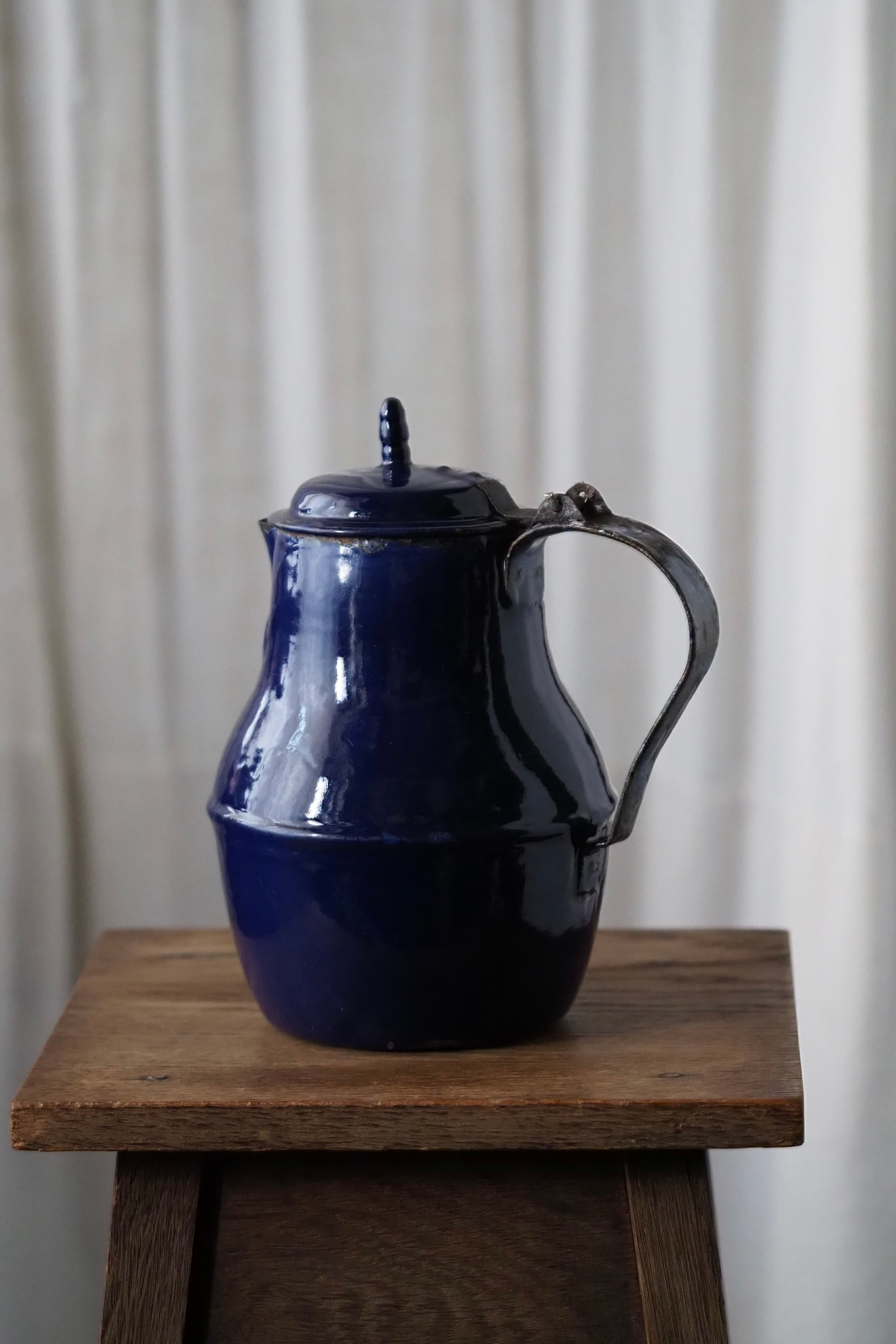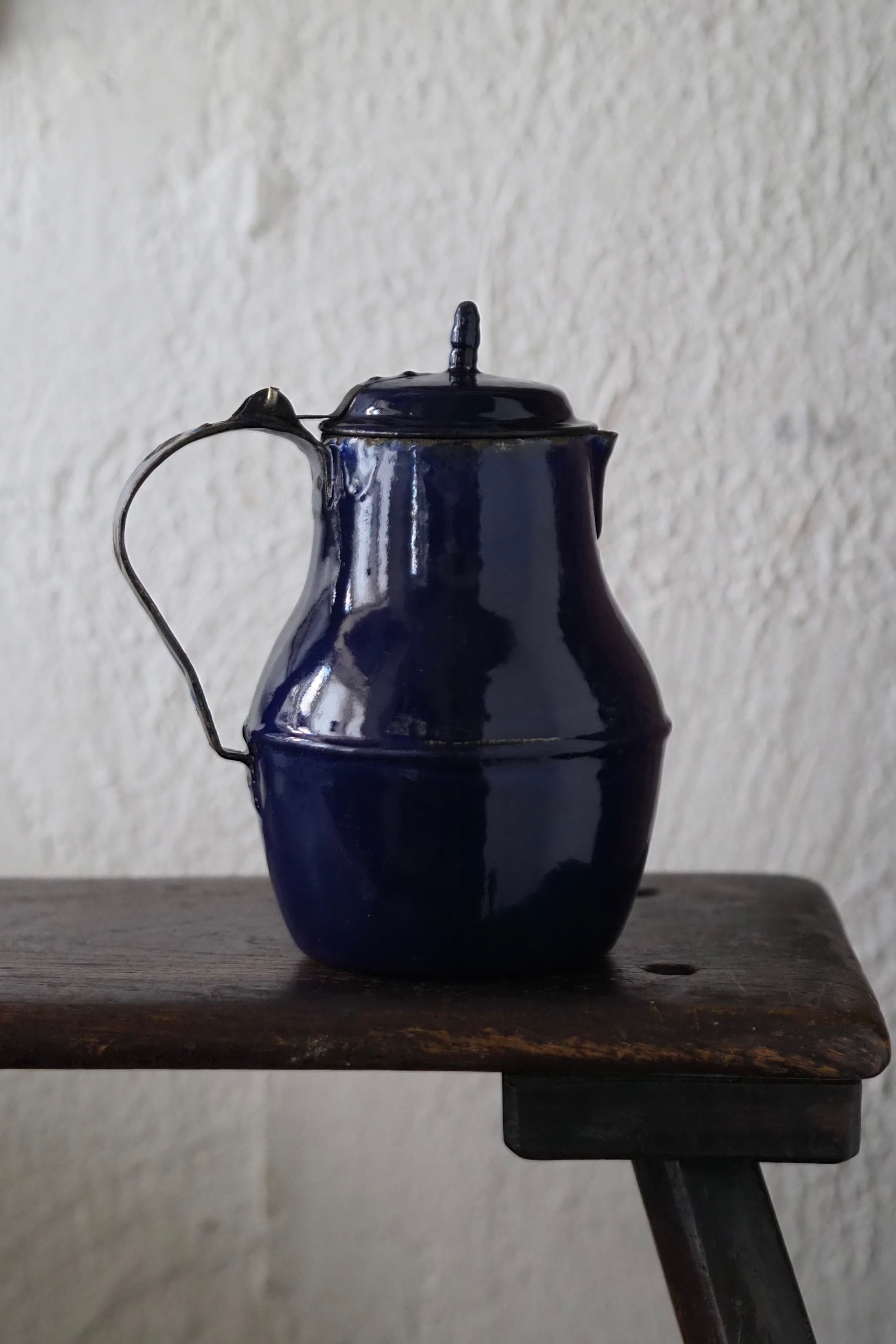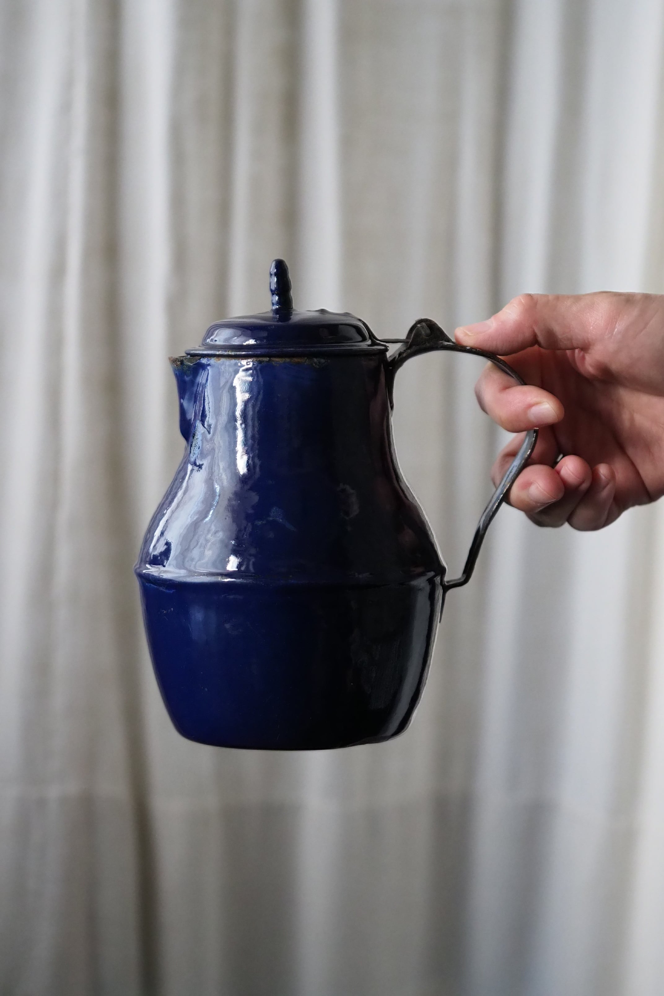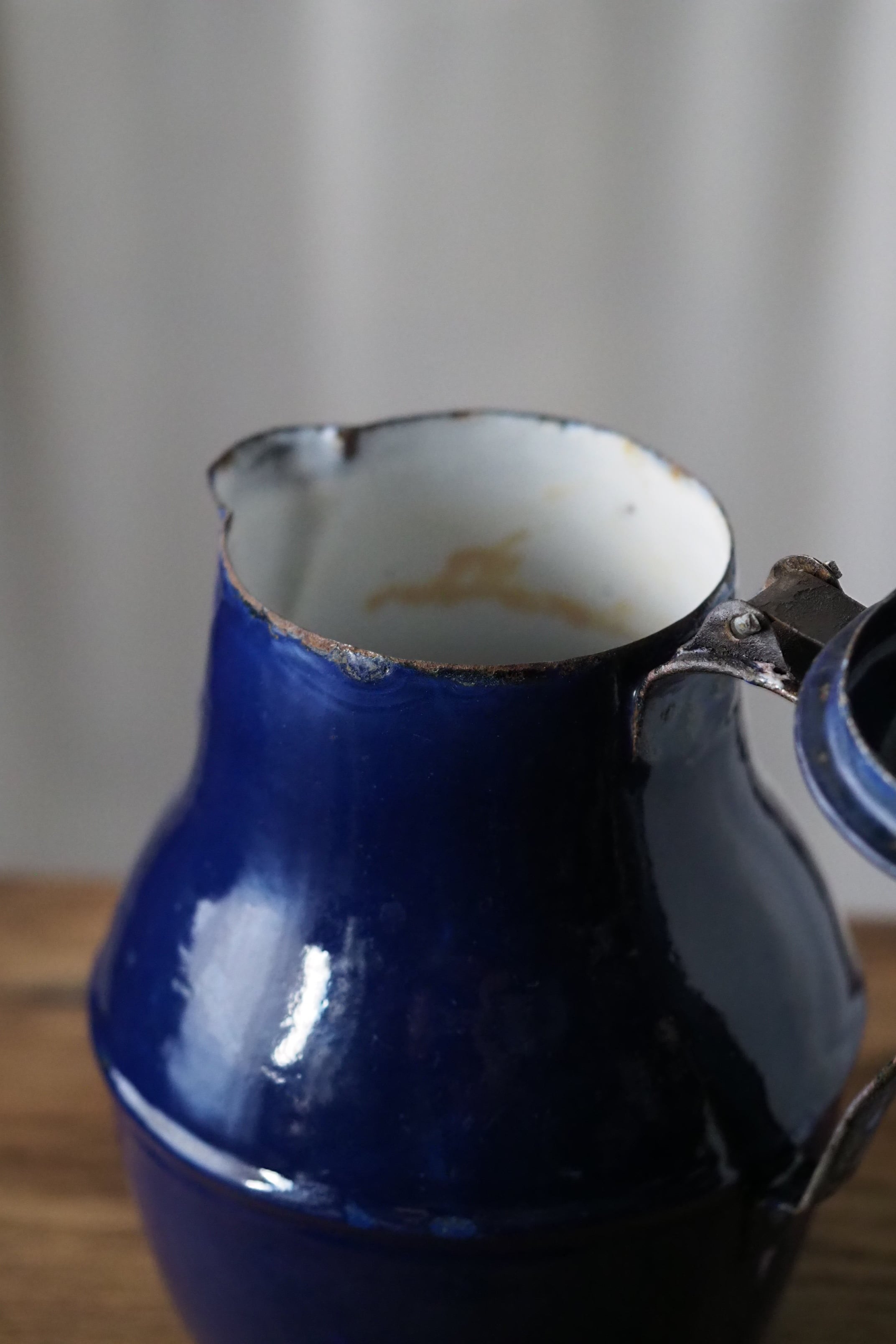 所々にエナメルの剥がれ、ハンドルに一部錆び。されど味わい深い質感、綺麗なブルー琺瑯のコーヒーポット。