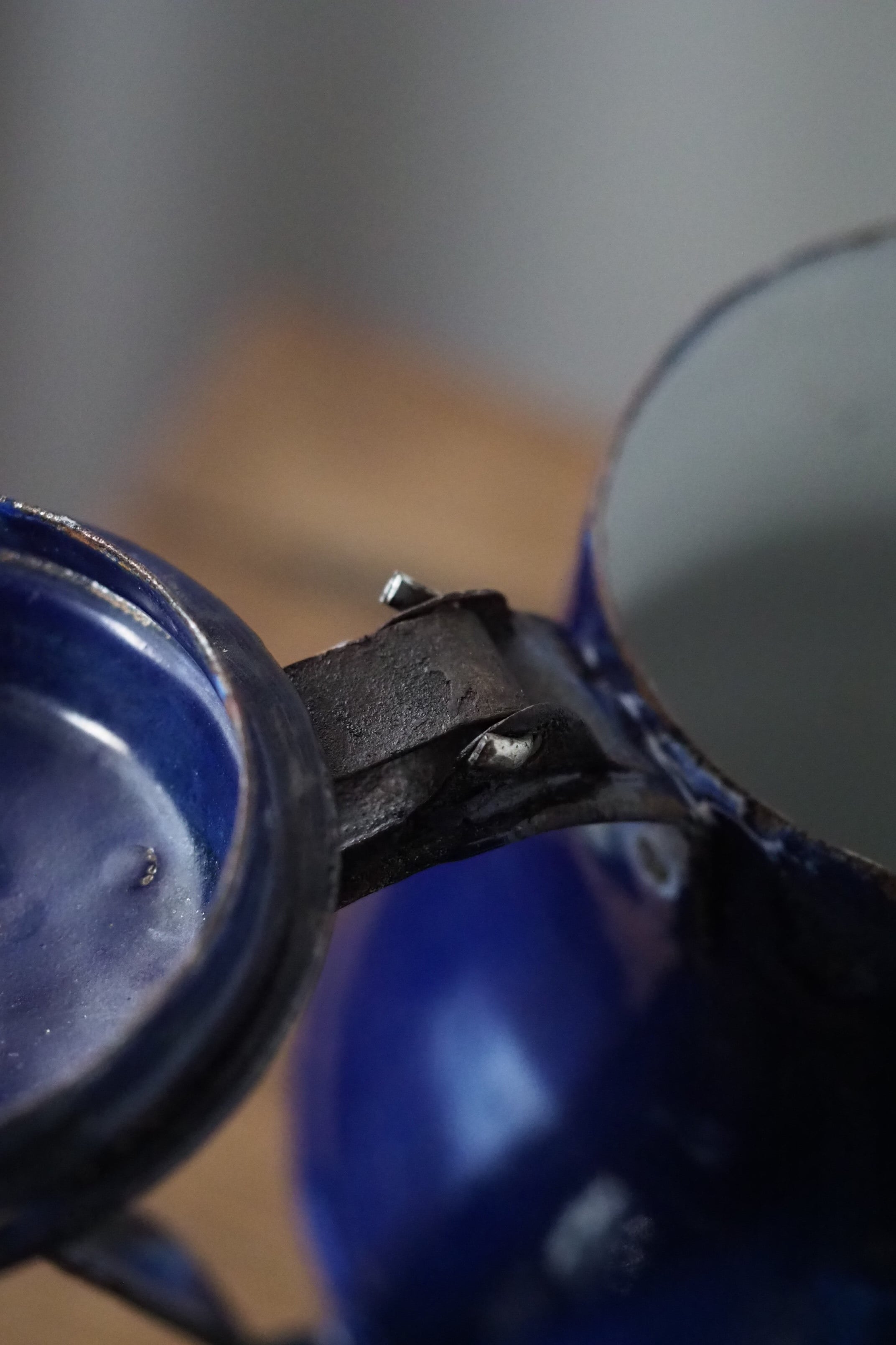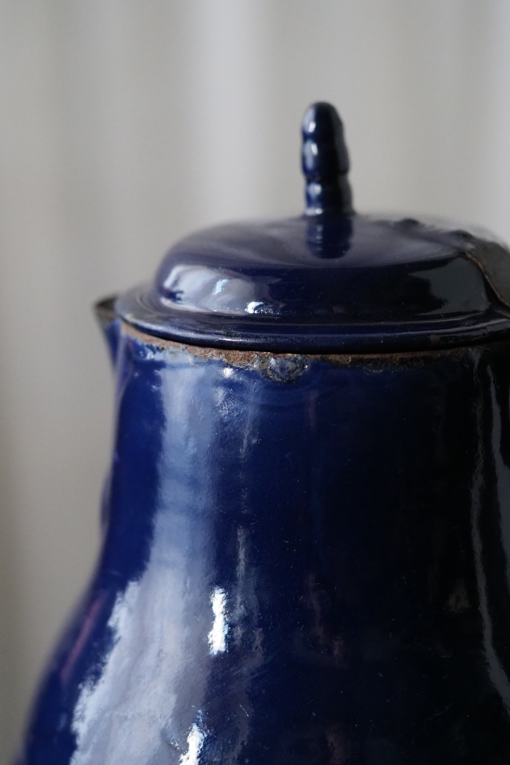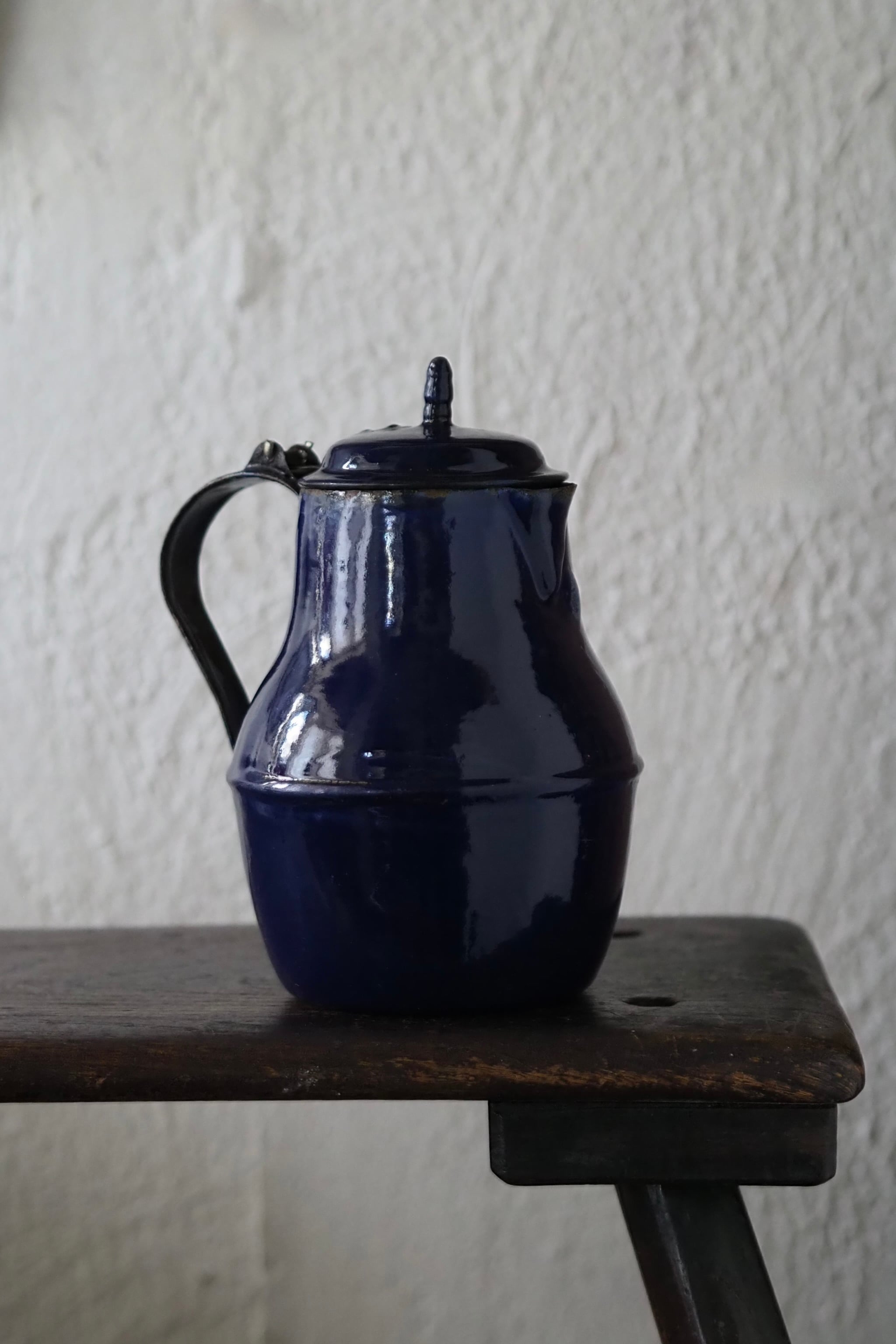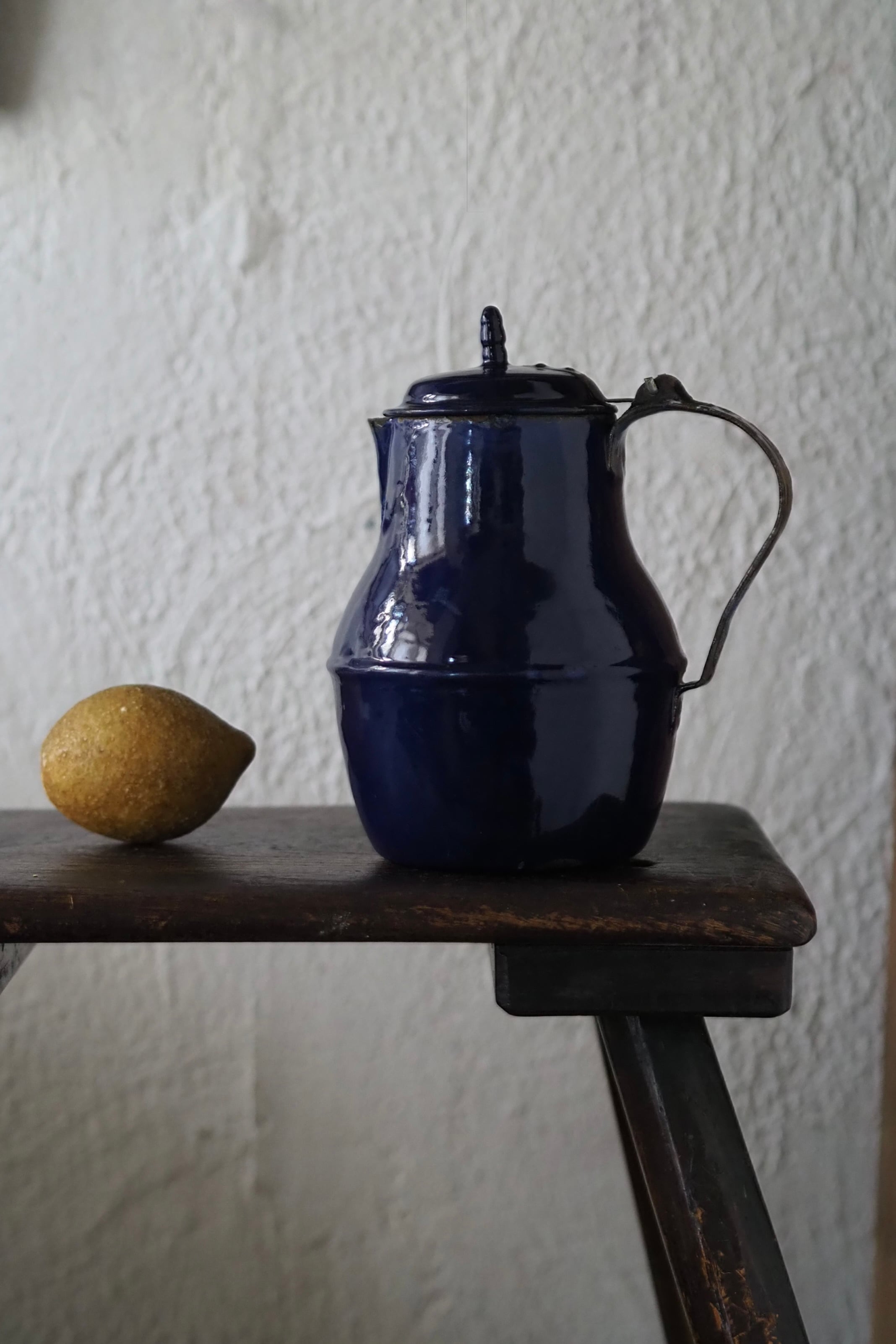 所々にエナメルの剥がれ、ハンドルに一部錆び。されど味わい深い質感、綺麗なブルー琺瑯のコーヒーポット。