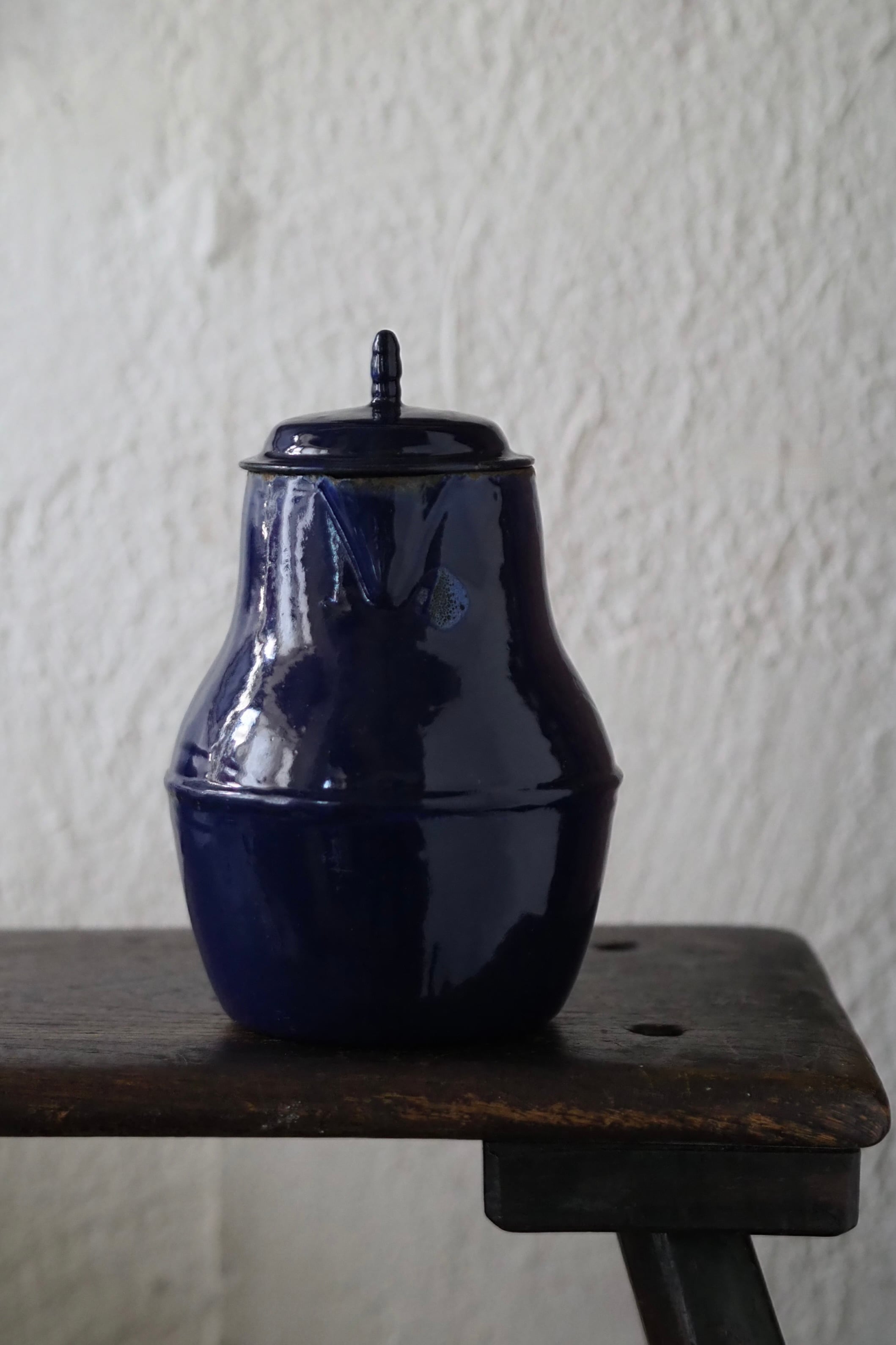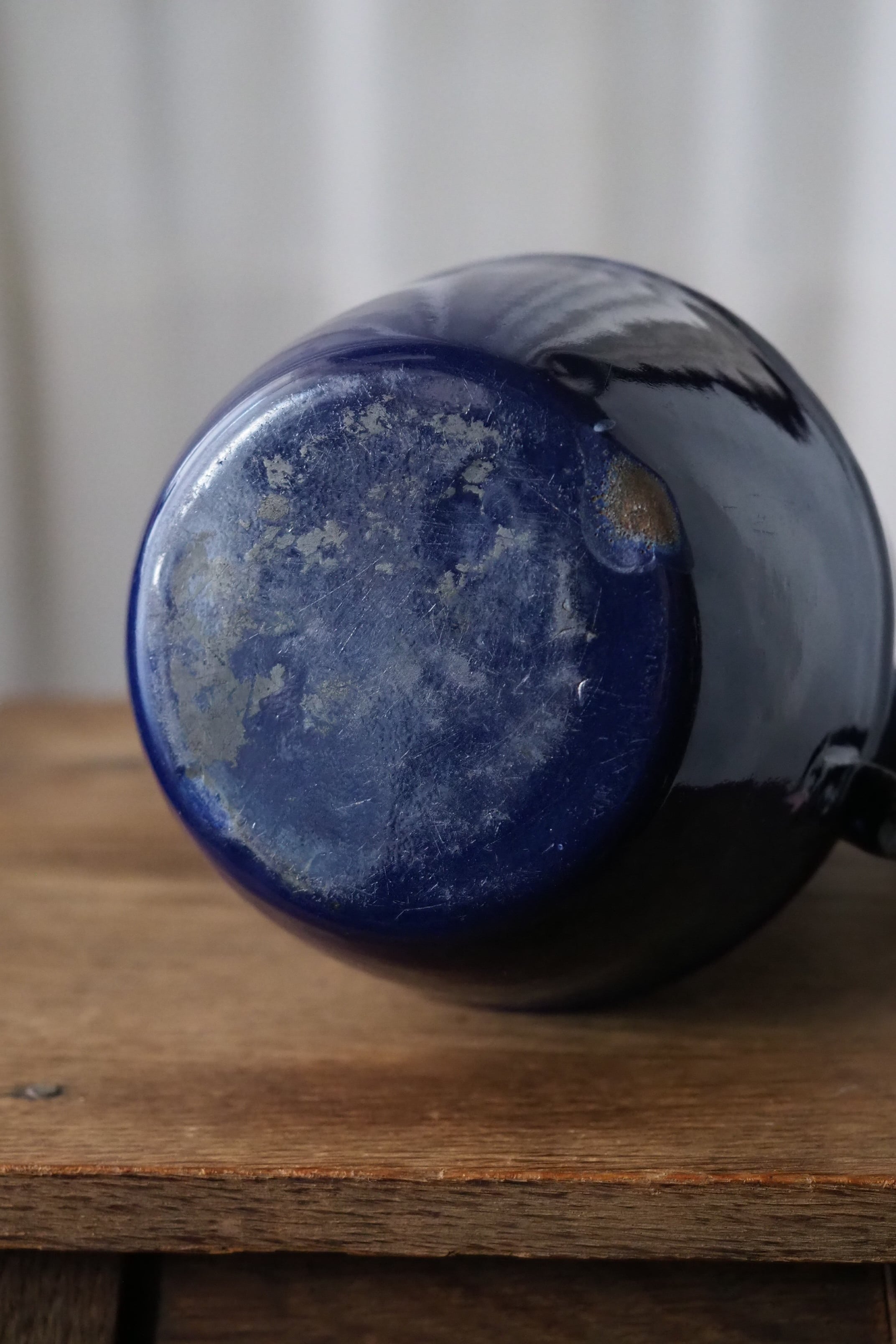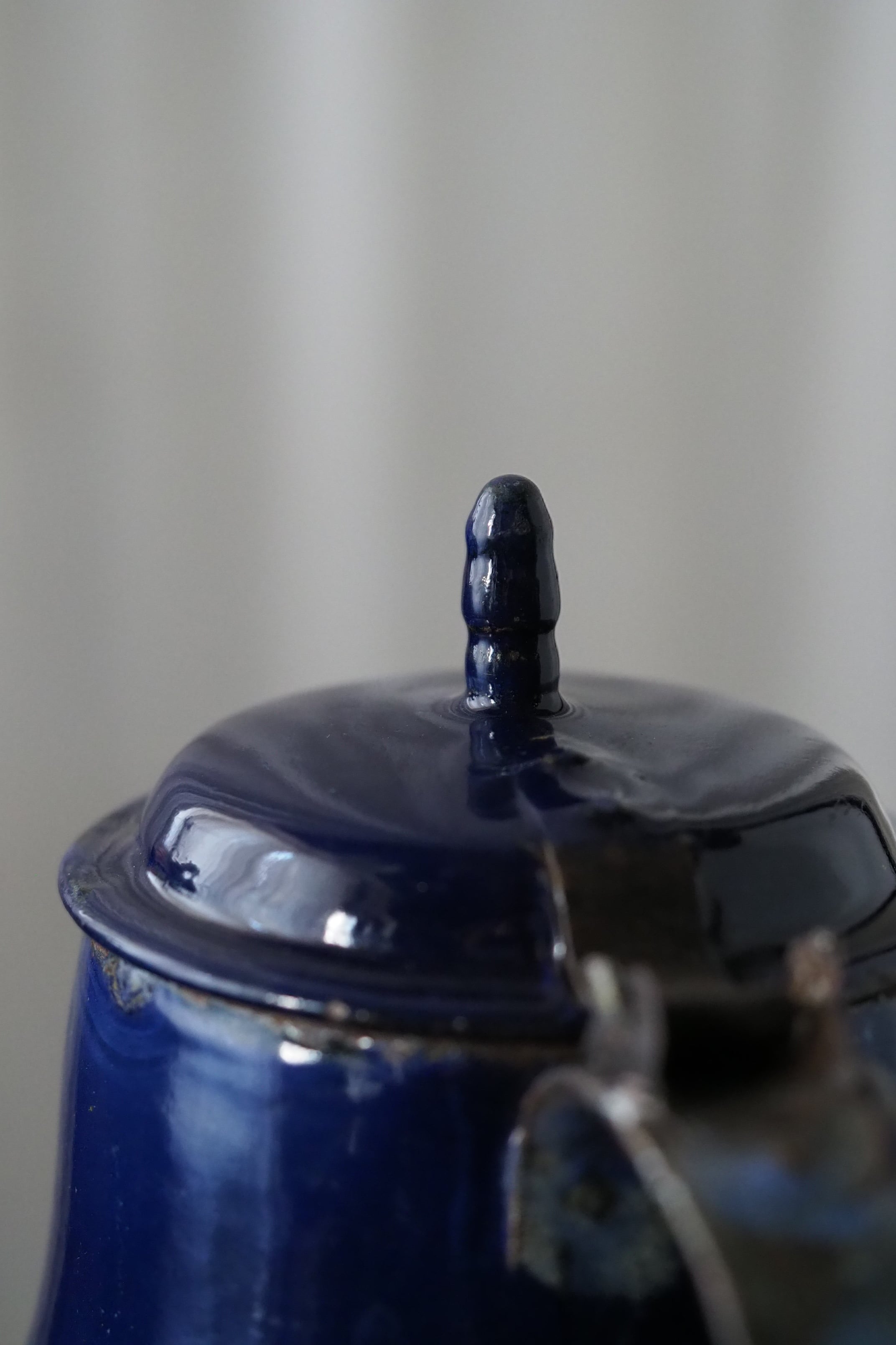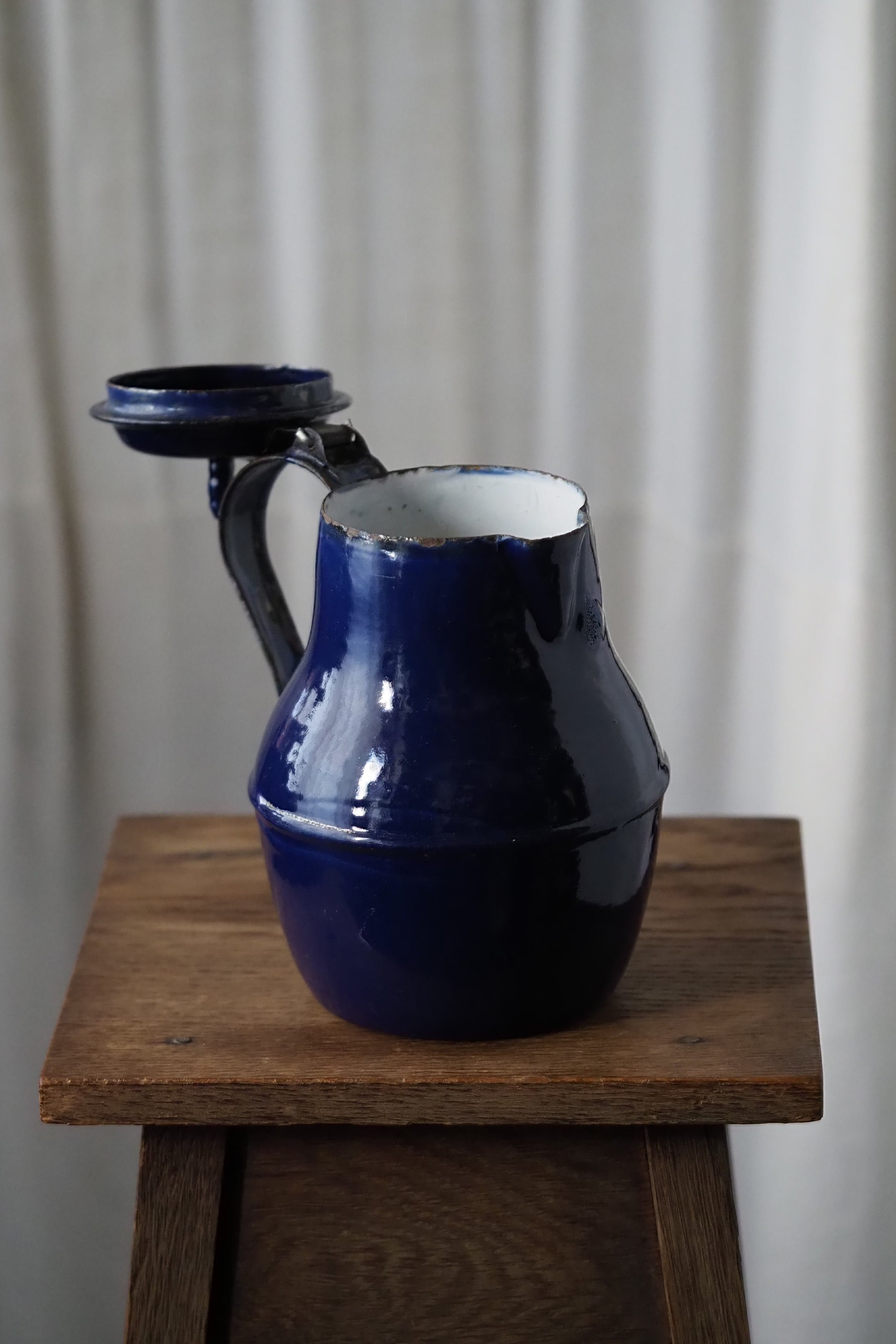 所々にエナメルの剥がれ、ハンドルに一部錆び。されど味わい深い質感、綺麗なブルー琺瑯のコーヒーポット。