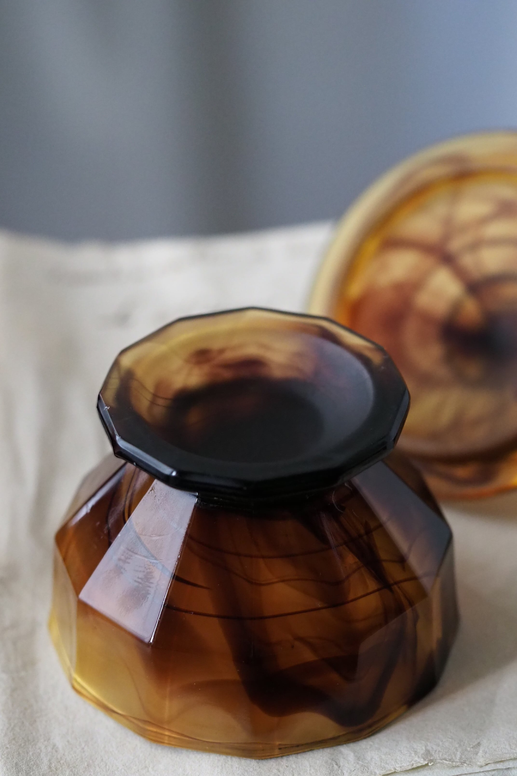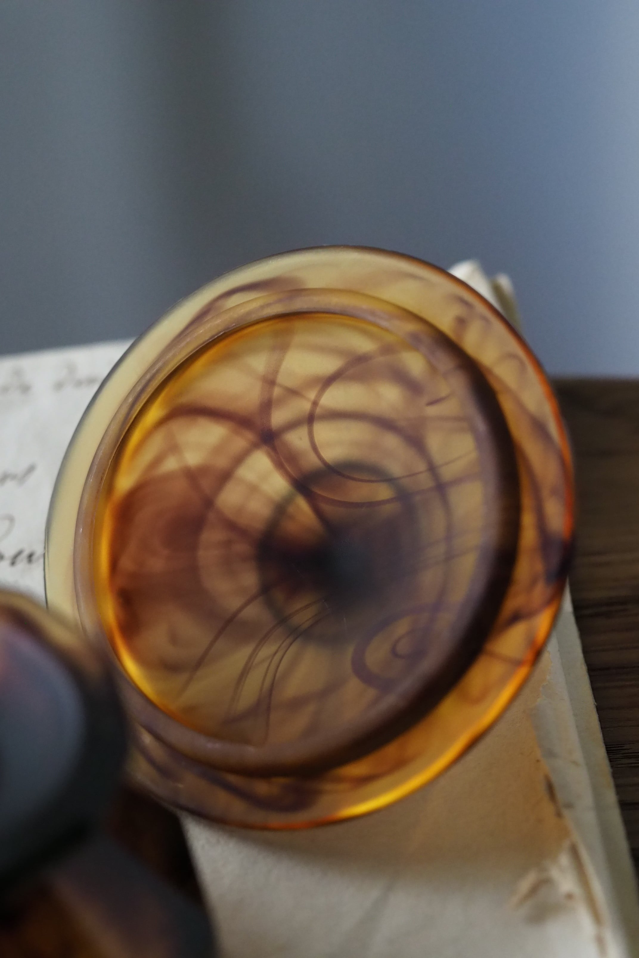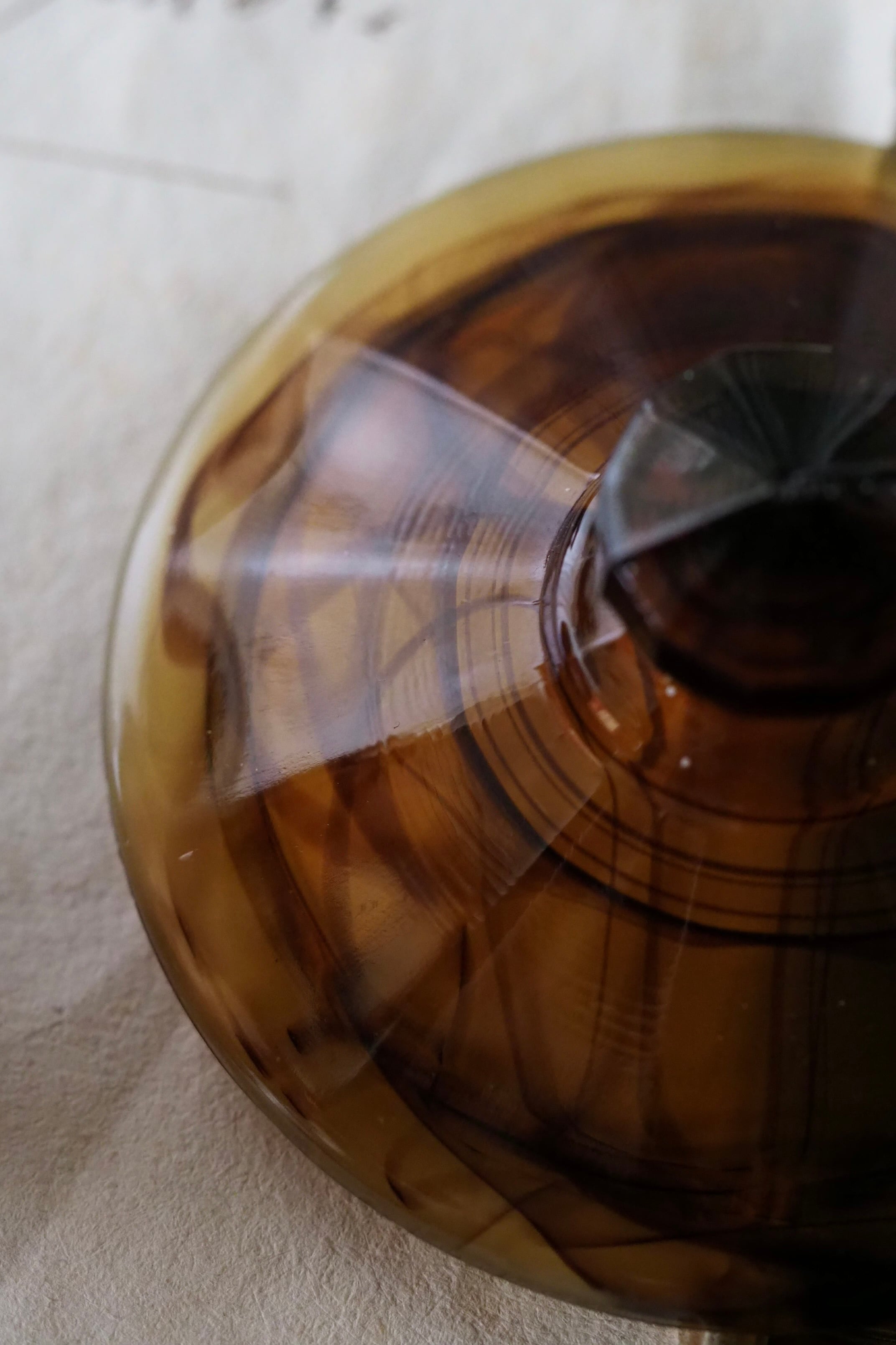 背面明るい光で見ると複雑な模様、マーブルの出方は個体差あり同じシリーズでも異なるもの。