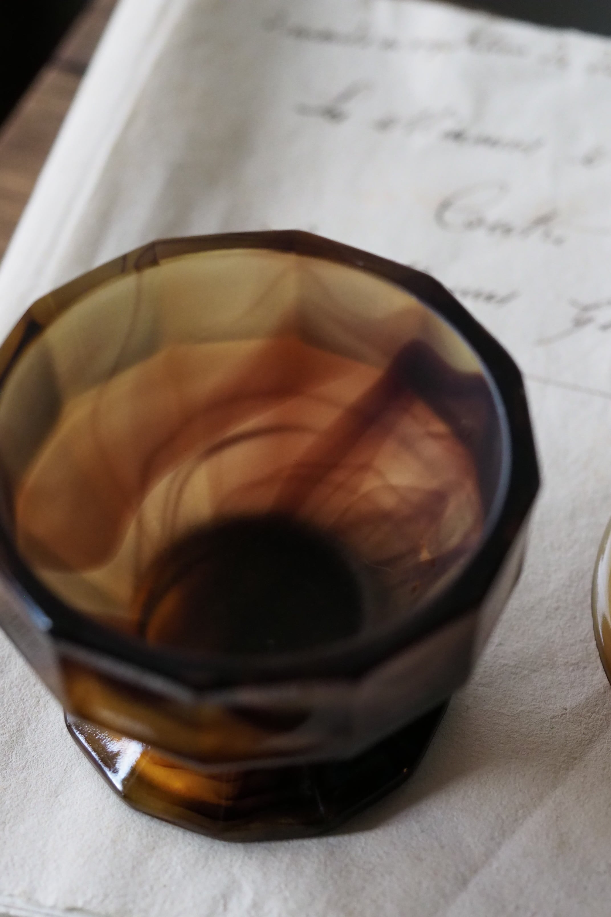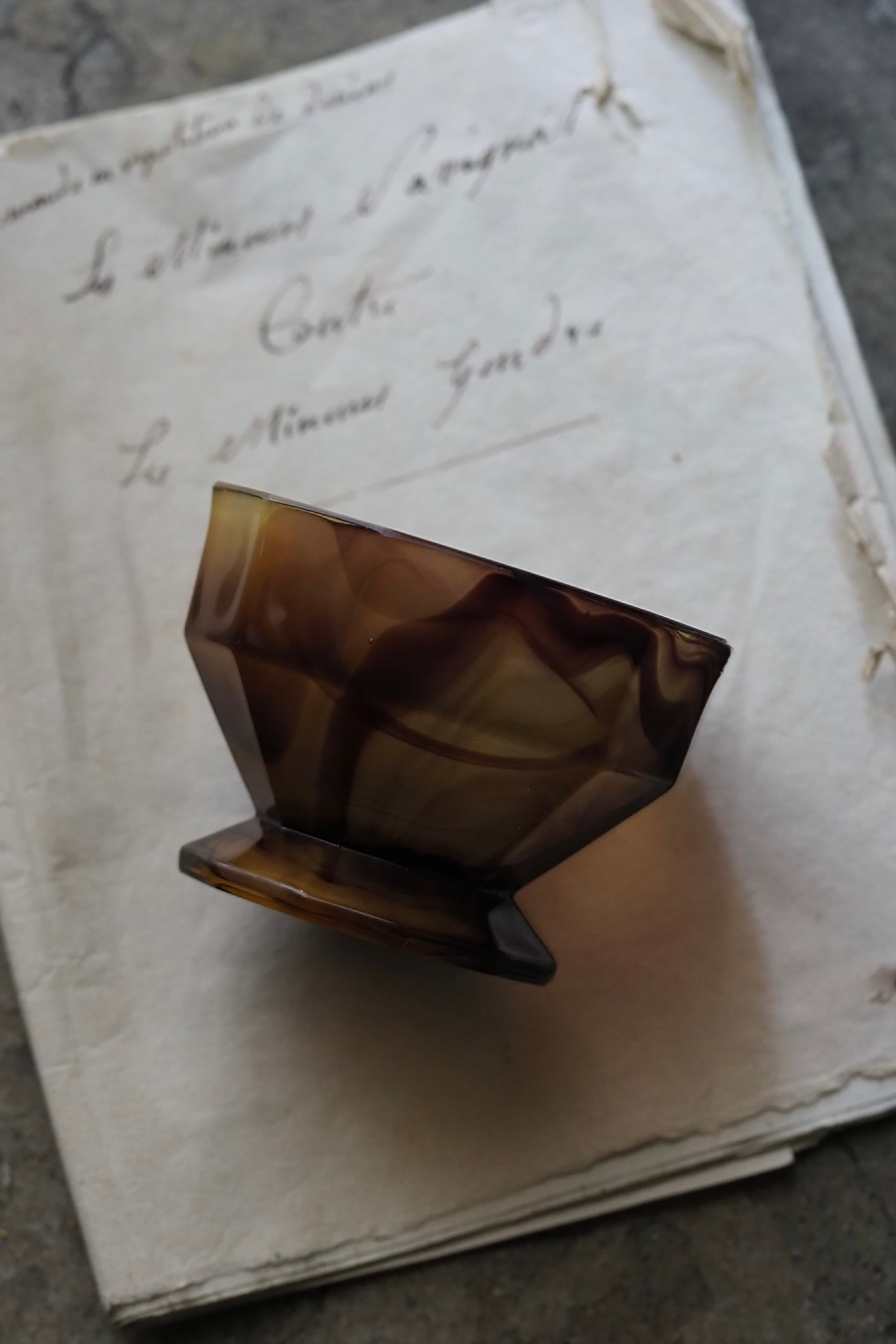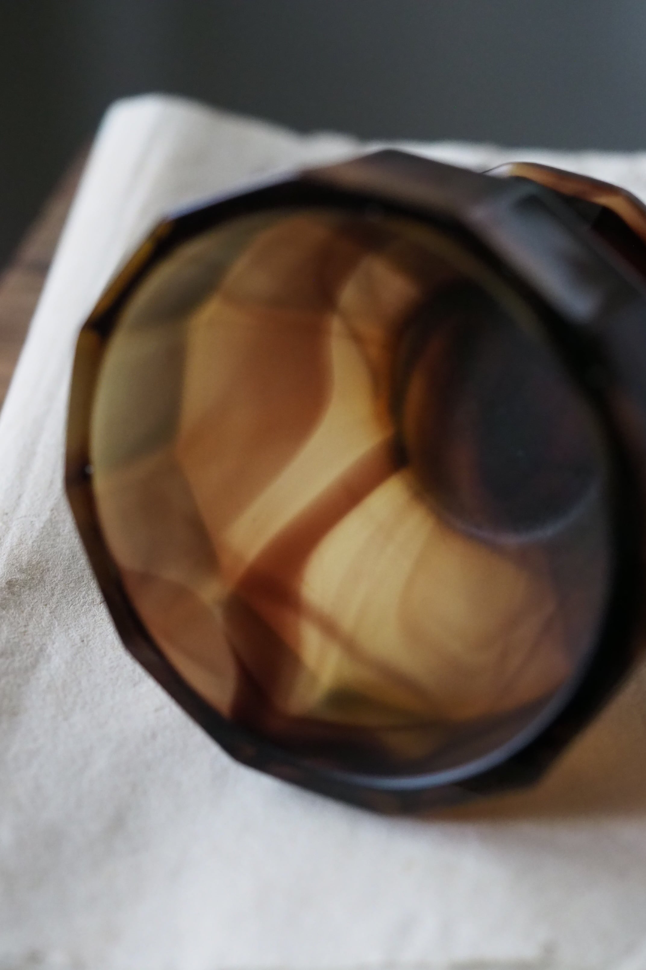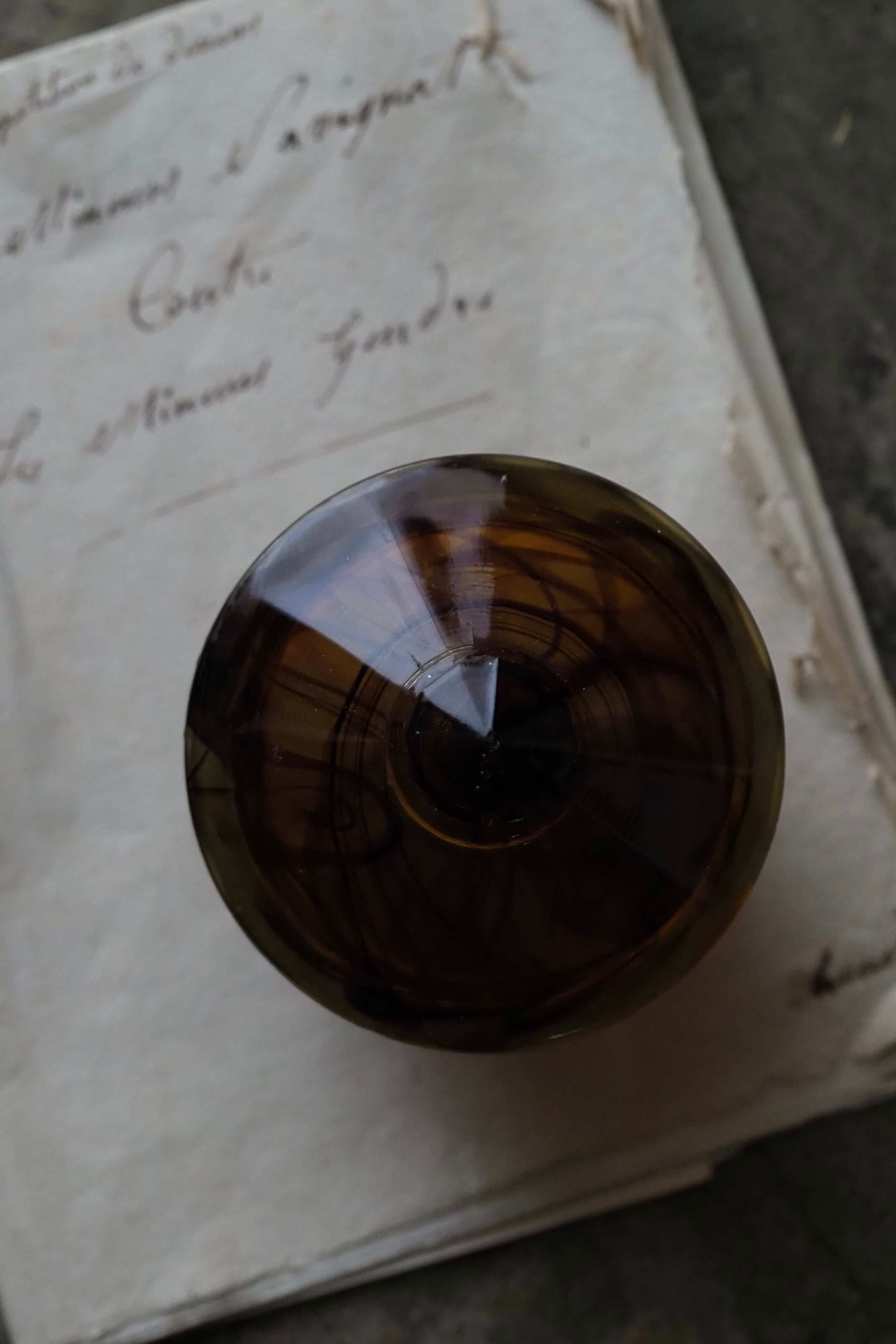 背面明るい光で見ると複雑な模様、マーブルの出方は個体差あり同じシリーズでも異なるもの。