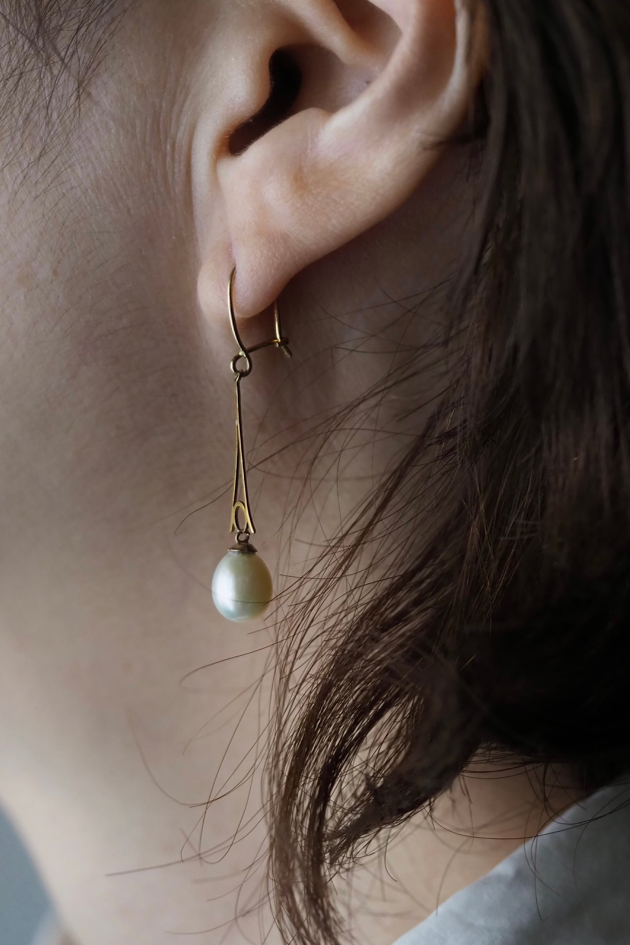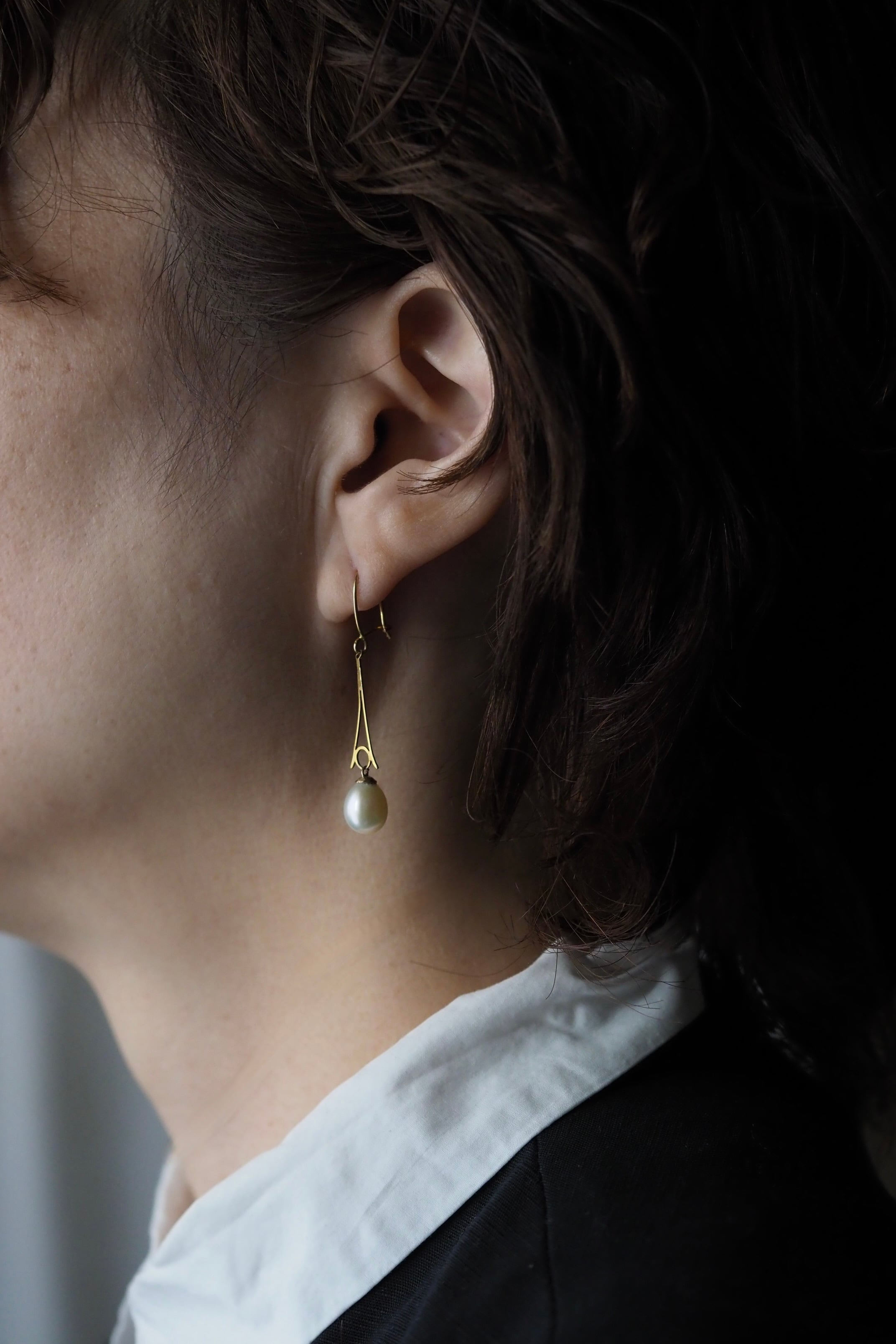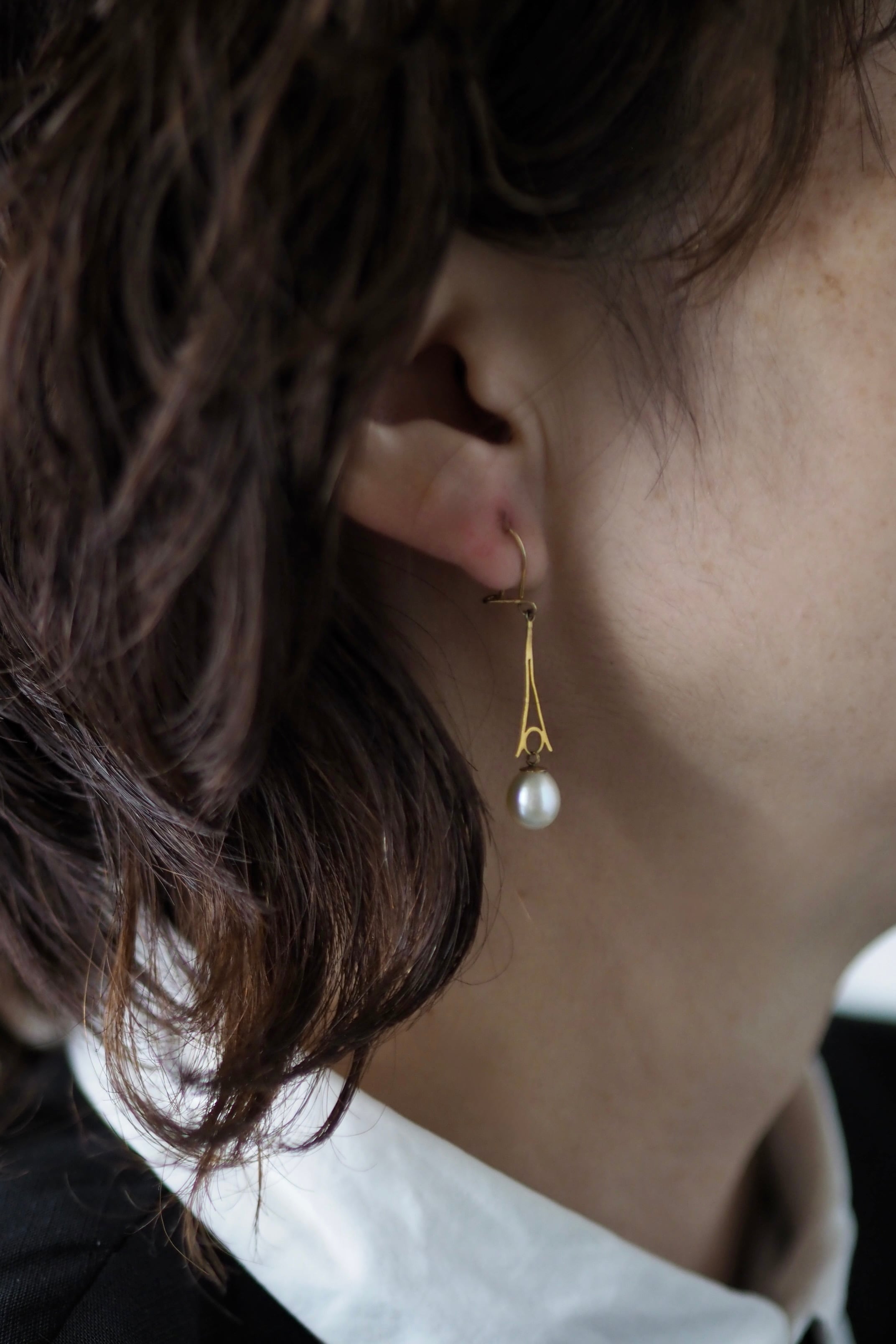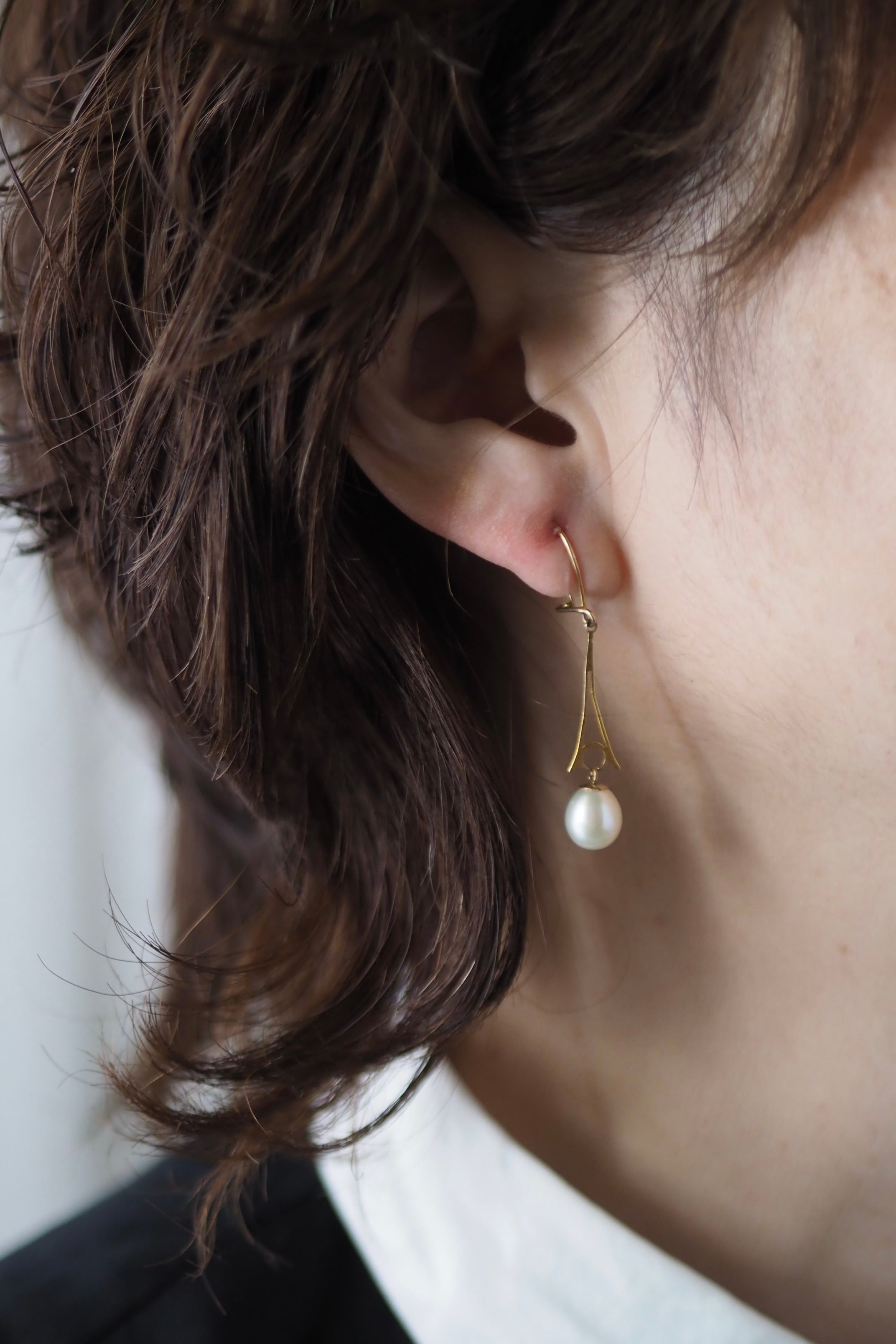 繊細な線が繋いだデザイン。そして柔らかい印象の中、クールな表情も併せ持つパールの揺れるピアス。