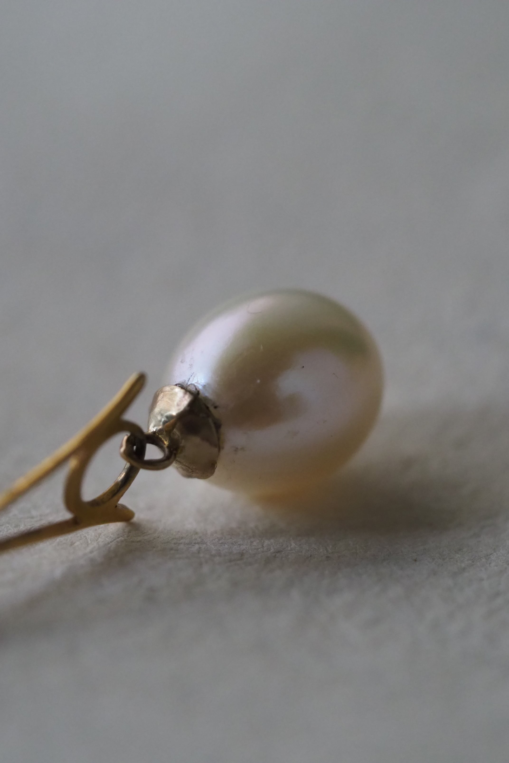 上品なアイボリーがかった白で大粒のパール、ややティアドロップの形。