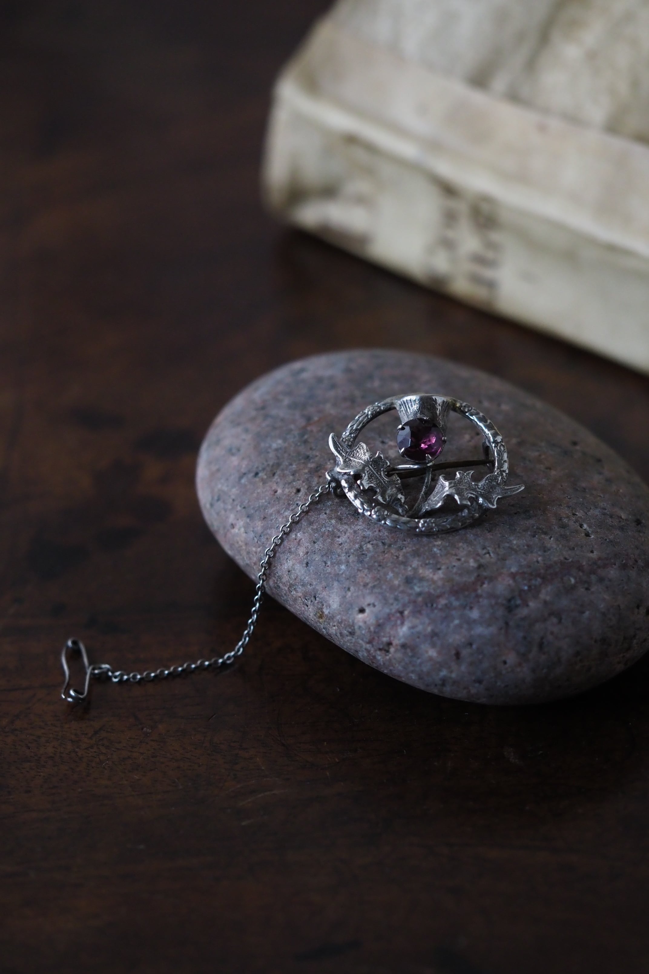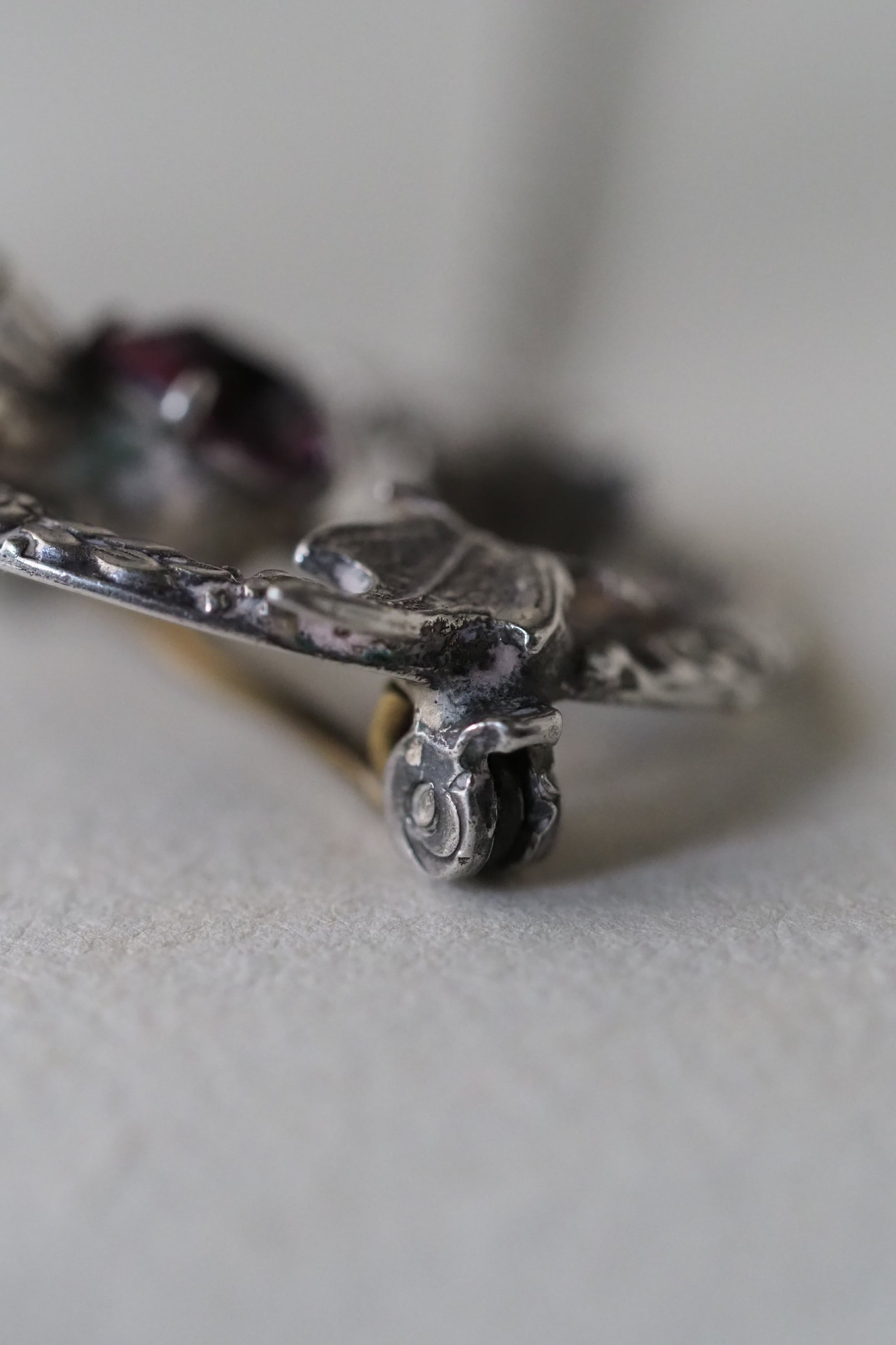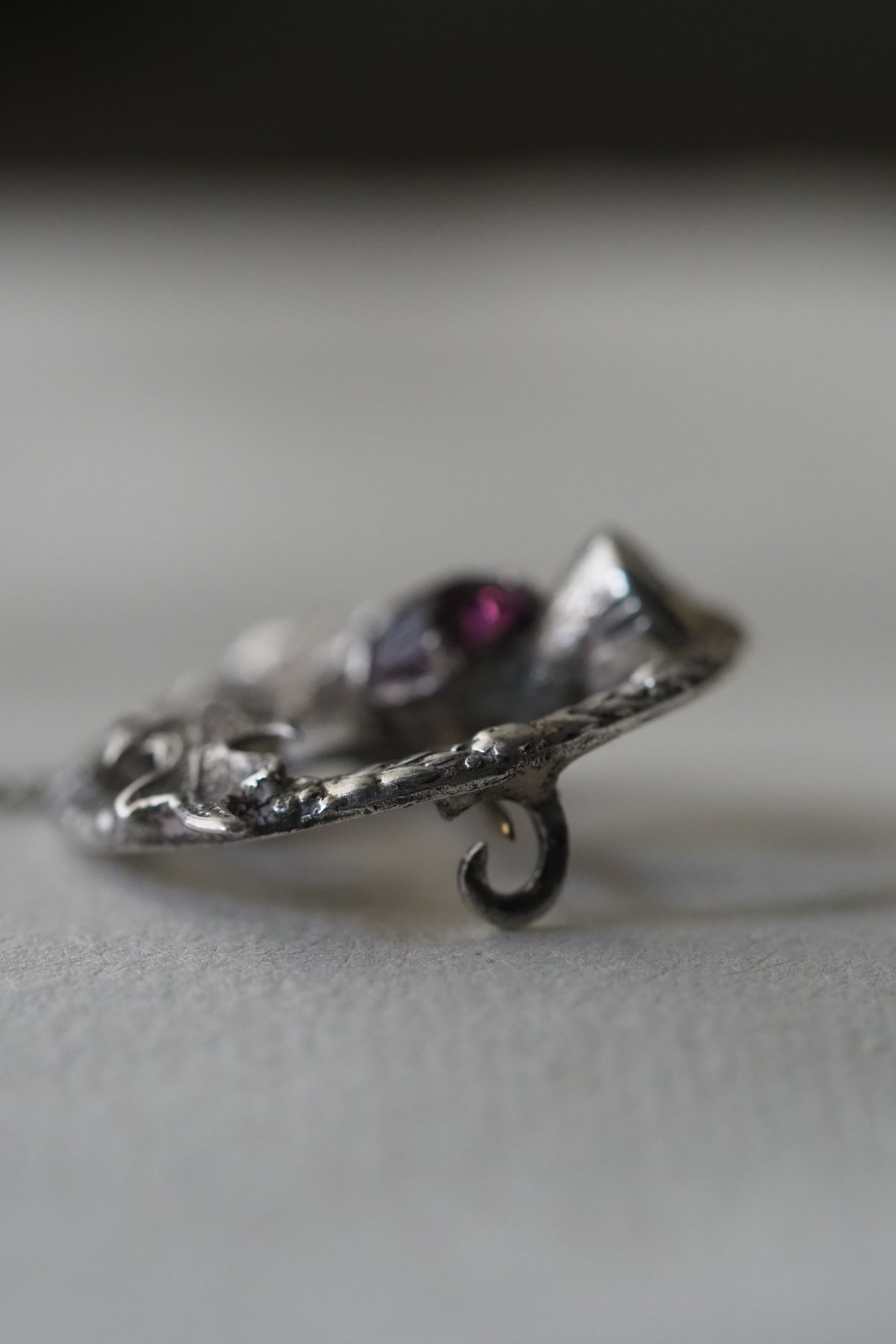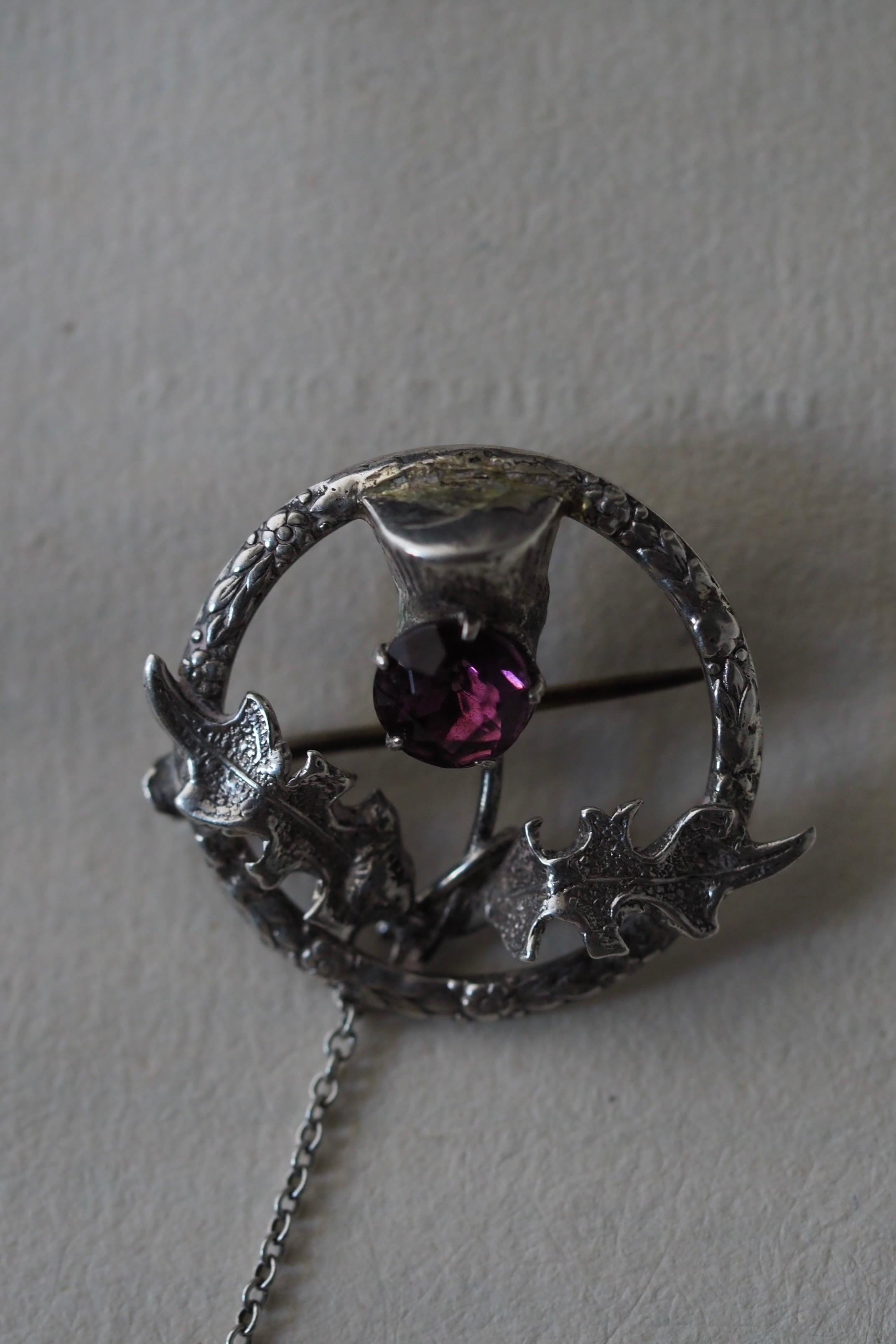 スターリングシルバー製、中央に入っているパープルガラスはもちろんアザミの花をイメージしたもの。