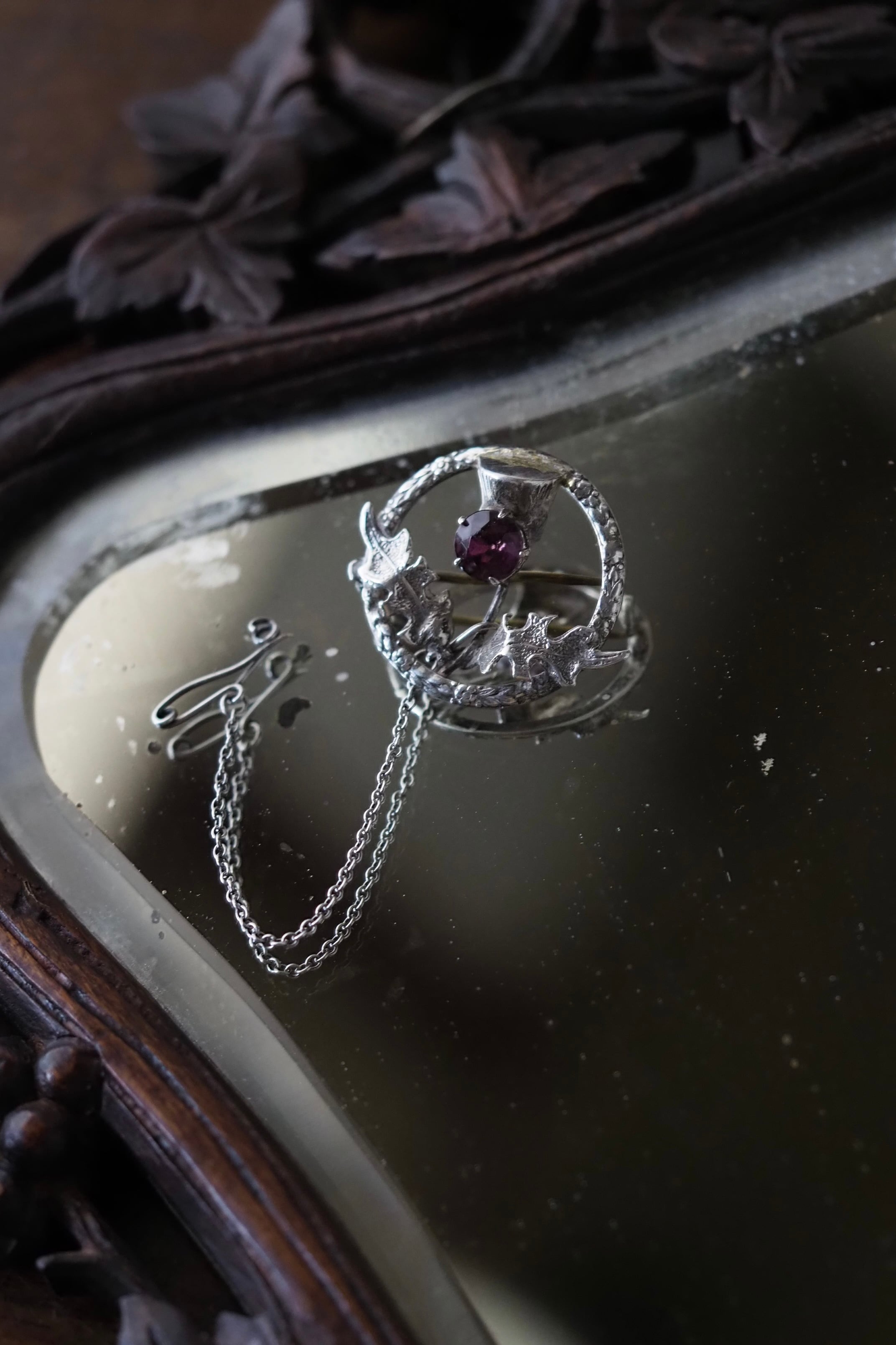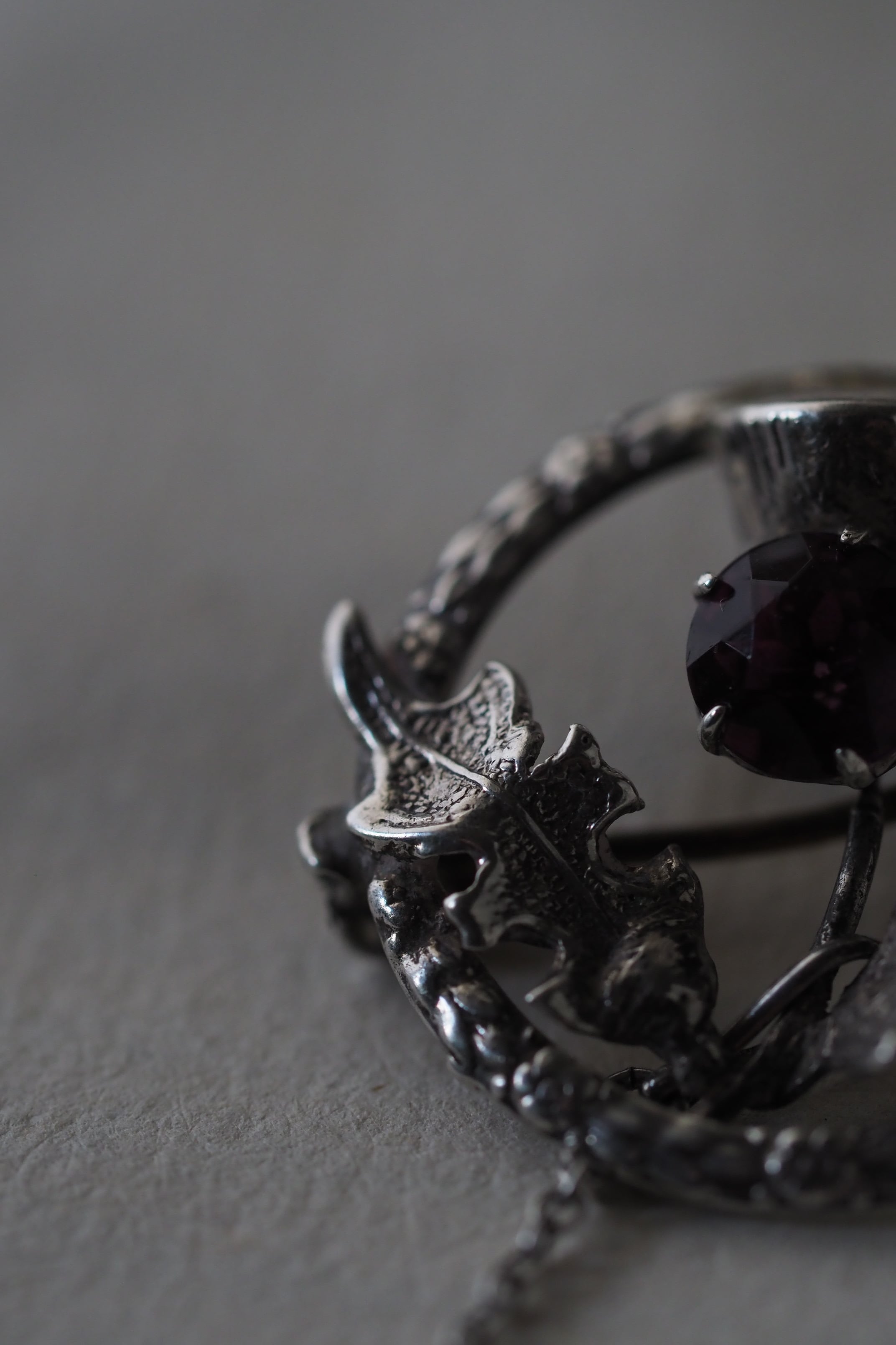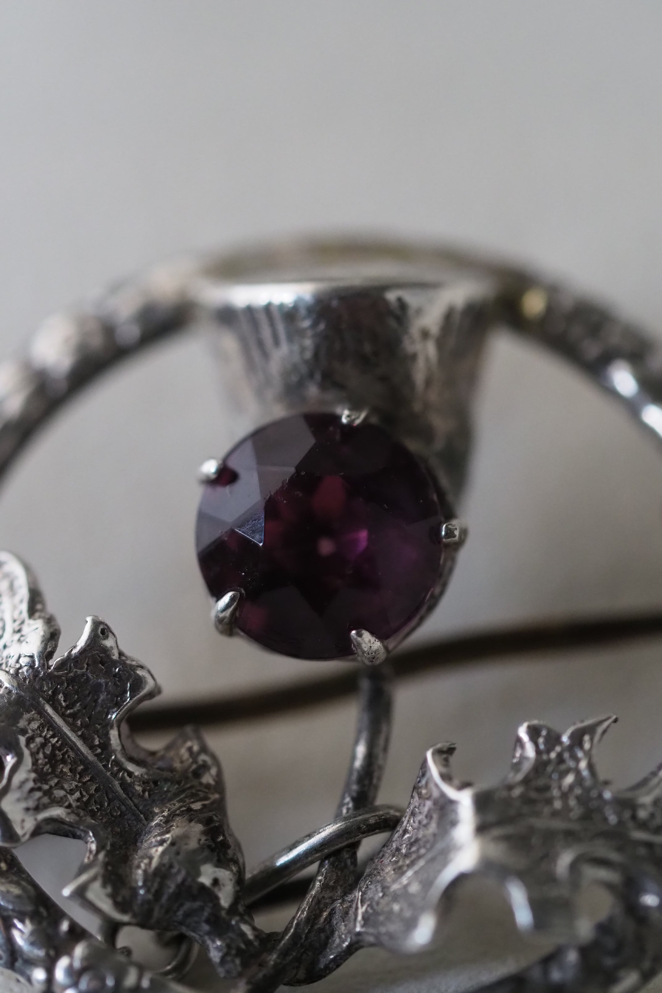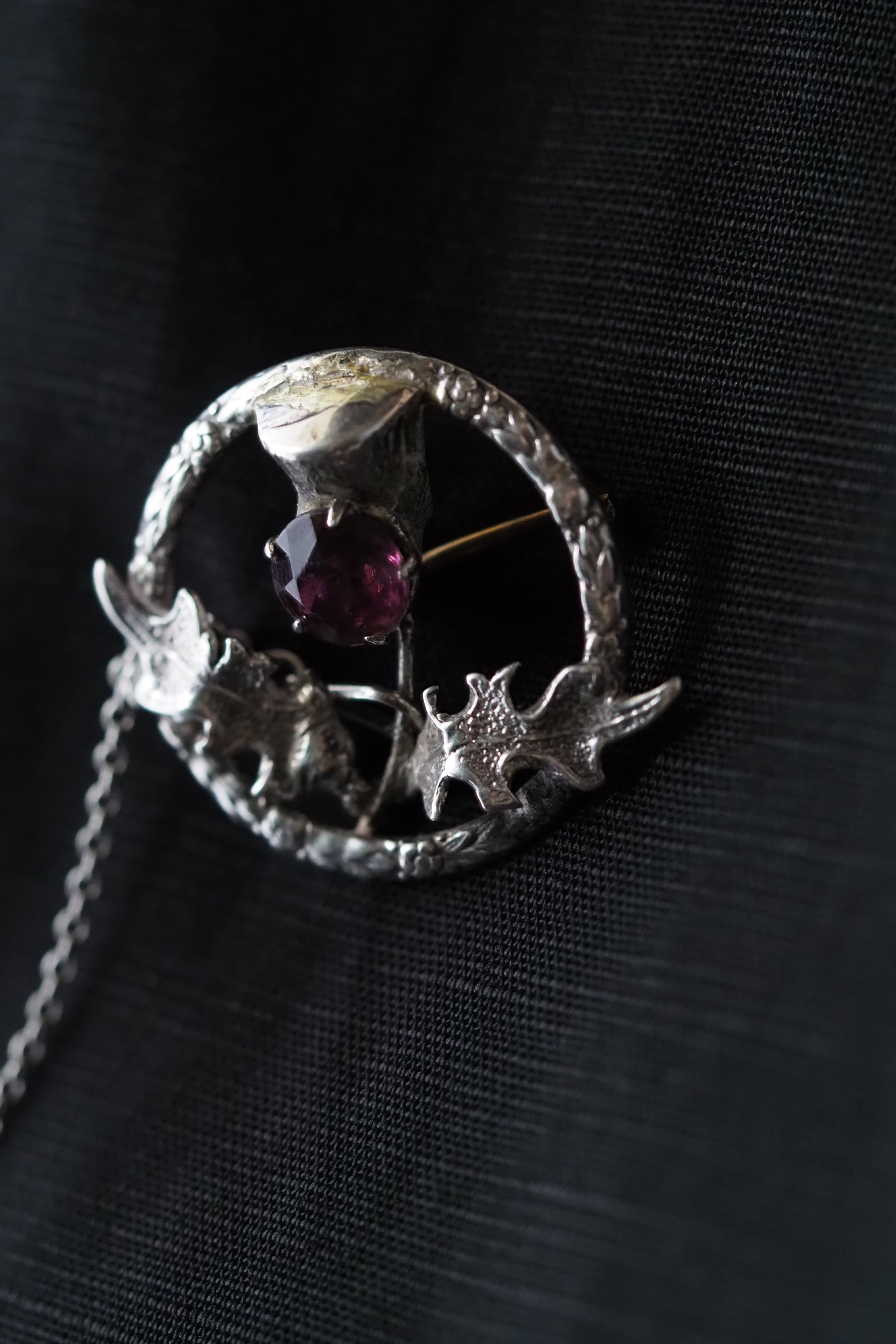 スターリングシルバー製、中央に入っているパープルガラスはもちろんアザミの花をイメージしたもの。