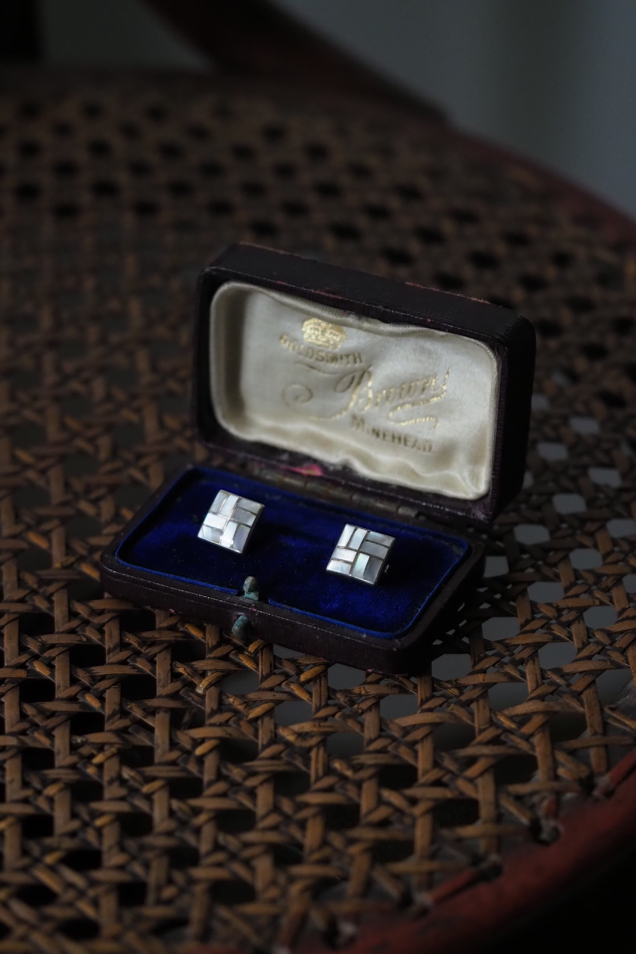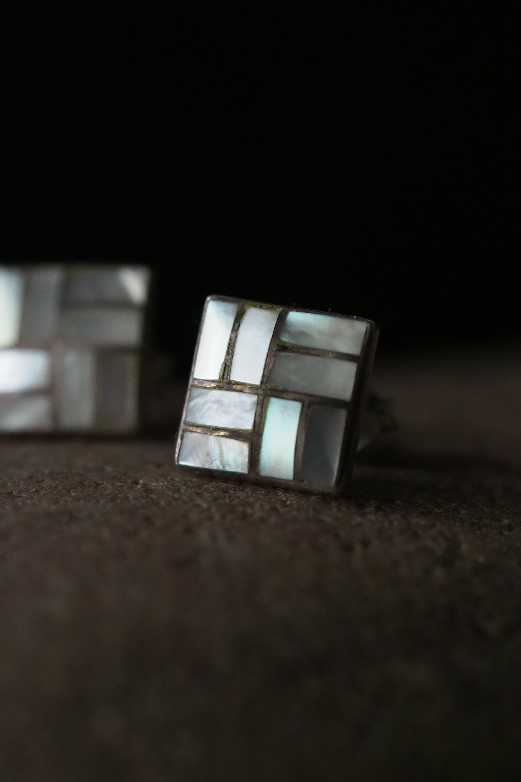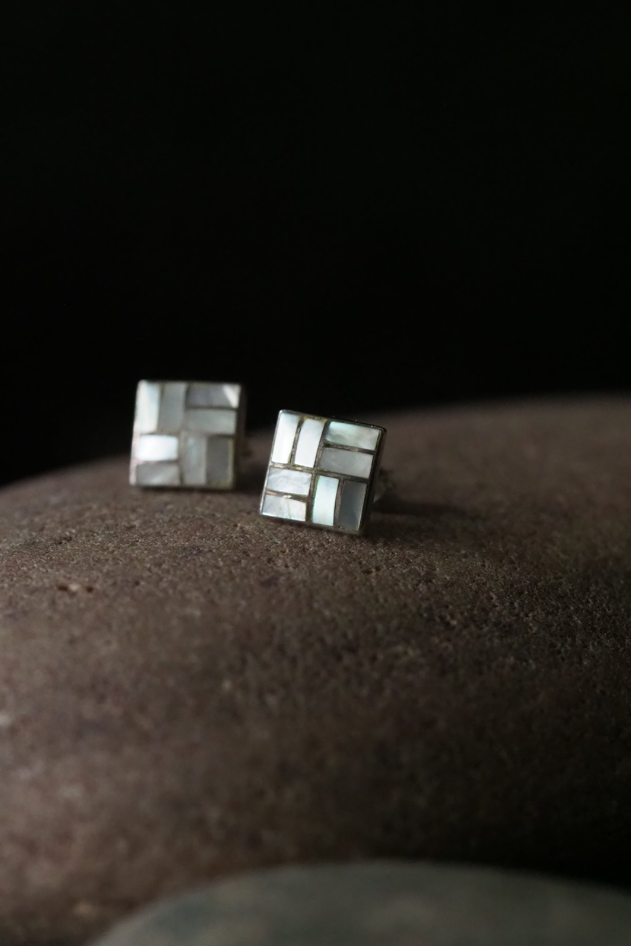 それぞれあしらわれた白蝶貝のパーツが光を受けて微妙に変化ある輝きを見せる、スクエアのピアス。