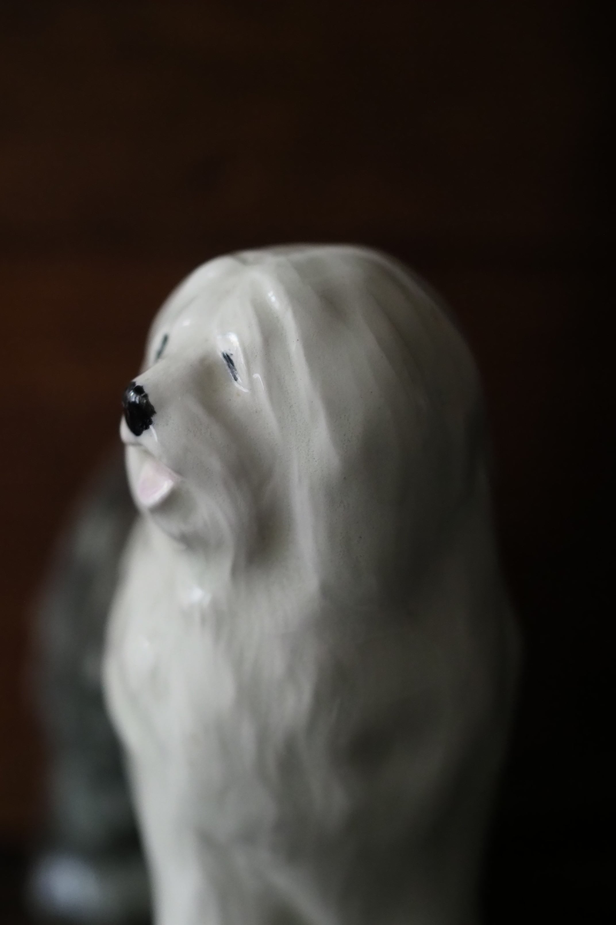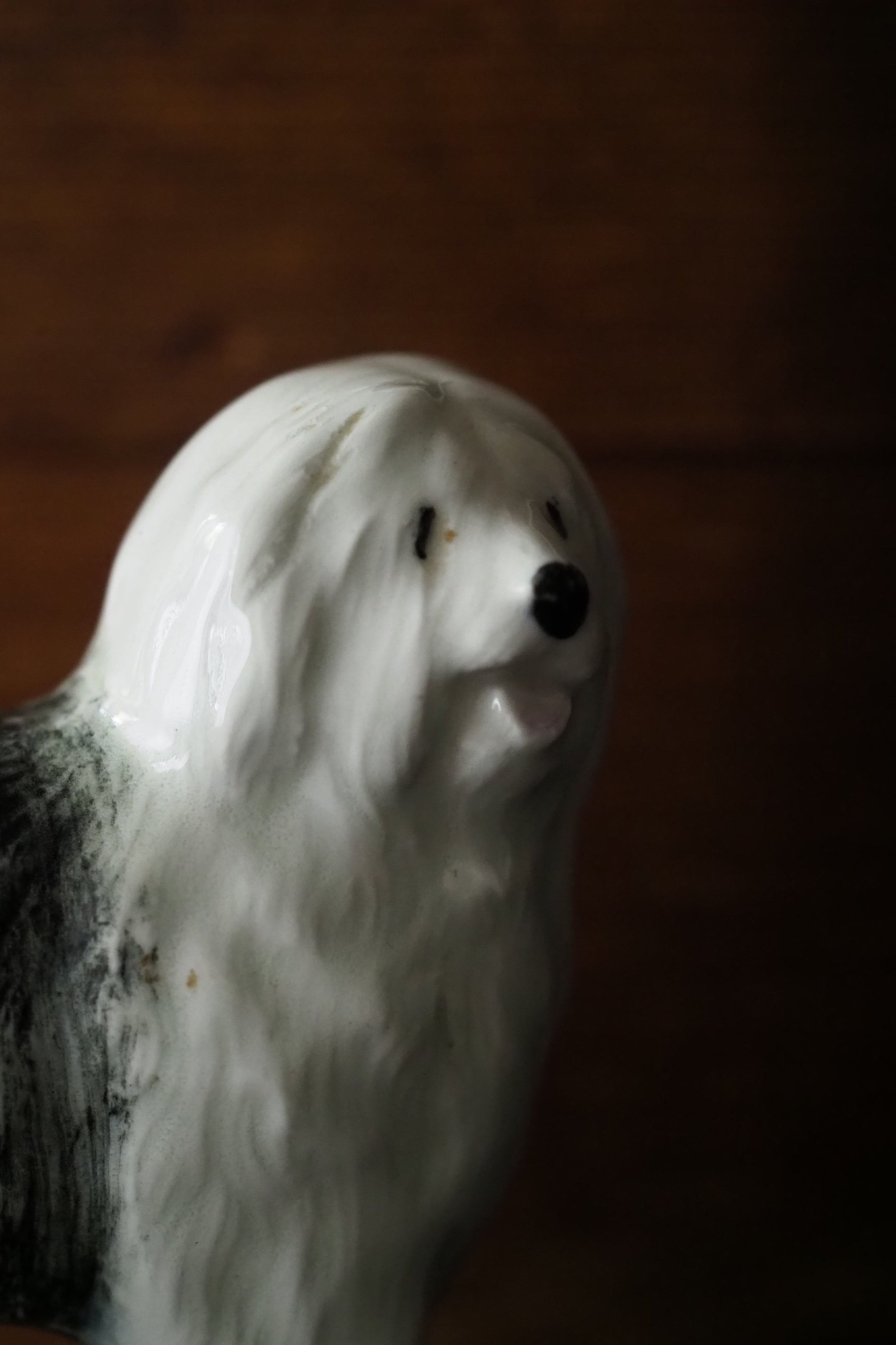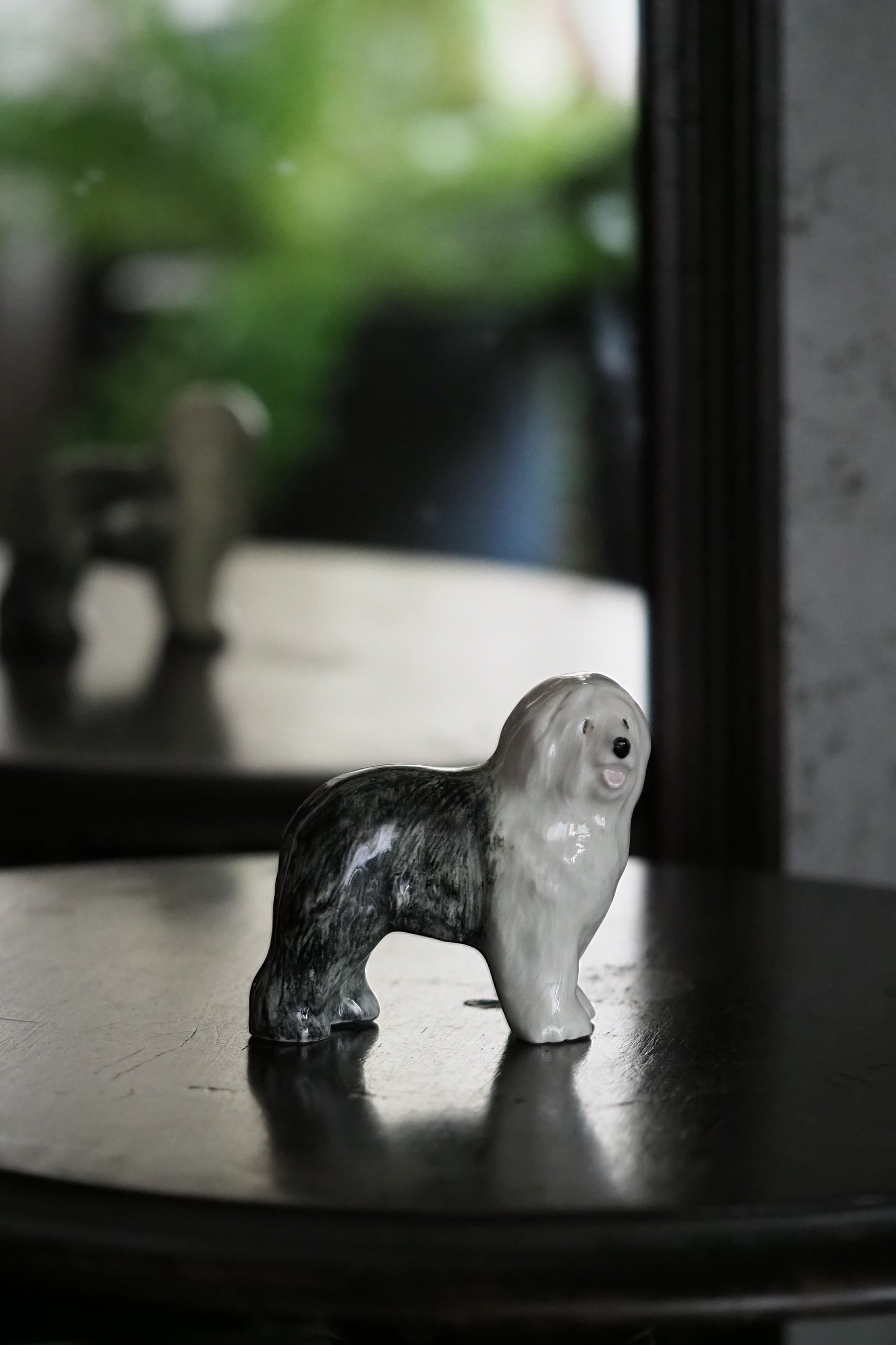 確実に笑ってる、舌をぺろりと、モコモコ豊かな体毛もそのままにオールドイングリッシュシープドッグの陶器オブジェ。