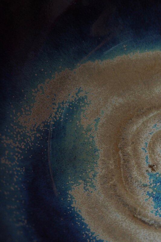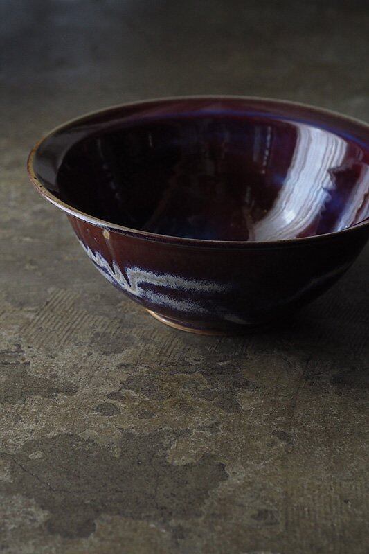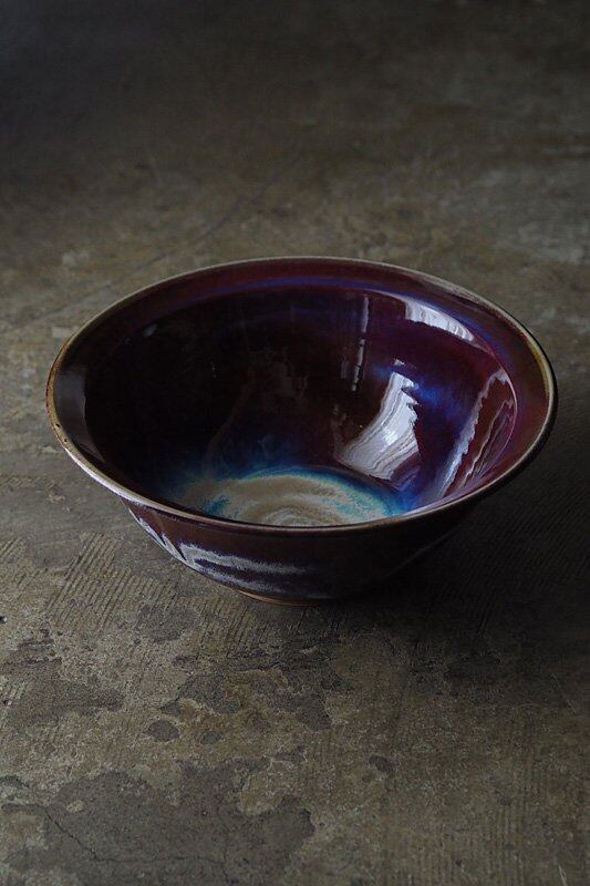 全体の地は深いワインレッドのような色、そこに冴える青の釉薬をダイナミックに掛けたフランスの水鉢。