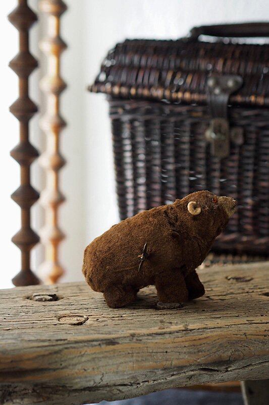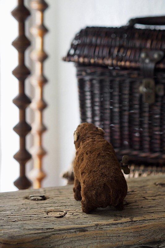 同時に四肢前後に動き歩を進めたはずで持ち上げると僅かに空歩きをしている、中のゼンマイの油が固まっているのか隙間から潤滑させてみましたが状態はあまり変わらず、お疲れ気味ではあるけれど首を上げて円らな眼で見つめている仕草可愛いクマさん。