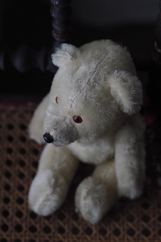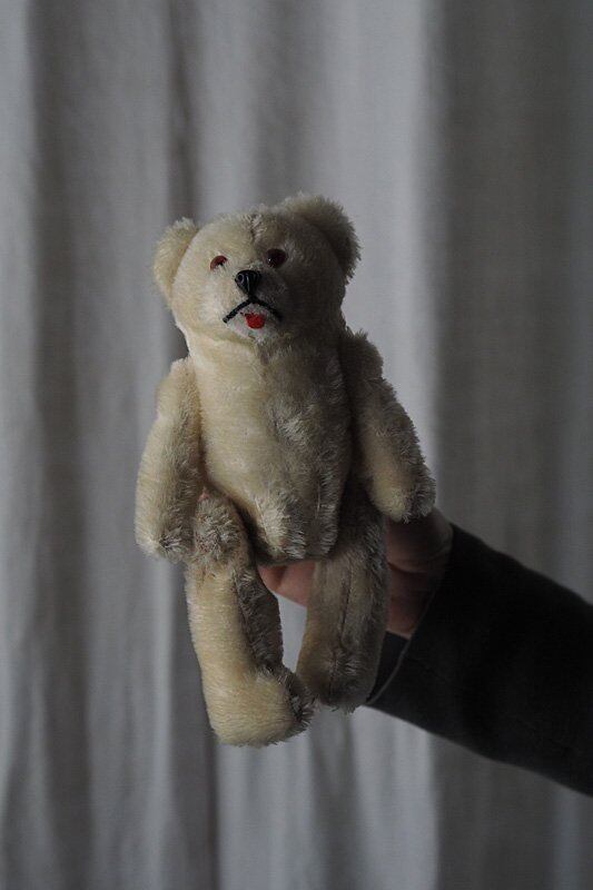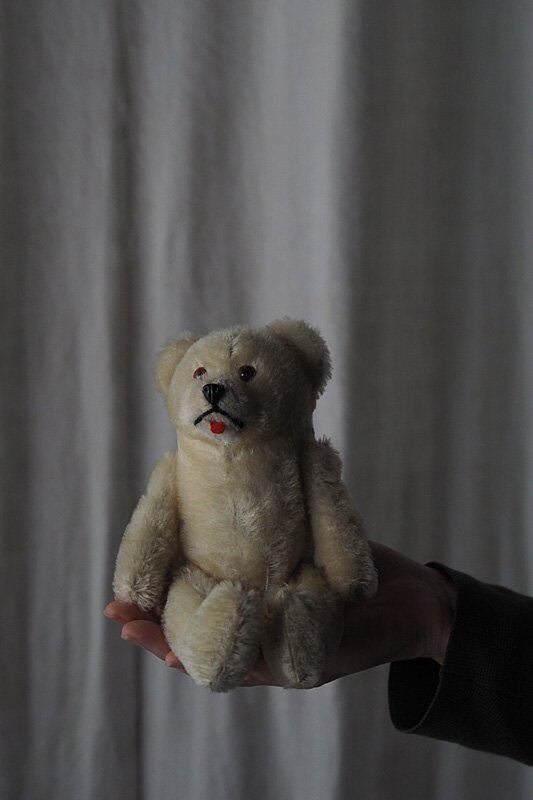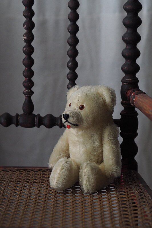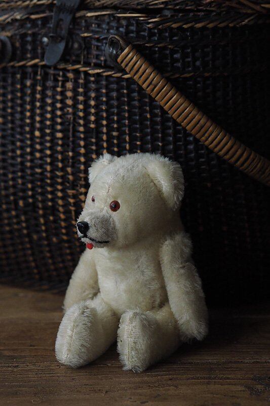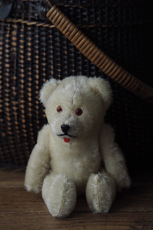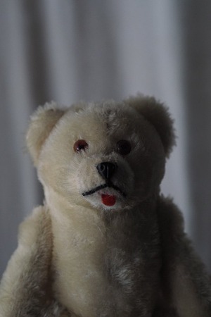 ちょこんと座りこちらを見つめる、ちょろっと出した舌が愉快なテディベア。
