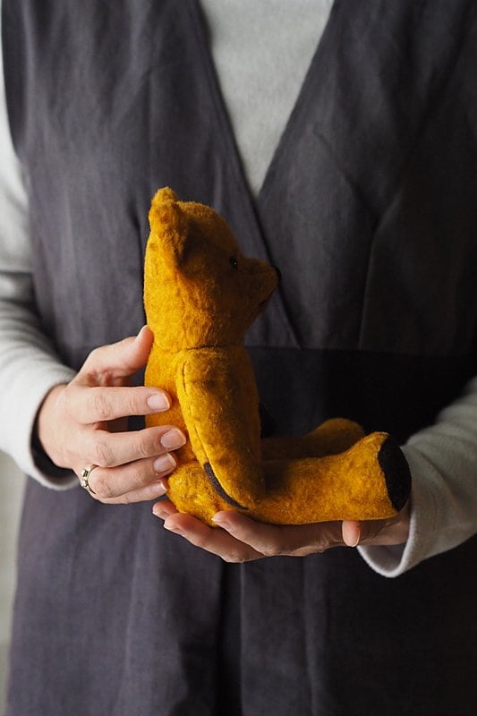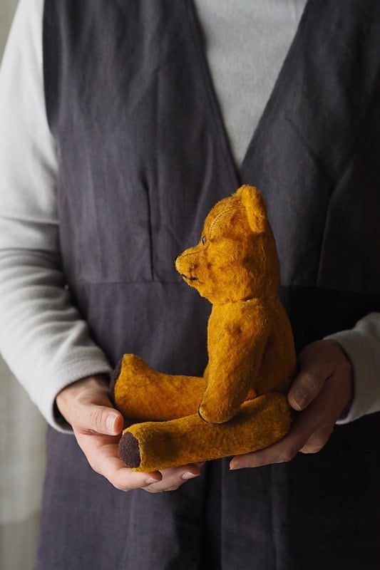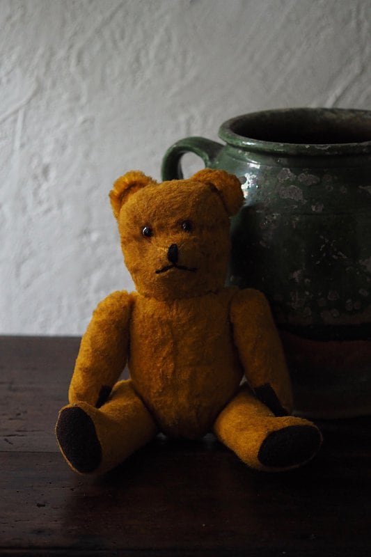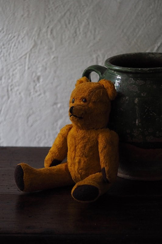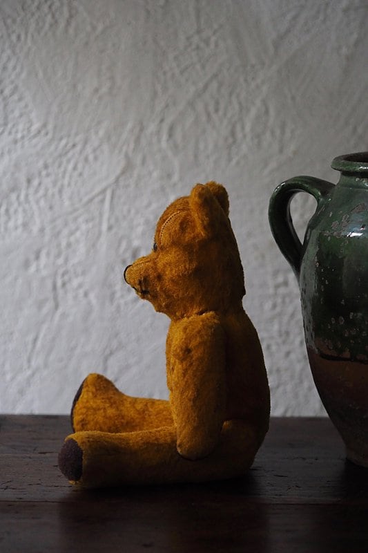 お子さんの相棒としてしかと愛された添い寝の証拠、お鼻の歪みがあったり左右目の位置が微妙に違う黄金色のテディベア。