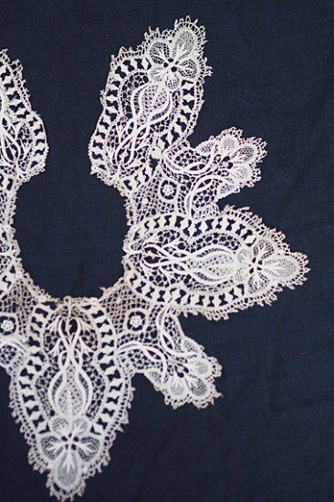 その断片から全体像まで、人が辿った糸の美しい変遷を垣間見える幸せよ。Uネックの辺りに茶色い染みが御座います。